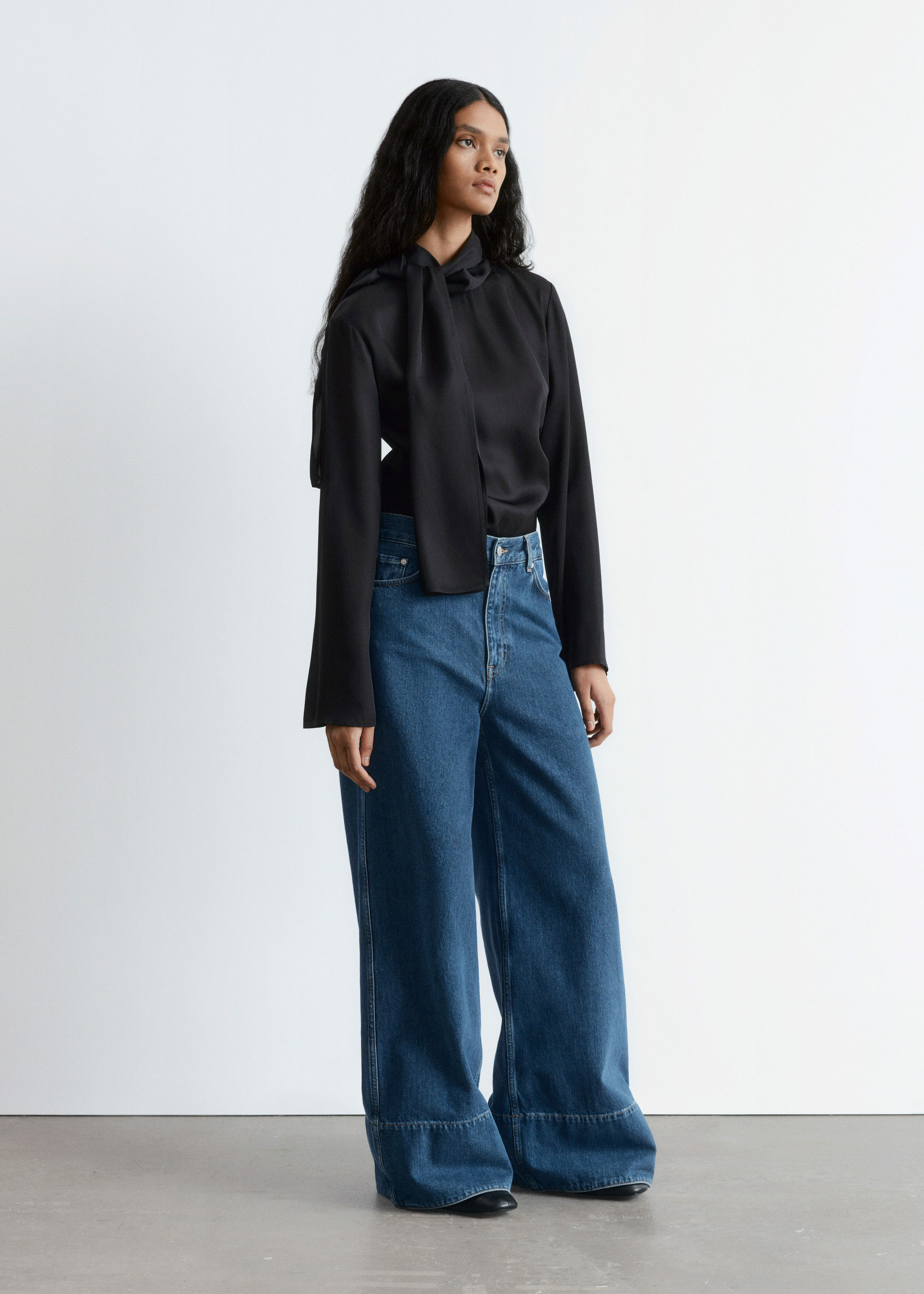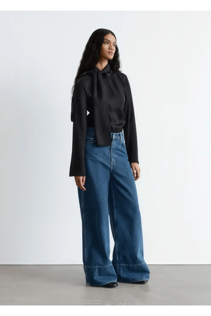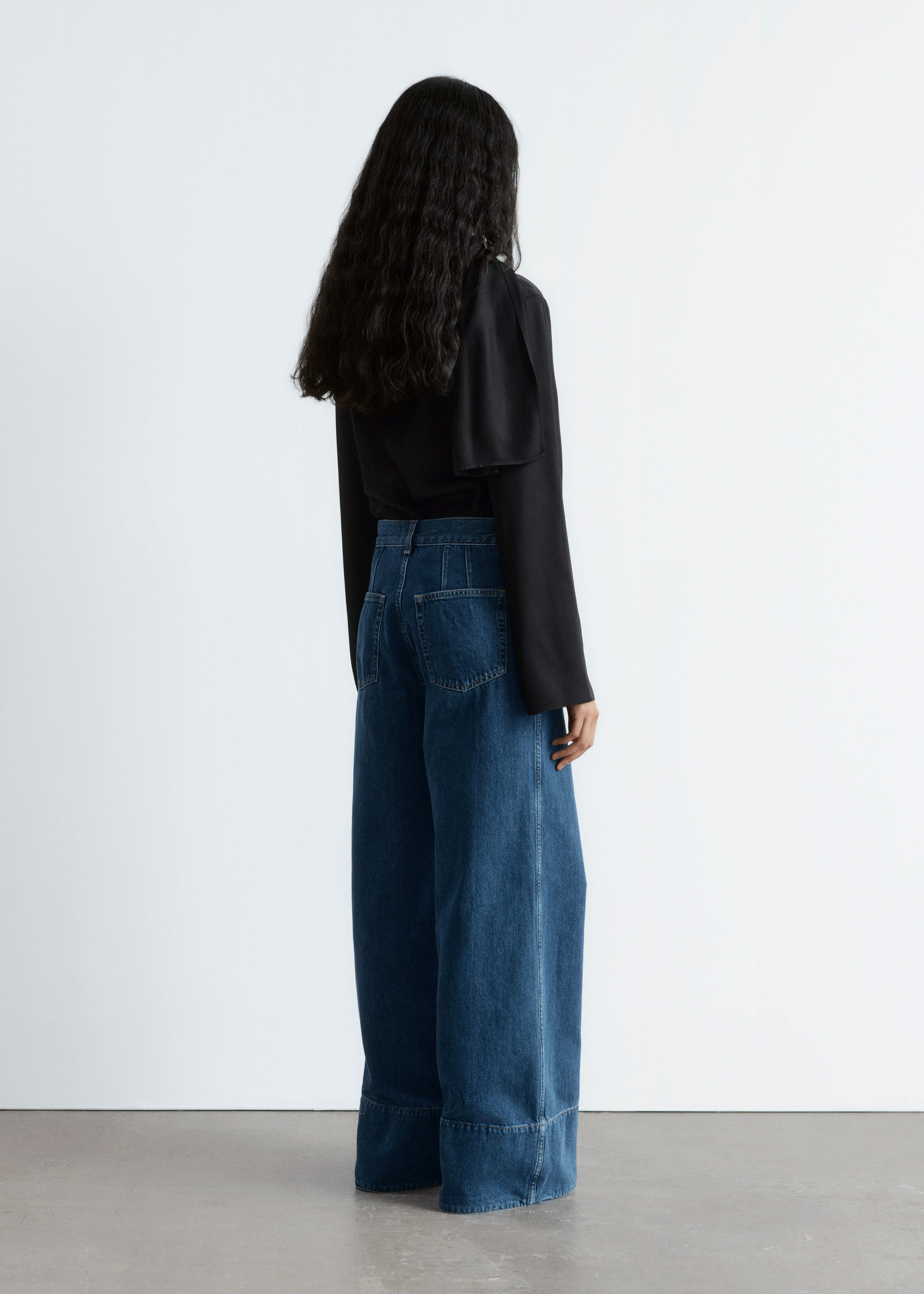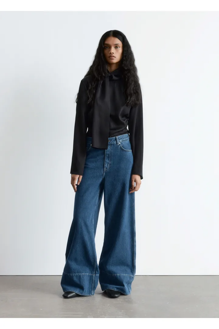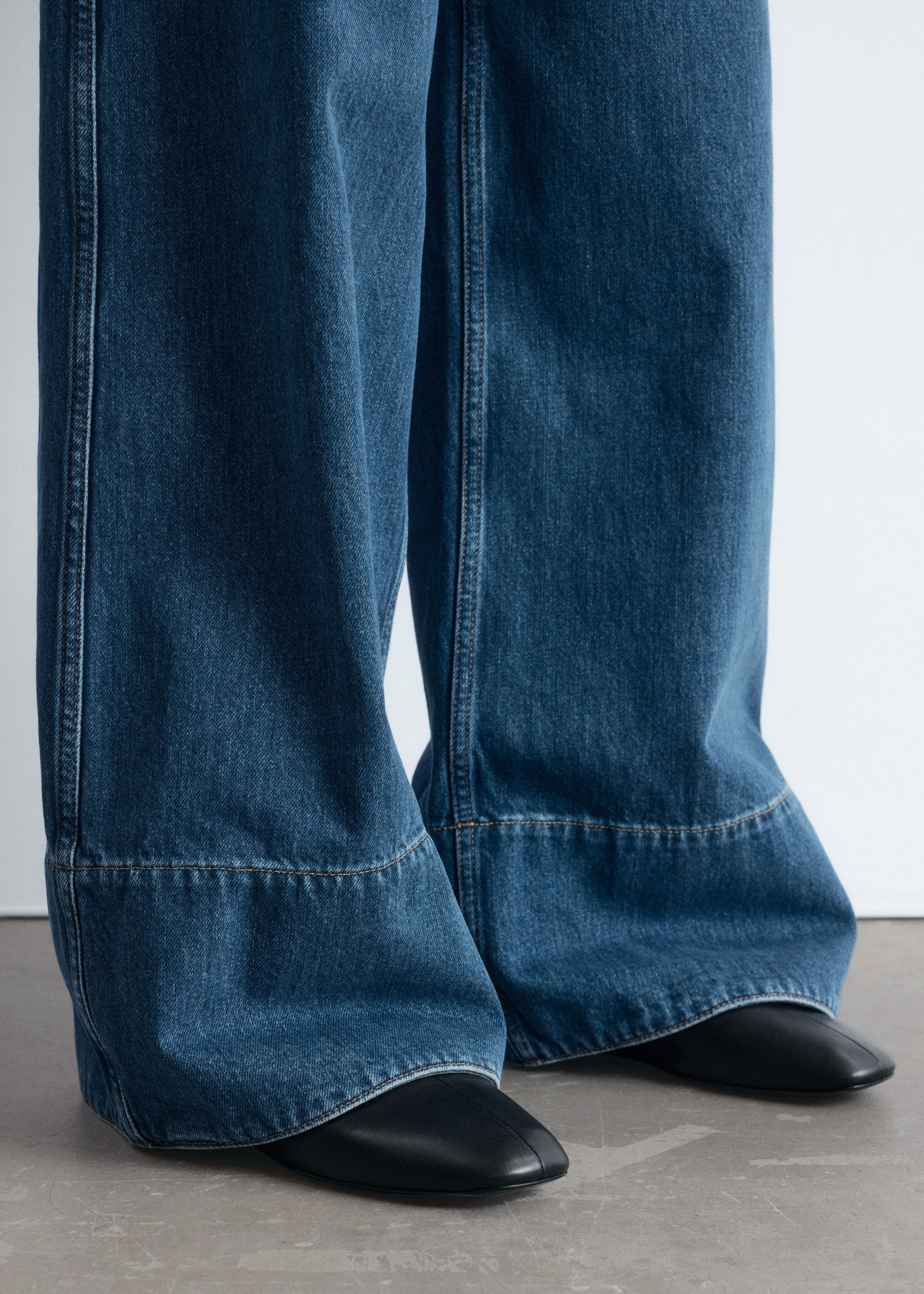 하이 웨이스트, 와이드 레그, 클래식한 5 포켓 마감이 특징인 데님 진이에요. 힘 있는 소재감으로 표현된 70년대 무드의 스타일이 돋보이며, 탑스티치가 장식된 와이드 헴라인이 멋스러움을 더한답니다.