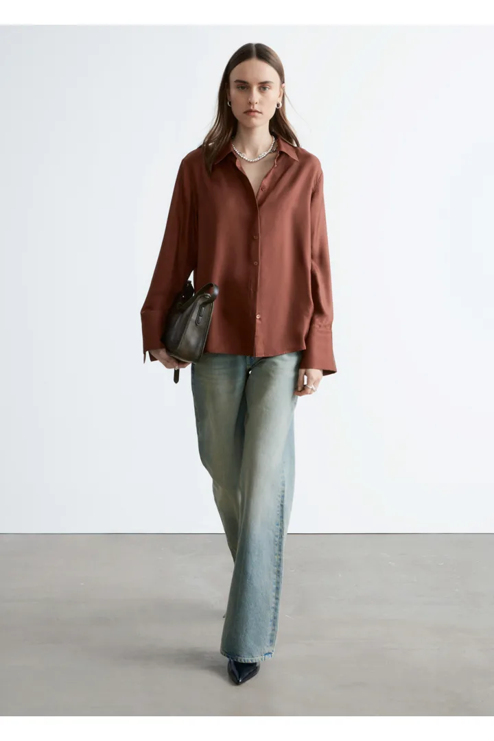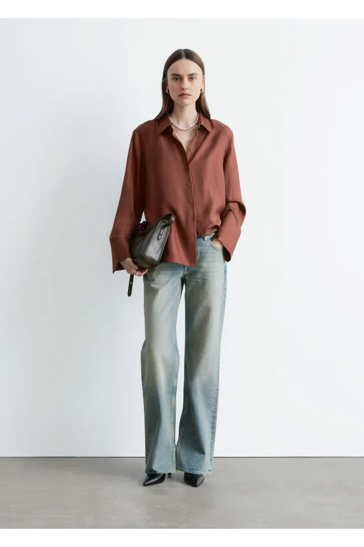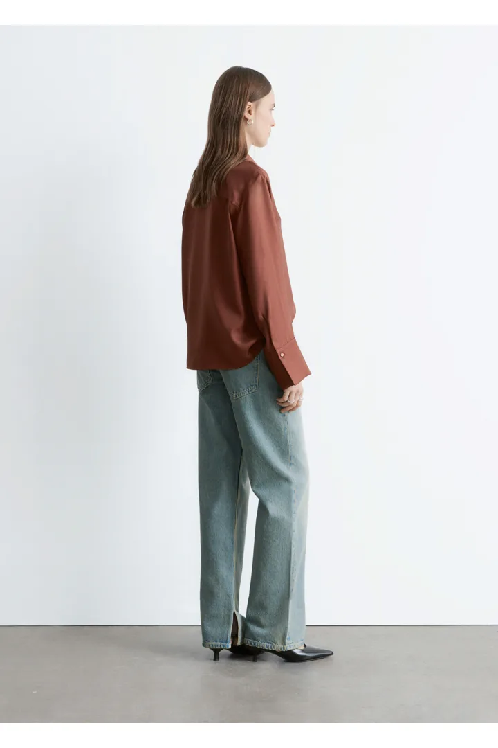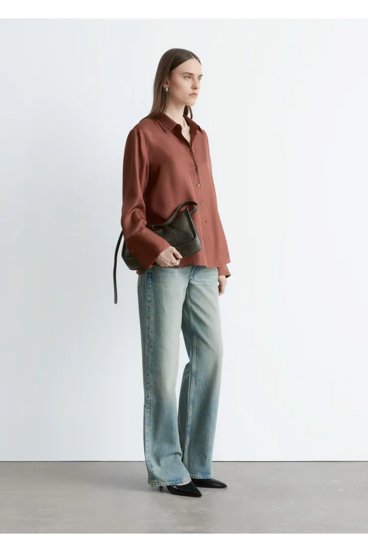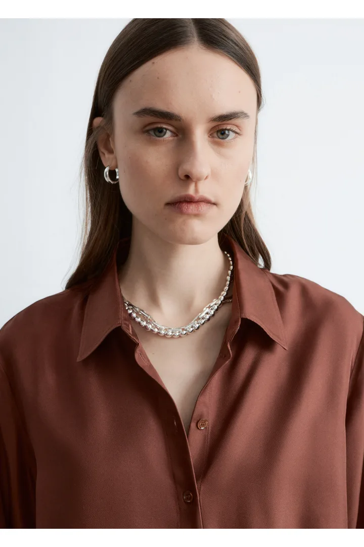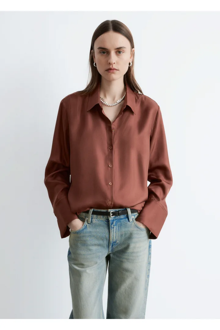 은은한 광택이 느껴지는 멀베리 실크 소재의 셔츠예요. 여유로운 실루엣이 특징으로 클래식한 카라, 1개의 단추가 자리한 와이드 커프스, 그리고 앞면의 단추가 자리해 있어요.