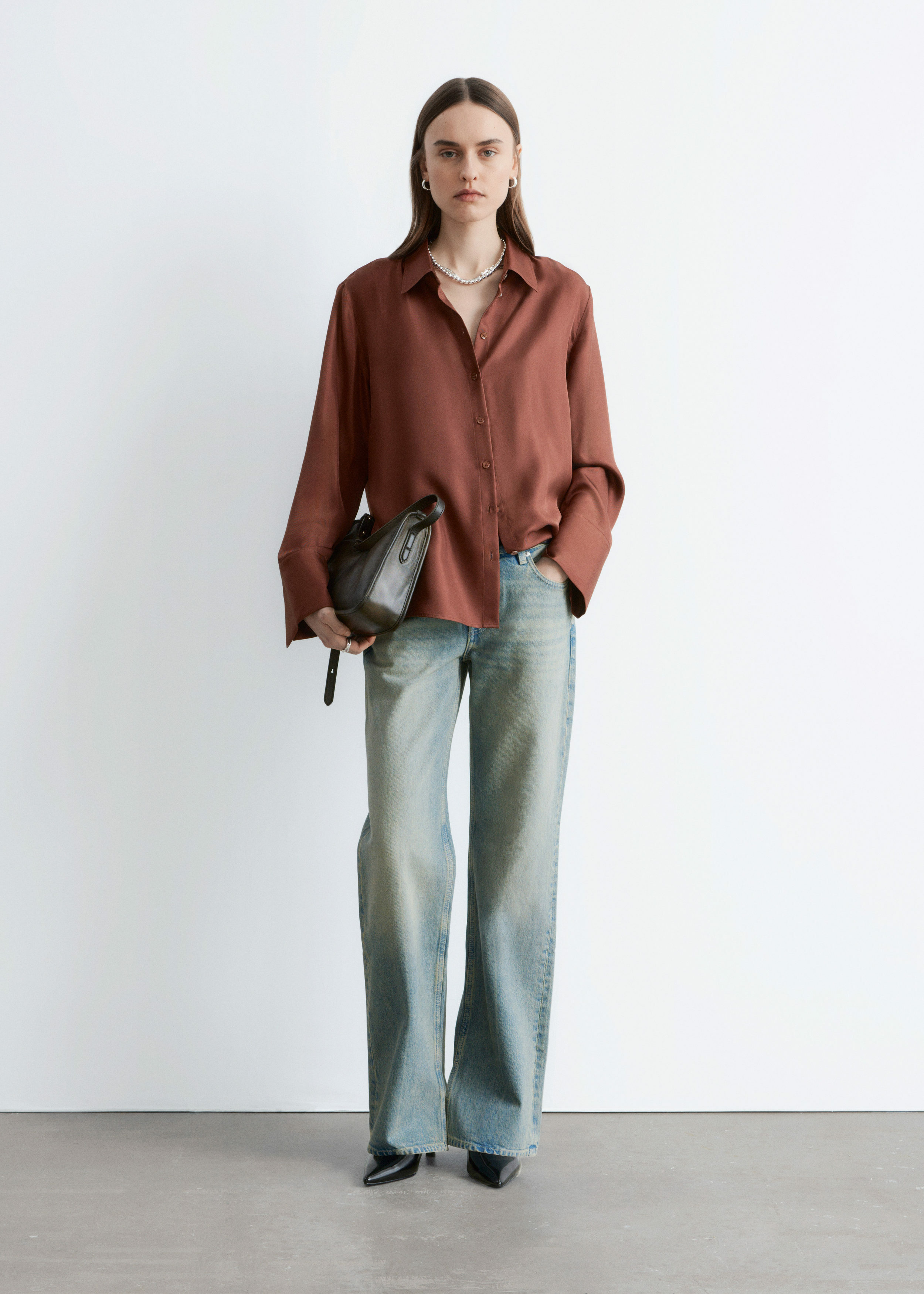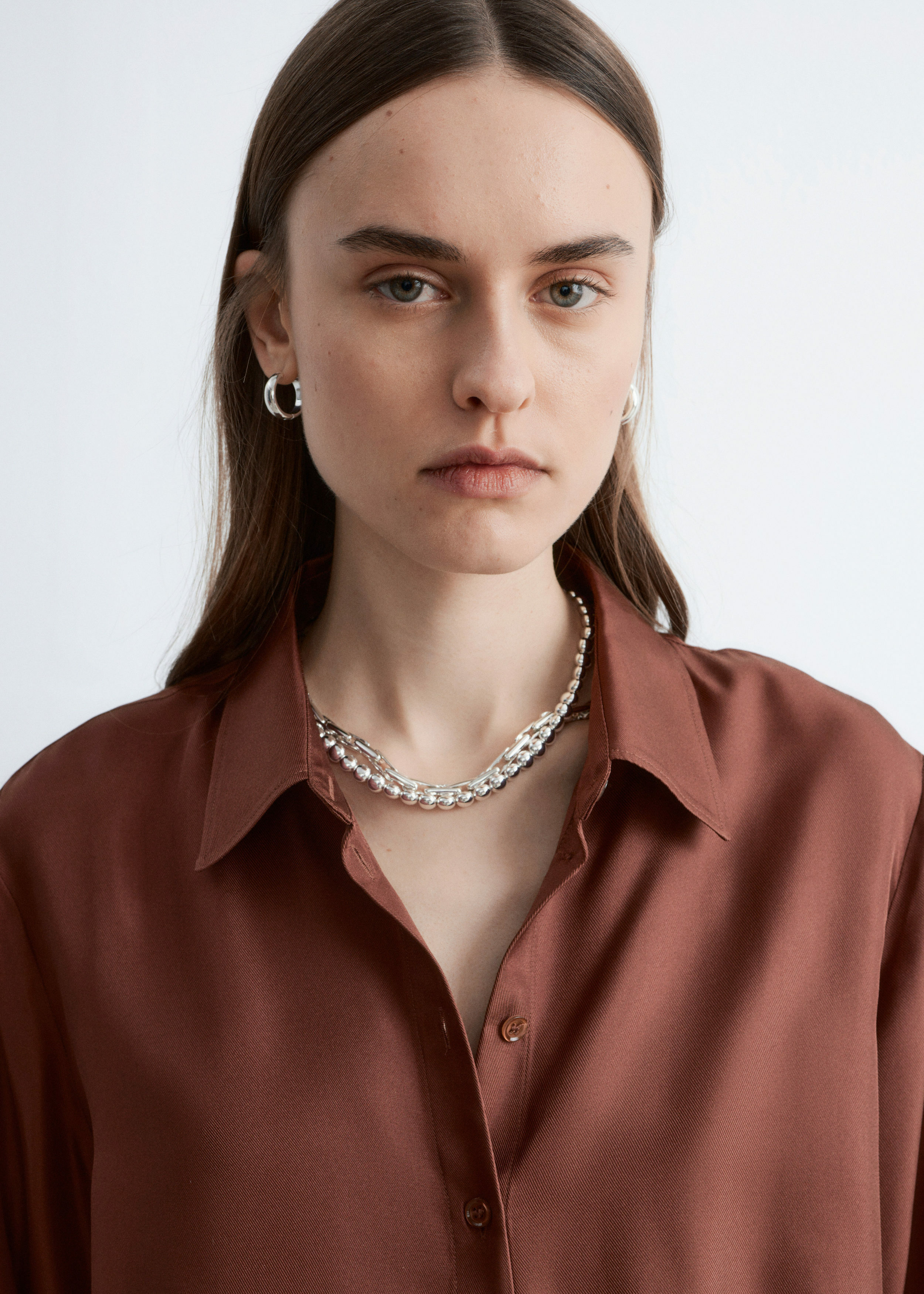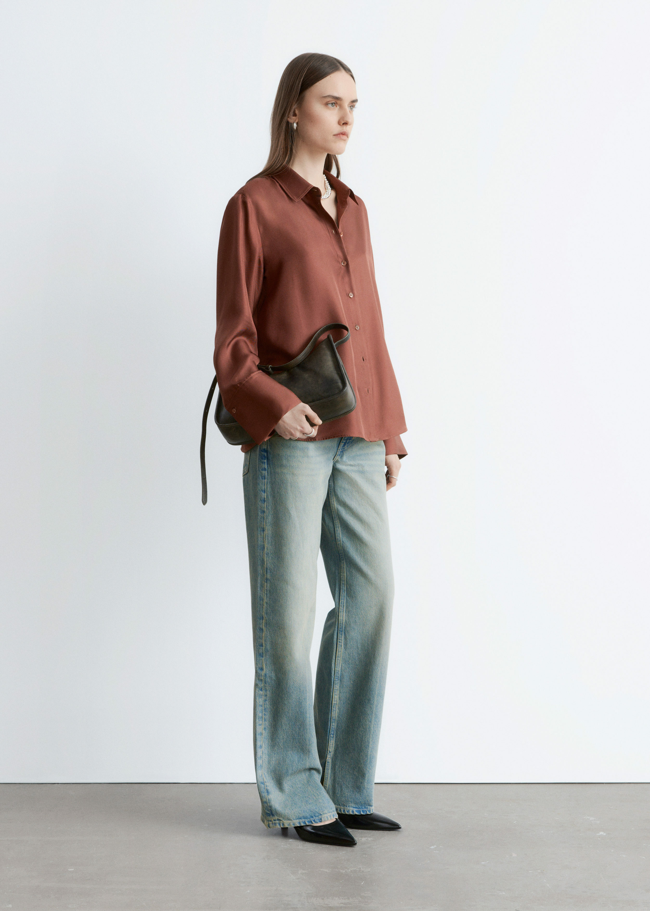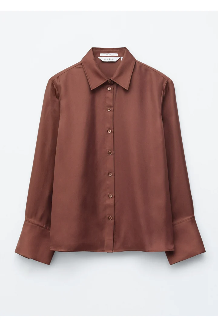 은은한 광택이 느껴지는 멀베리 실크 소재의 셔츠예요. 여유로운 실루엣이 특징으로 클래식한 카라, 1개의 단추가 자리한 와이드 커프스, 그리고 앞면의 단추가 자리해 있어요.