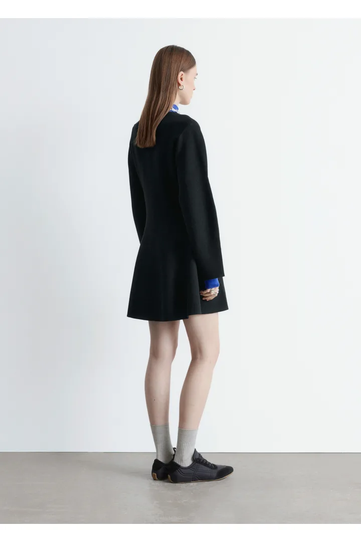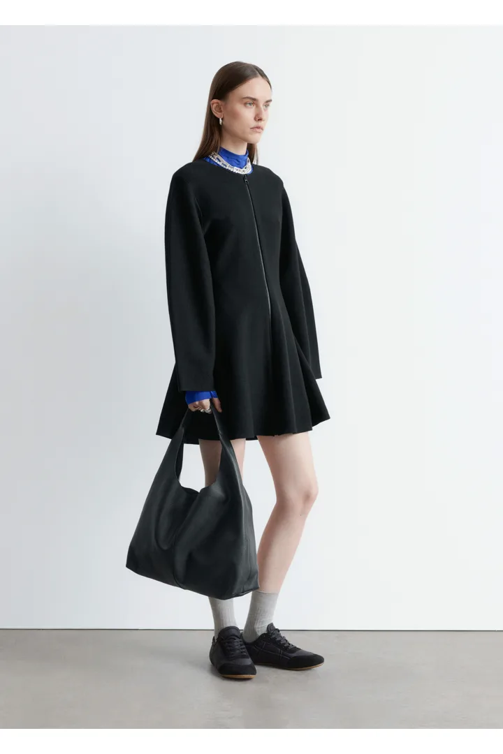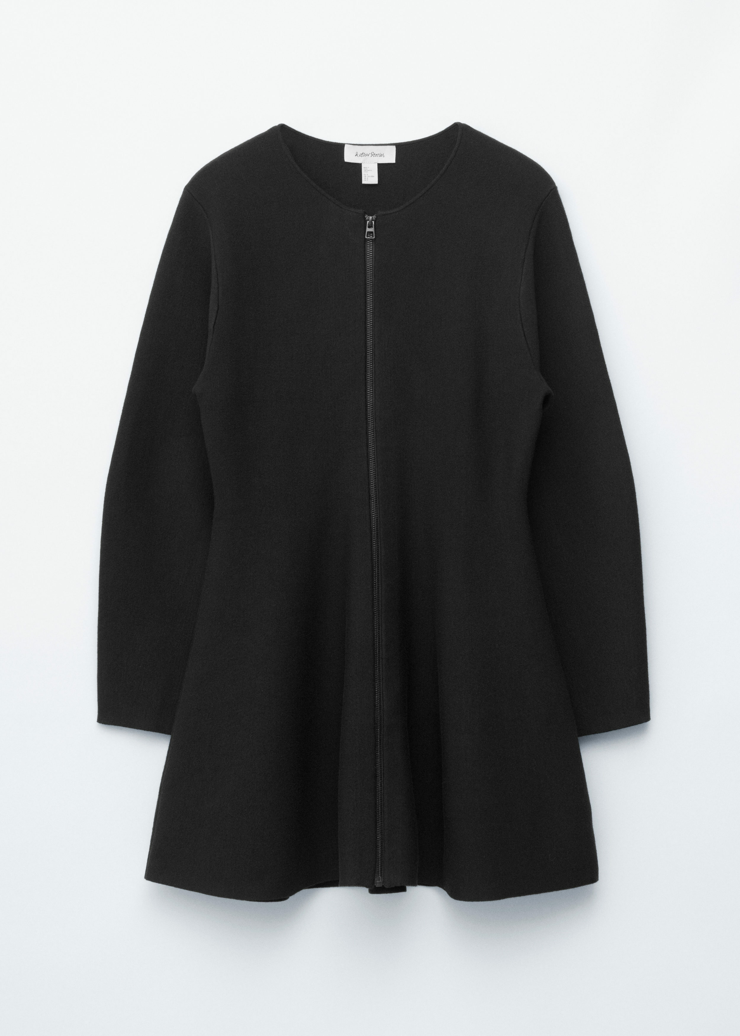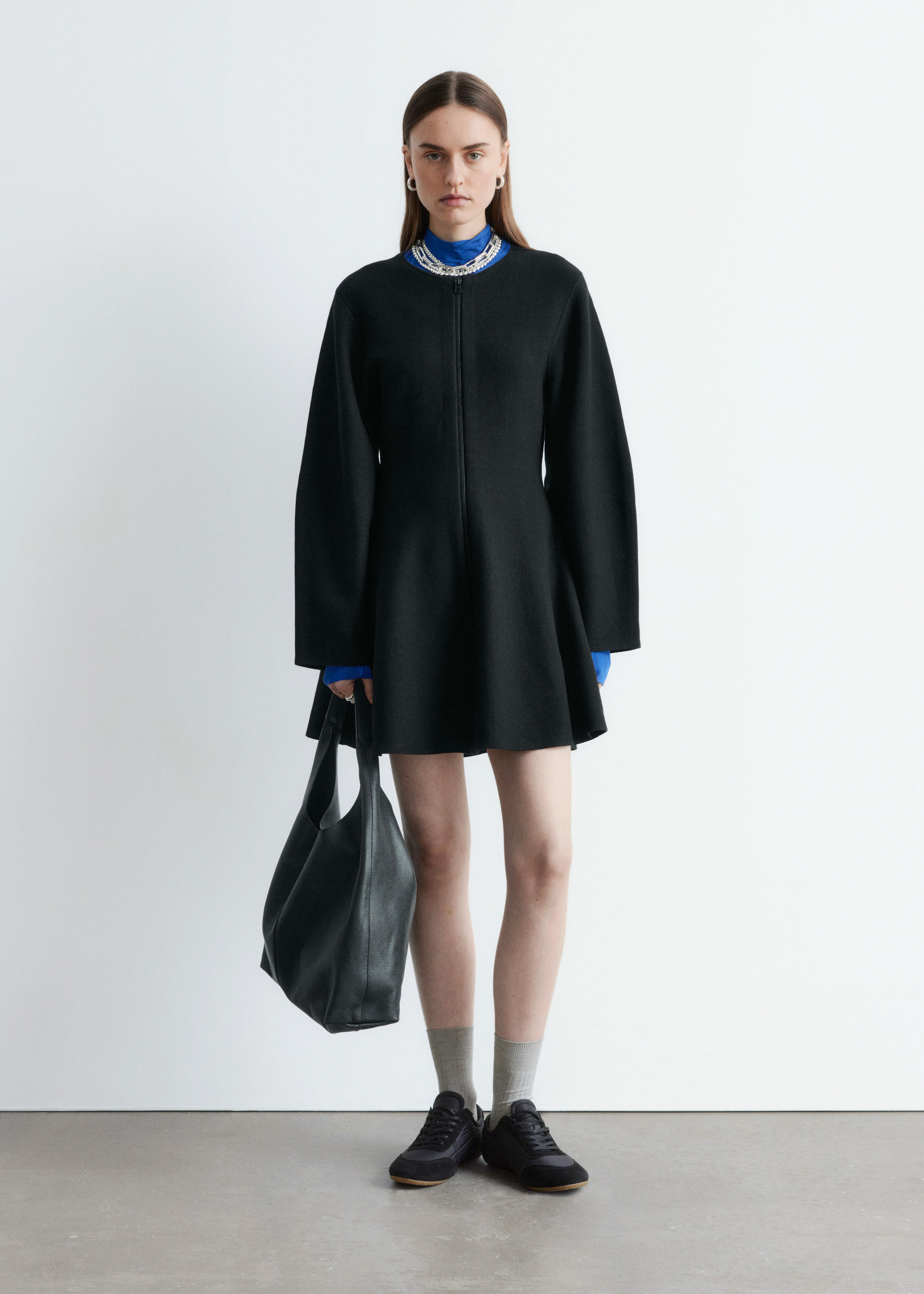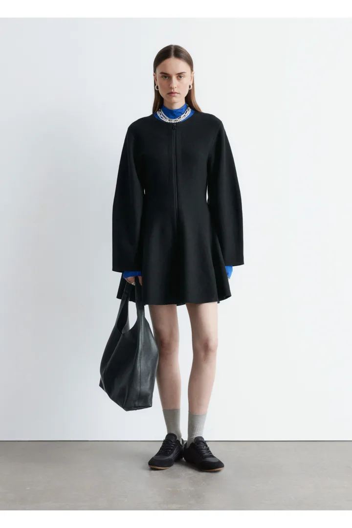 모던한 감각의 구조적 실루엣이 돋보이는 니트 미니 드레스예요. 라운드 네크라인, 핏 되는 보디스, 앞면의 지퍼, 볼륨감 있는 롱 테이퍼드 슬리브와 커프스, 플레어 스커트가 특징이랍니다.