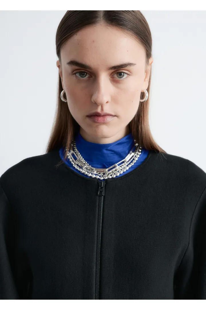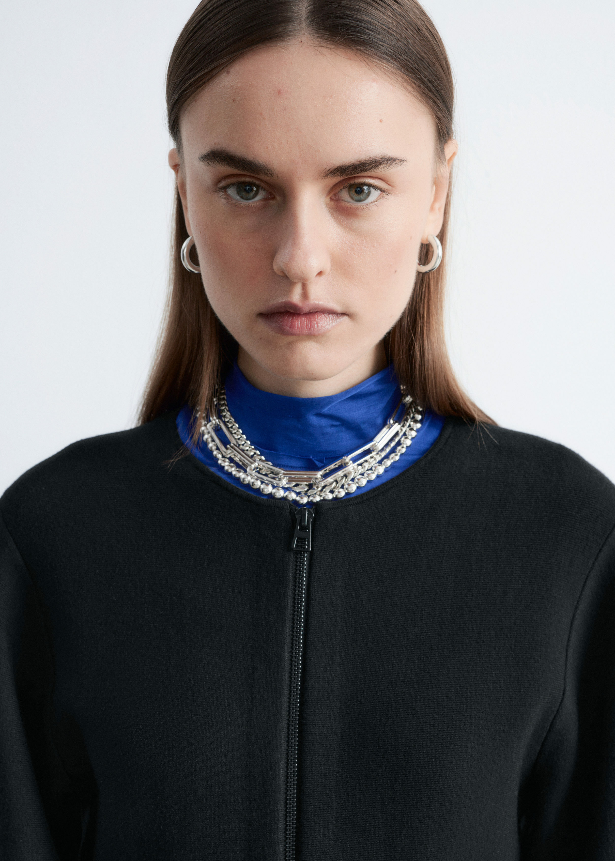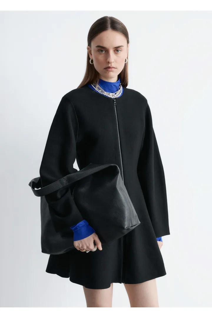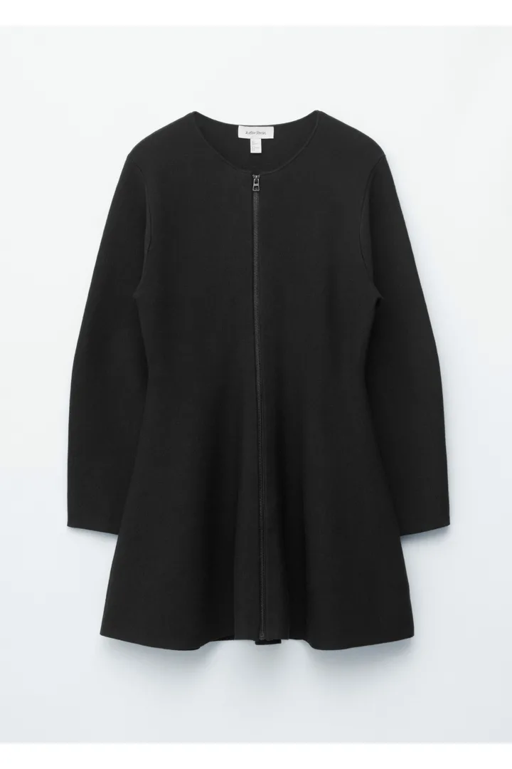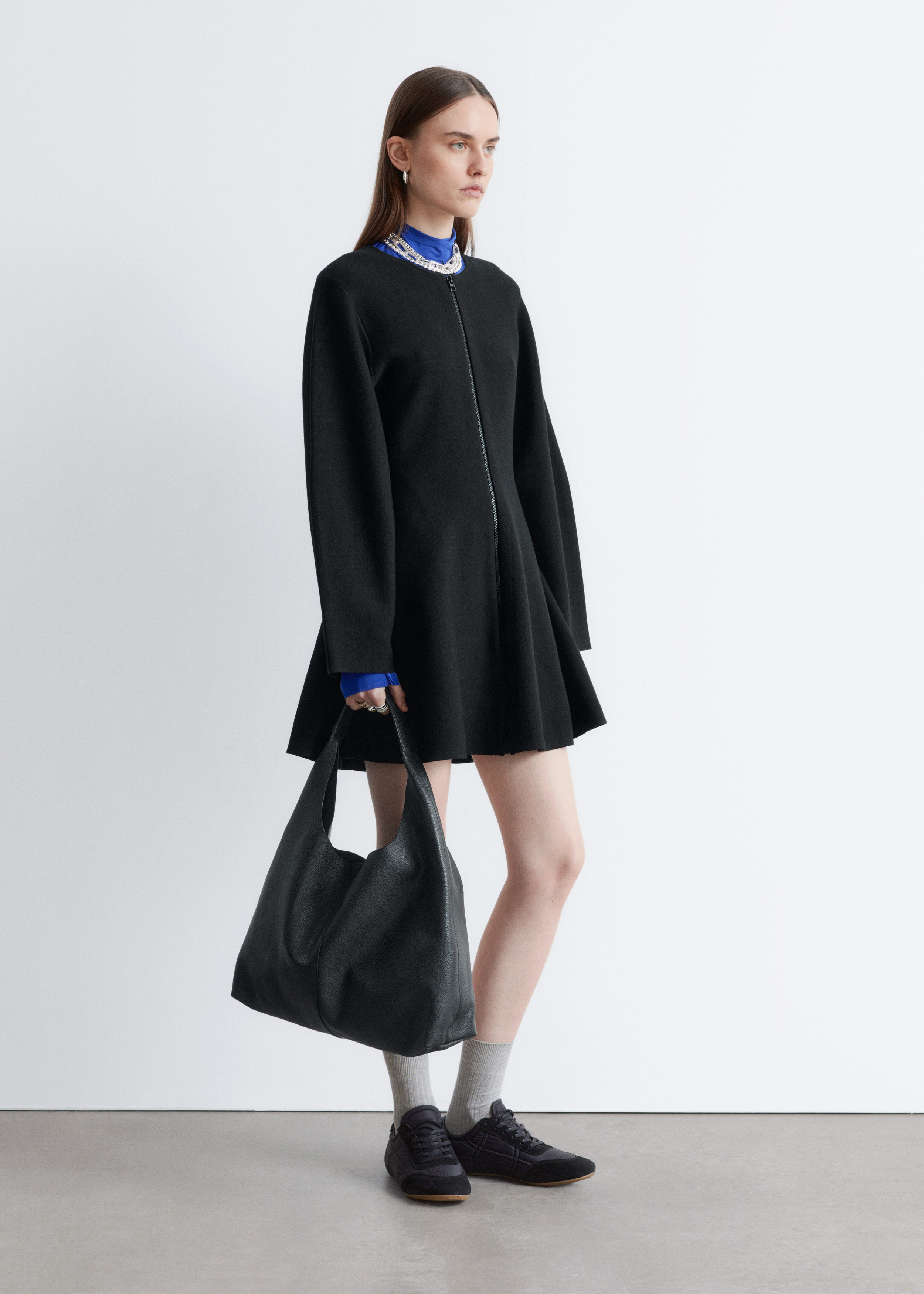 모던한 감각의 구조적 실루엣이 돋보이는 니트 미니 드레스예요. 라운드 네크라인, 핏 되는 보디스, 앞면의 지퍼, 볼륨감 있는 롱 테이퍼드 슬리브와 커프스, 플레어 스커트가 특징이랍니다.