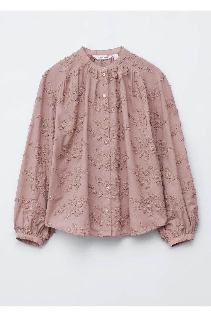 볼륨감 있는 쉐입의 롱 슬리브 블라우스예요. 스탠드 업 카라, 플로럴 아플리케 디테일, 개더링 주름이 잡힌 커프스가 특징이랍니다.