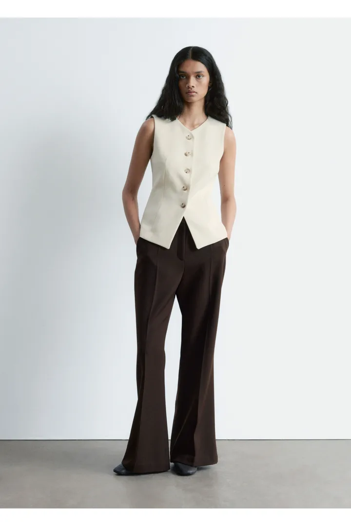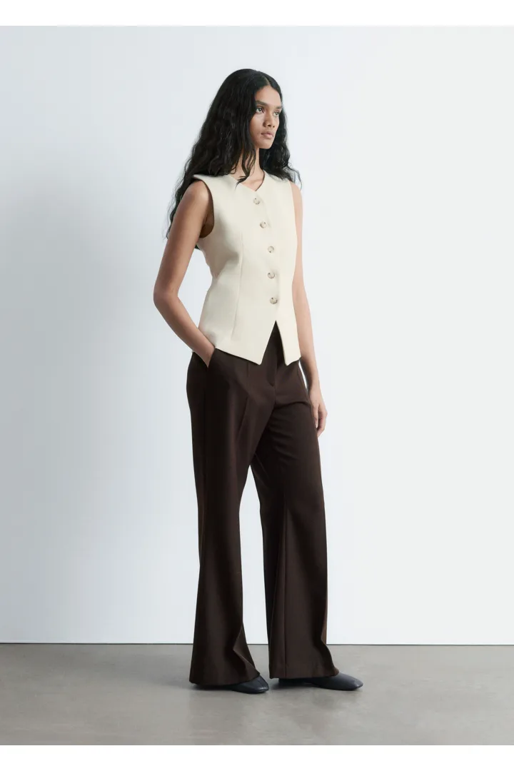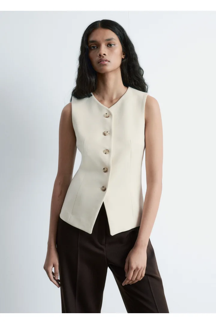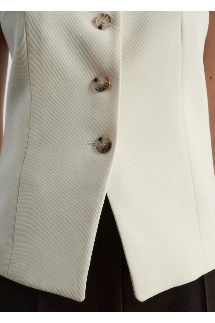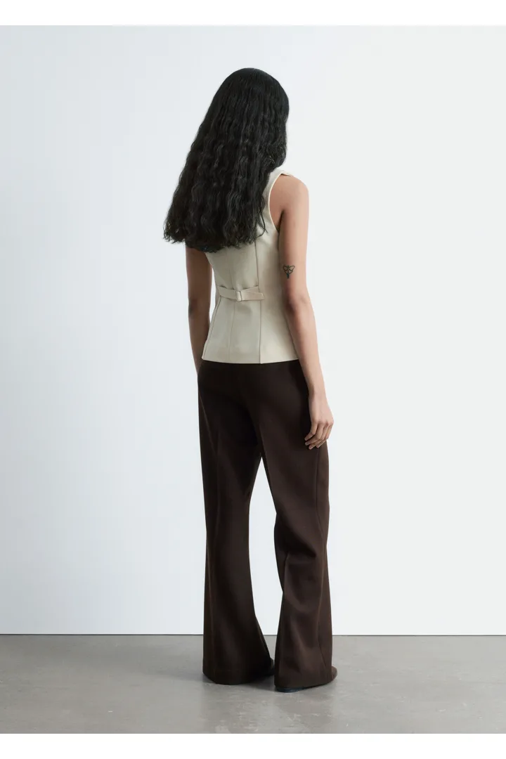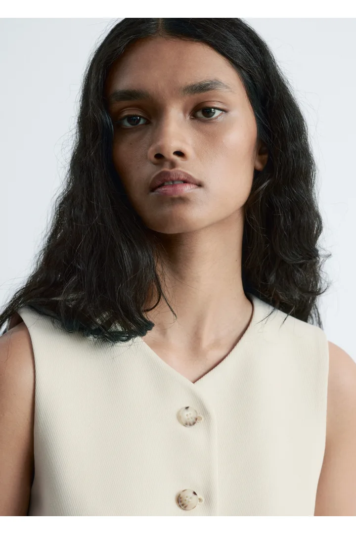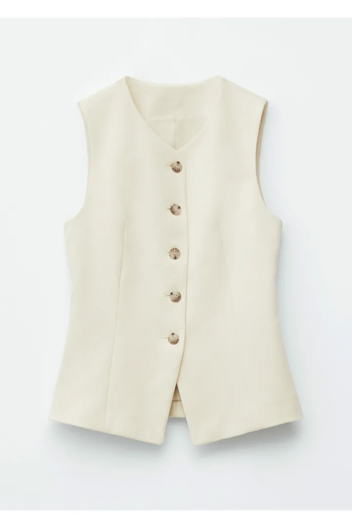더블 클로스 원단으로 탄생한 베스트예요. 은은하게 부드러운 쉐입의 V 넥, 단추 디테일, 그리고 테일러드 실루엣을 연출하는 허리의 다트가 특징이에요. 뒷면에는 벨트와 버클이 있어 허리를 더욱 강조한답니다.