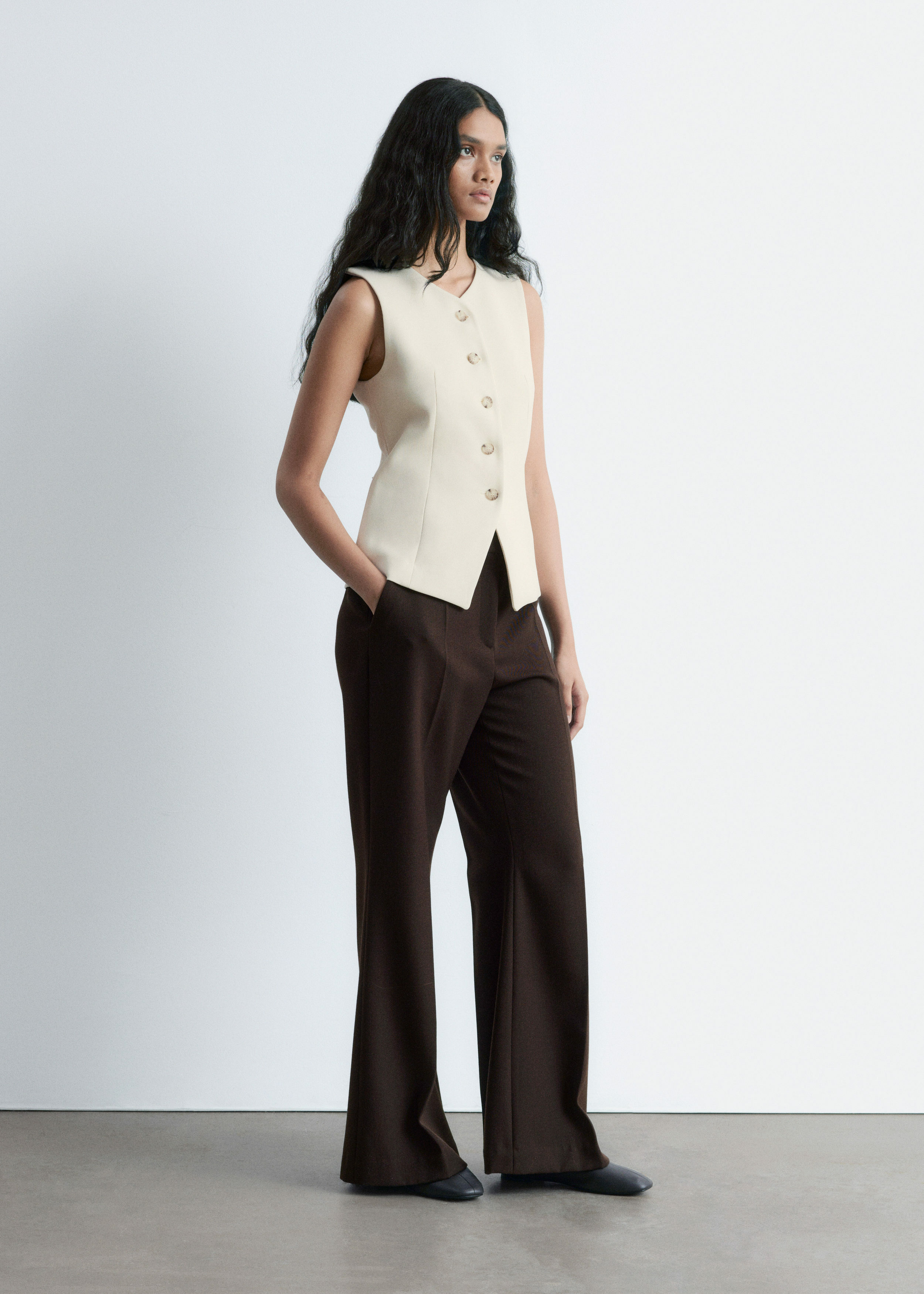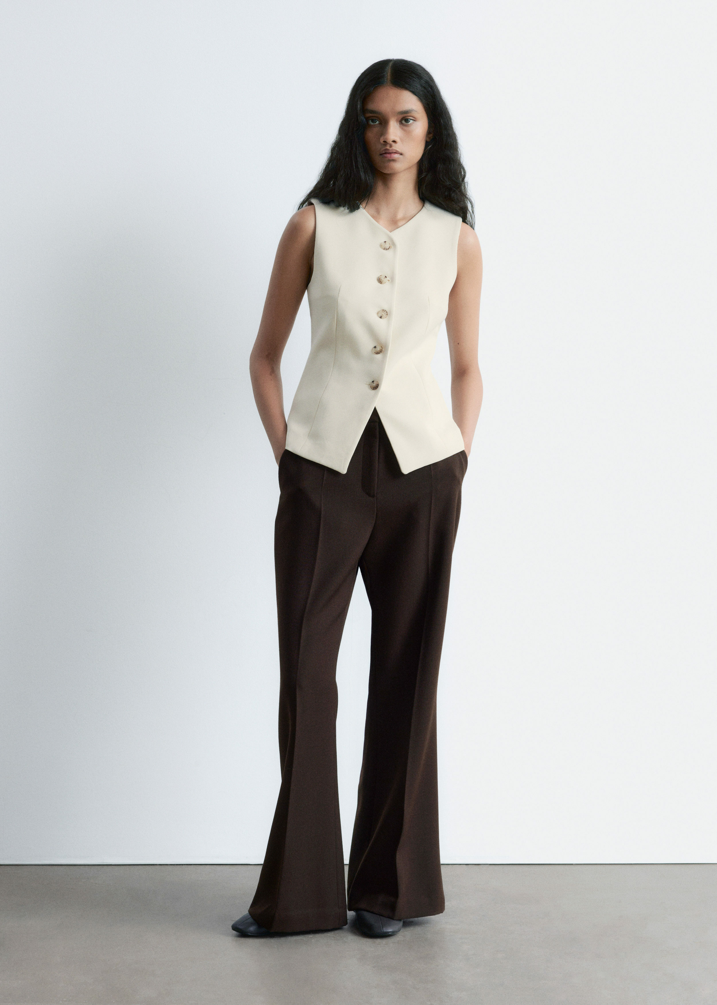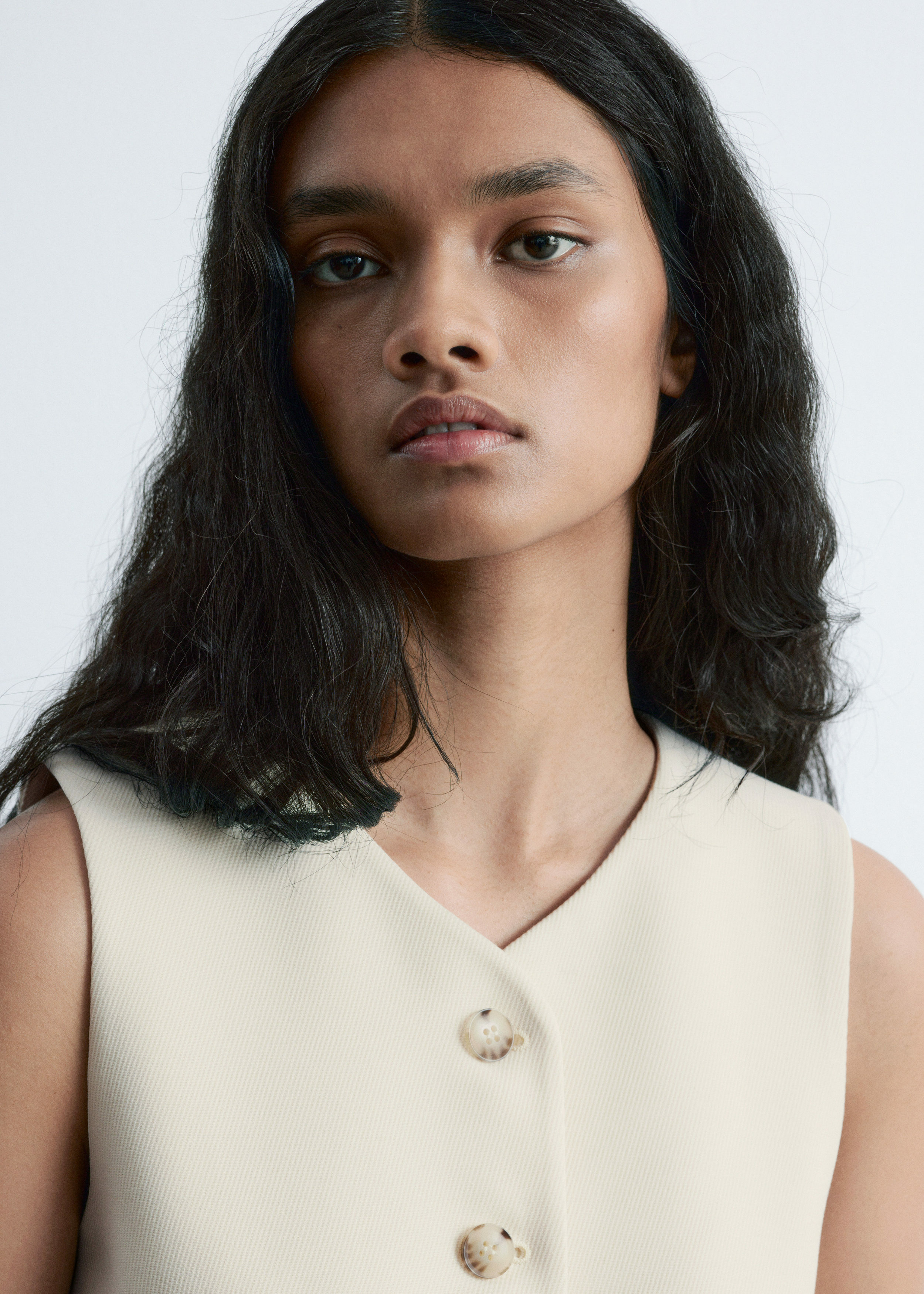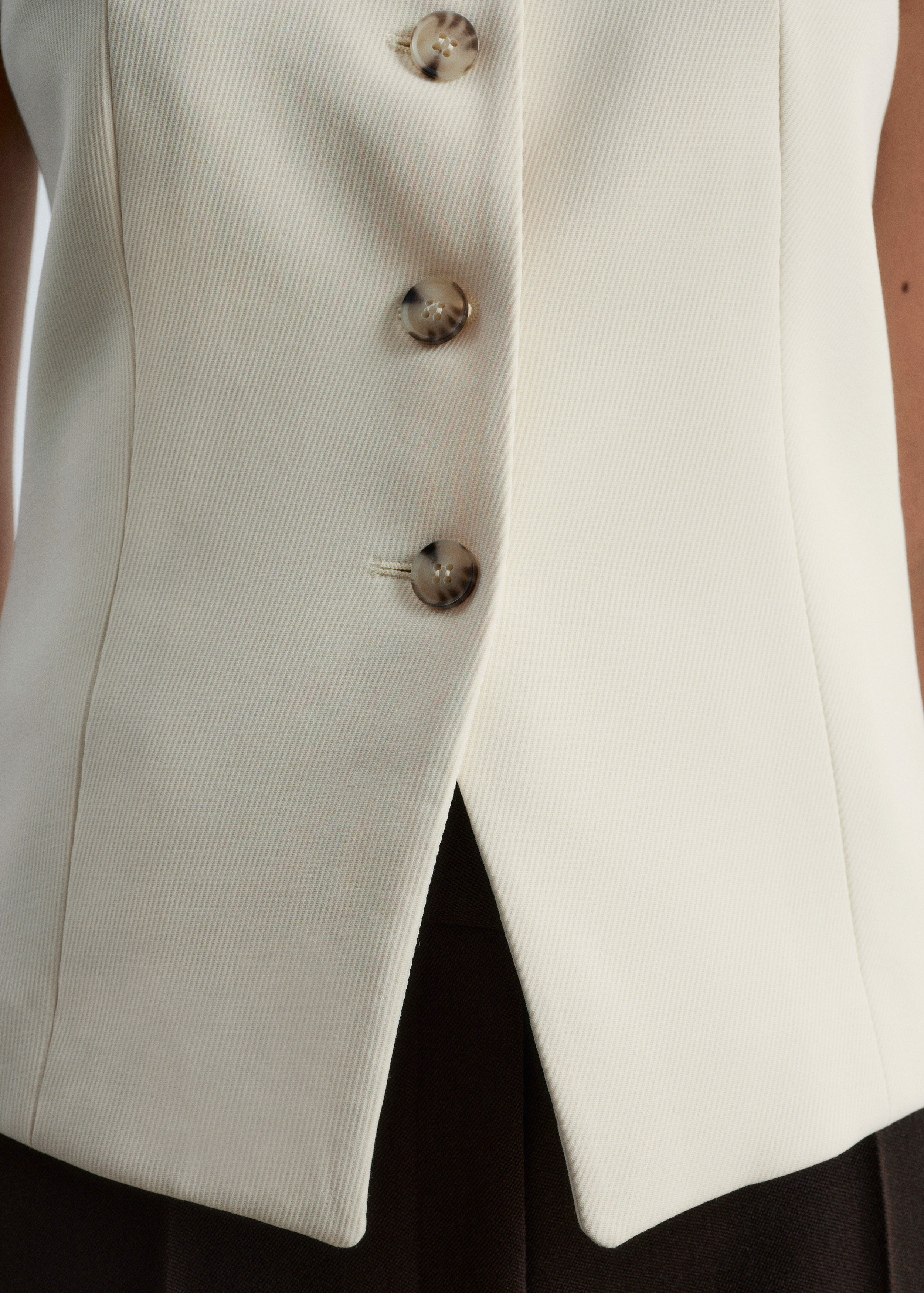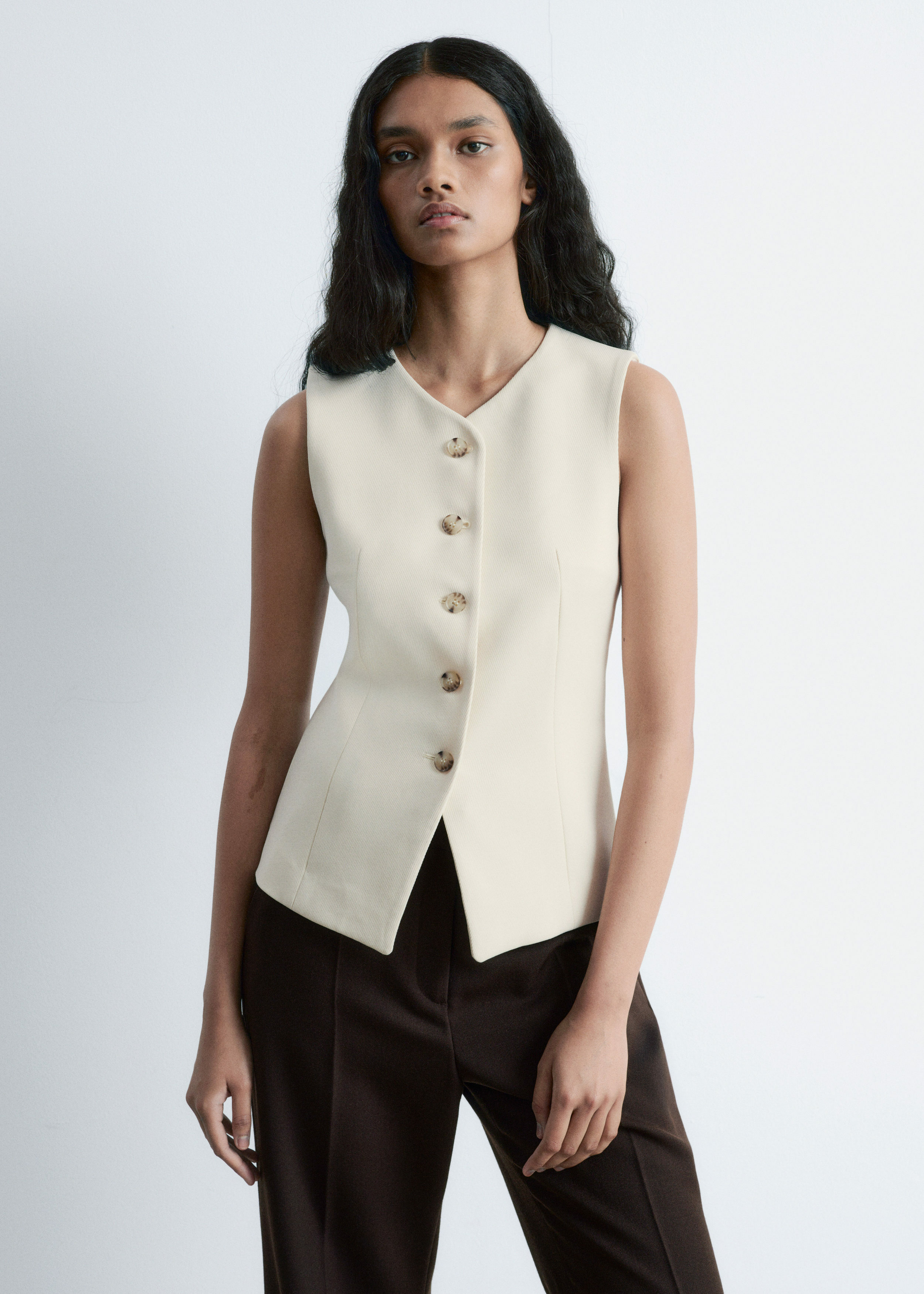 더블 클로스 원단으로 탄생한 베스트예요. 은은하게 부드러운 쉐입의 V 넥, 단추 디테일, 그리고 테일러드 실루엣을 연출하는 허리의 다트가 특징이에요. 뒷면에는 벨트와 버클이 있어 허리를 더욱 강조한답니다.