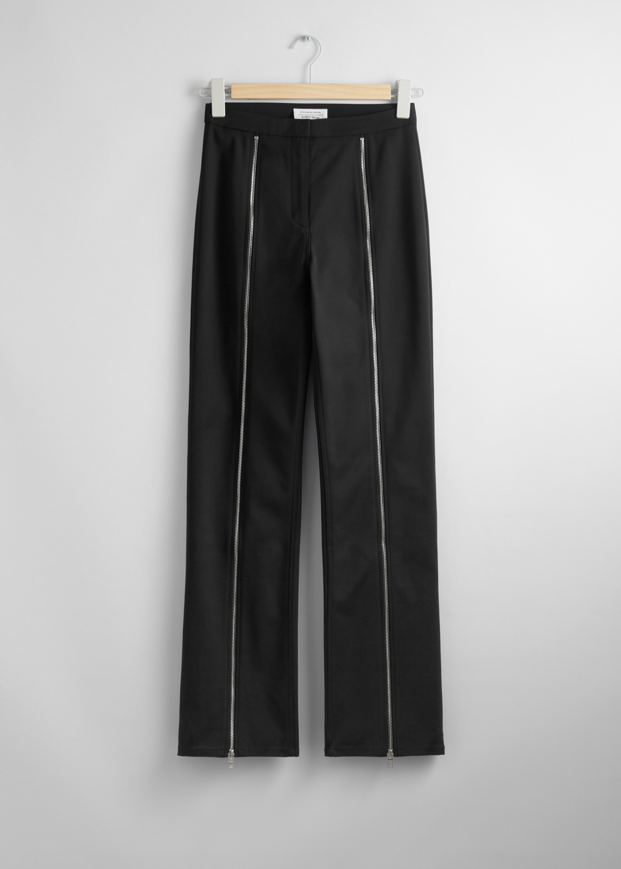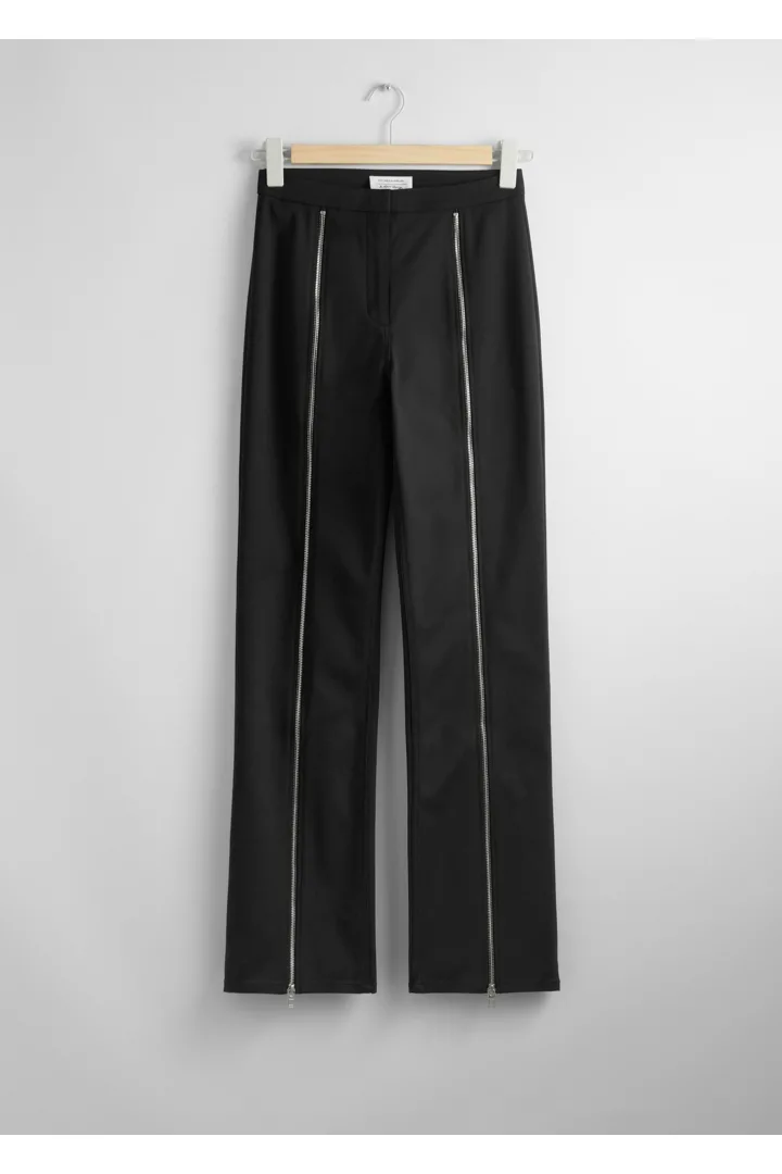 실버 톤의 지퍼로 쉐입과 볼륨을 조절할 수 있는 트라우저예요.