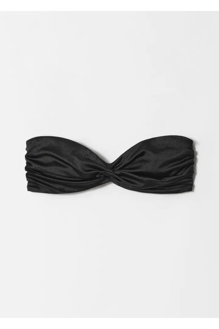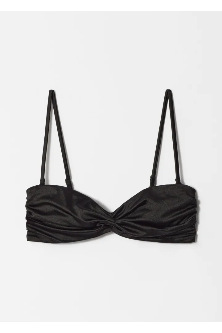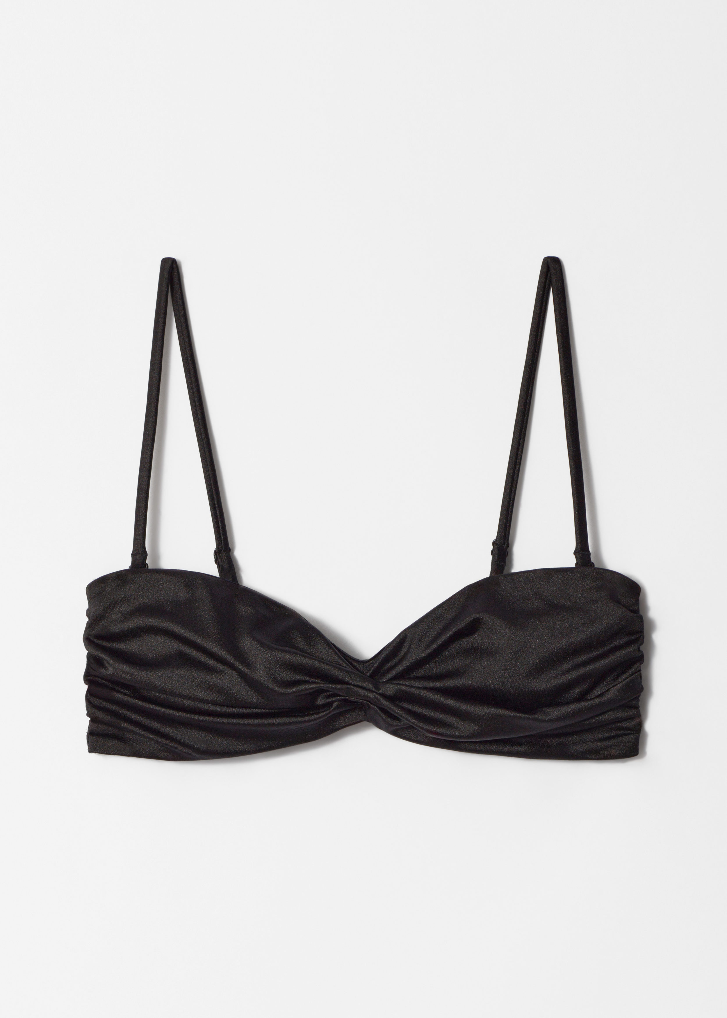광택감이 도는 트리코트 소재로 탄생한 비키니 탑이에요. 장식 주름이 돋보이며, 가벼운 패드와 뒷면의 조절형 후크 클로저가 자리해 있어요. 조절 & 탈착형 스트랩을 제거해 방도 룩을 연출해도 멋스럽답니다.
