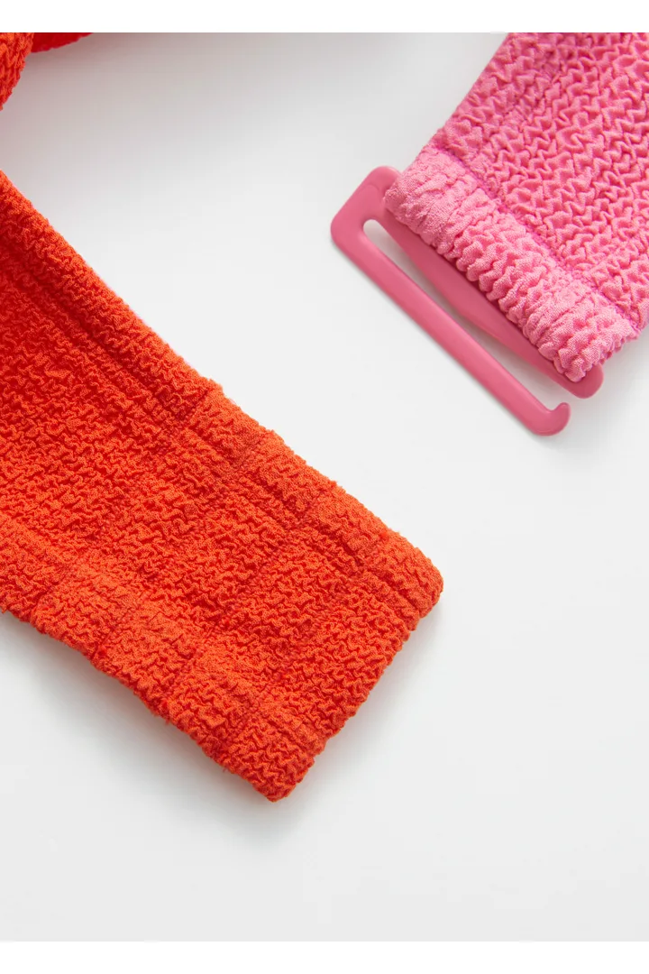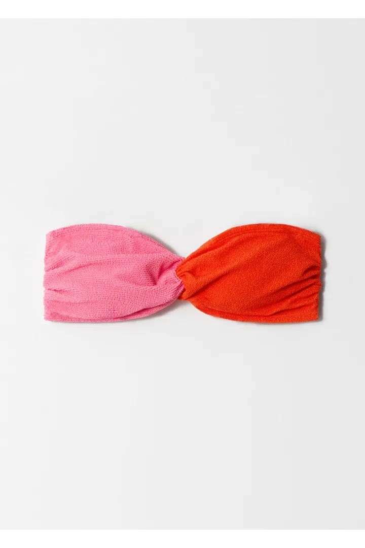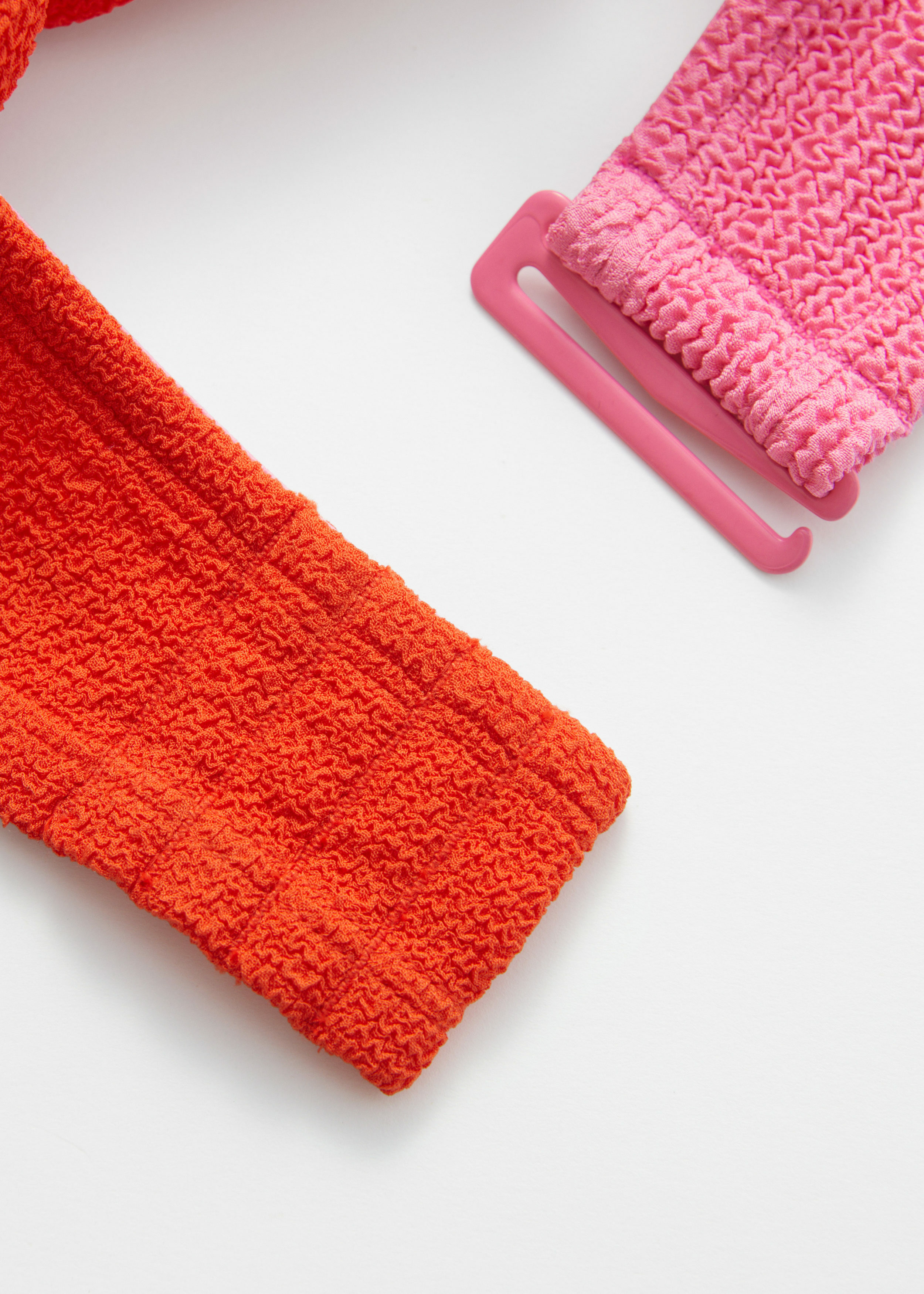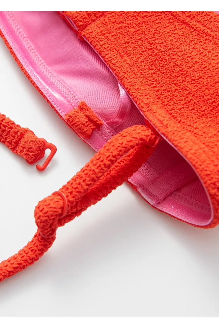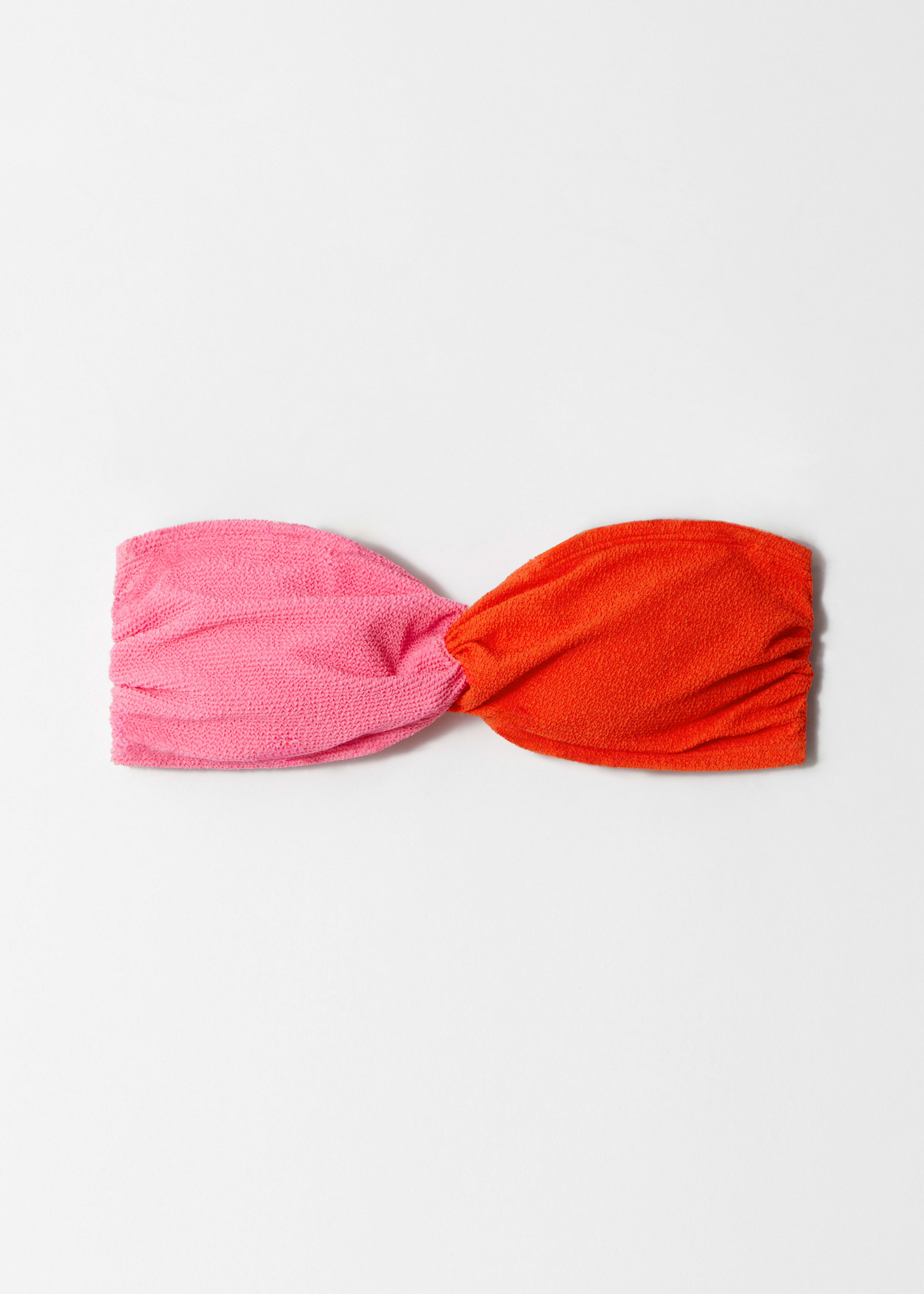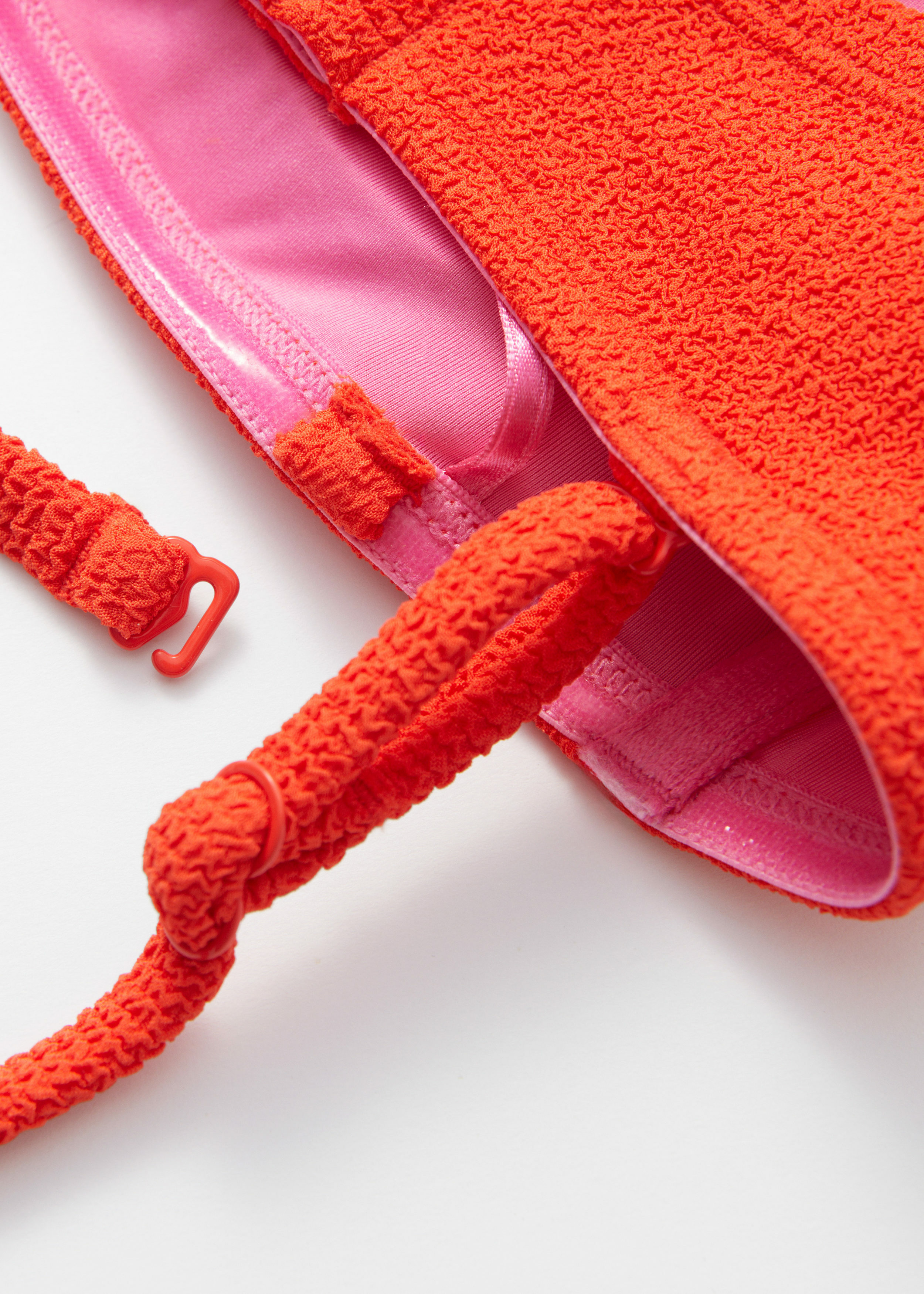 테스처 마감이 돋보이는 비키니 탑이에요. 탈부착형 스트랩을 이용해 방도 룩을 연출할 수도 있어요. 앞면 중앙에는 트위스트 디테일이 자리해 있답니다.
