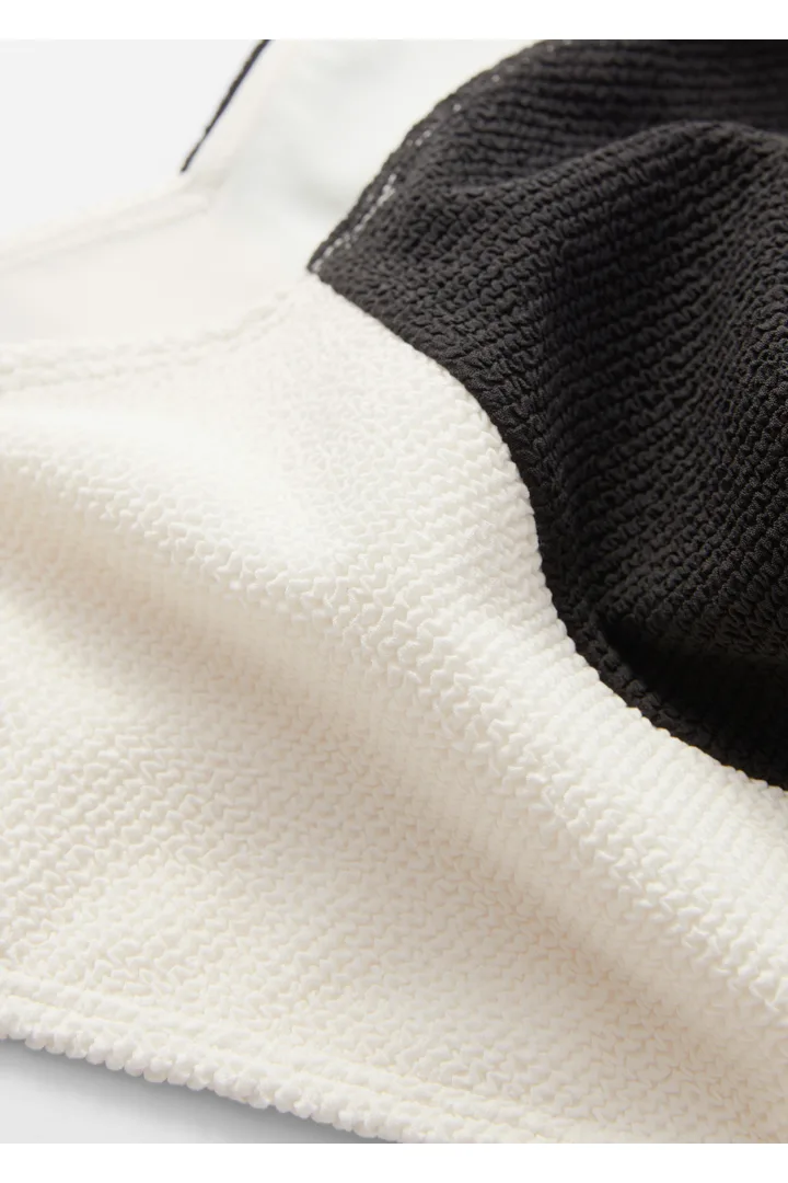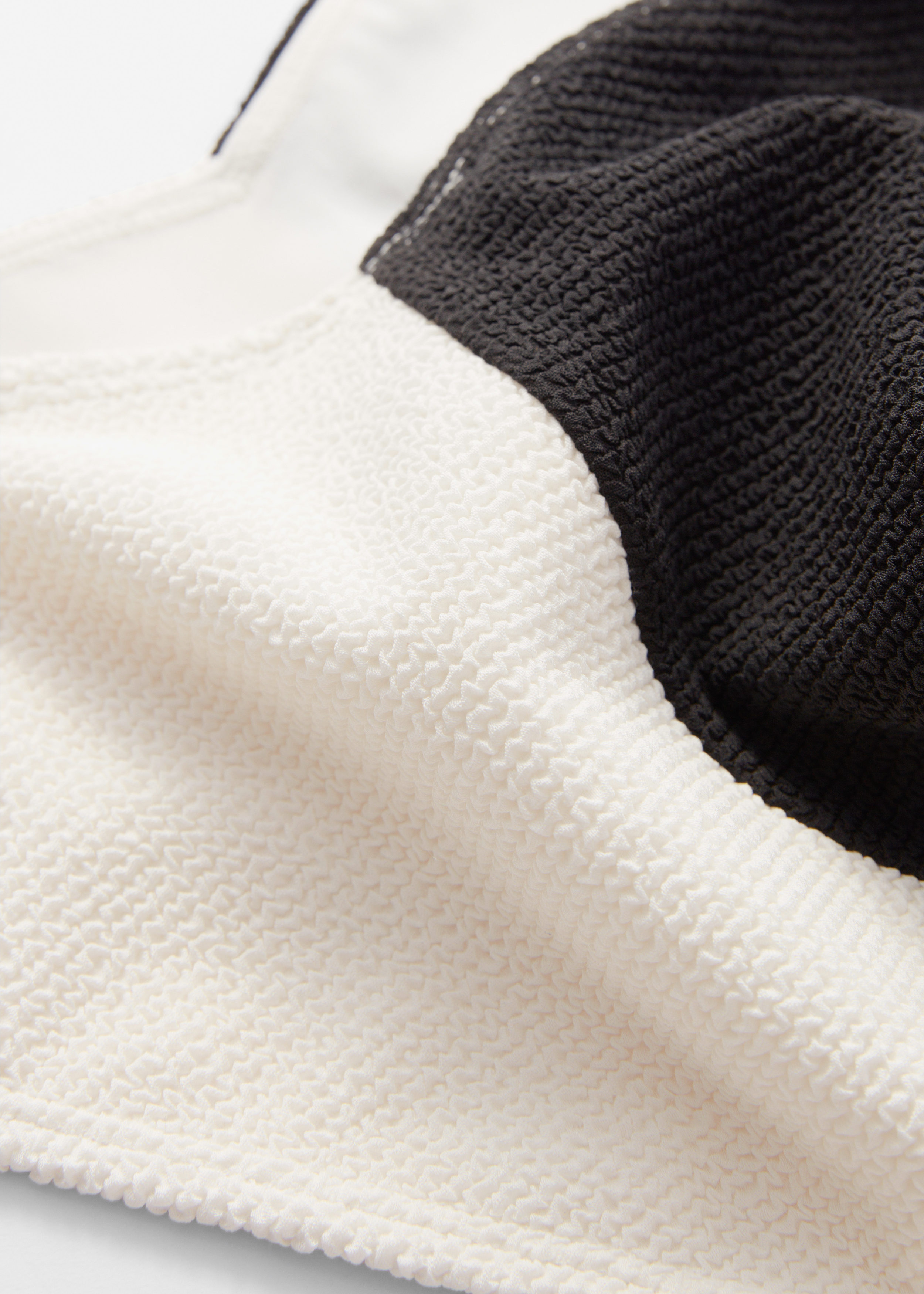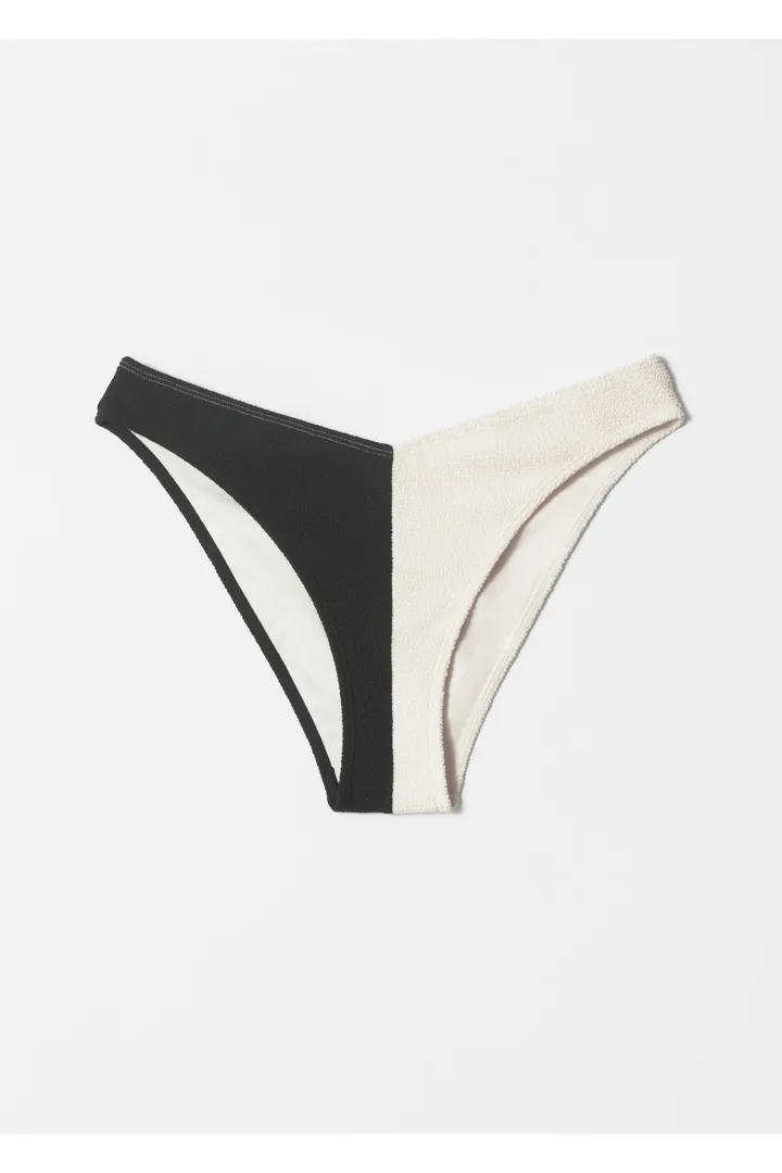 로우 웨이스트의 비키니 브리프예요. 텍스처 마감이 시선을 사로잡는답니다.
