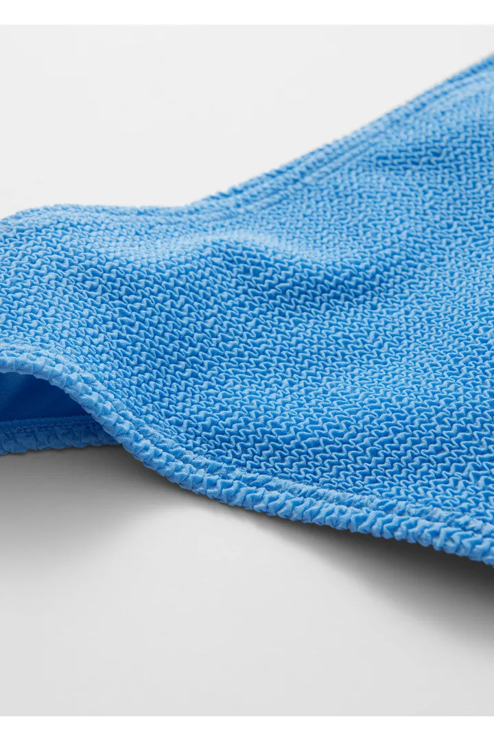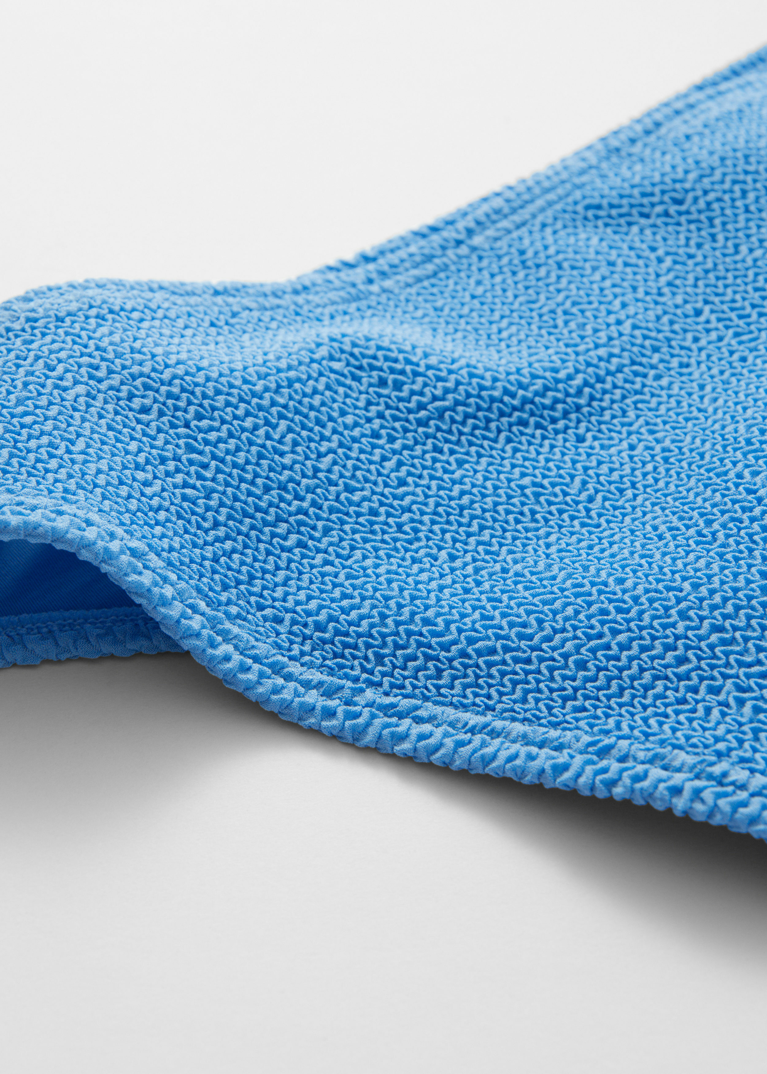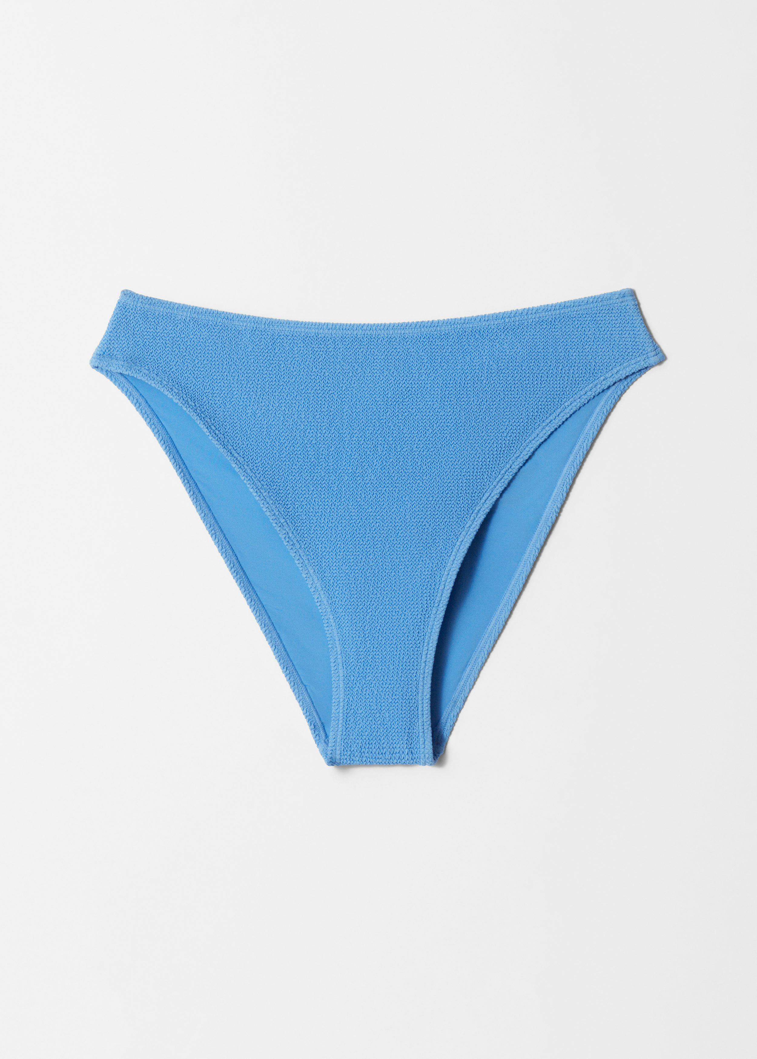 하이 웨이스트의 비키니 브리프예요. 하이 컷의 레그와 텍스처 마감이 시선을 사로잡아요.