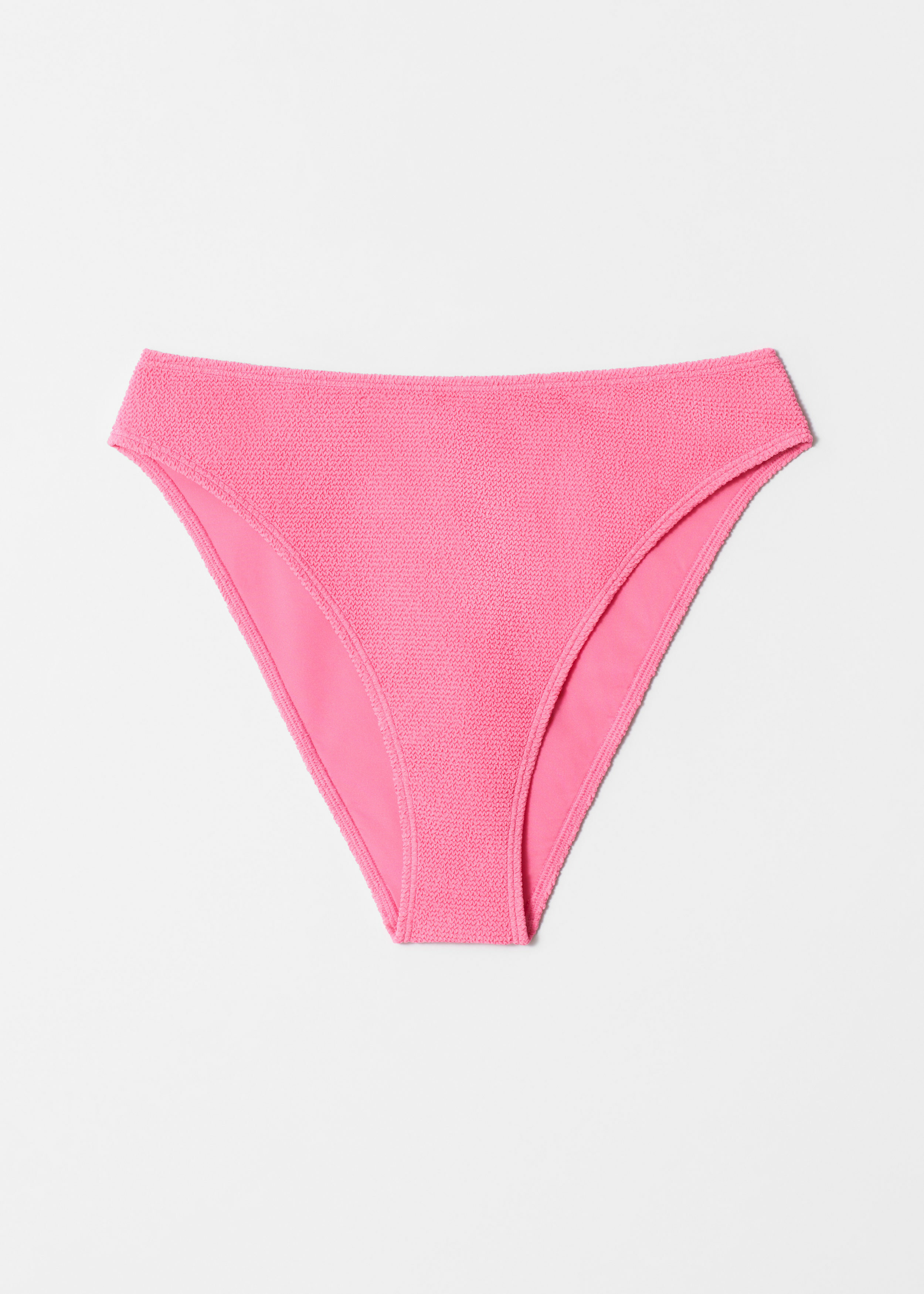 하이 웨이스트의 비키니 브리프예요. 하이 컷의 레그와 텍스처 마감이 시선을 사로잡아요.