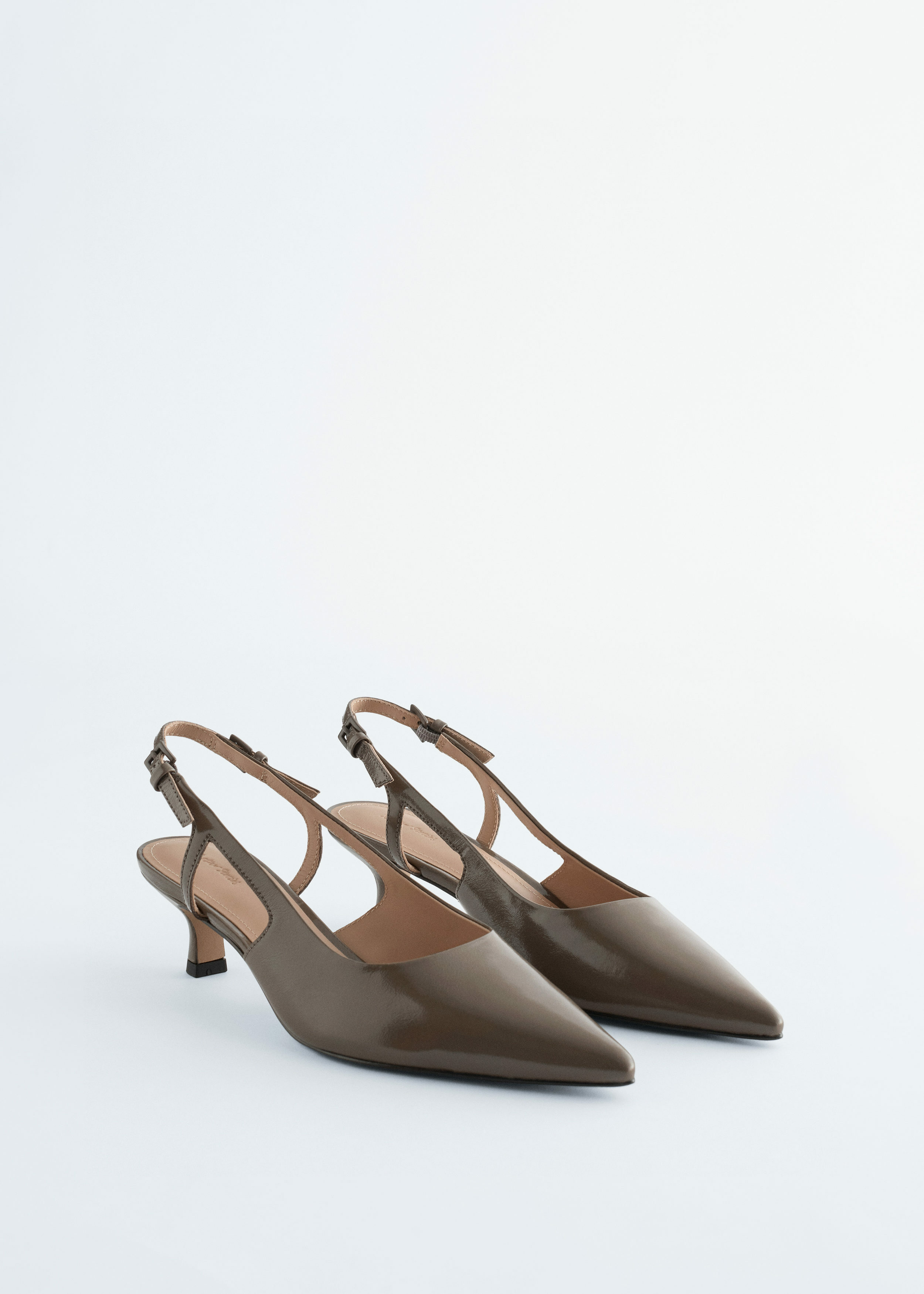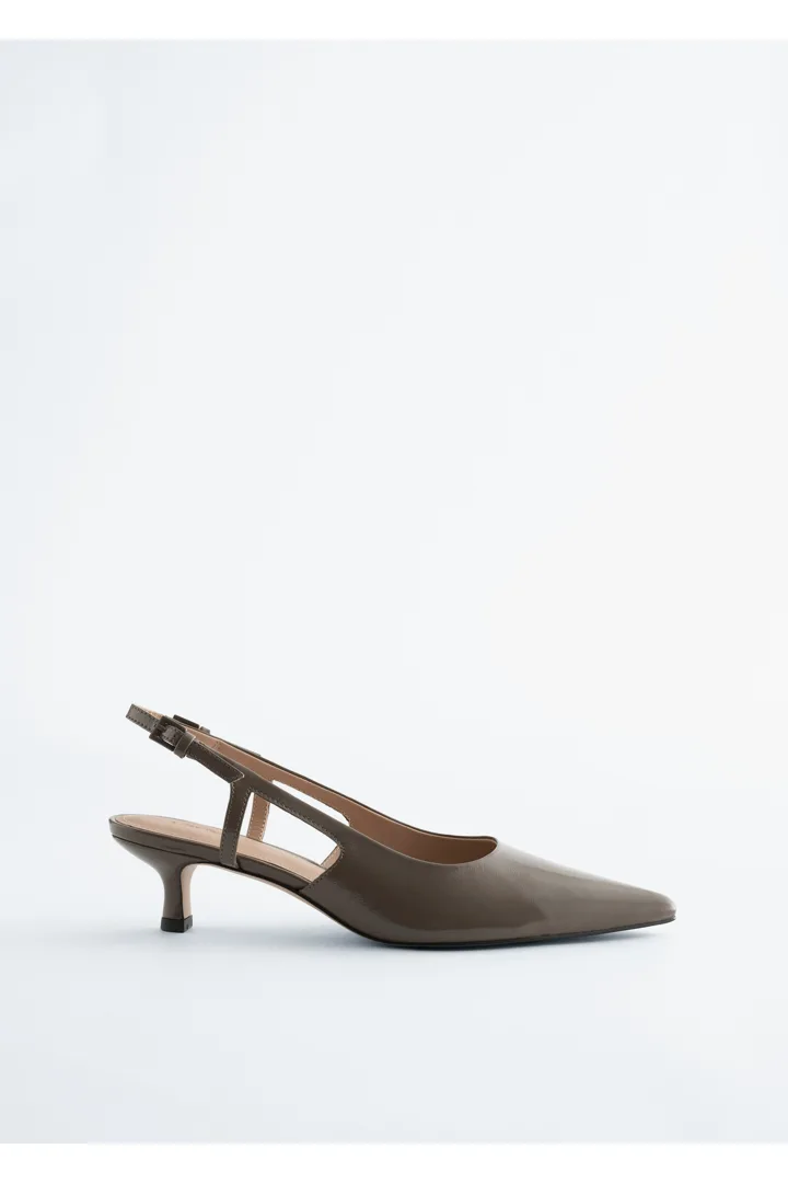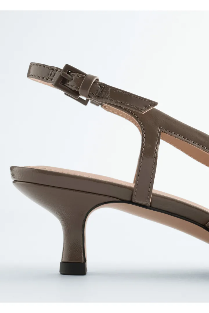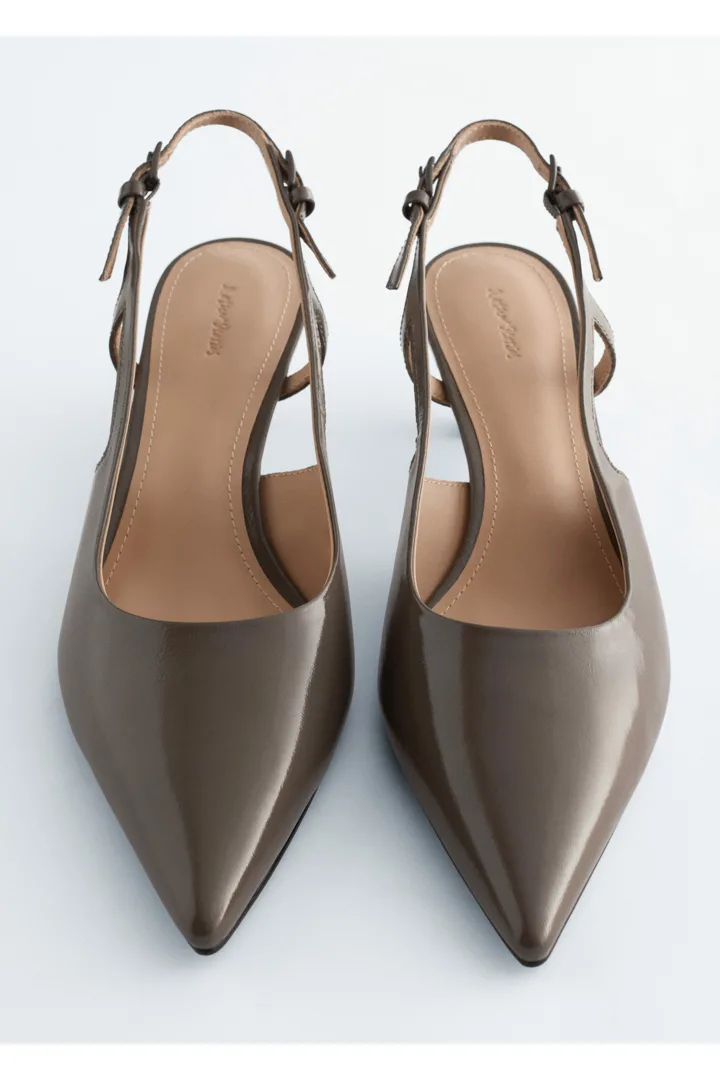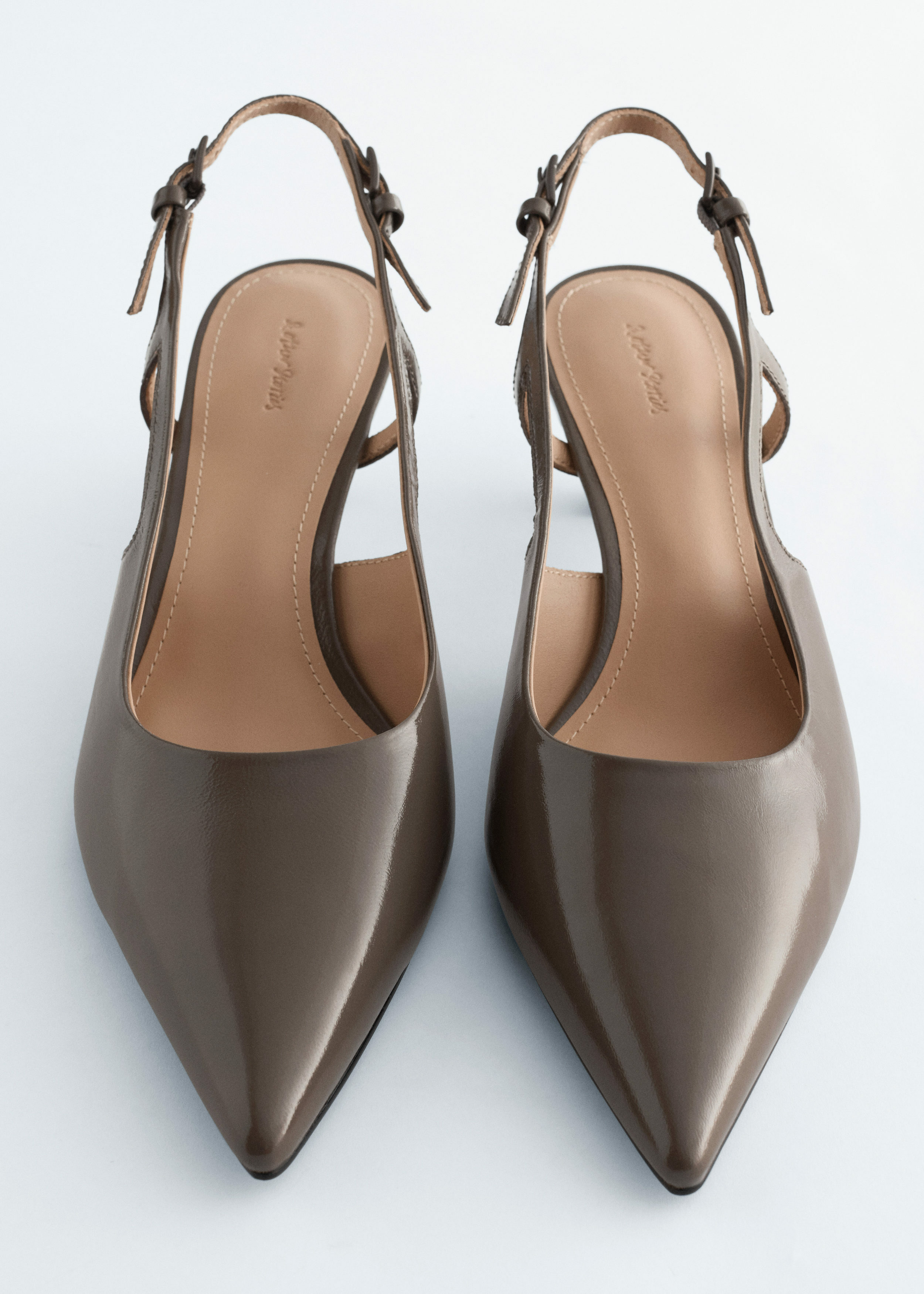 유광 페이턴트 레더 소재의 클래식 슬링백이에요. 포인트 앞코, 키튼 힐, 그리고 조절형 버클이 자리한 뒤꿈치의 슬림 스트랩이 특징이랍니다.