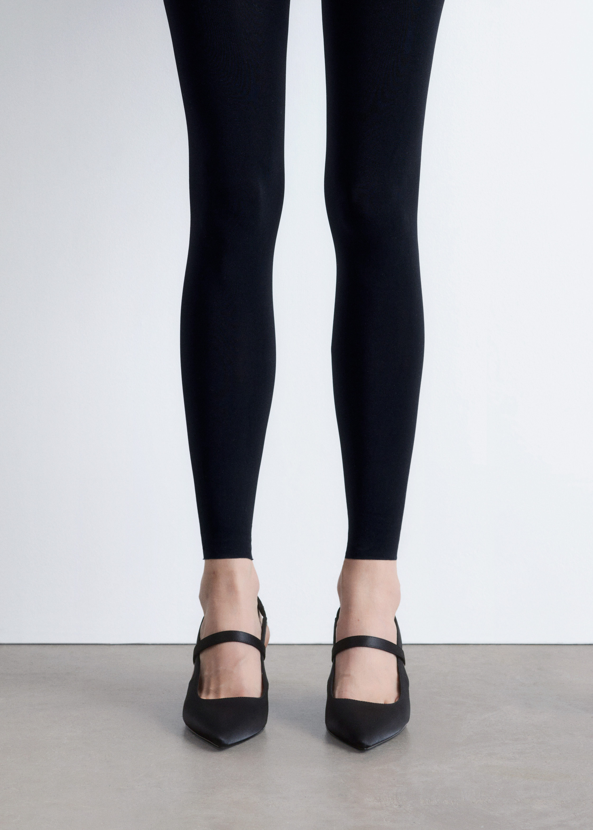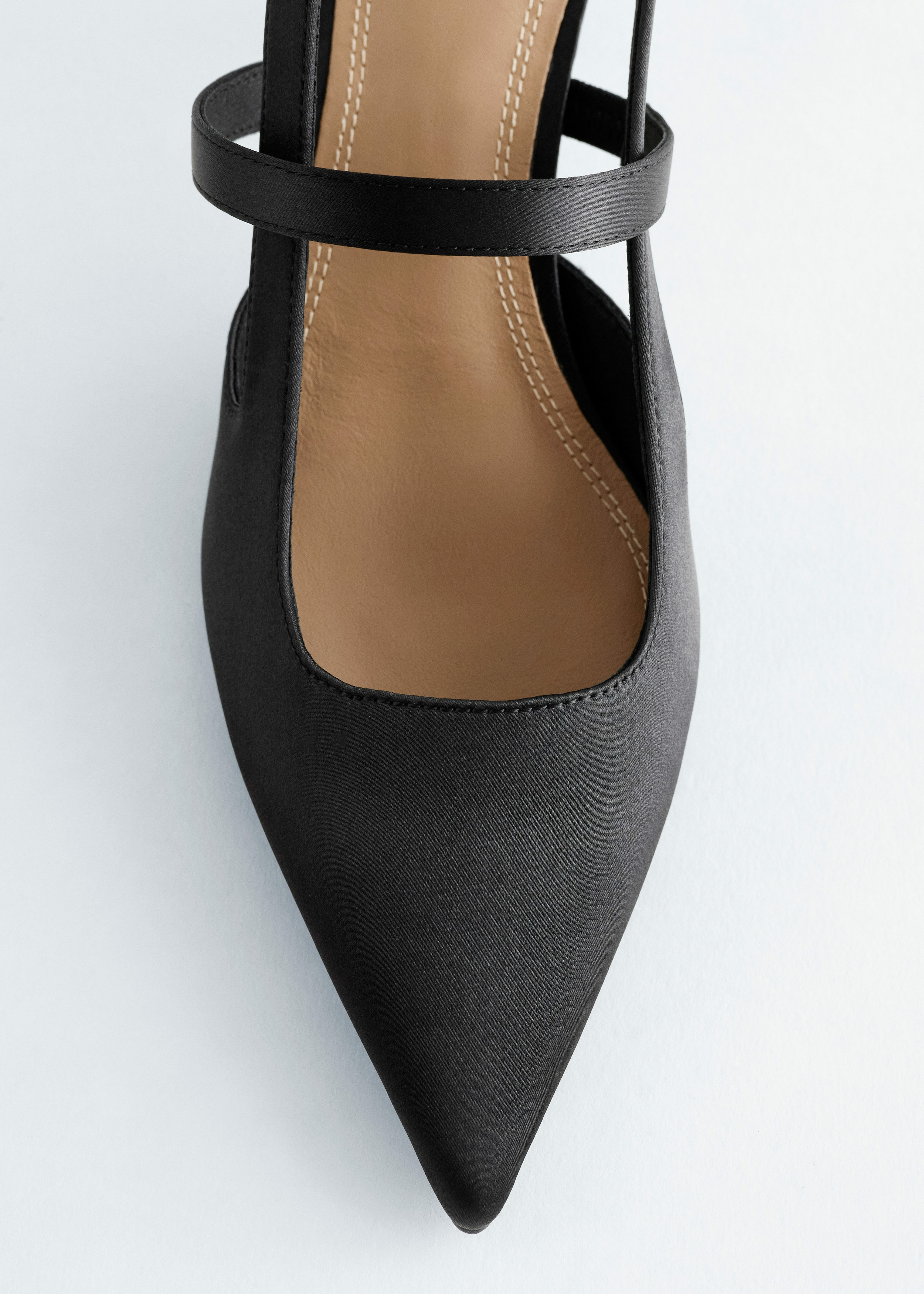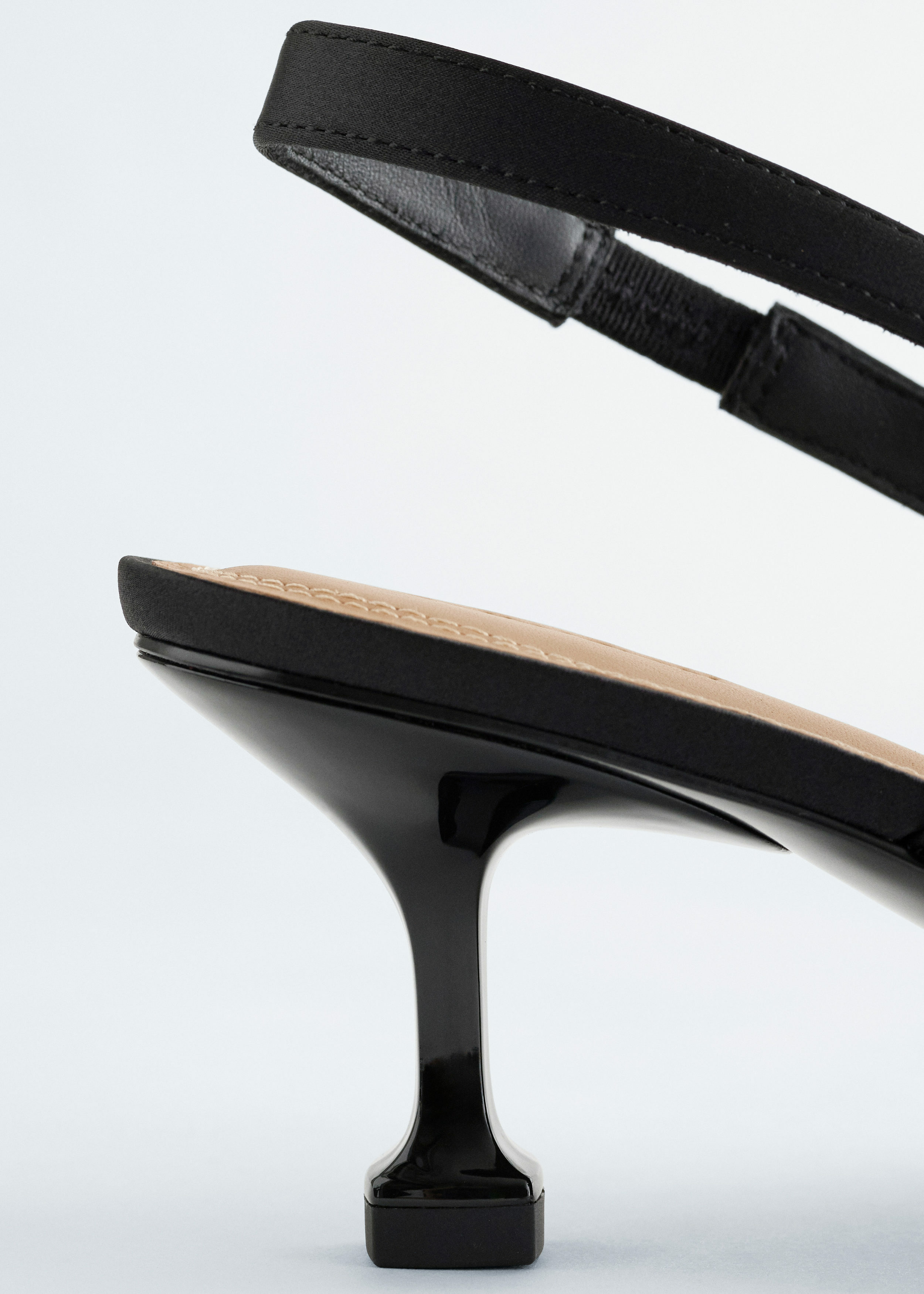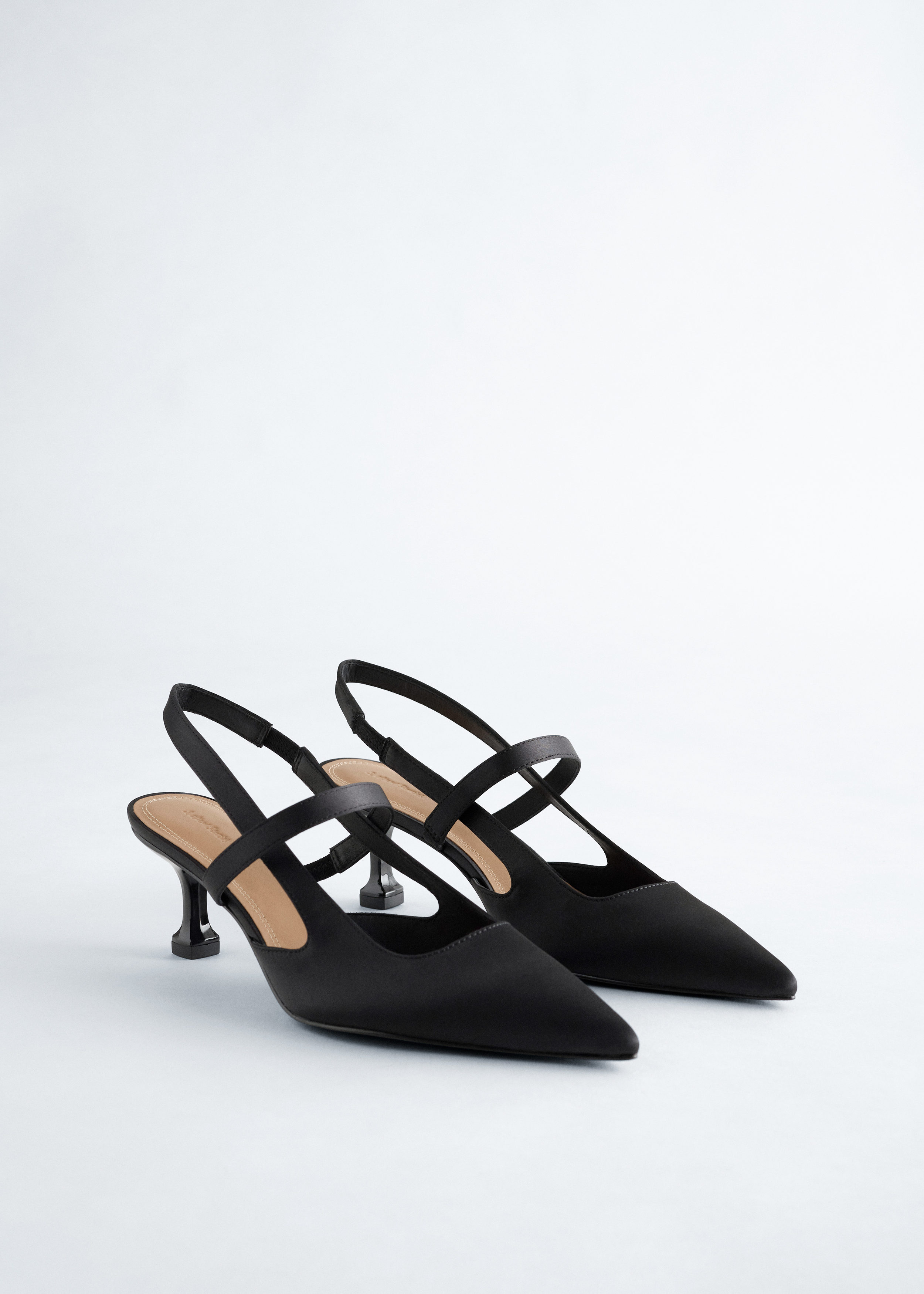 포인트 앞코, 컷 아웃 디자인, 그리고 깔끔한 엘라스틱 앵클 스트랩이 돋보이는 슬링백 펌프스예요. 구조적인 키튼 힐은 유광 마감으로 탄생했답니다.