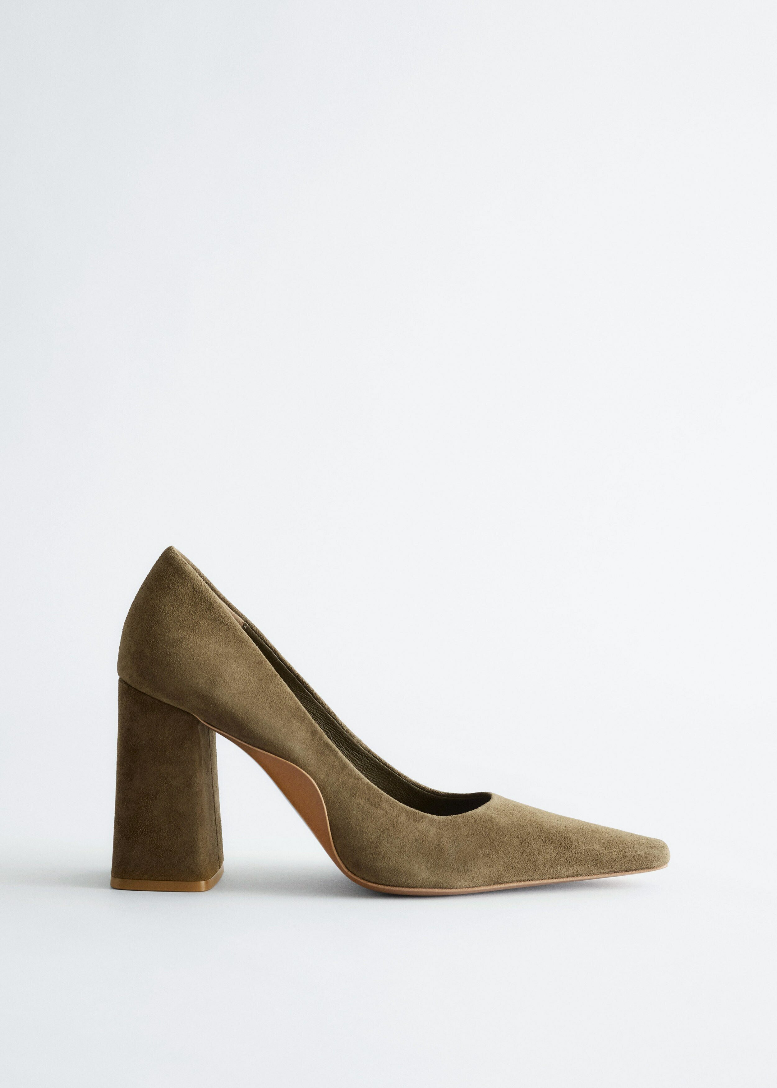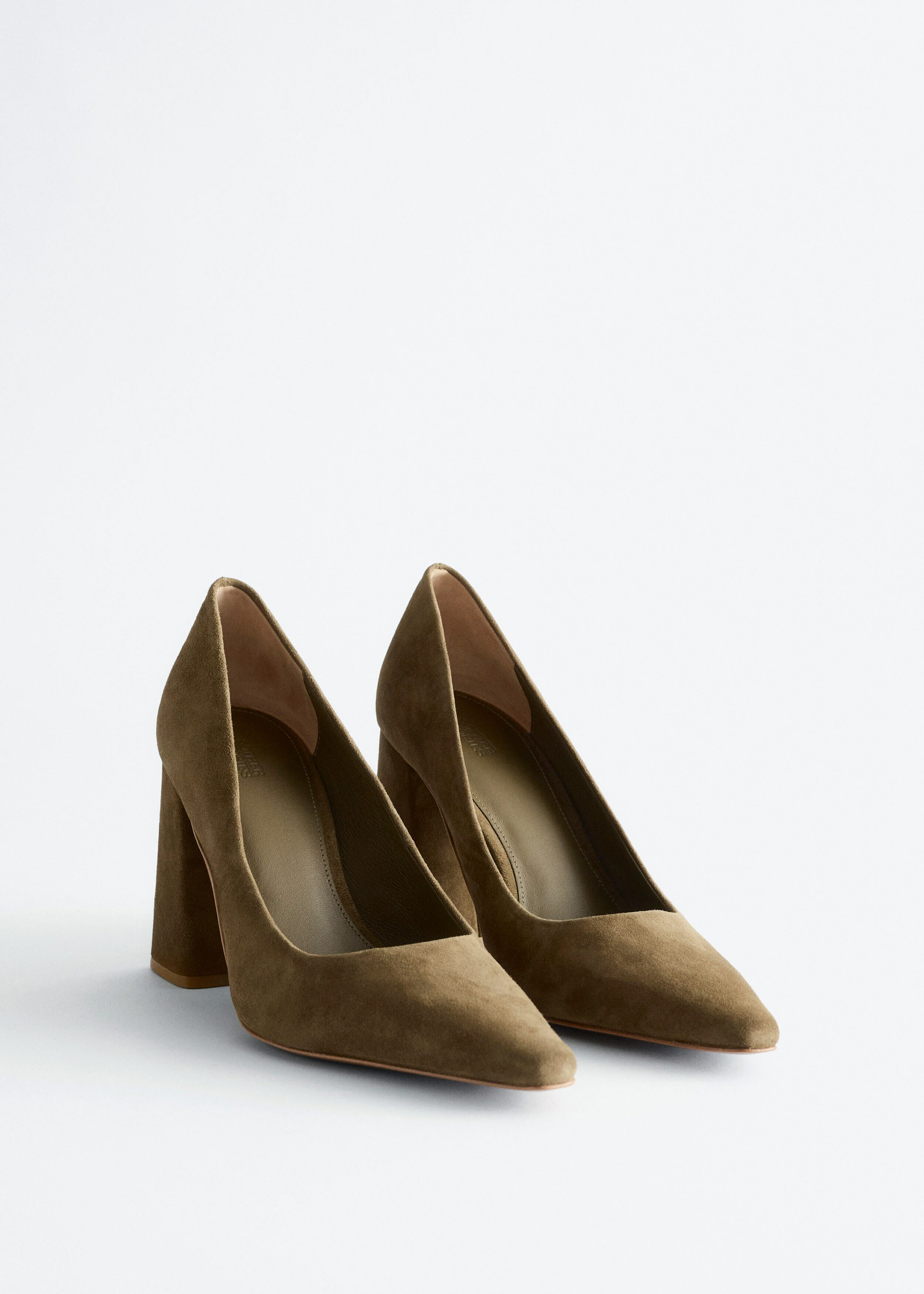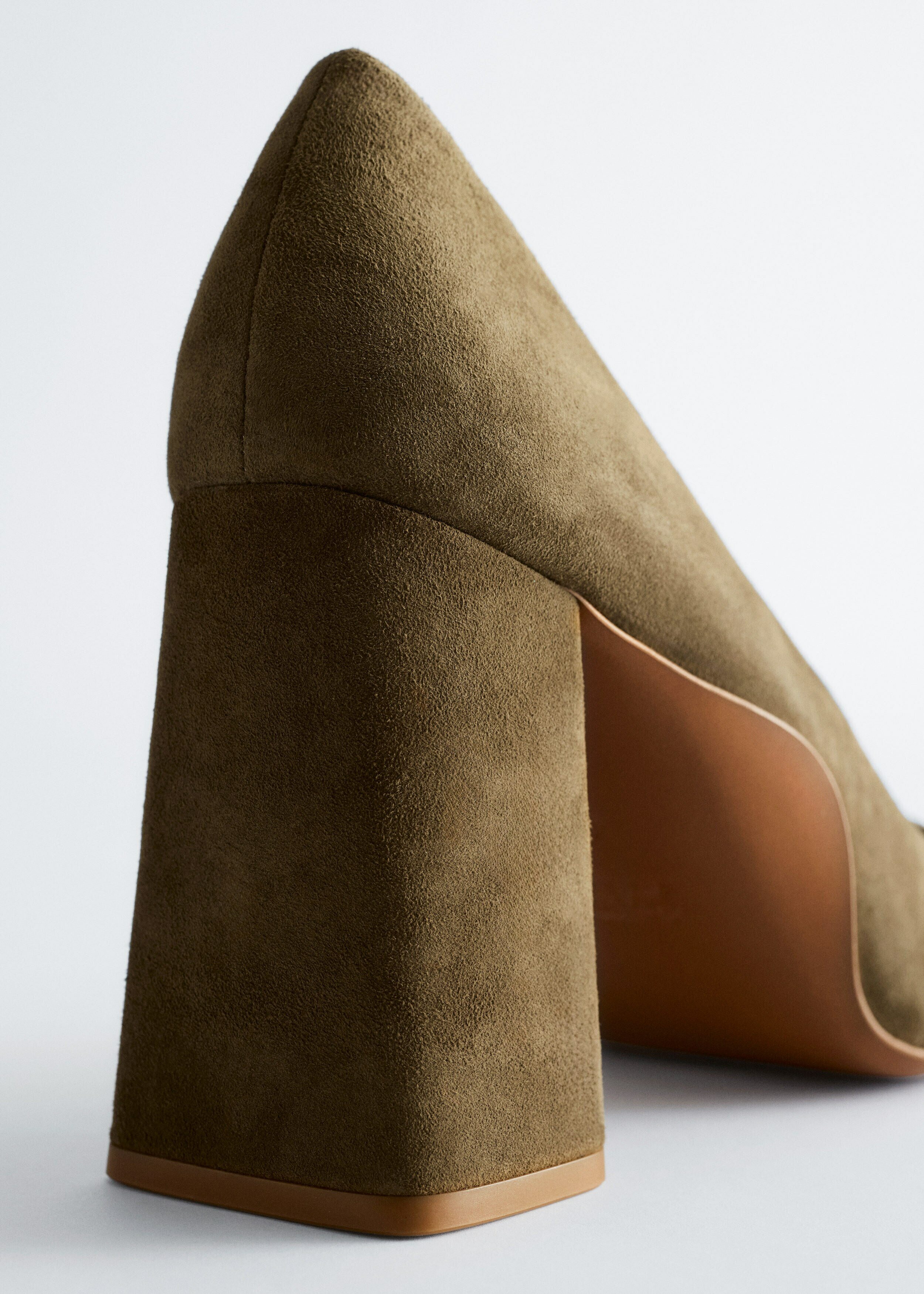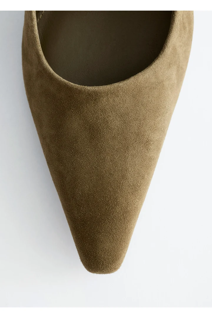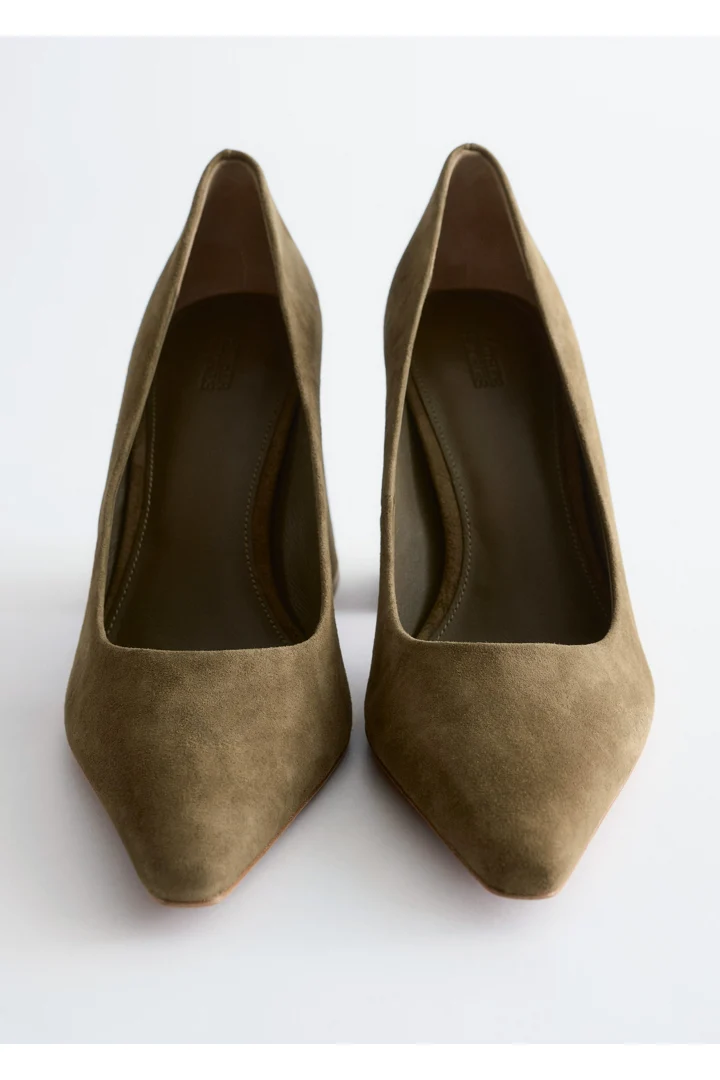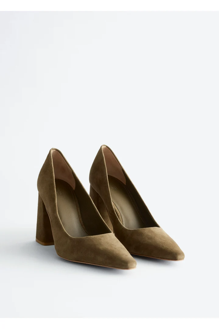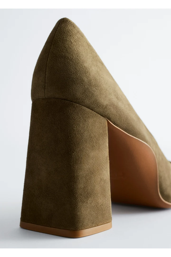 부드러운 스웨이드 소재의 펌프스예요. 포인트 앞코, 은은한 플레어 쉐입의 블록 힐, 측면에서 살짝 드러나는 곡선형 밑창이 특징이랍니다.