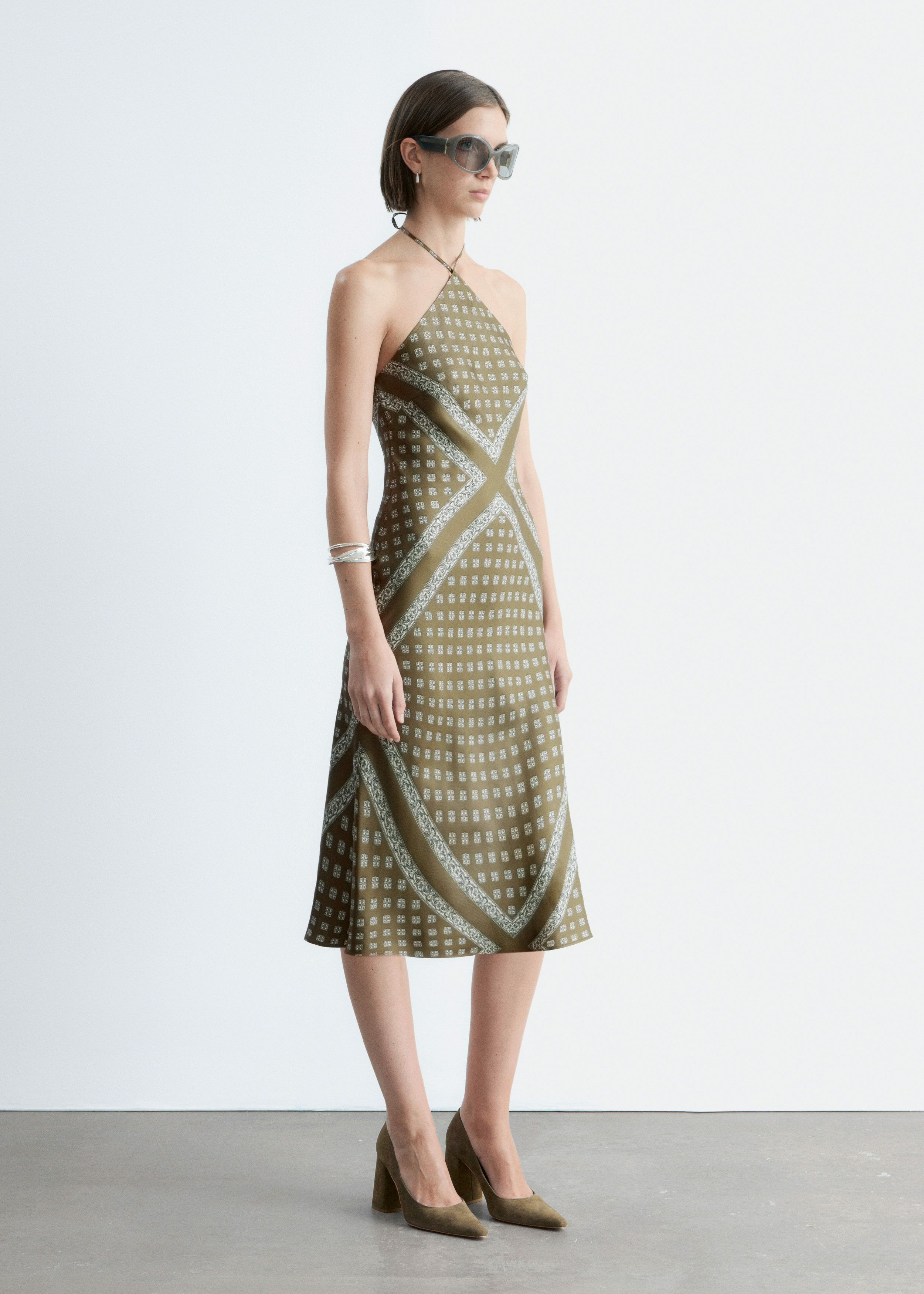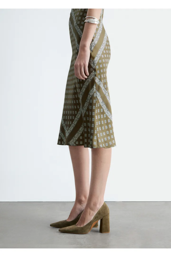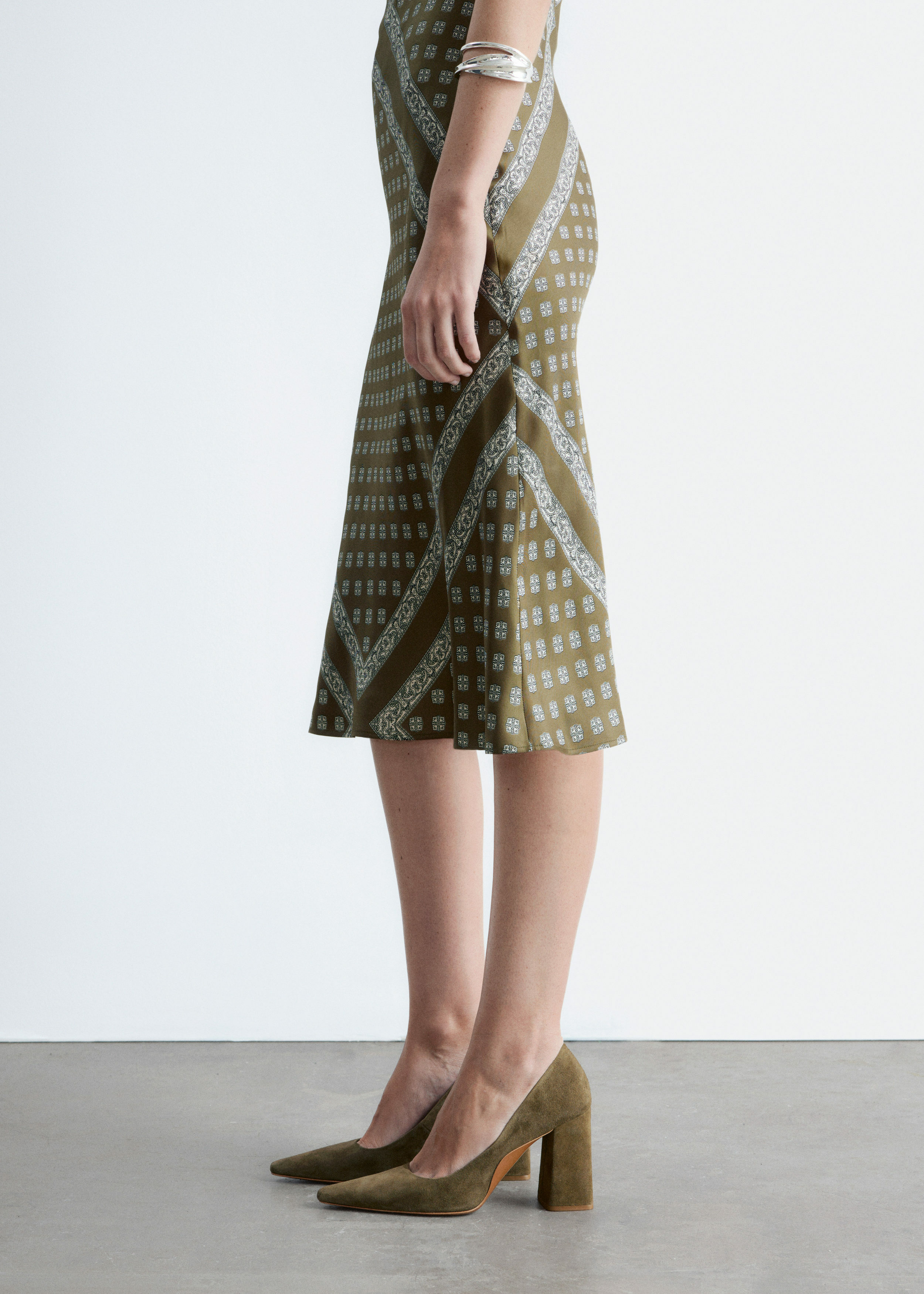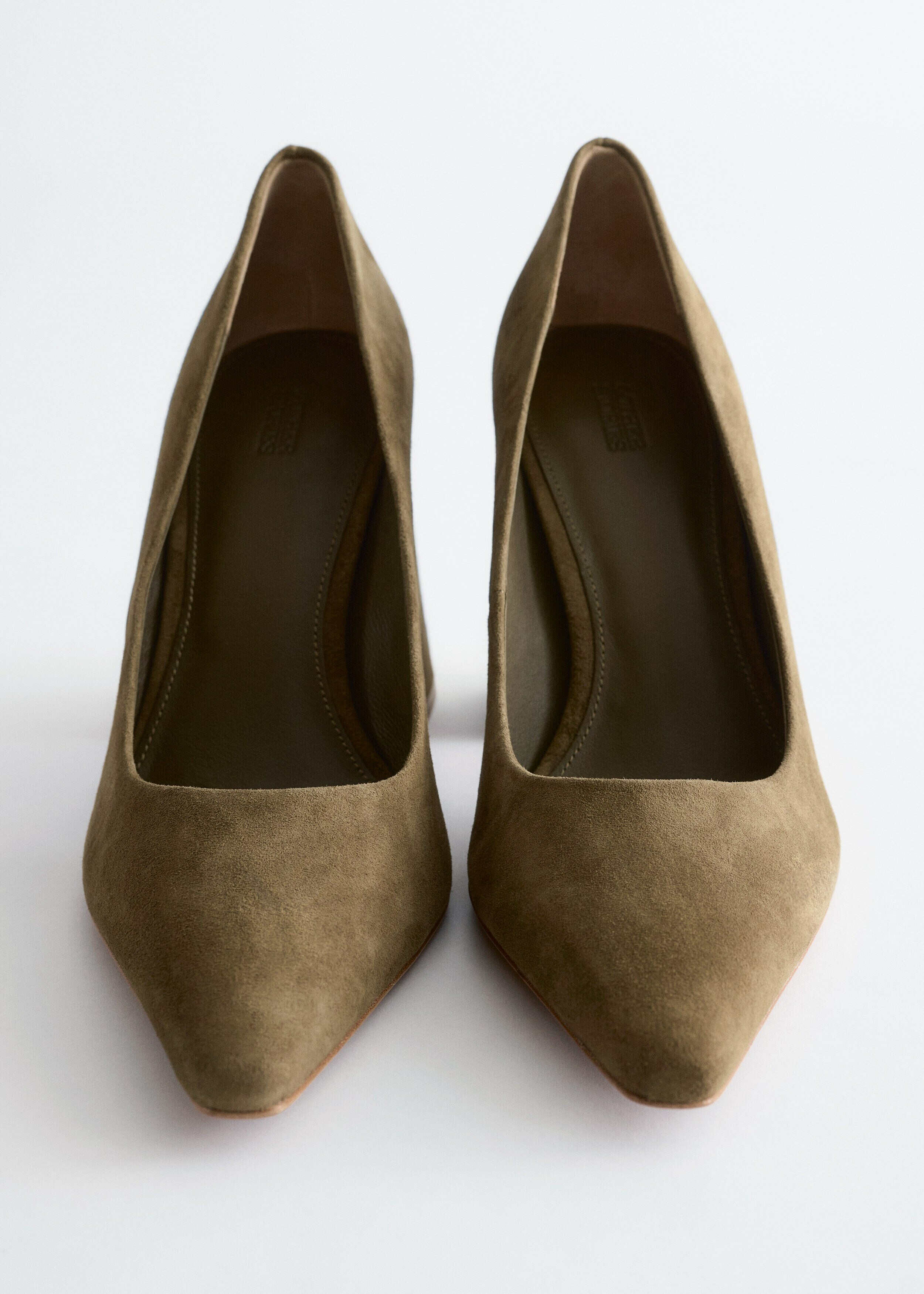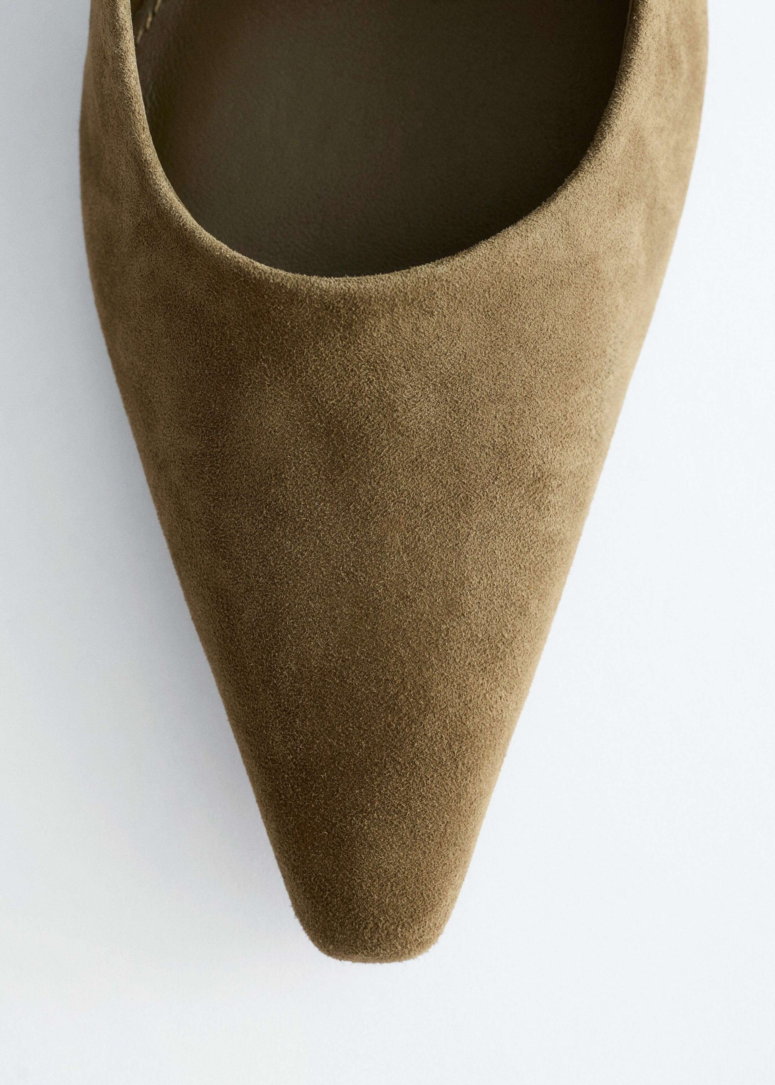부드러운 스웨이드 소재의 펌프스예요. 포인트 앞코, 은은한 플레어 쉐입의 블록 힐, 측면에서 살짝 드러나는 곡선형 밑창이 특징이랍니다.