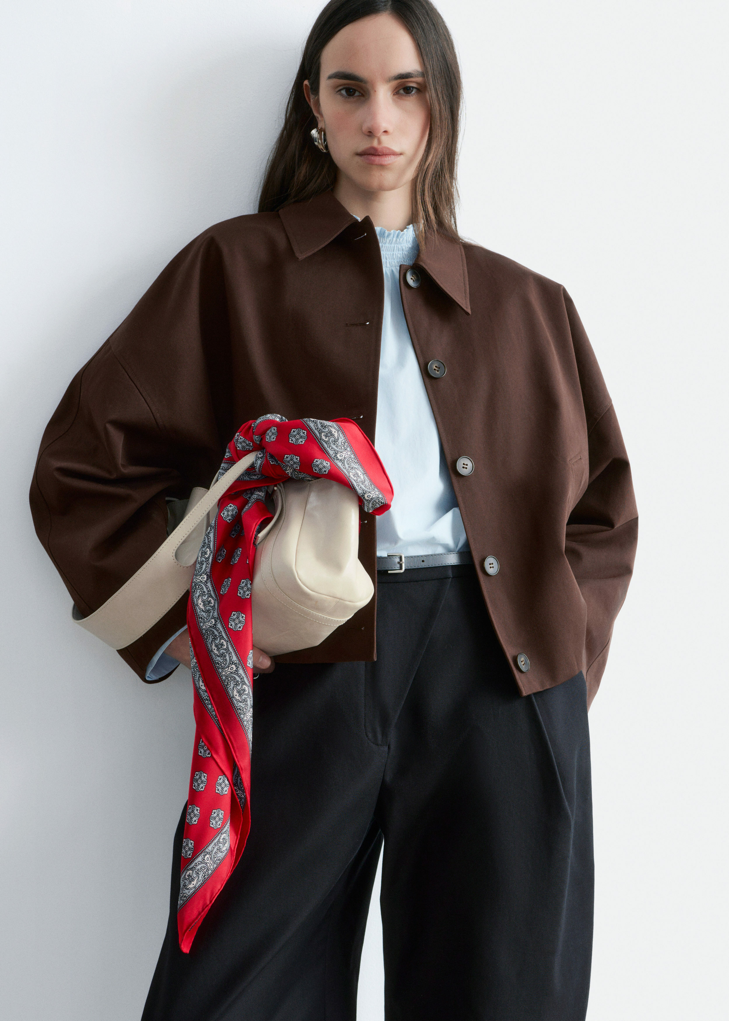 바스락거리는 코튼 트윌 소재의 자켓이에요. 박시한 실루엣, 레글란 슬리브, 클래식 카라, 사선의 웰트 포켓이 특징이랍니다. 뒷면의 엘라스틱 헴라인이 은은한 셔링을 연출하며, 앞면에는 단추가 자리해 있어요.
