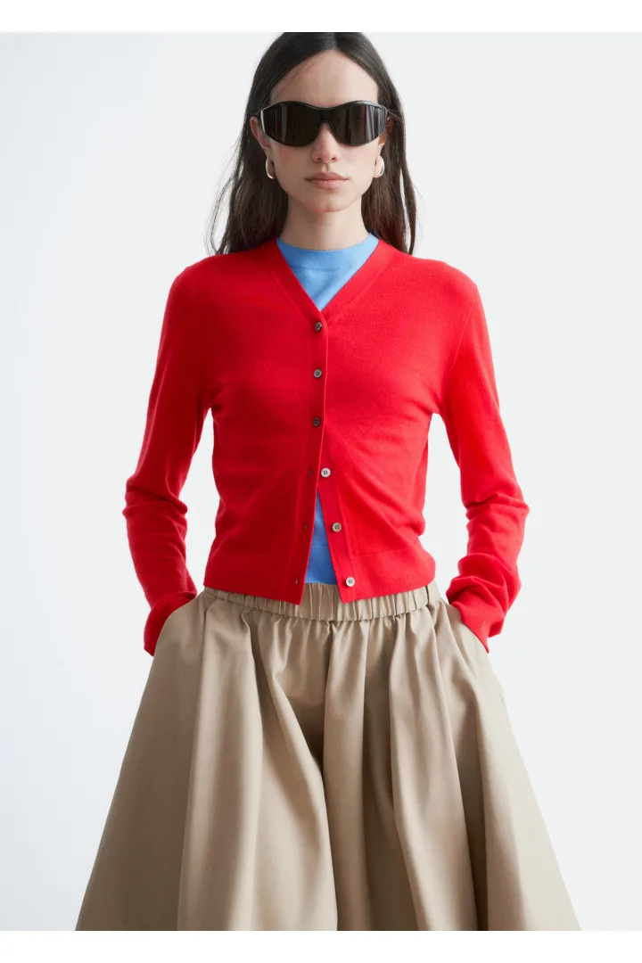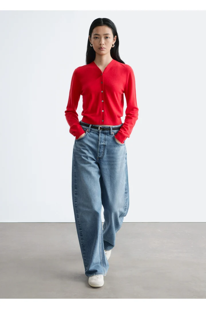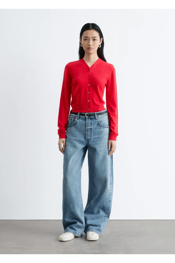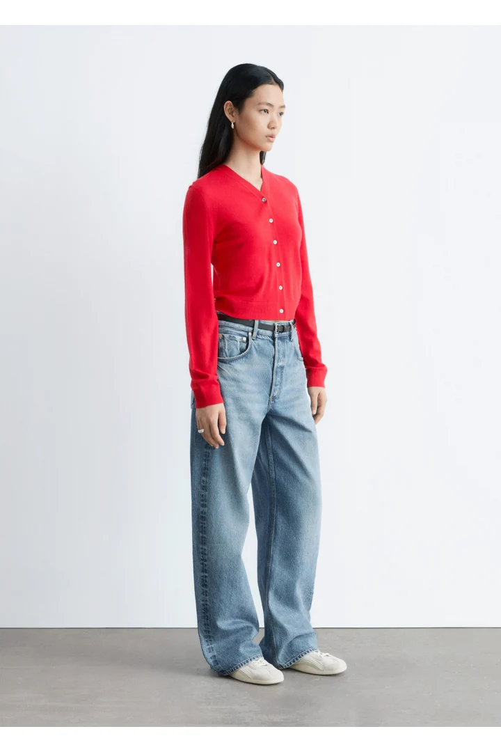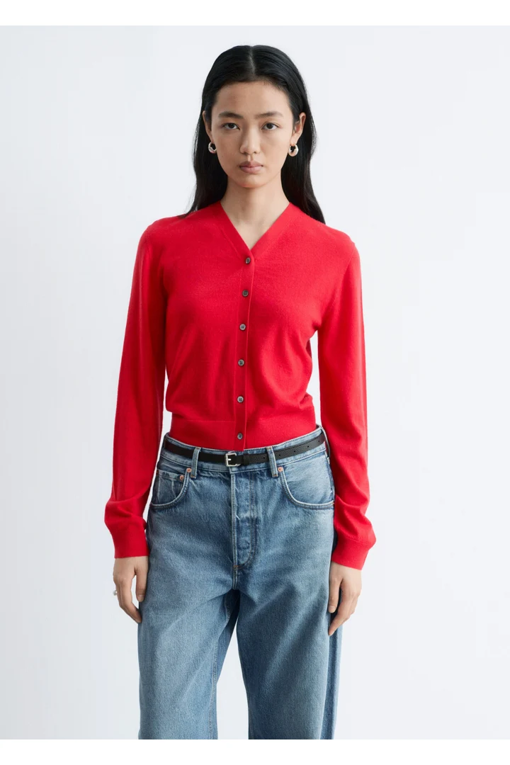 100% 캐시미어 소재로 섬세하게 니팅된 가디건이에요. 힙까지 오는 스트레이트 실루엣, 립 트리밍, 그리고 앞면의 단추가 특징이에요.