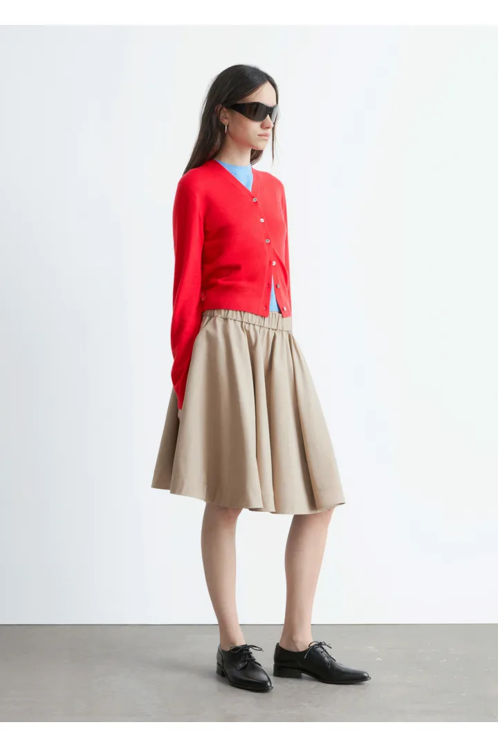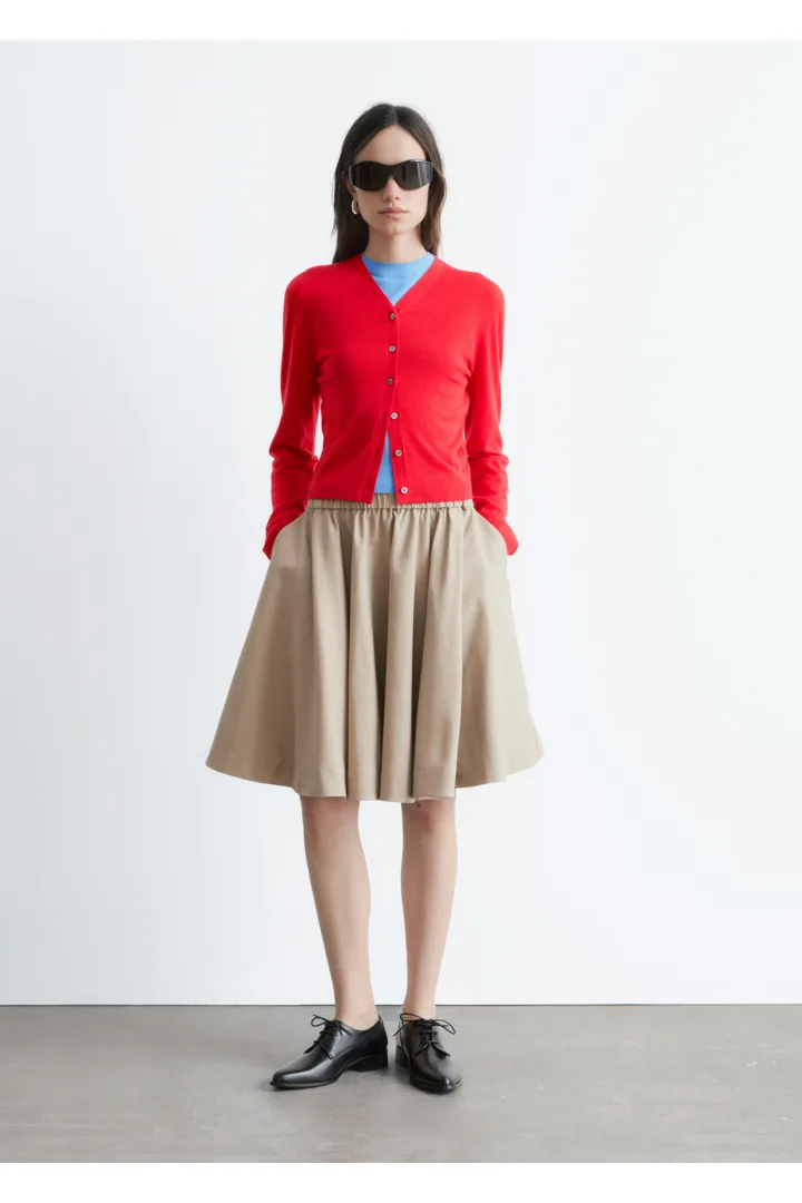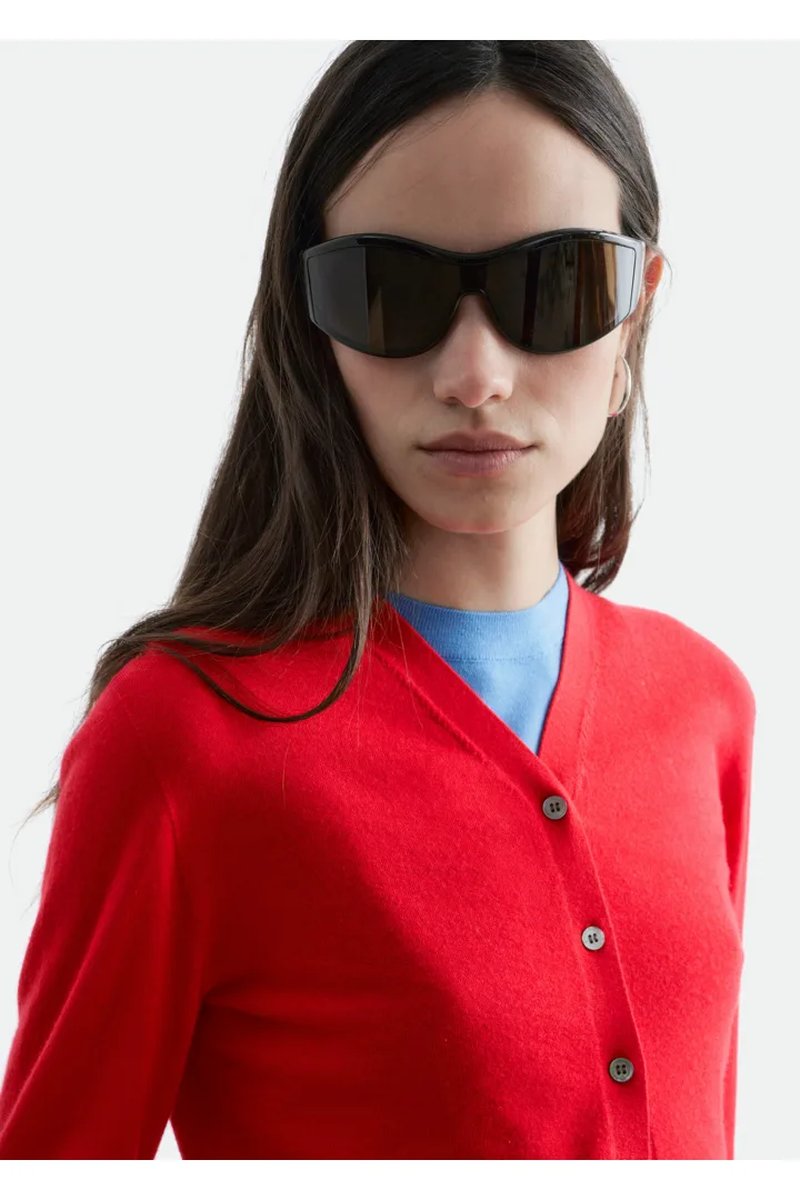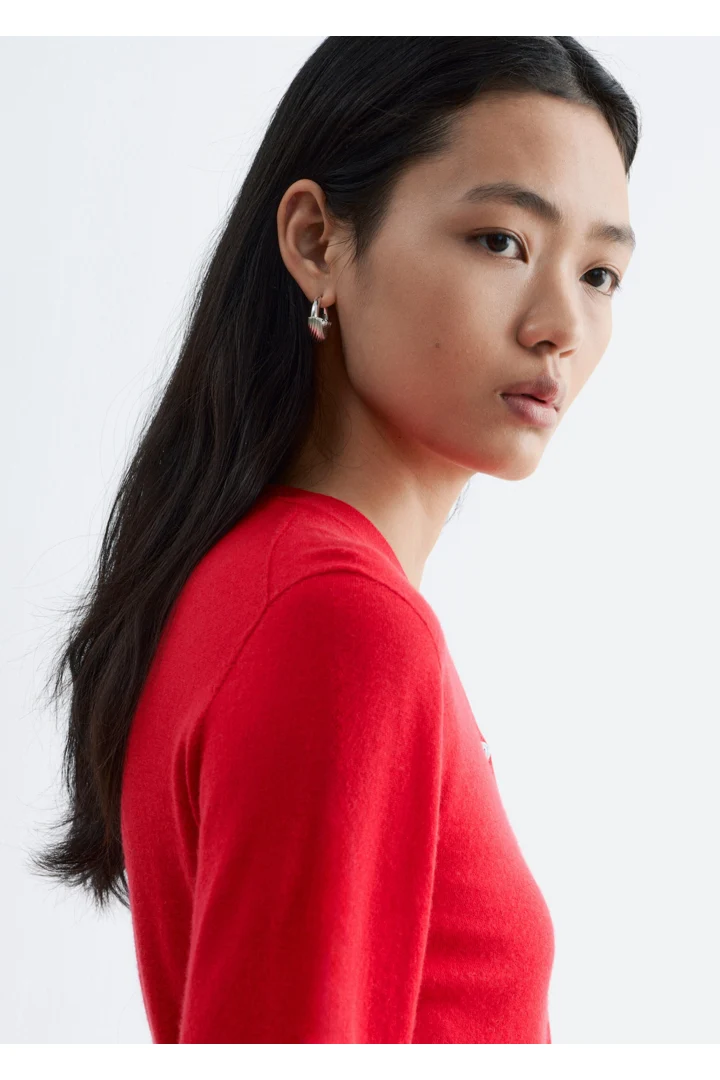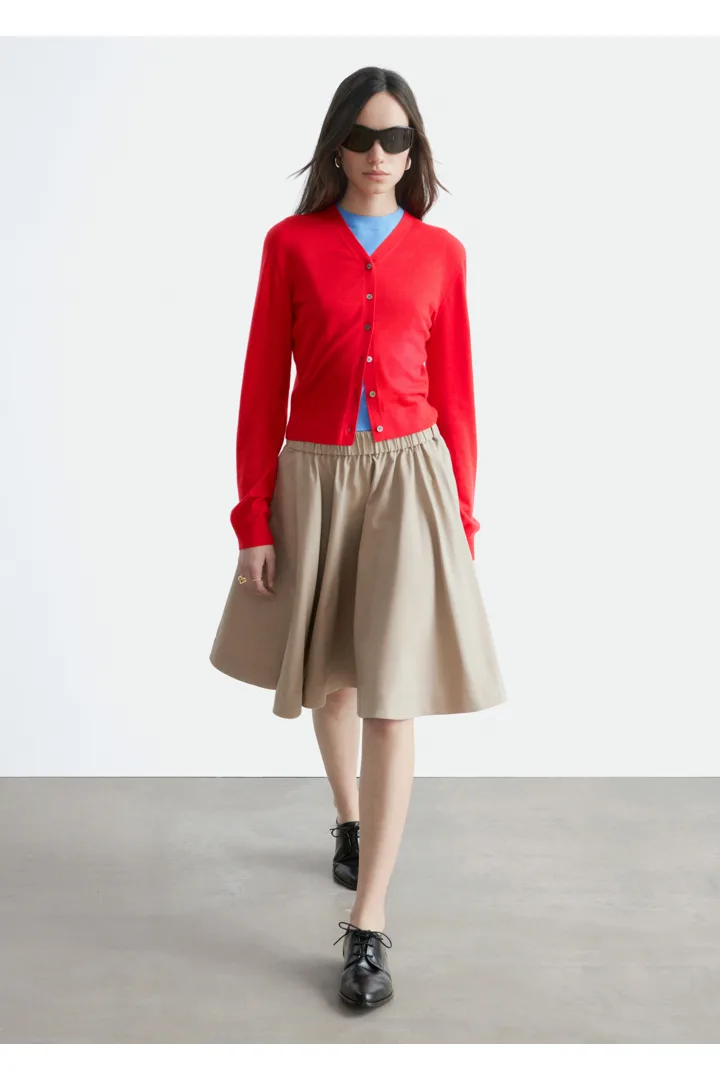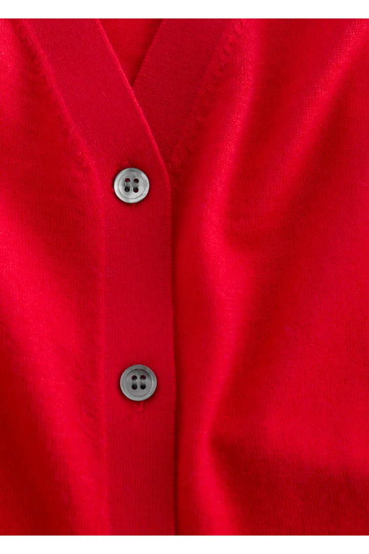 100% 캐시미어 소재로 섬세하게 니팅된 가디건이에요. 힙까지 오는 스트레이트 실루엣, 립 트리밍, 그리고 앞면의 단추가 특징이에요.