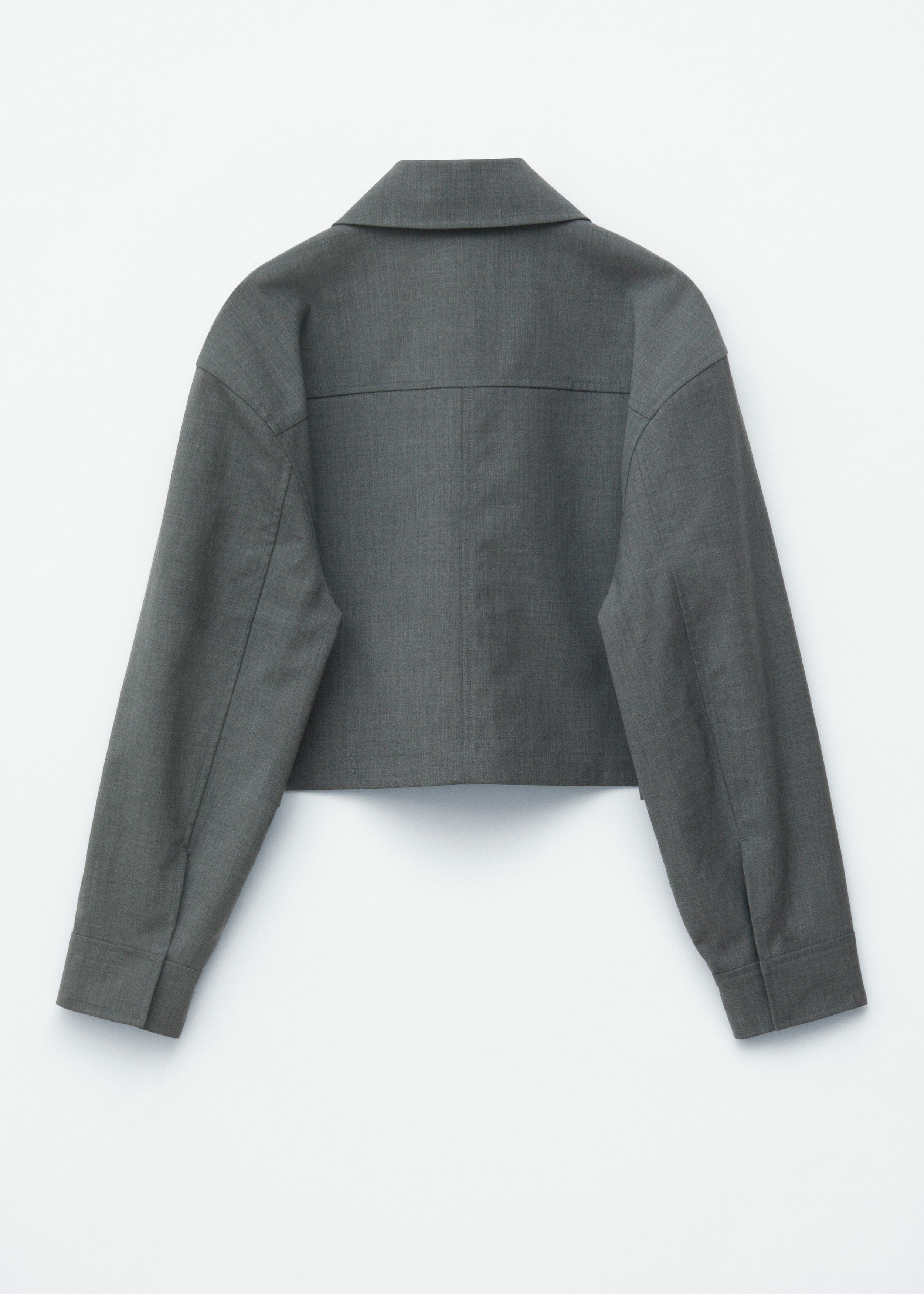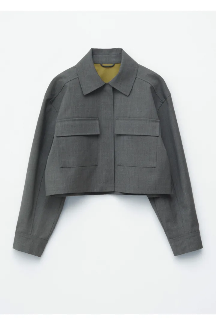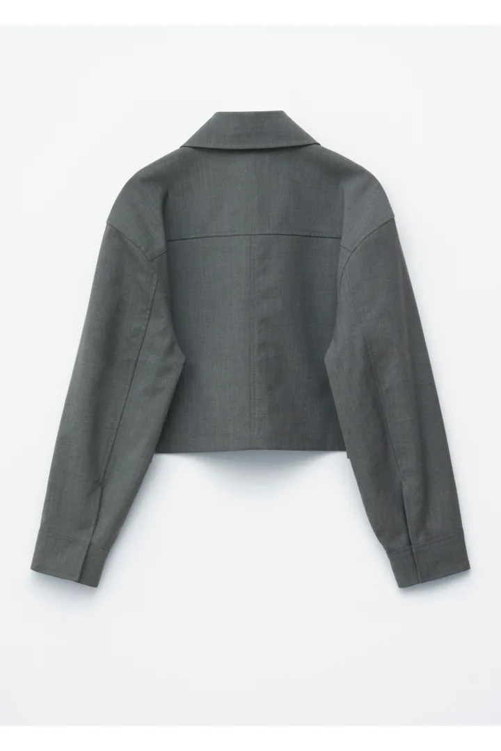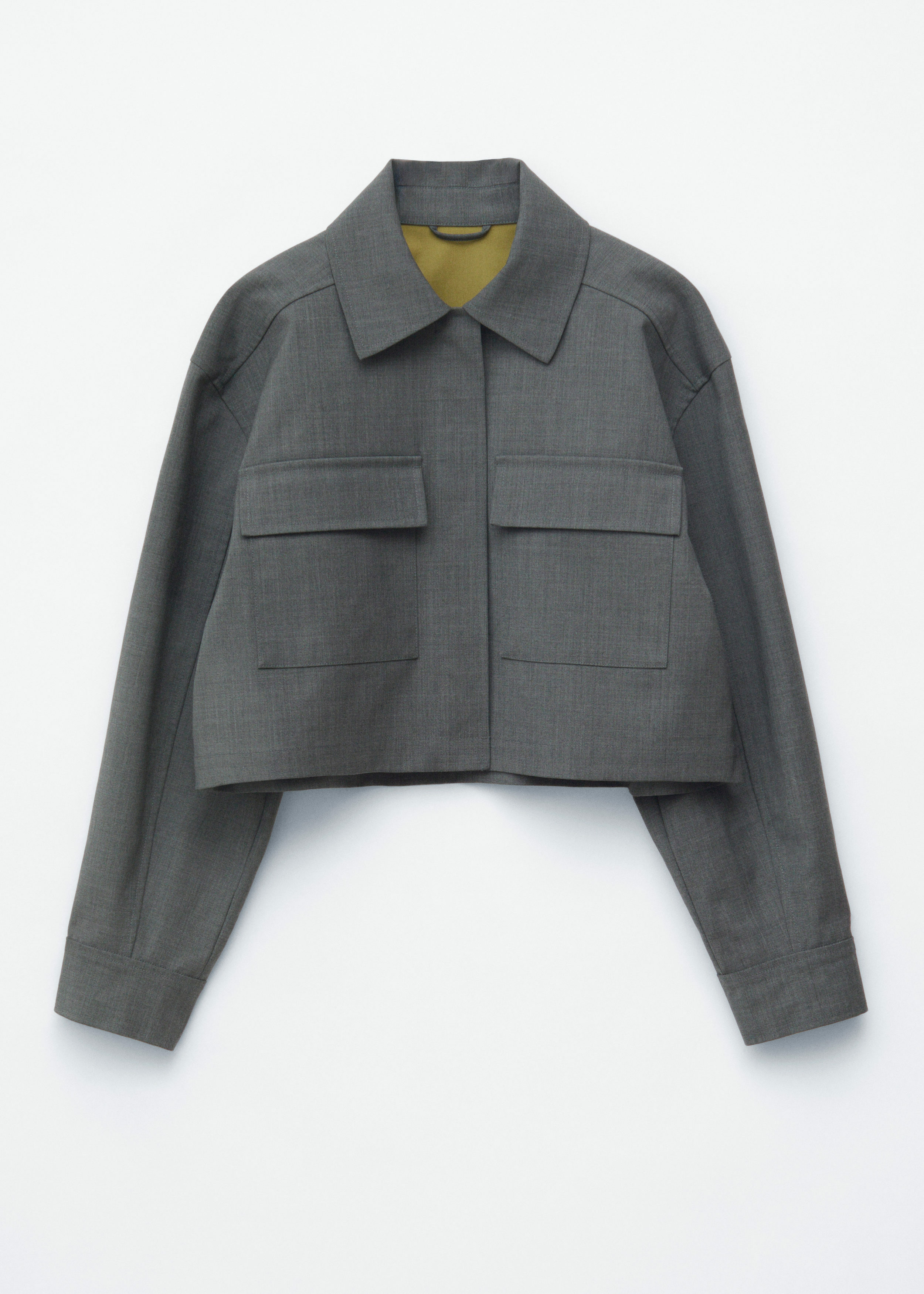 울-코튼 혼방 소재로 탄생한 자켓이에요. 크롭 & 박시 실루엣이 멋스러우며 클래식 카라, 컨실드 버튼 플래킷, 2개의 플랩 포켓, 탑스티치 솔기가 자리해 있어요. 대비적인 톤의 안감이 전체 룩을 완성한답니다.