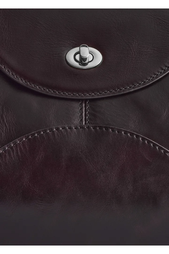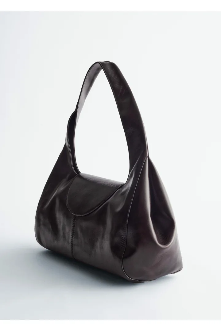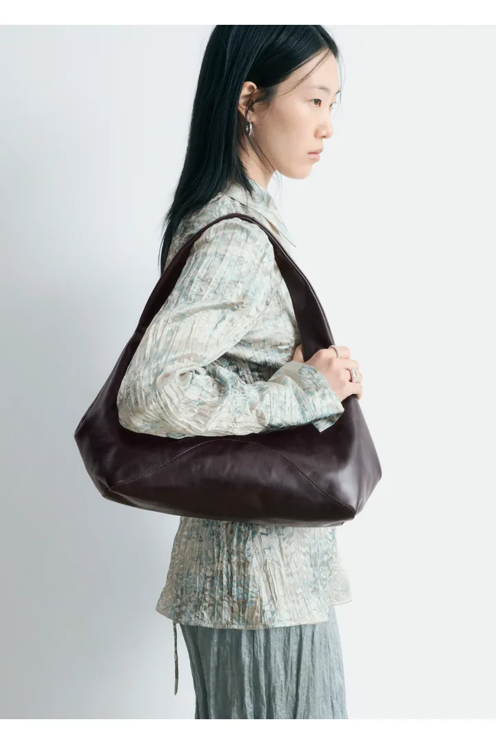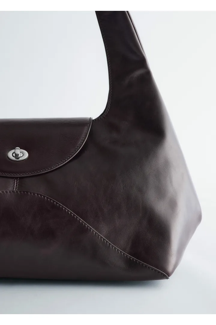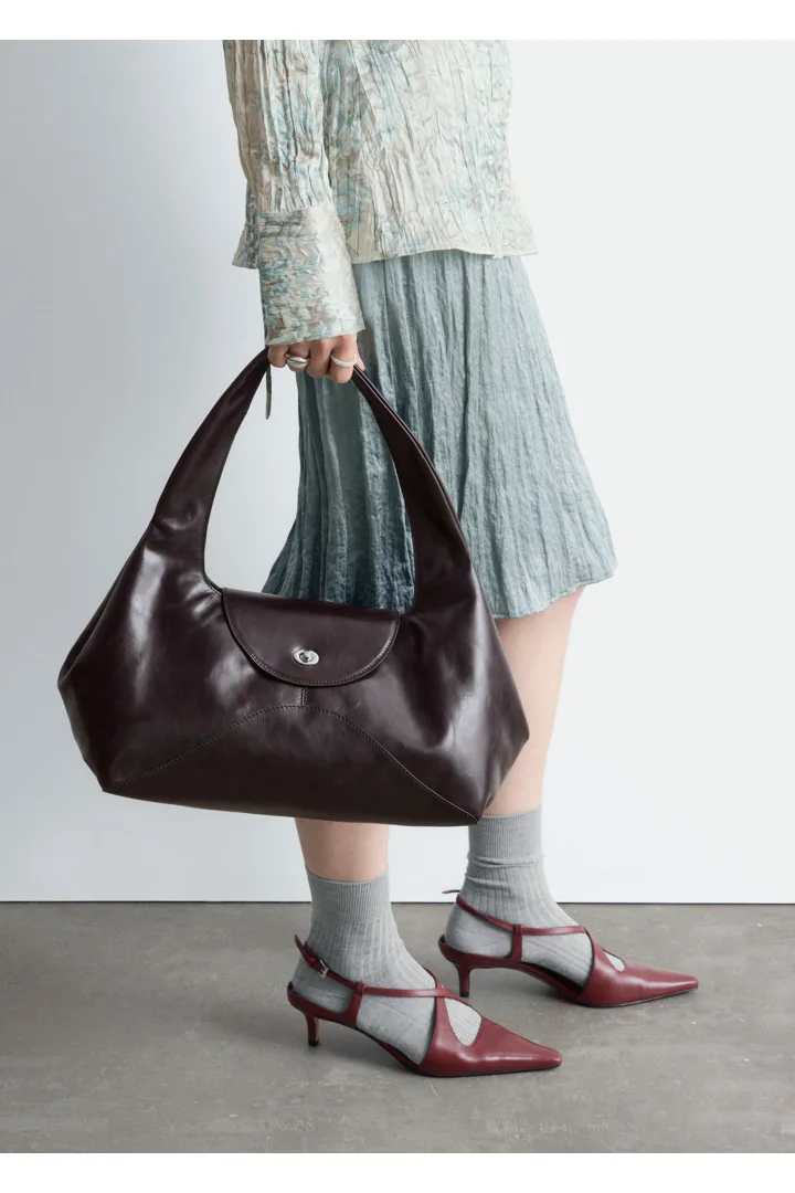 구조감 있는 곡선형 실루엣이 멋스러운 숄더 백이에요. 너비감 있는 사선 숄더 스트랩, 커트 라인 장식 솔기, 그리고 앞면의 플랩과 트위스트 잠금 클로저가 자리해 있어요.