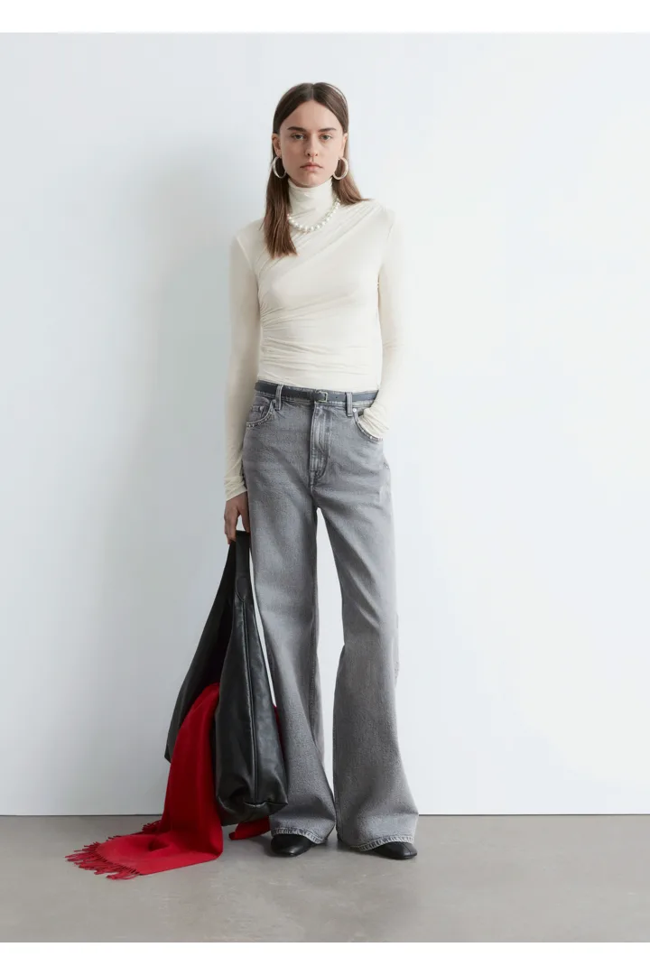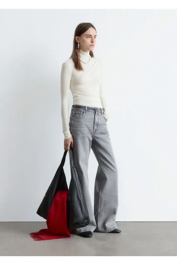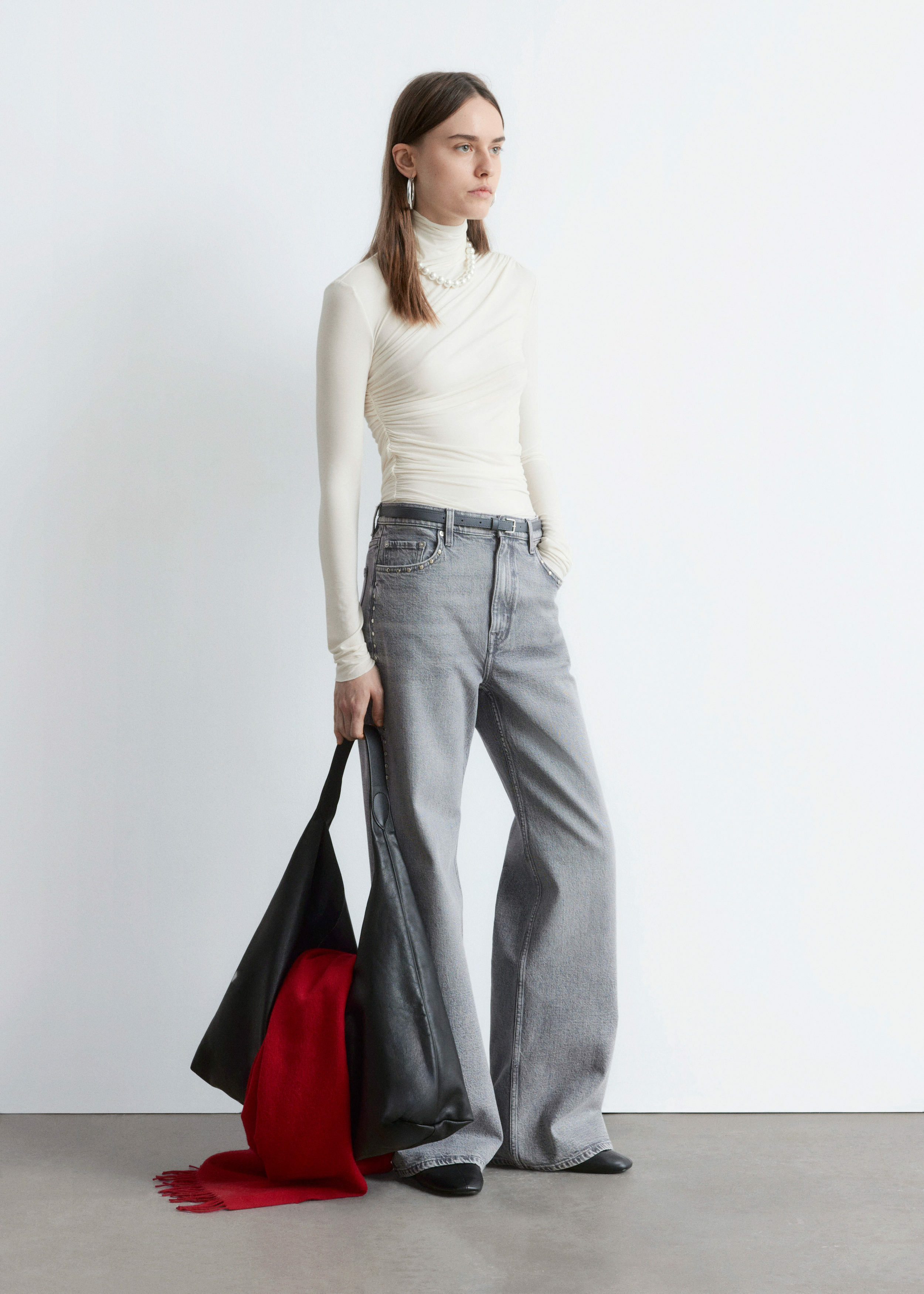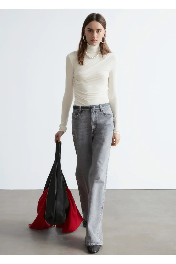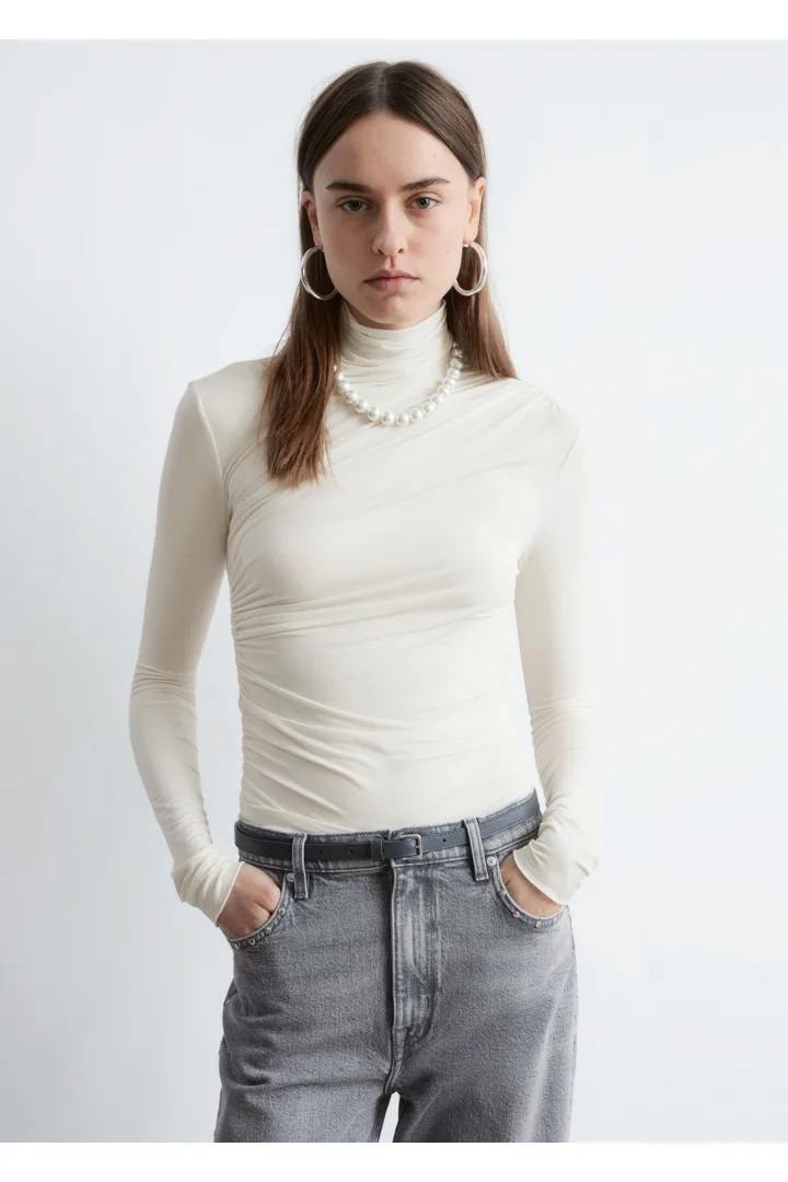 셔링 솔기가 더해져 전체적으로 드레이프가 흐르는 룩의 탑이에요. 유려한 모달 소재로 탄생하여 드레이핑이 더욱 돋보인답니다. 터틀넥, 엑스트라 롱 슬리브, 커프스와 비대칭 헴라인의 오버록 마감이 특징이에요.