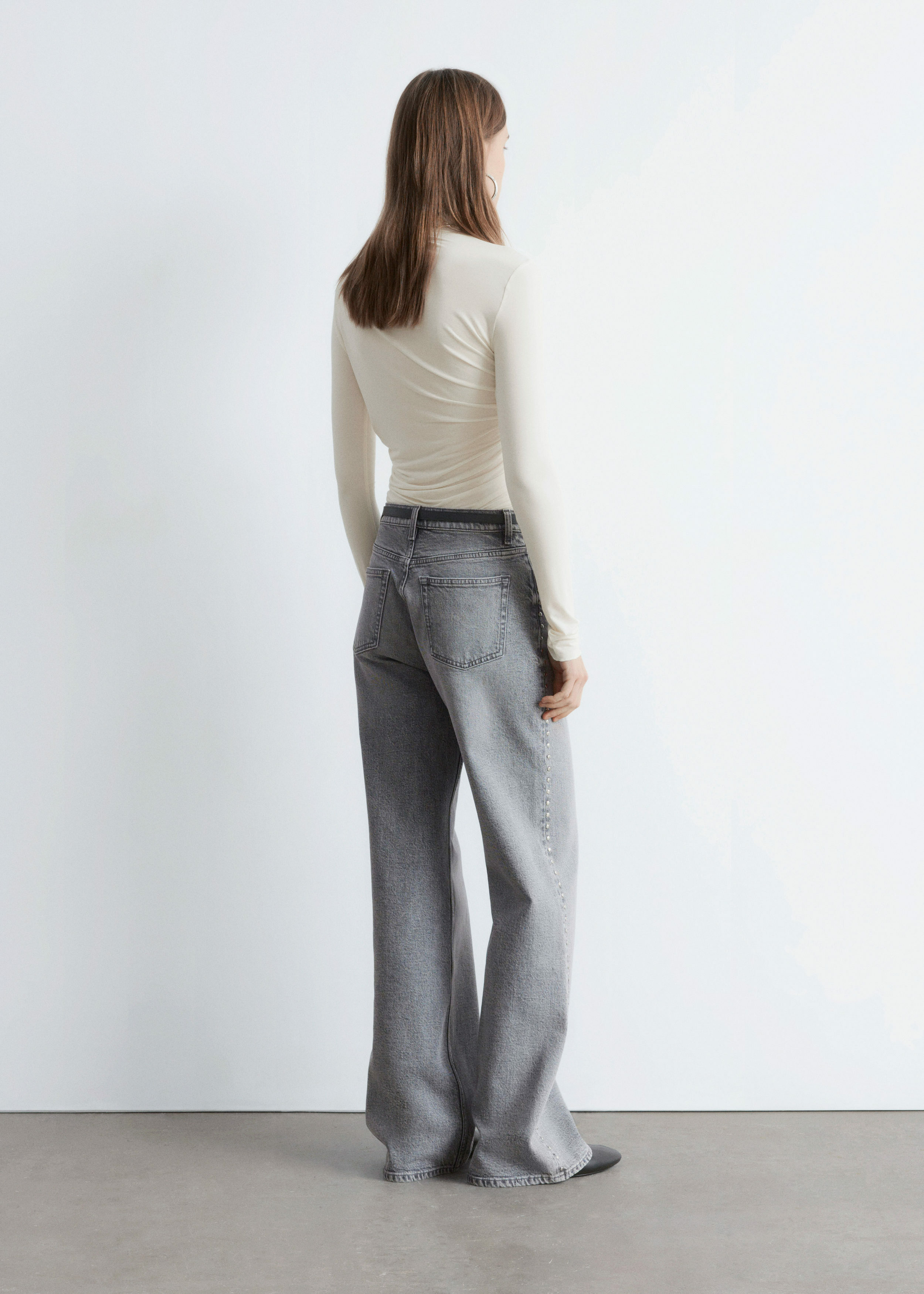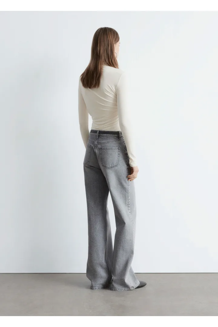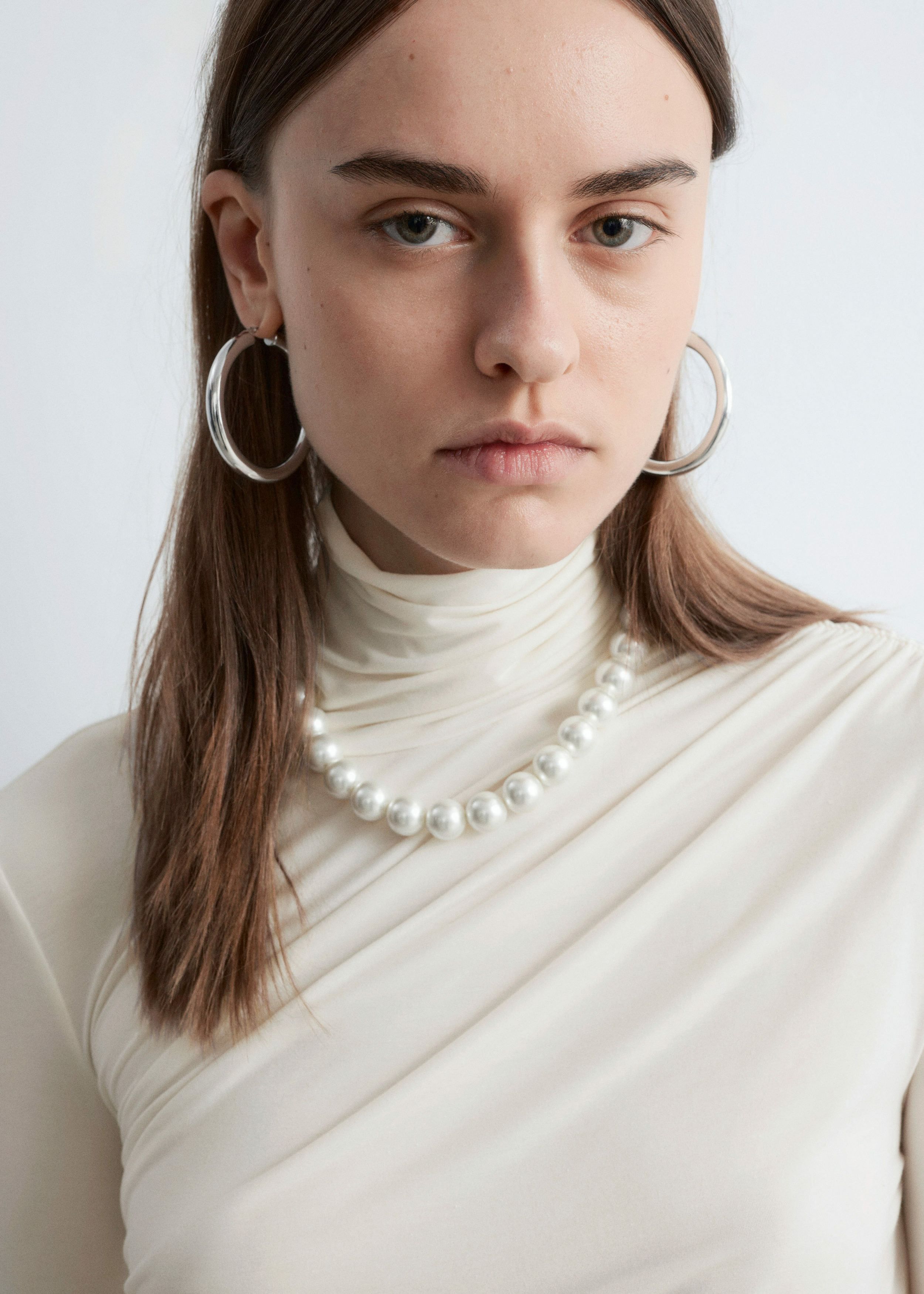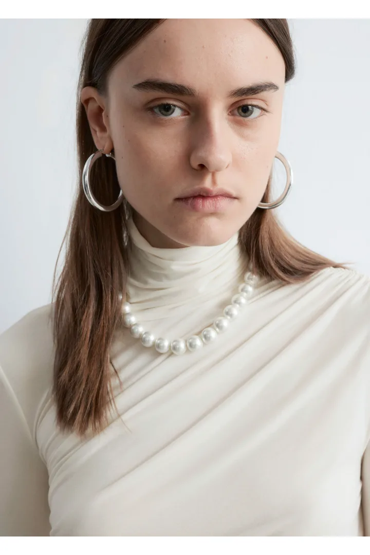 셔링 솔기가 더해져 전체적으로 드레이프가 흐르는 룩의 탑이에요. 유려한 모달 소재로 탄생하여 드레이핑이 더욱 돋보인답니다. 터틀넥, 엑스트라 롱 슬리브, 커프스와 비대칭 헴라인의 오버록 마감이 특징이에요.