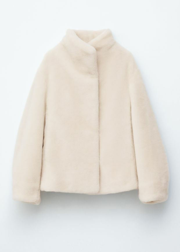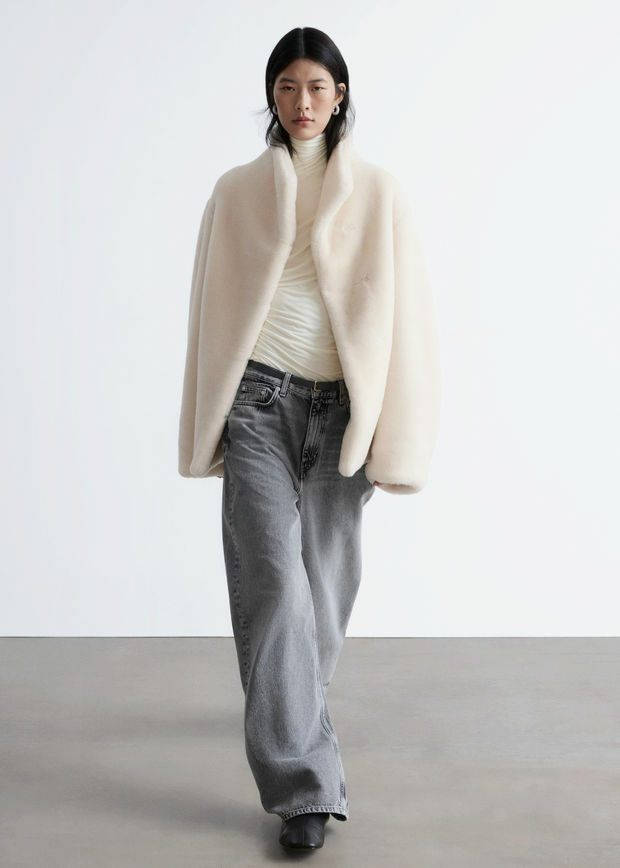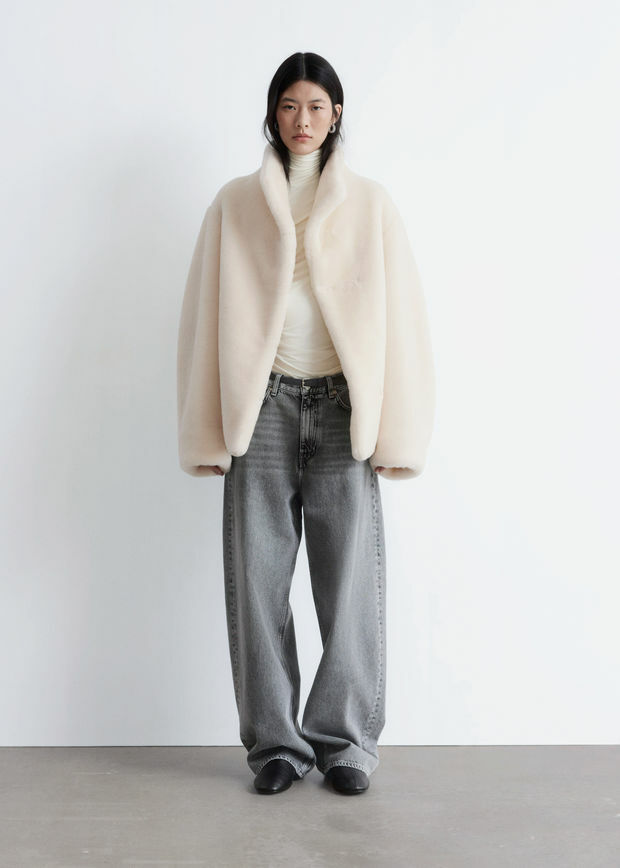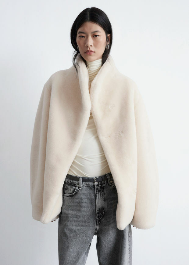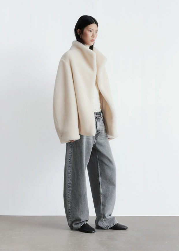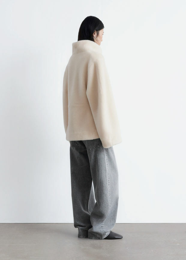 부드러운 울 혼방 인조 모피로 제작된 이 자은 높은 칼라와 오프셋 오프닝 디자인에 숨겨진 후크 앤 아이 패스너 디테일이 특징입니다. 절제된 사이드 솔기 포켓이 완성도를 더합니다.