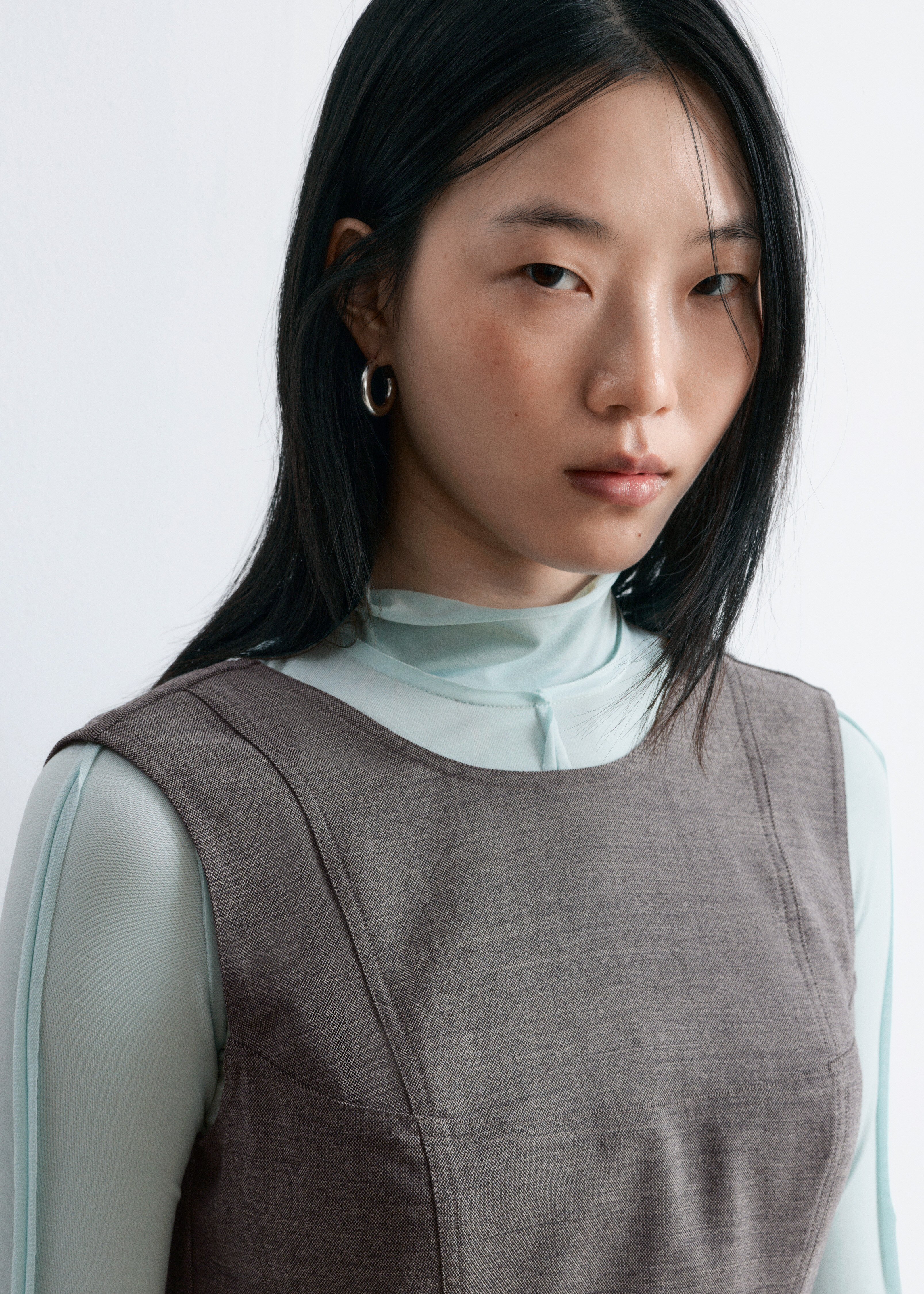 울 혼방 소재의 미니 드레스예요. 핏 되는 보디스, 탑스티치 솔기, 그리고 부드럽게 주름이 잡힌 플레어 퍼프 스커트가 시선을 사로잡아요. 뒷면에는 스퀘어 컷 디테일과 깔끔한 지퍼가 자리해 있답니다.