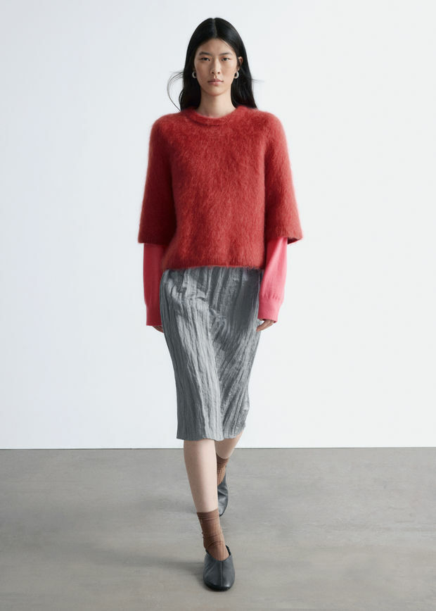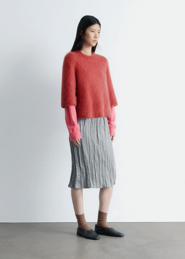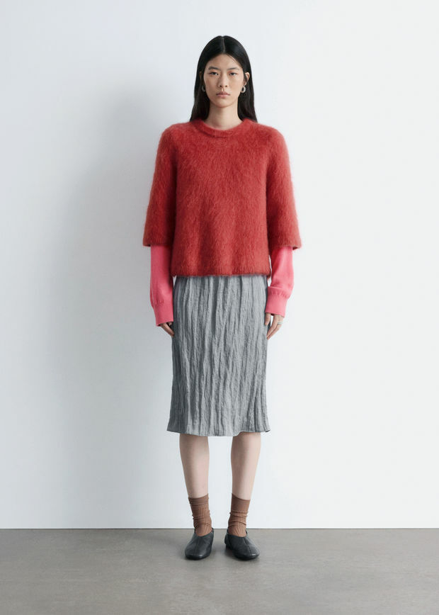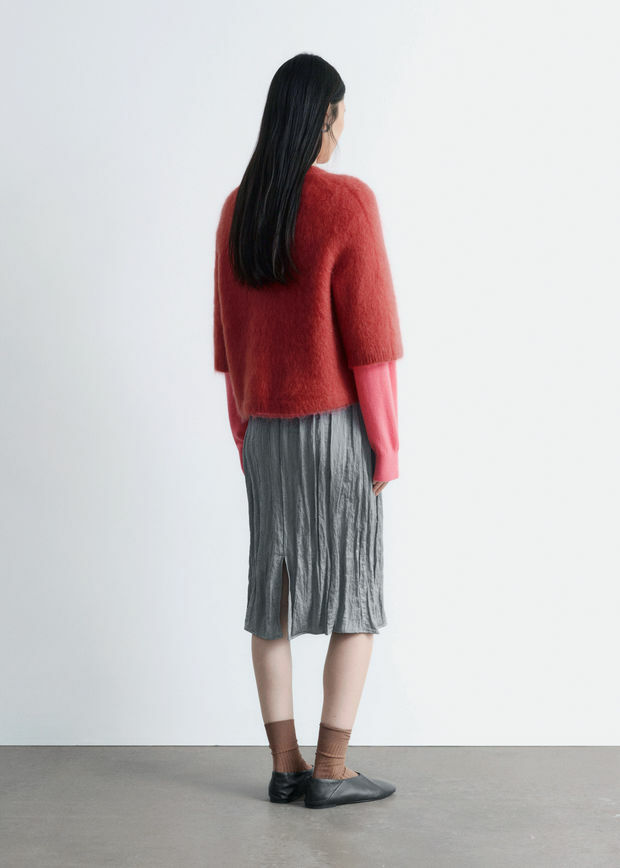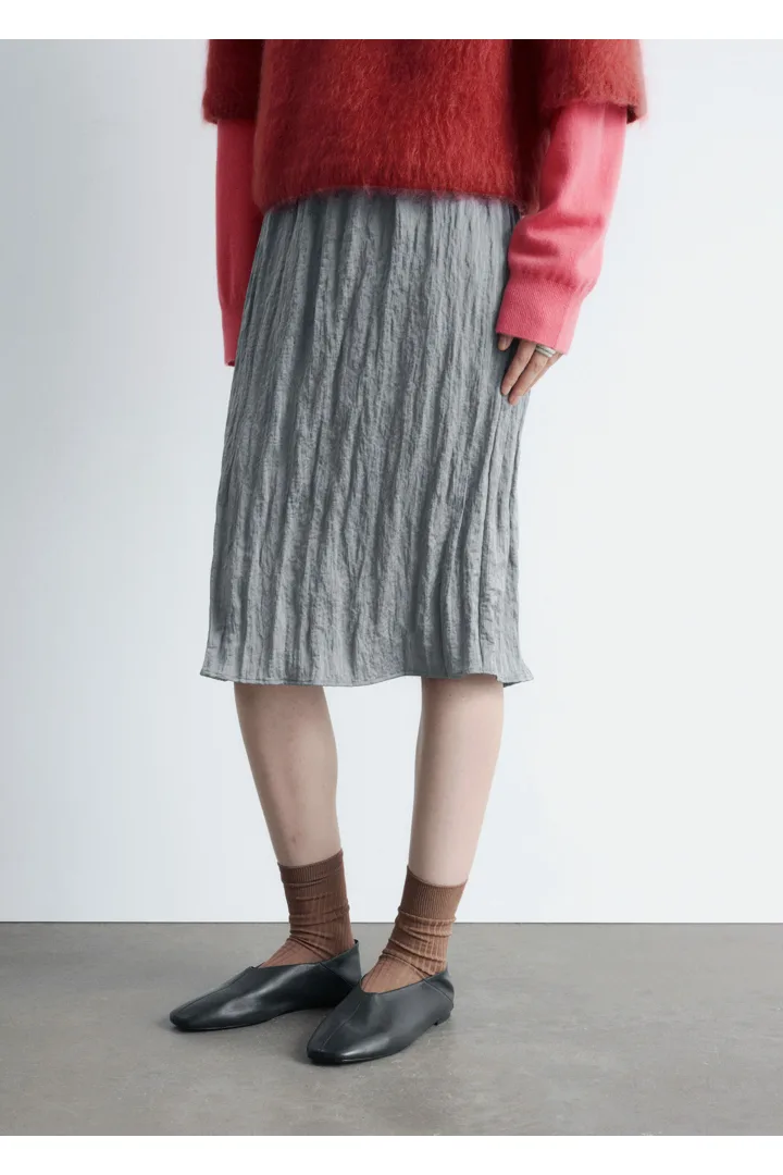 고급스러운 크레이프 직조 소재의 니 렝스 스커트예요. 허리밴드의 개더링 주름이 은은한 플리츠 룩을 연출한답니다. 엘라스틱 디테일이 자리한 로우 웨이스트와 뒷면부 슬릿이 특징이에요.
