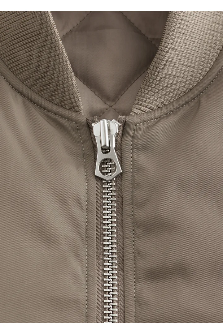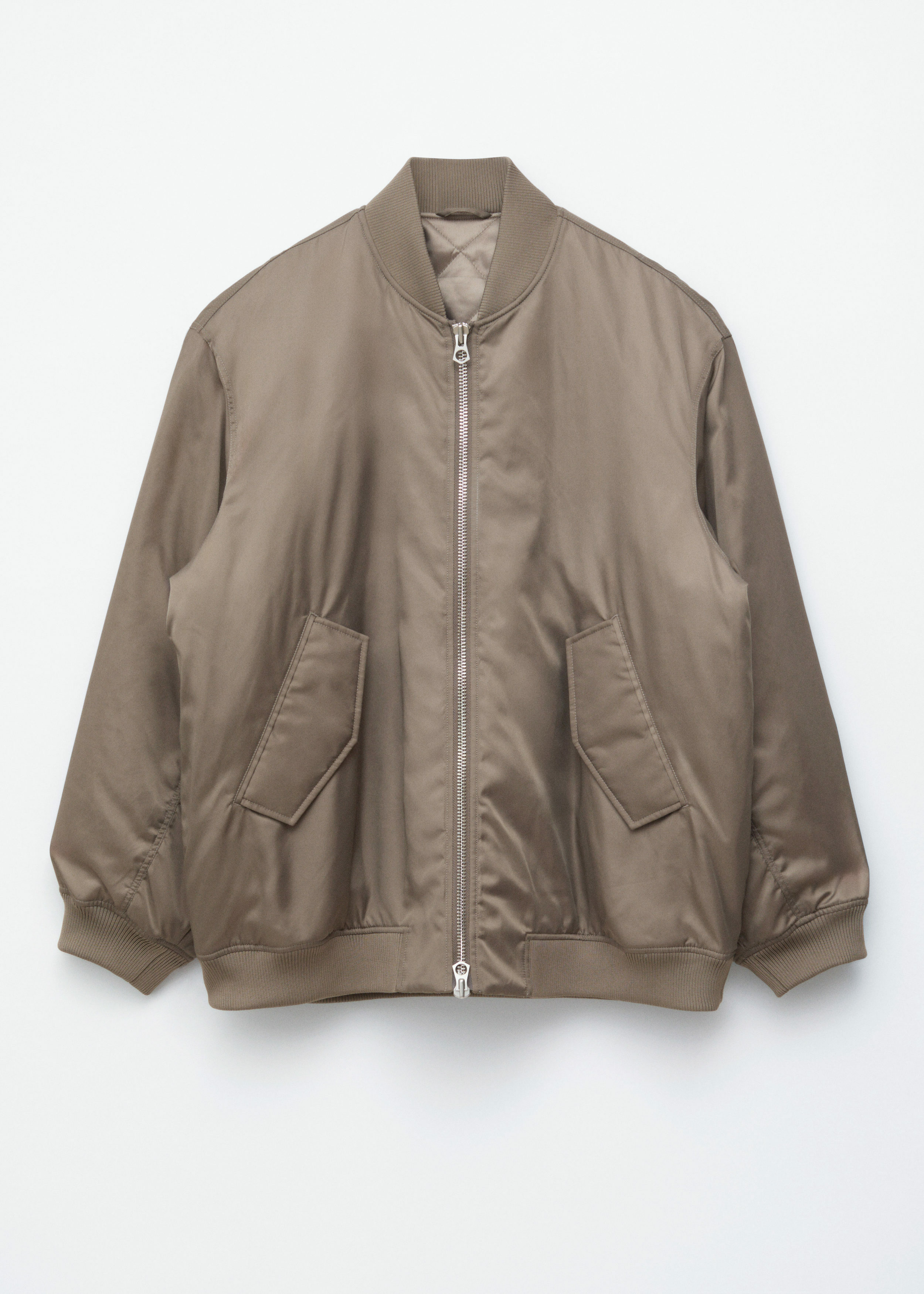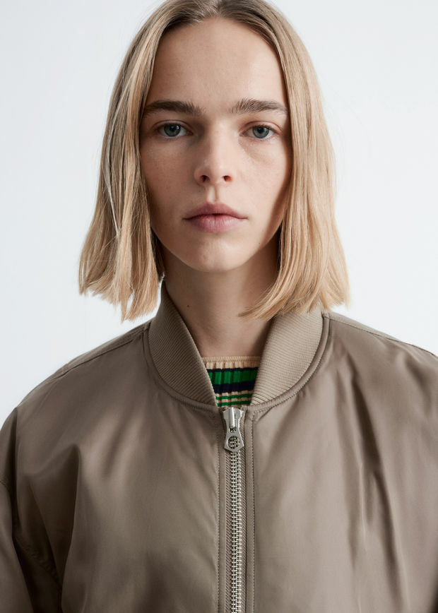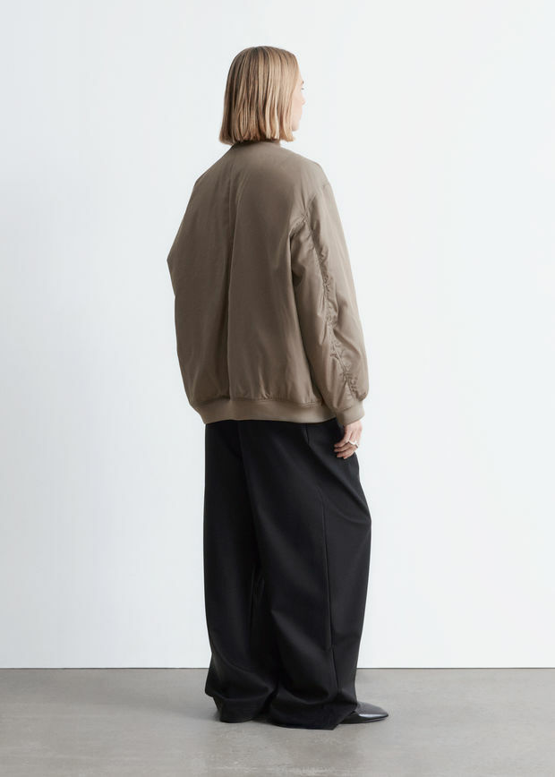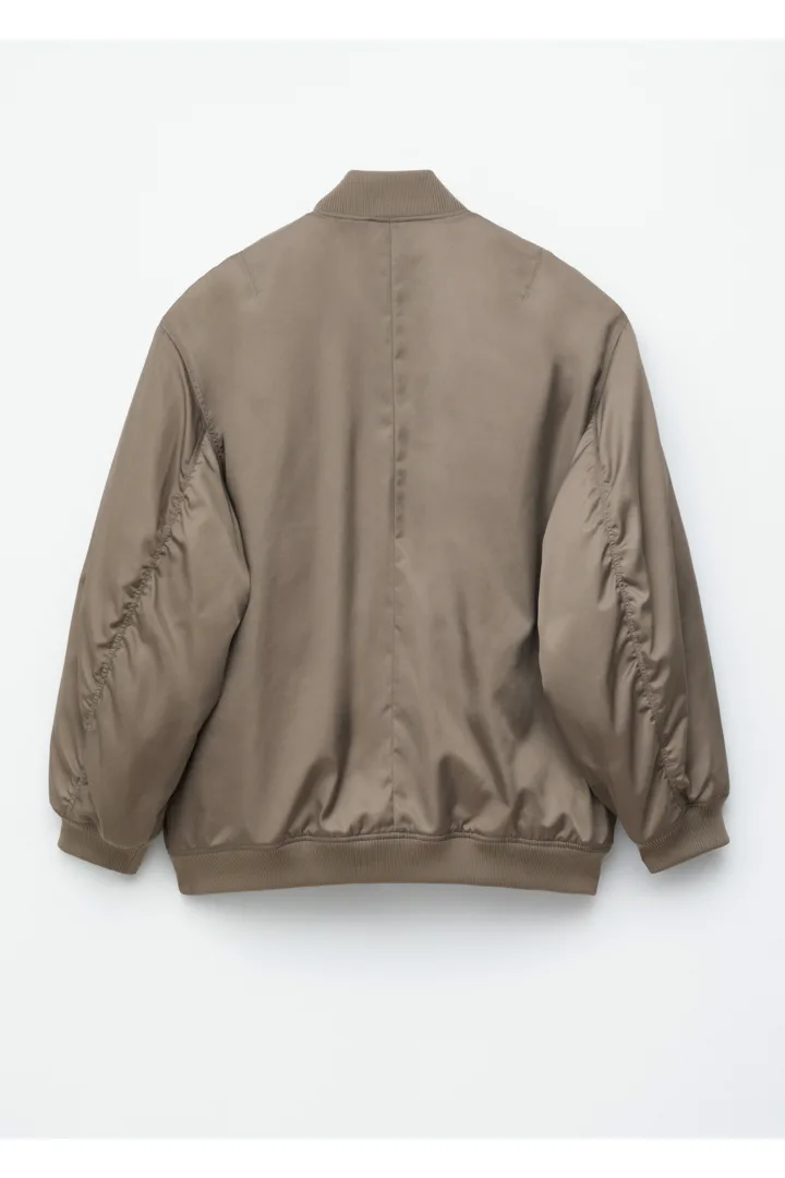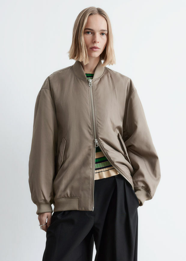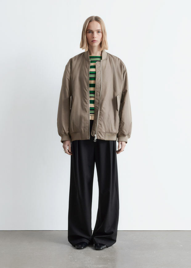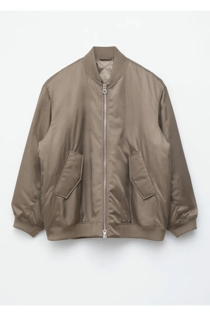 롱 & 박시 실루엣의 보머 자켓이에요. 전면 패딩 디자인으로 따뜻한 착용감을 선사한답니다. 카라, 헴라인, 커프스에는 립 디테일이 자리해 있으며, 슬리브의 탑스티치 솔기가 은은한 주름을 연출한답니다. 앞면의 사선 플랩 포켓과 지퍼 클로저가 자리해 있어요.