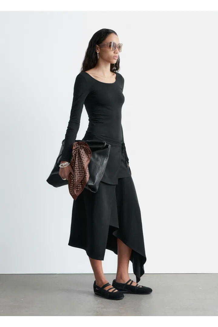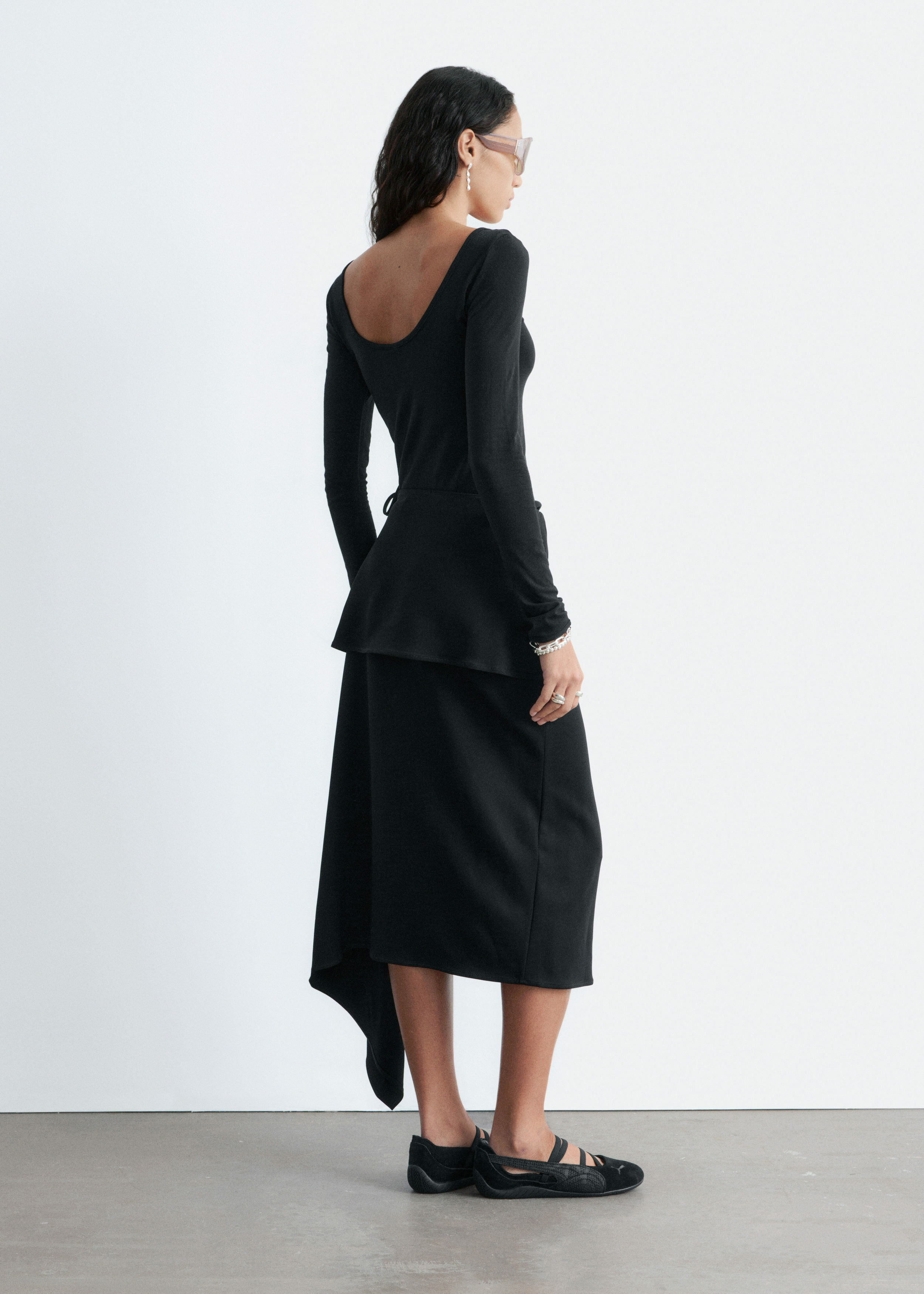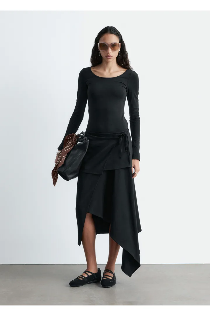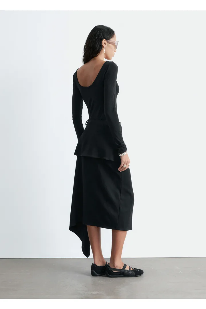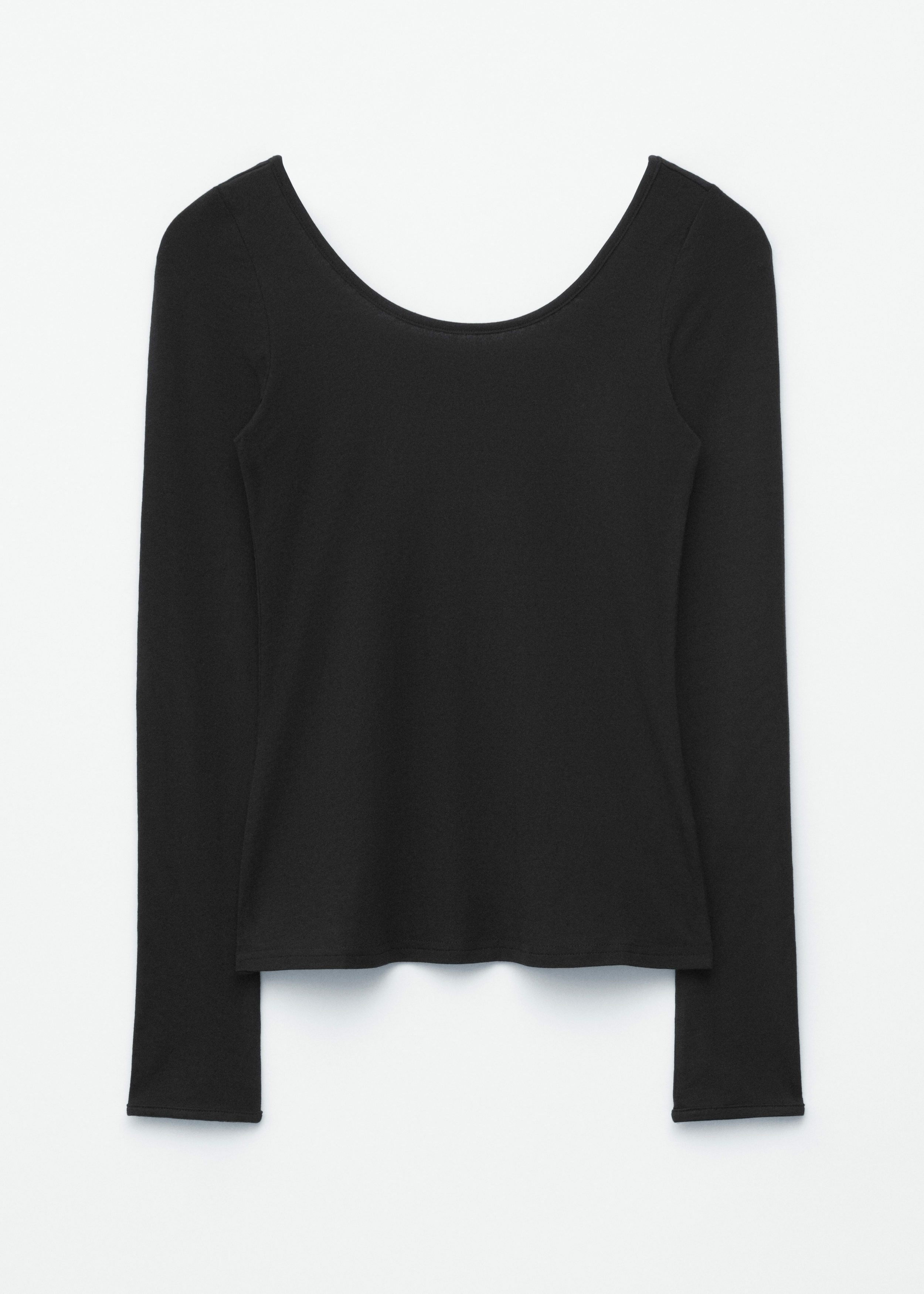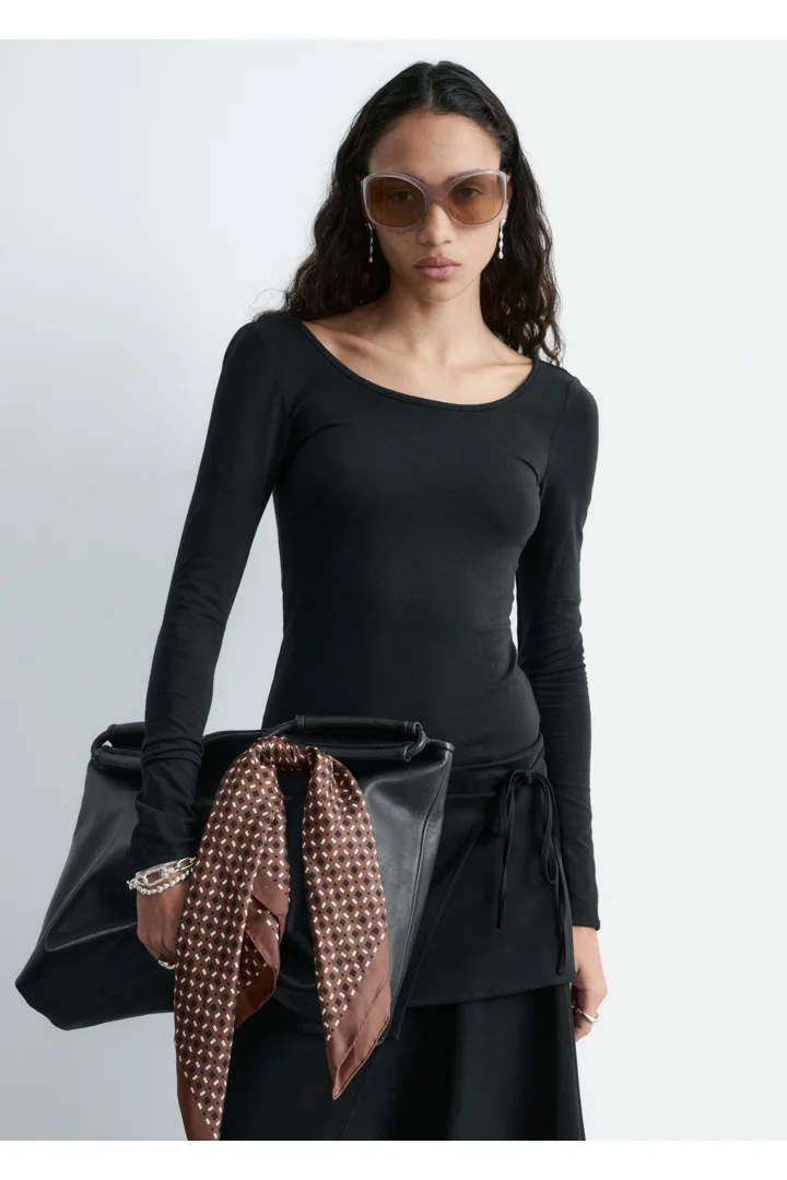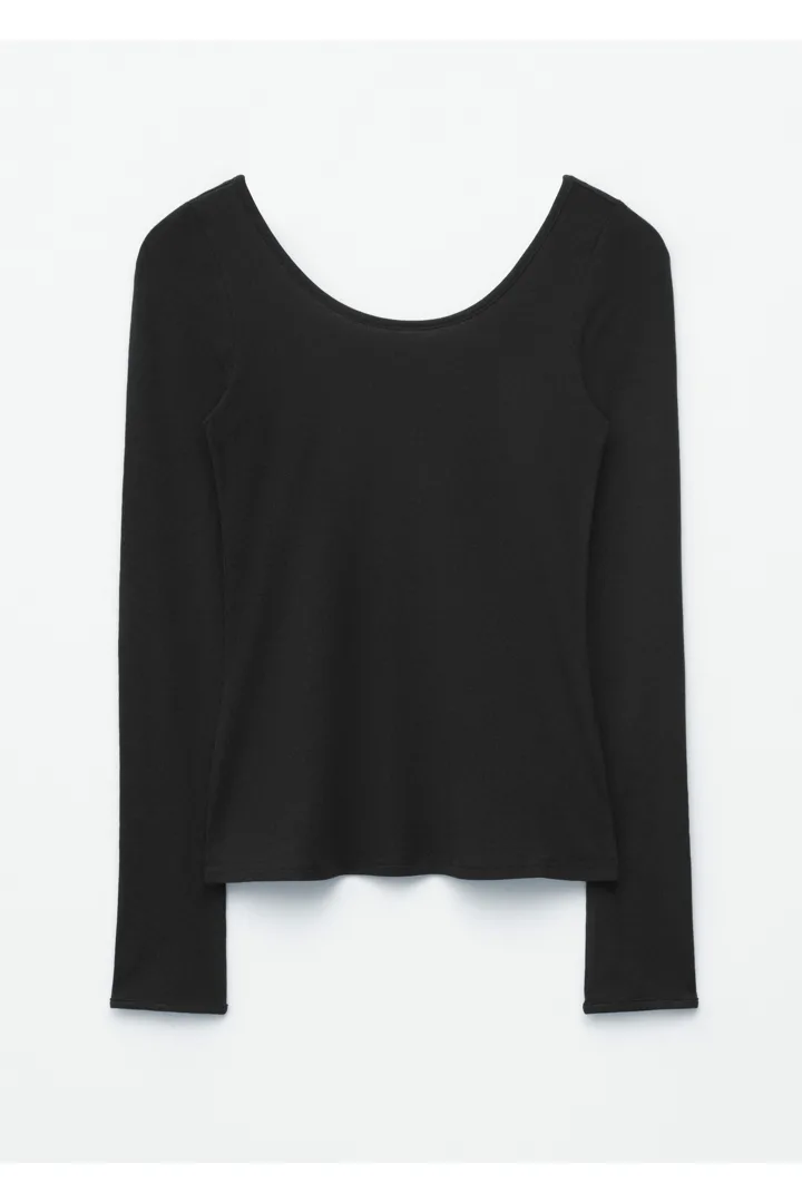 부드럽고 신축성 좋은 저지 소재의 롱 슬리브 탑이에요. 앞면과 뒷면의 깊게 파인 네크라인이 시선을 사로잡는답니다.