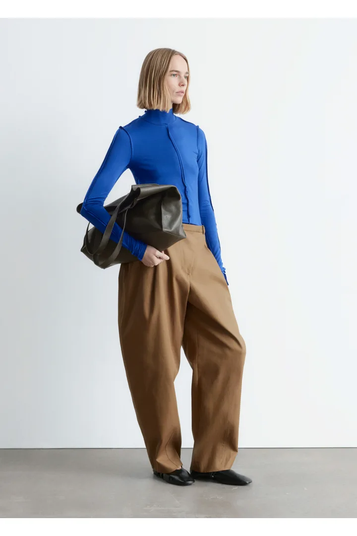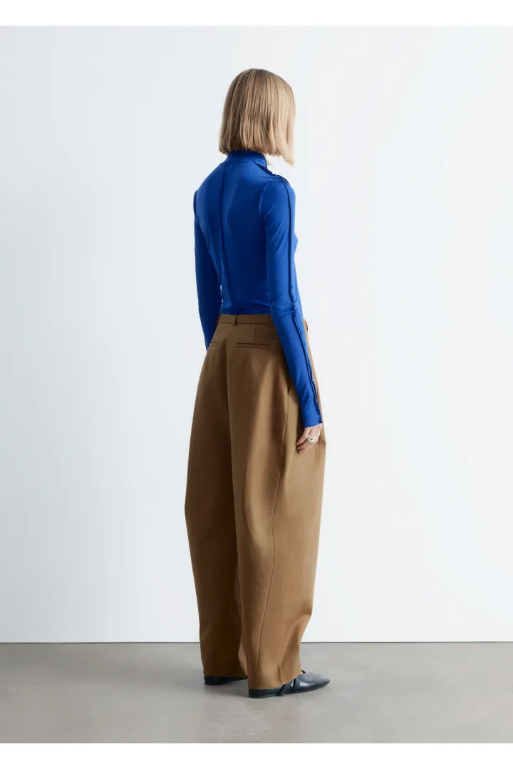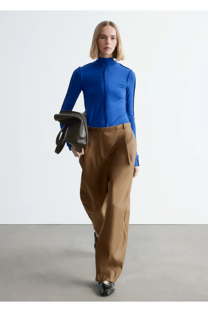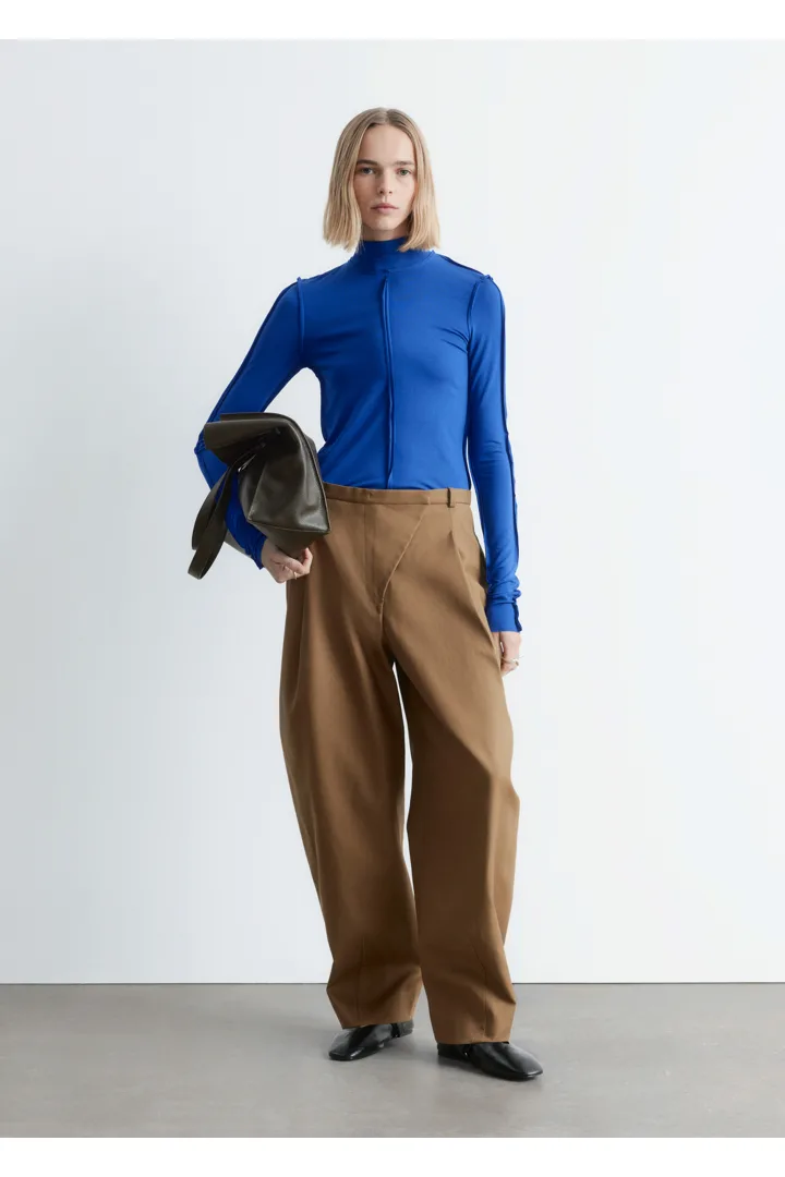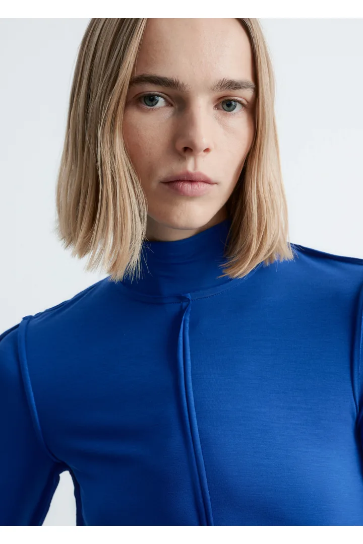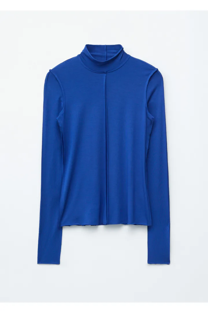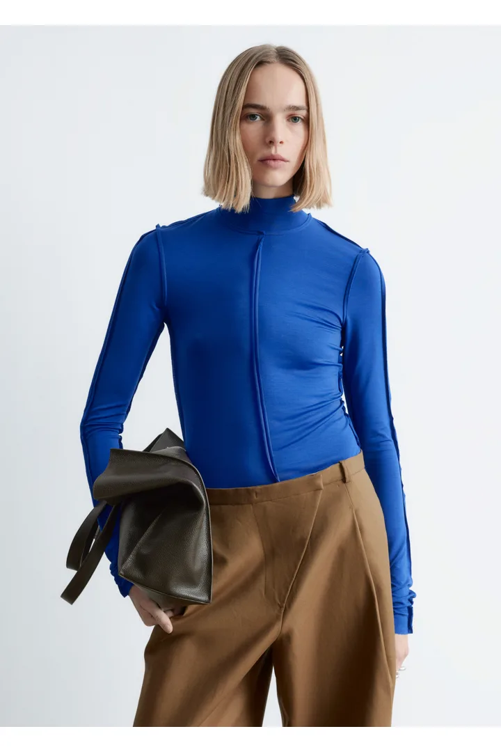 유려하게 흐르는 리오셀 저지로 탄생한 롱 슬리브 탑이에요. 슬림한 실루엣, 터틀넥, 뒤집힌 듯 경쾌한 무드를 연출하는 노출 솔기, 그리고 커프스와 헴라인의 로 엣지가 특징이랍니다.