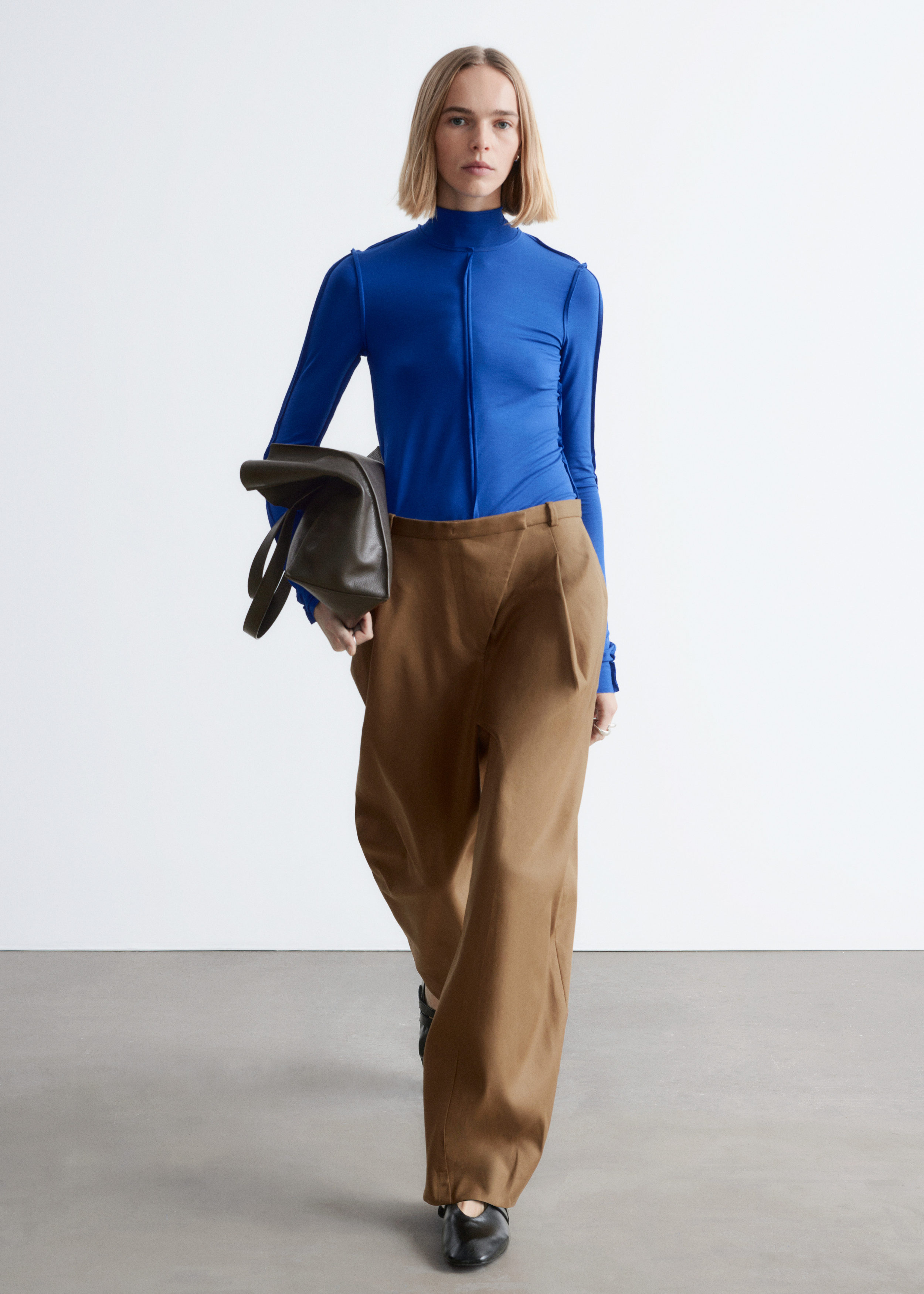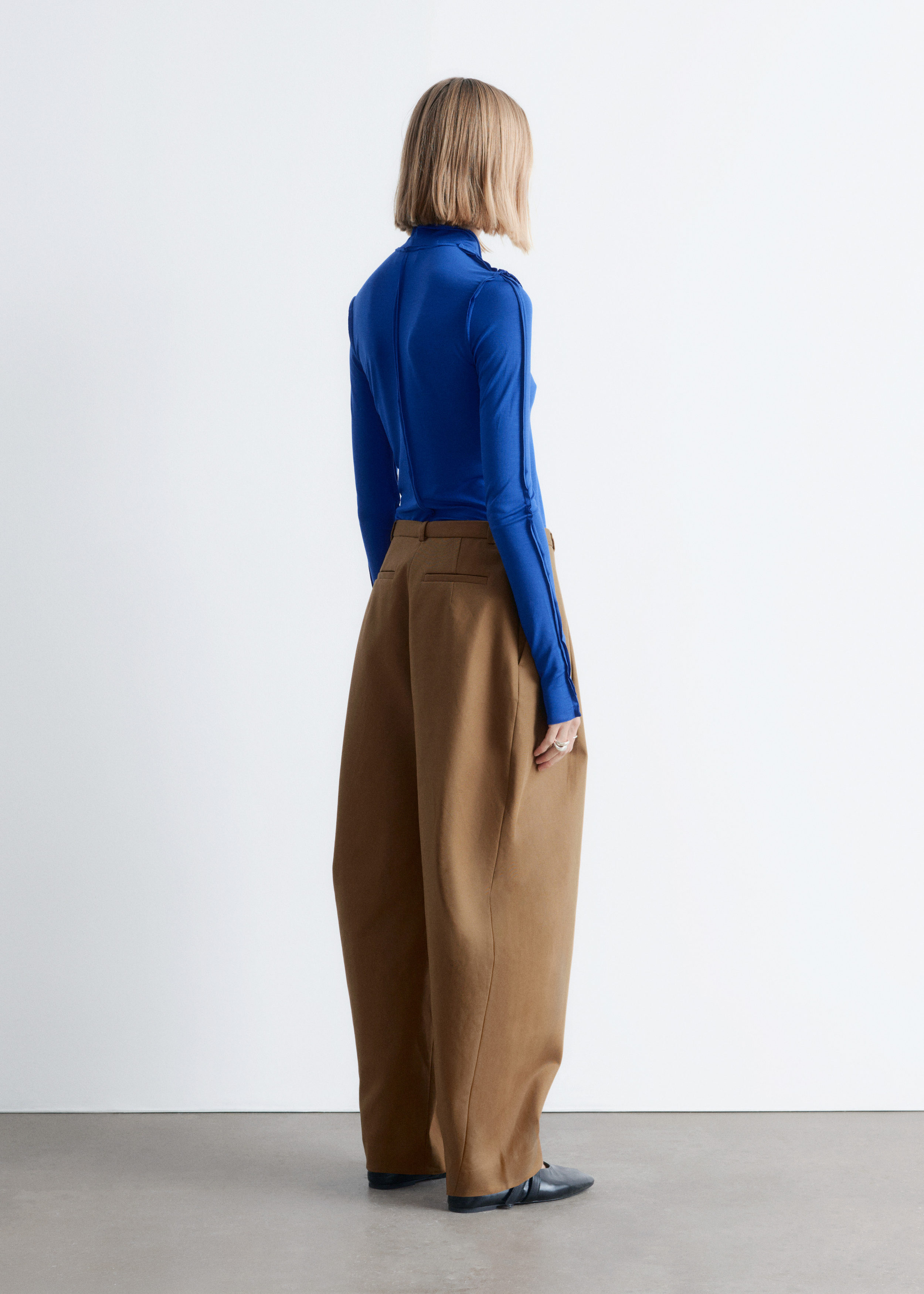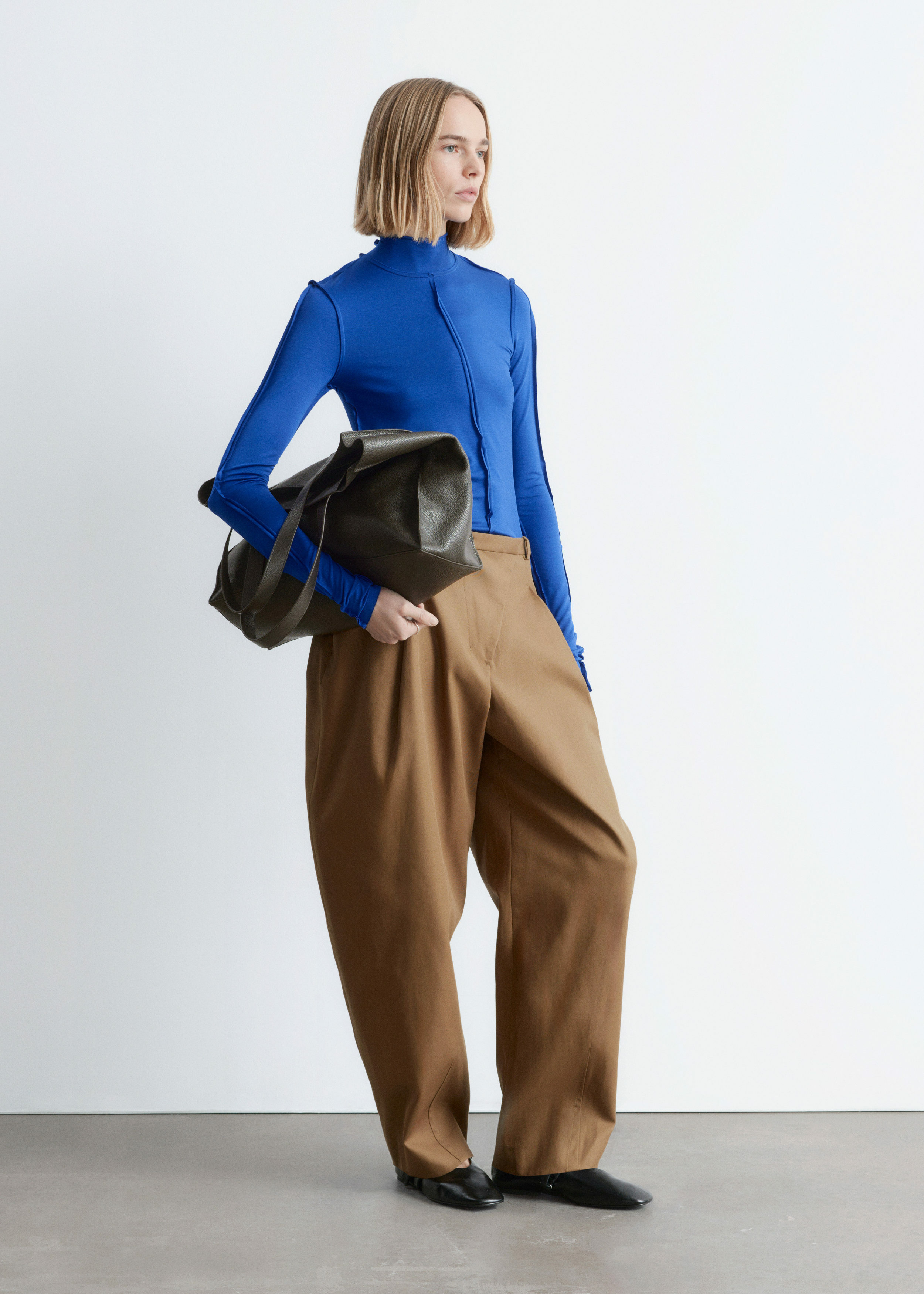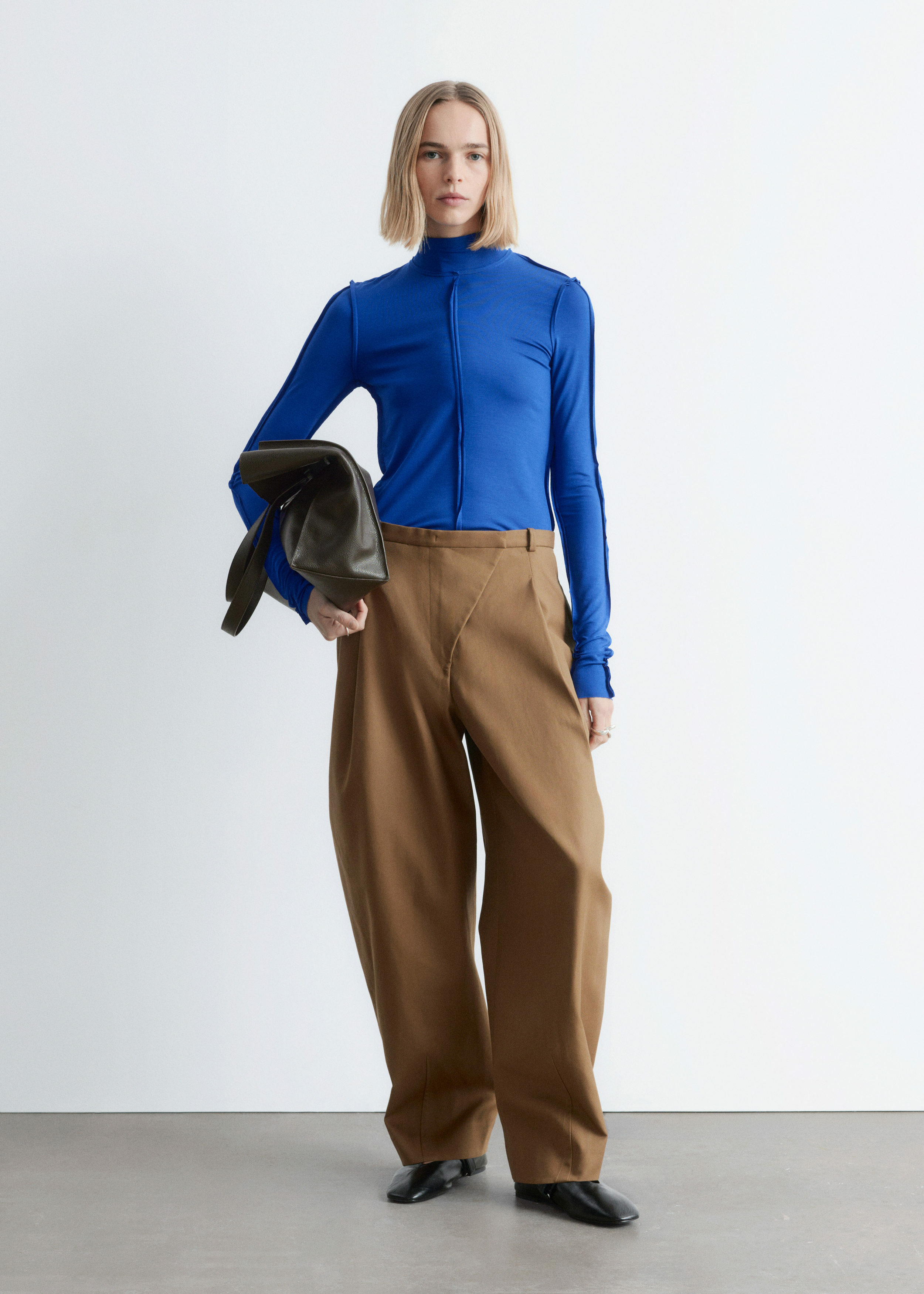 유려하게 흐르는 리오셀 저지로 탄생한 롱 슬리브 탑이에요. 슬림한 실루엣, 터틀넥, 뒤집힌 듯 경쾌한 무드를 연출하는 노출 솔기, 그리고 커프스와 헴라인의 로 엣지가 특징이랍니다.