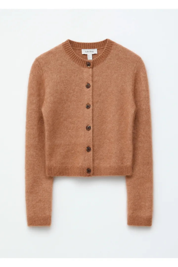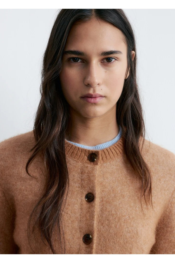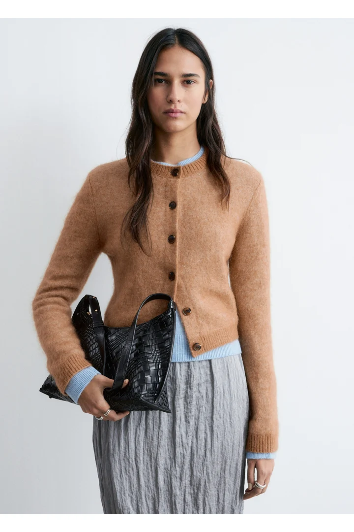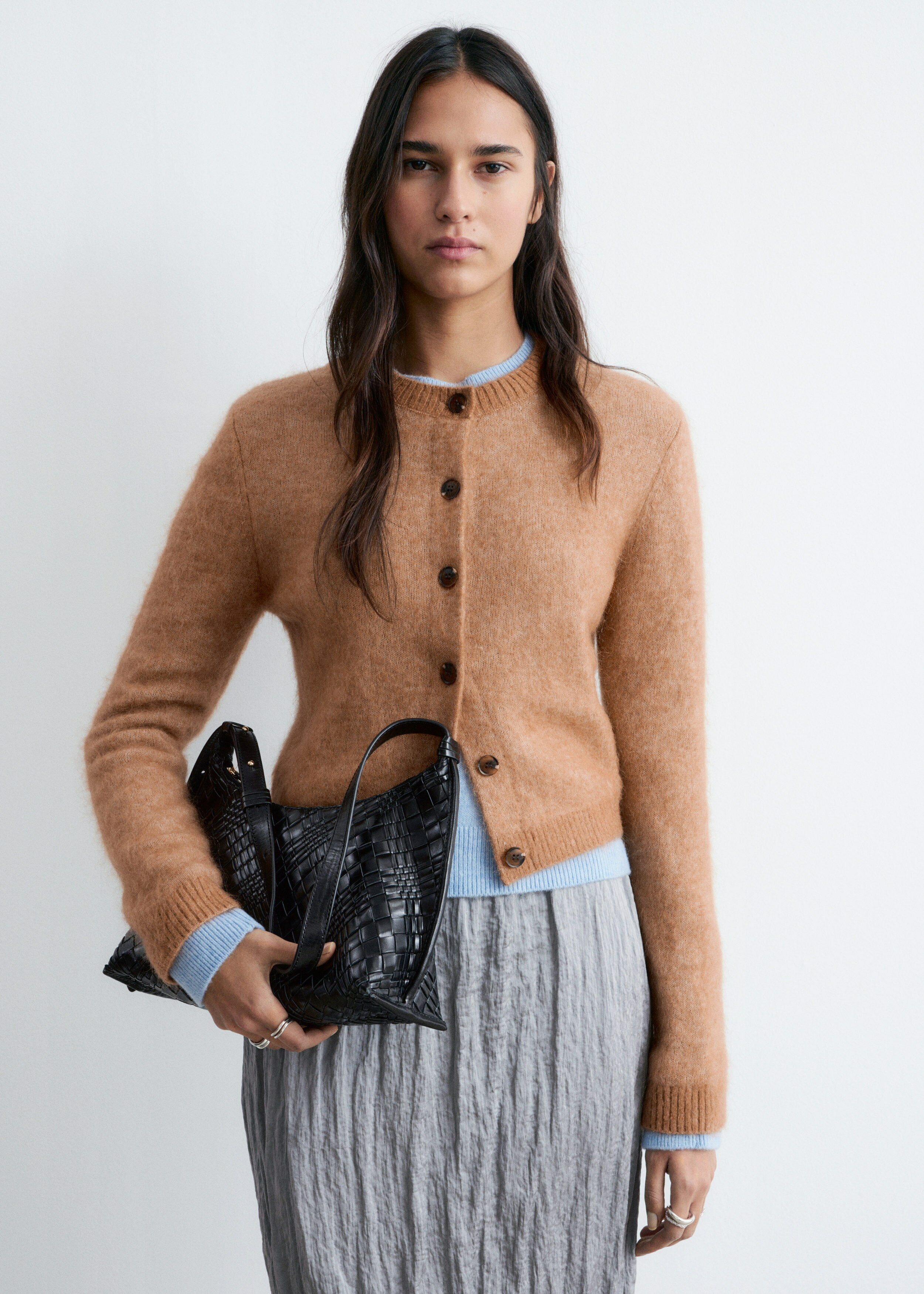 브러시드 모헤어 & 울 혼방 니트로 탄생한 롱 슬리브 가디건이에요. 슬림한 쇼트 실루엣이 멋스러운 아이템으로 라운드 네크라인, 앞면의 단추, 그리고 립 트리밍이 자리해 있답니다.