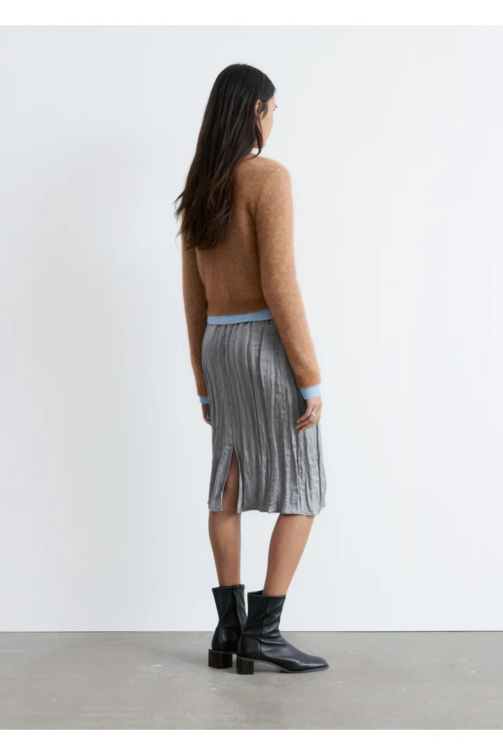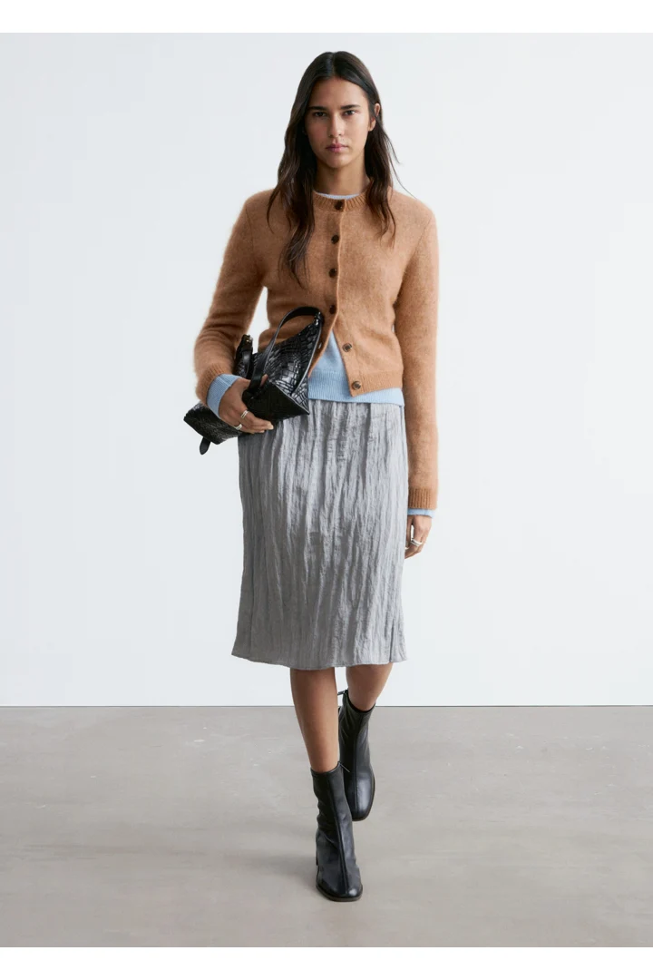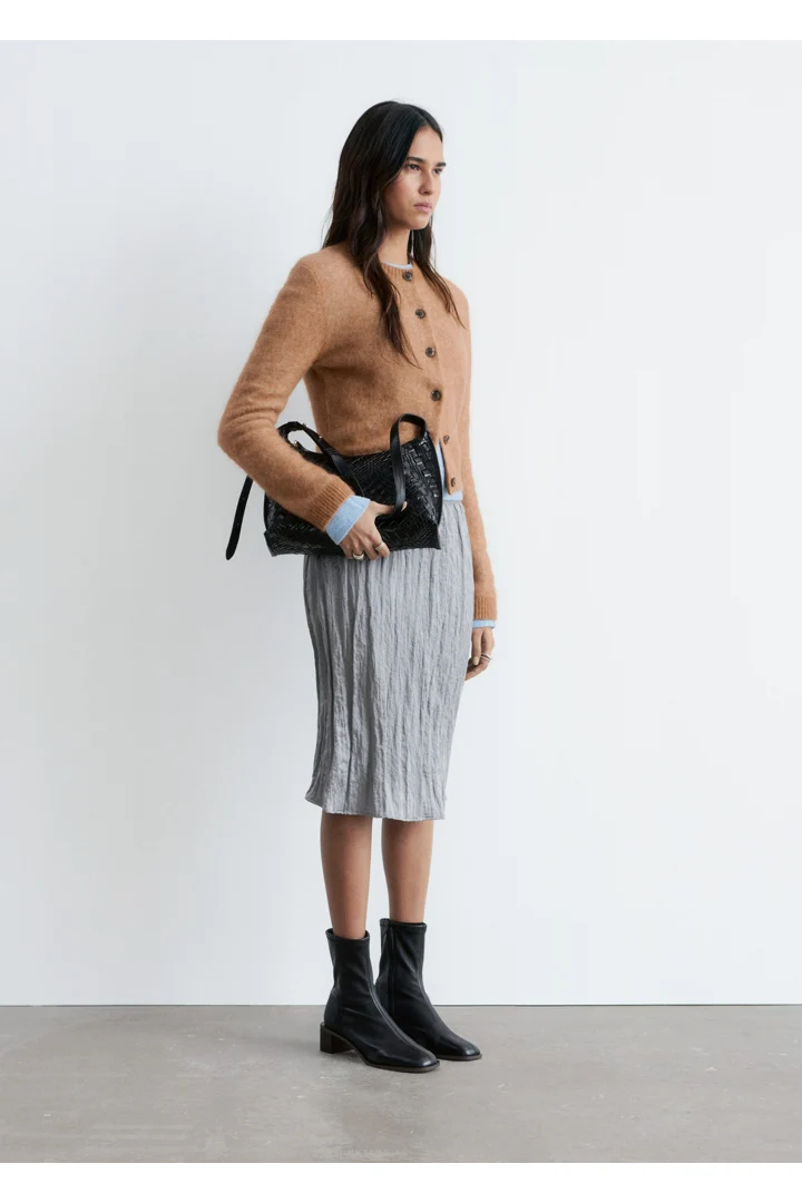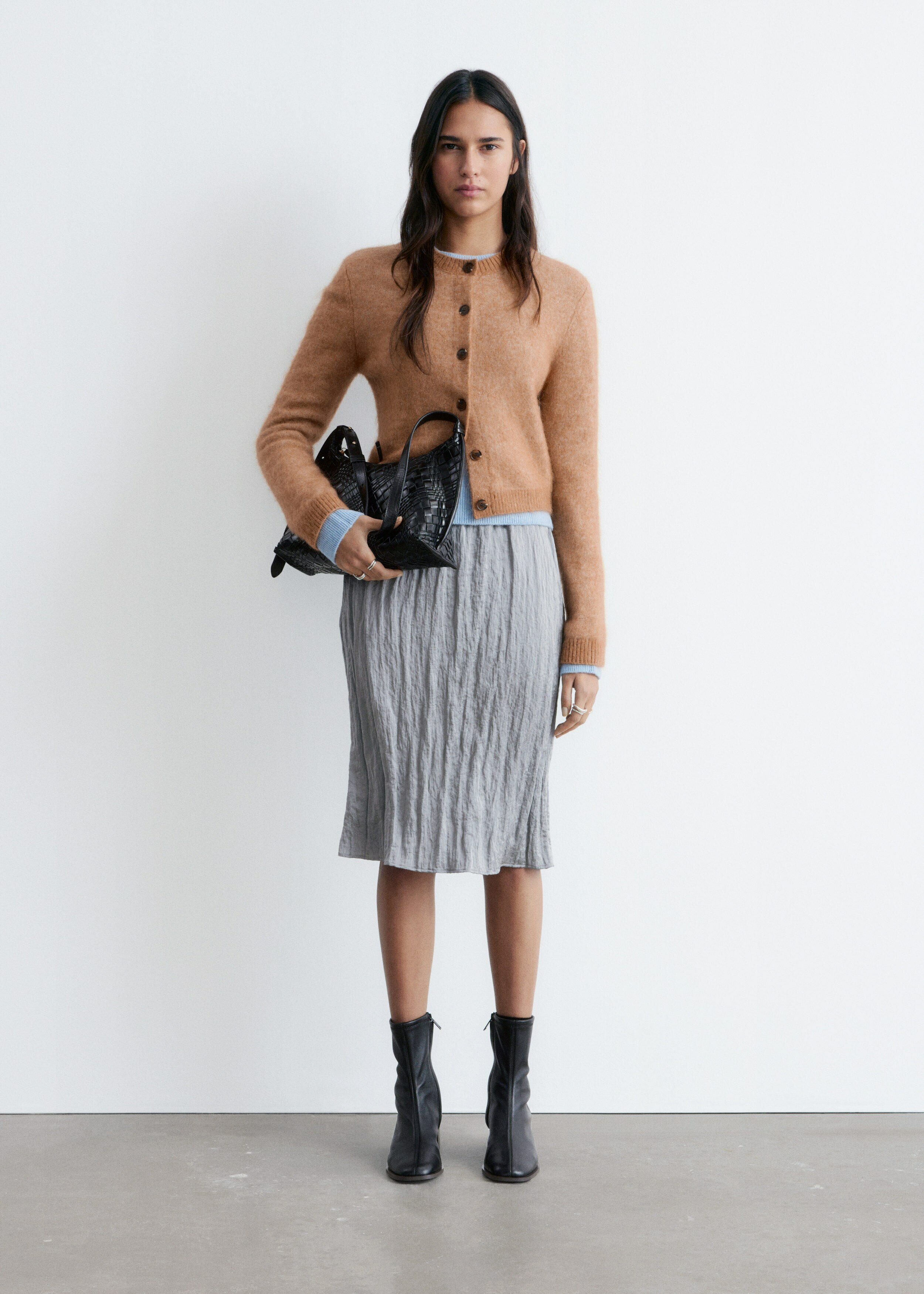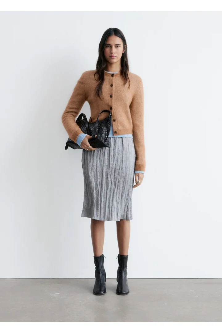 브러시드 모헤어 & 울 혼방 니트로 탄생한 롱 슬리브 가디건이에요. 슬림한 쇼트 실루엣이 멋스러운 아이템으로 라운드 네크라인, 앞면의 단추, 그리고 립 트리밍이 자리해 있답니다.