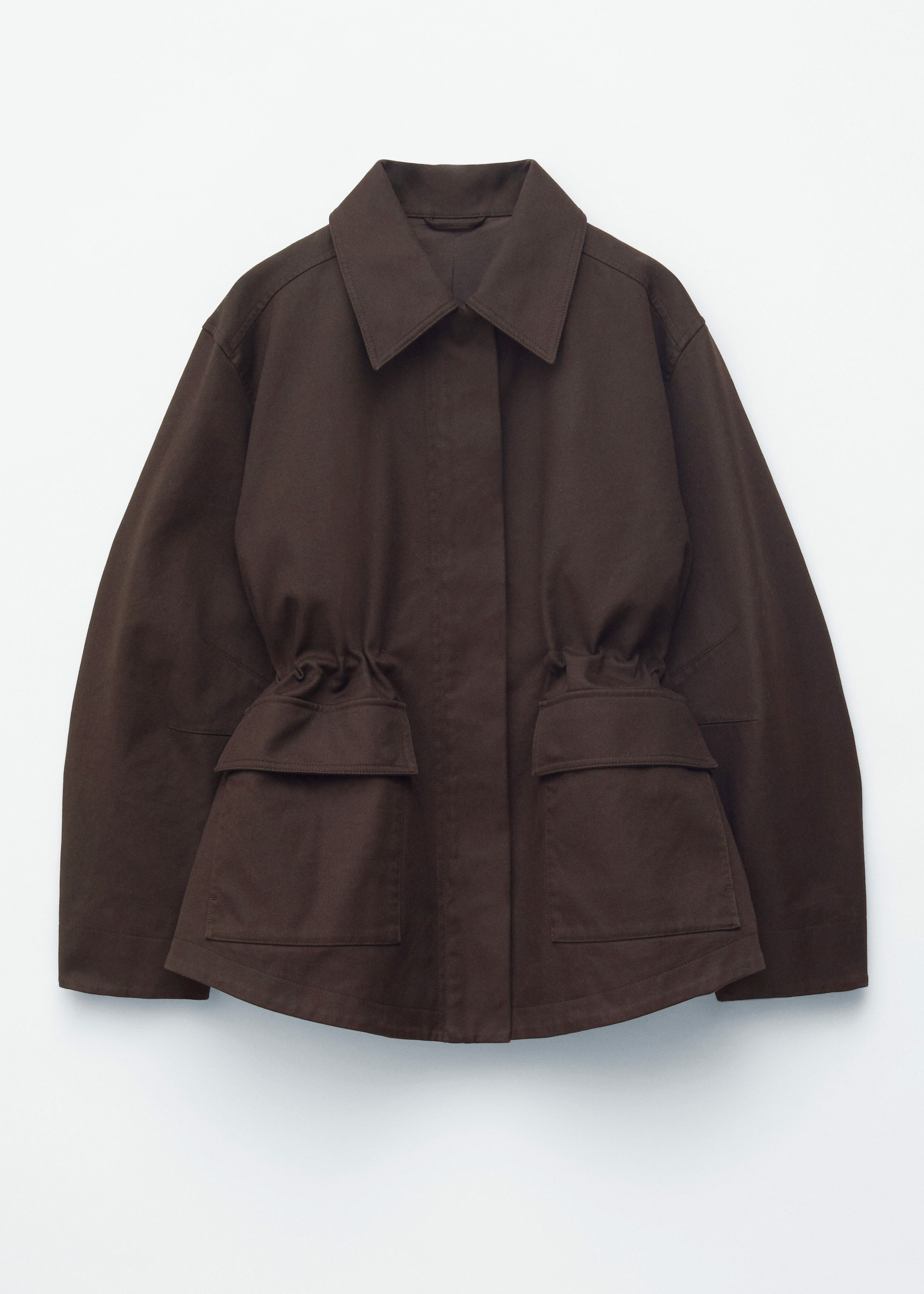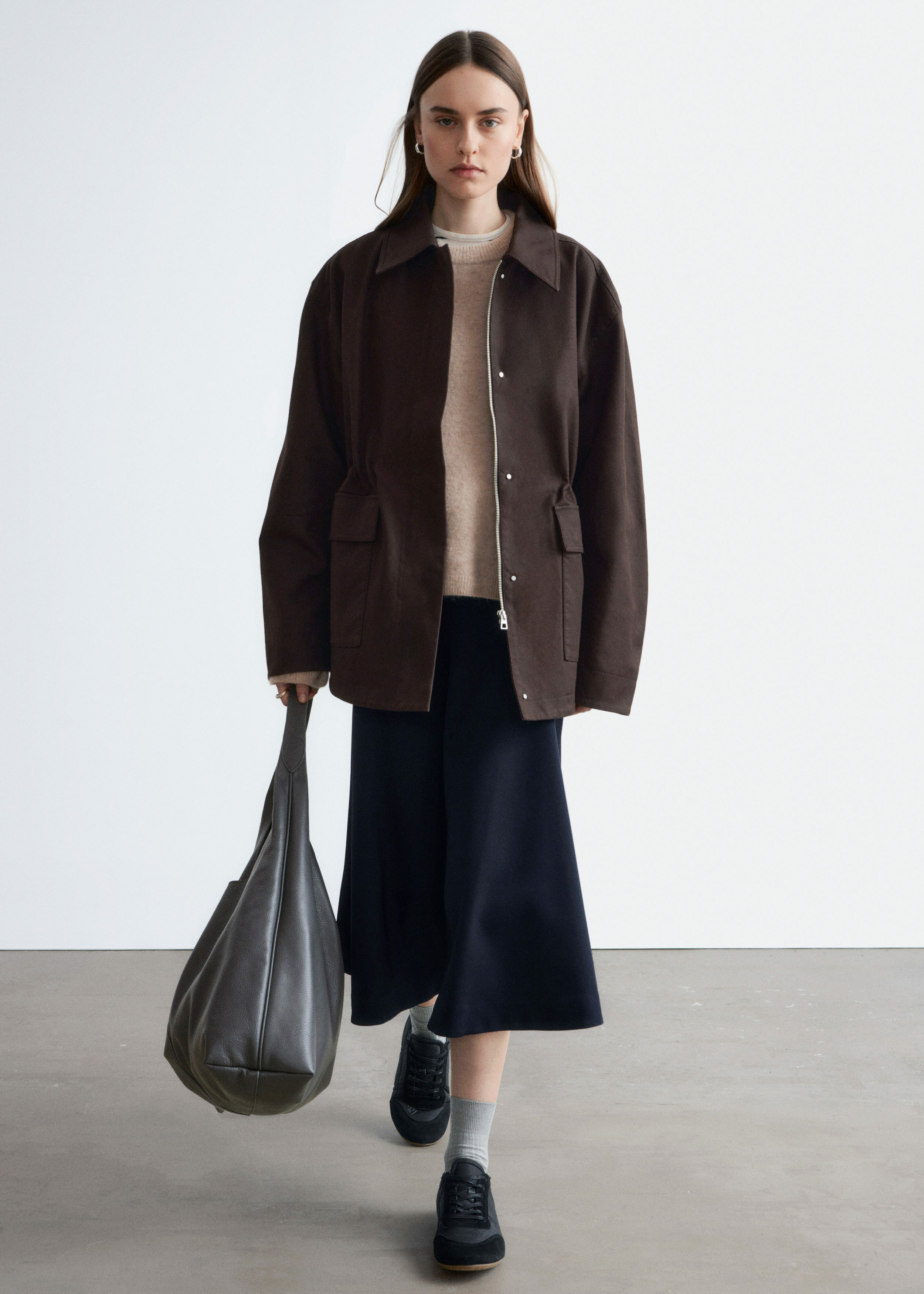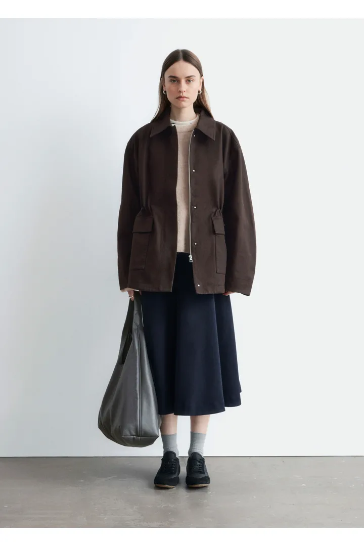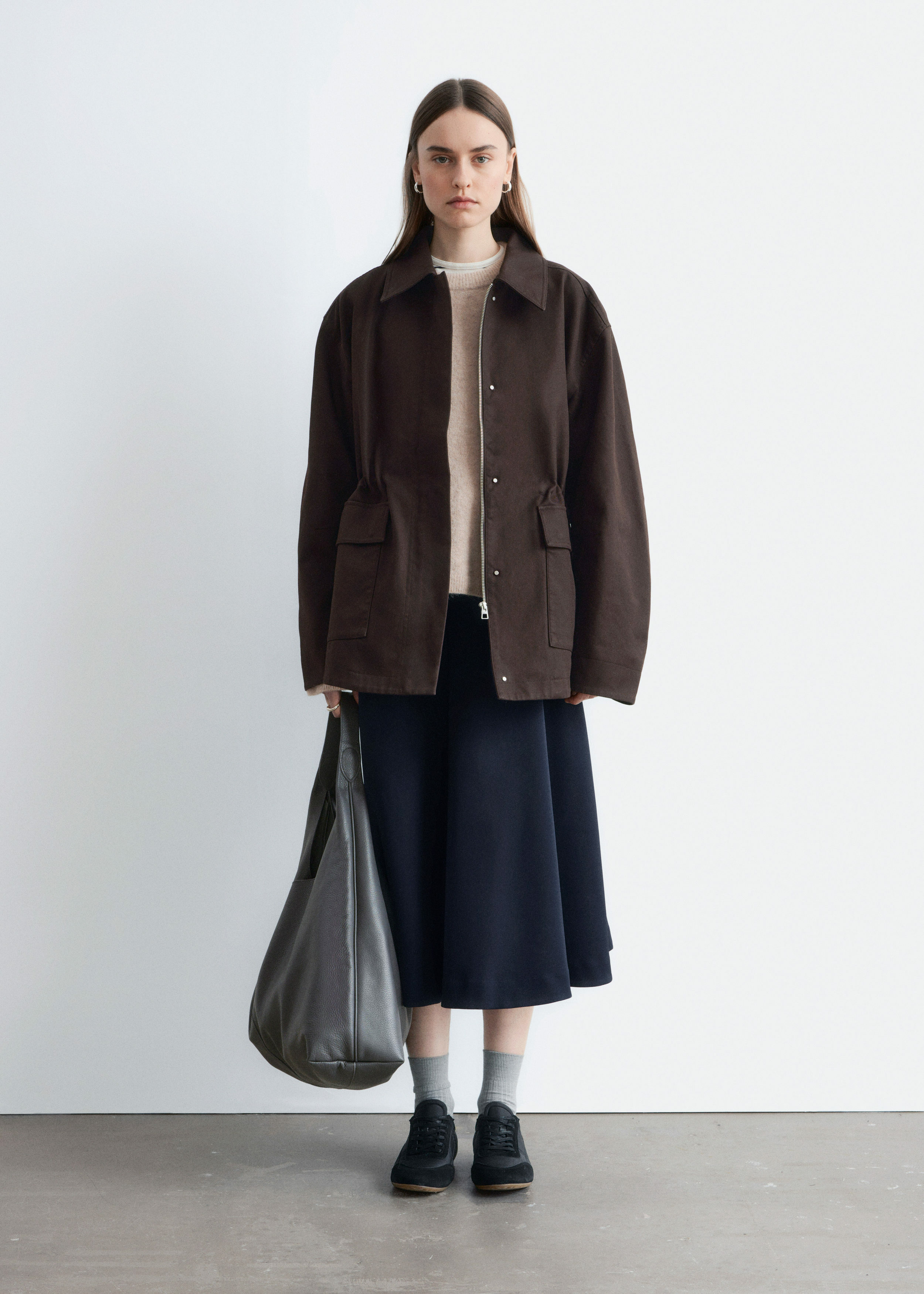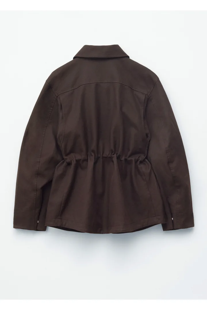 탄탄한 트윌 코튼 소재의 오버사이즈 자켓이에요. 클래식 카라, 2개의 큼직한 패치 포켓, 컨실드 지퍼 플래킷, 프레스 단추가 자리해 있으며 허리의 이너 드로스트링을 조여 구조적인 실루엣을 연출할 수 있답니다.