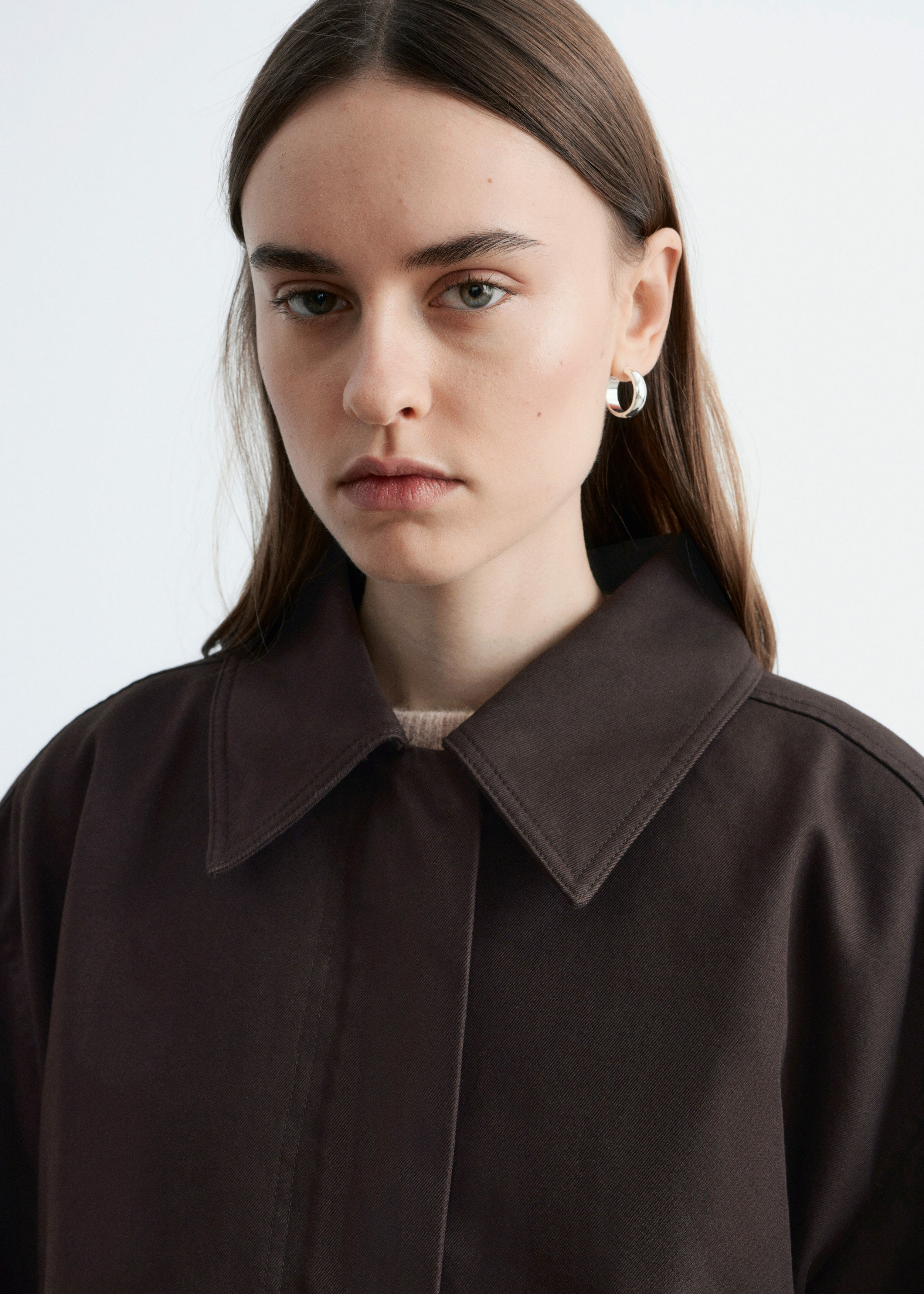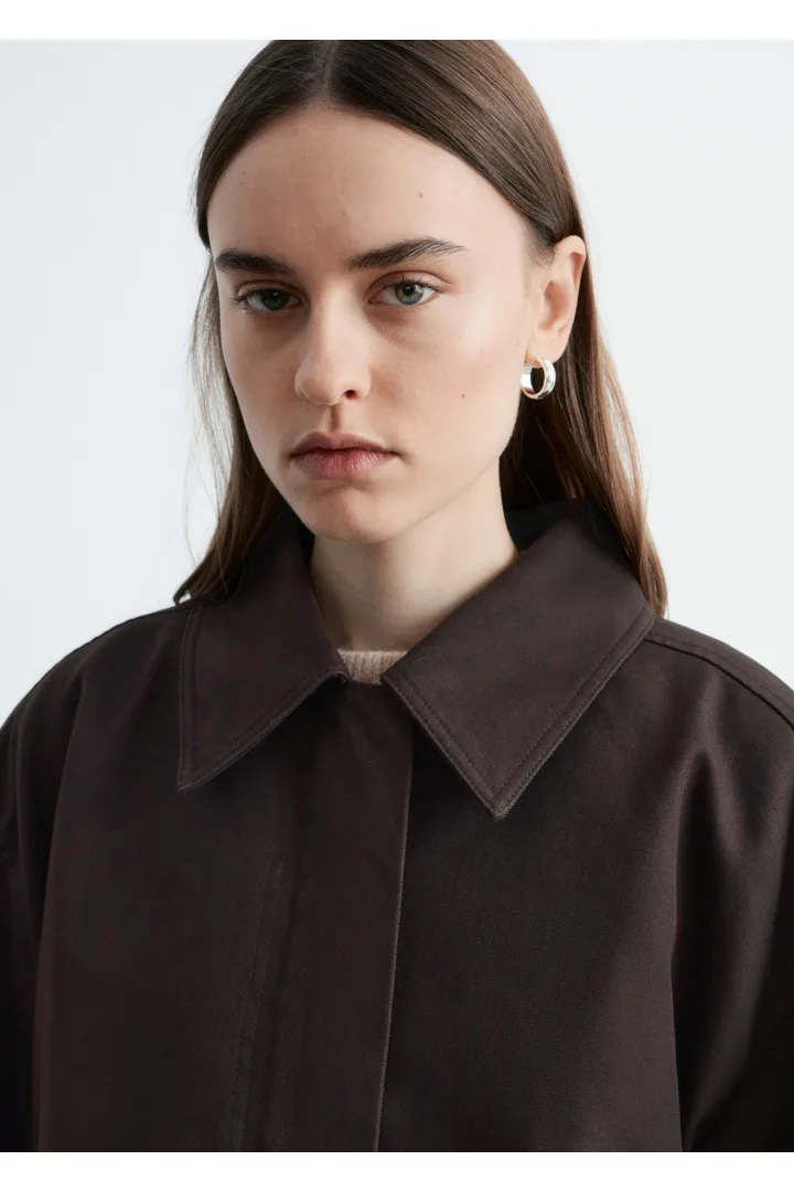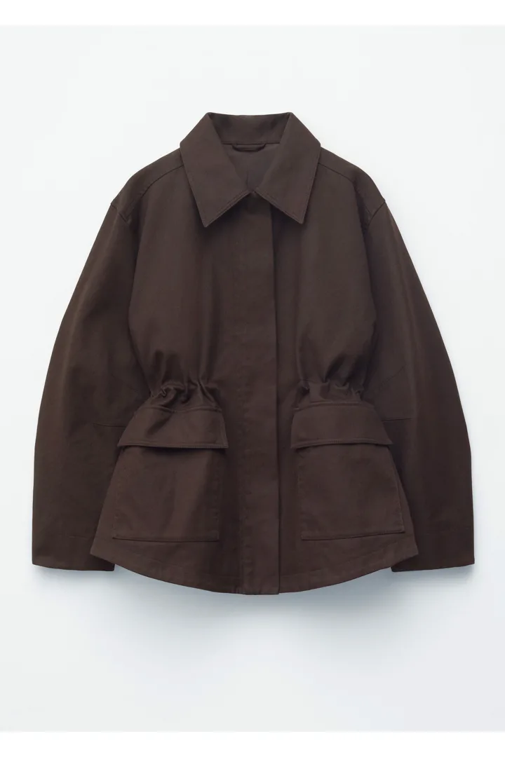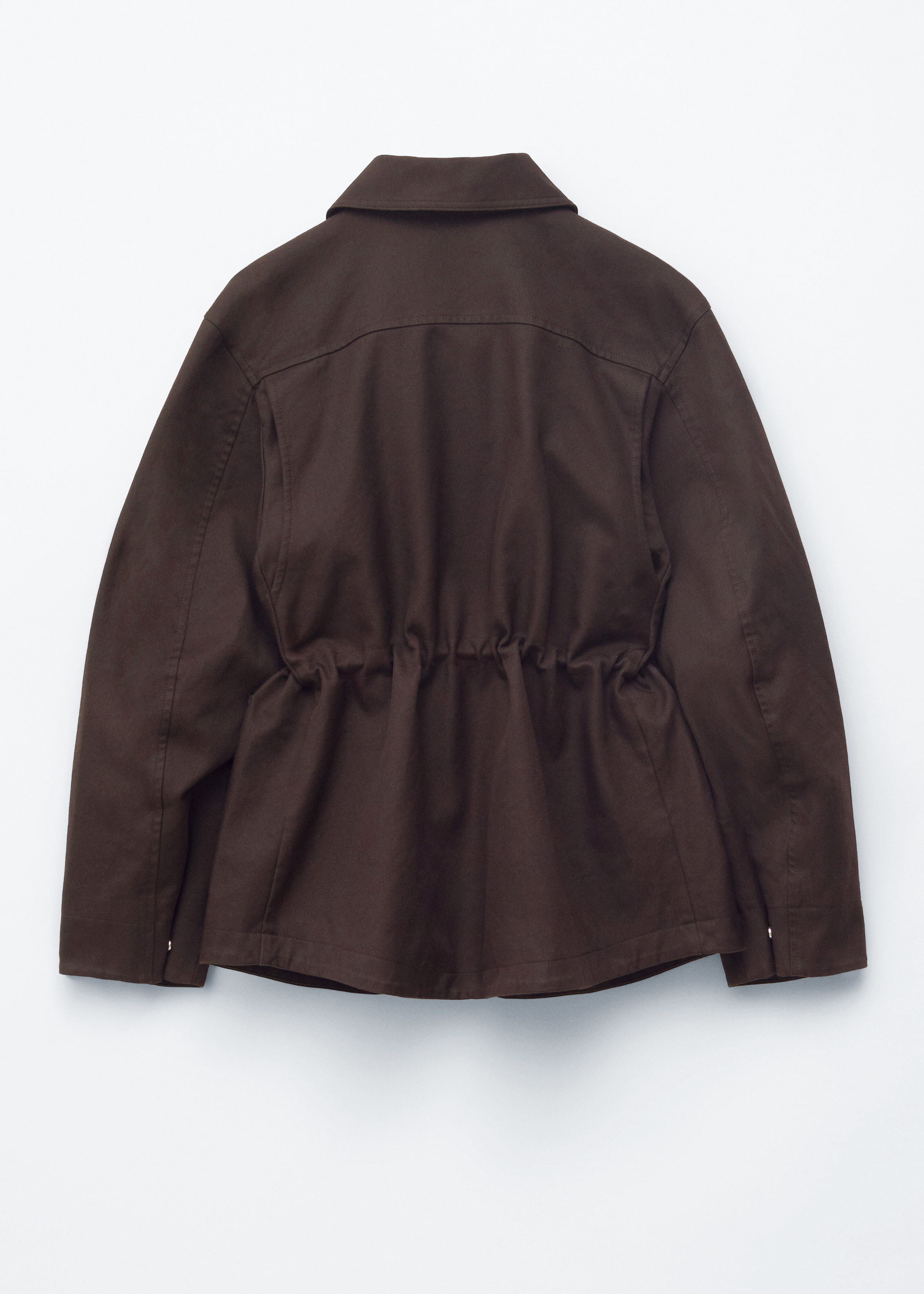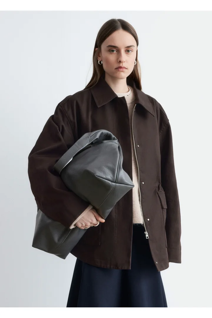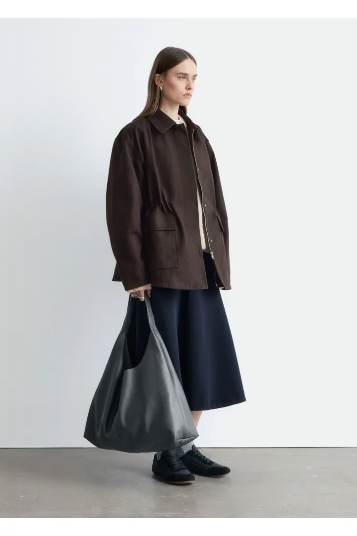 탄탄한 트윌 코튼 소재의 오버사이즈 자켓이에요. 클래식 카라, 2개의 큼직한 패치 포켓, 컨실드 지퍼 플래킷, 프레스 단추가 자리해 있으며 허리의 이너 드로스트링을 조여 구조적인 실루엣을 연출할 수 있답니다.
