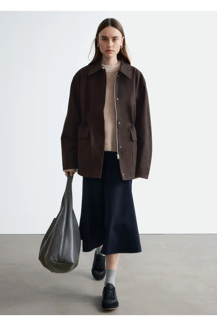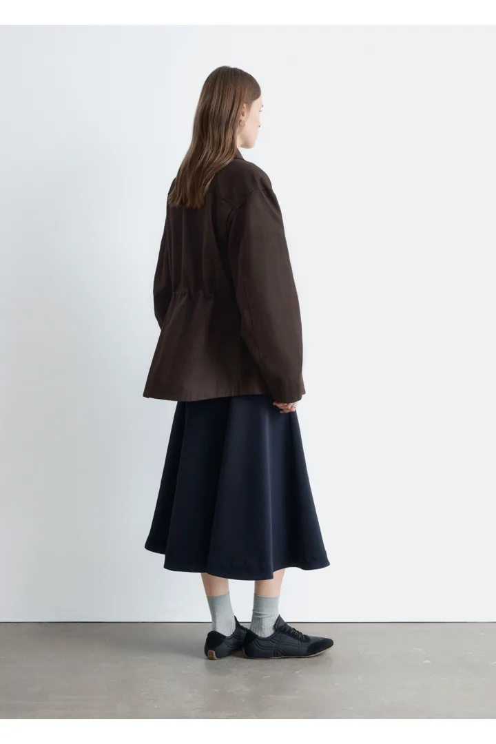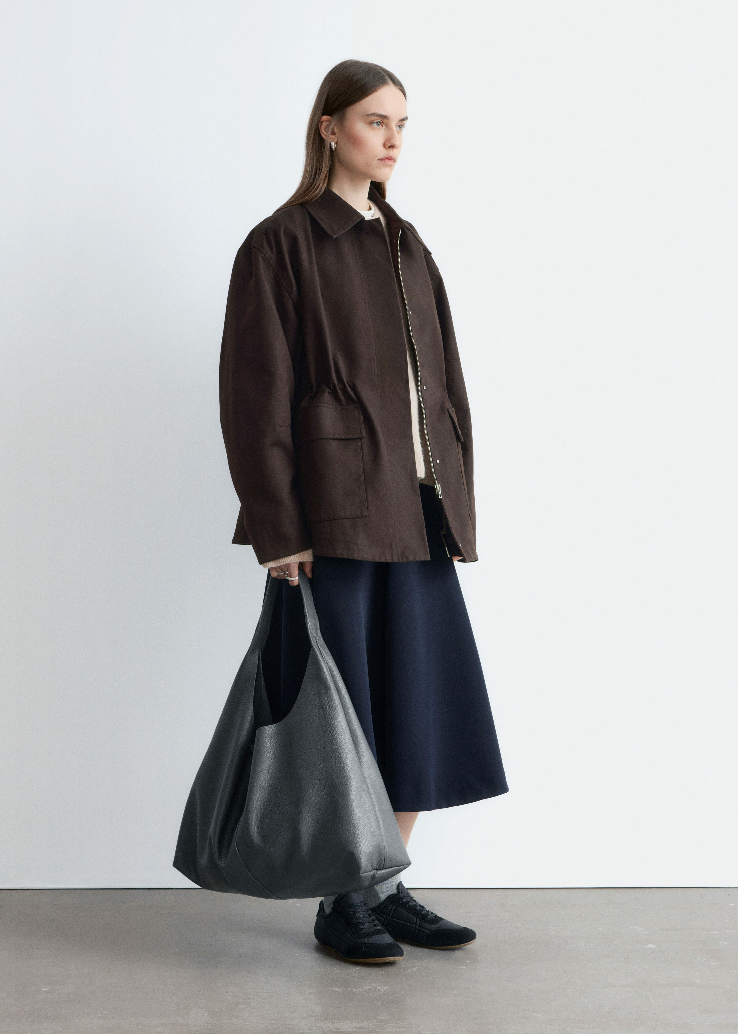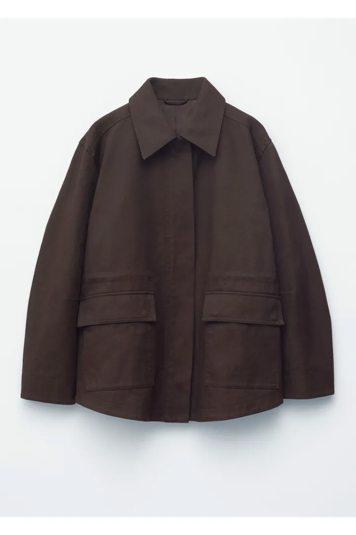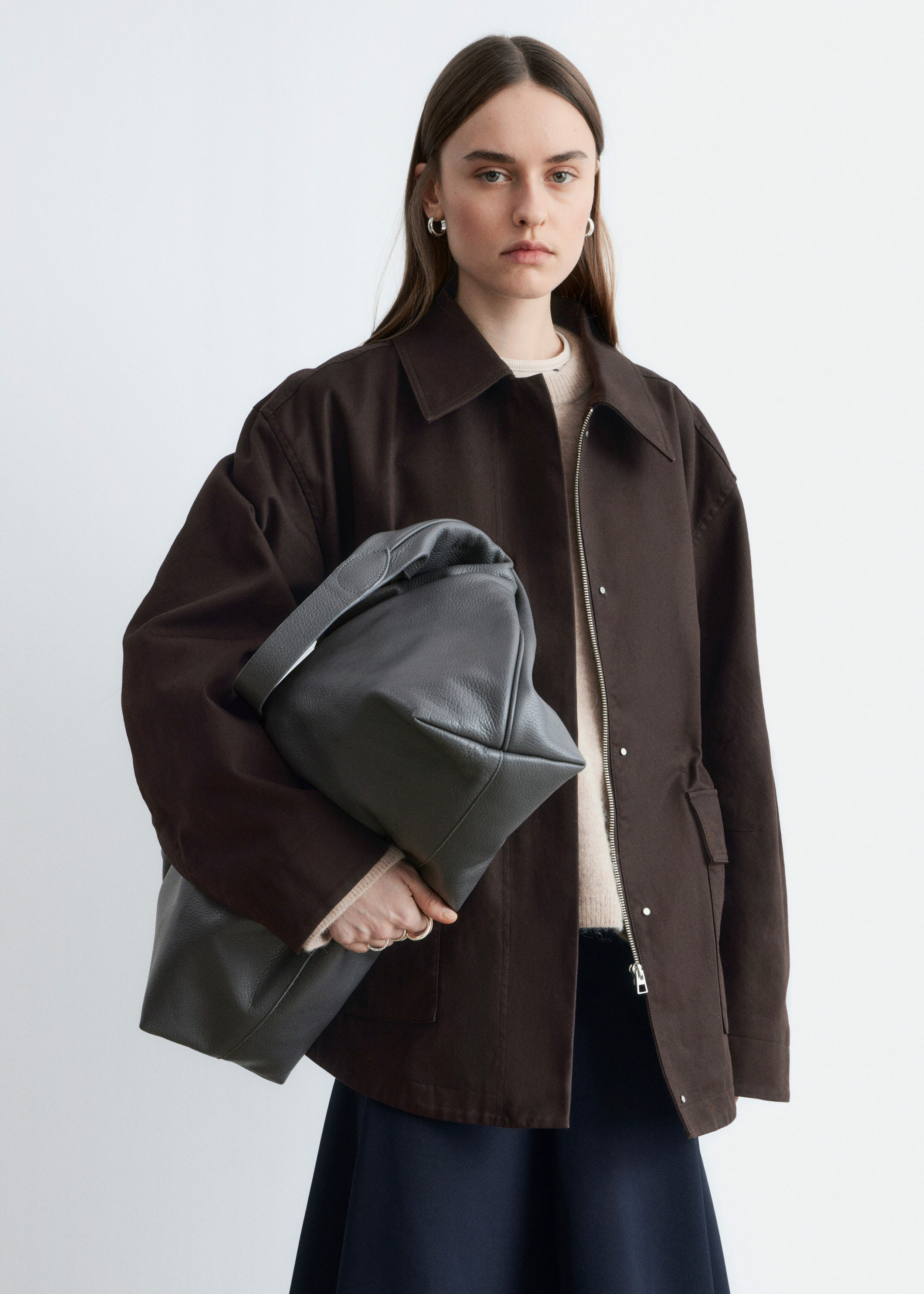 탄탄한 트윌 코튼 소재의 오버사이즈 자켓이에요. 클래식 카라, 2개의 큼직한 패치 포켓, 컨실드 지퍼 플래킷, 프레스 단추가 자리해 있으며 허리의 이너 드로스트링을 조여 구조적인 실루엣을 연출할 수 있답니다.