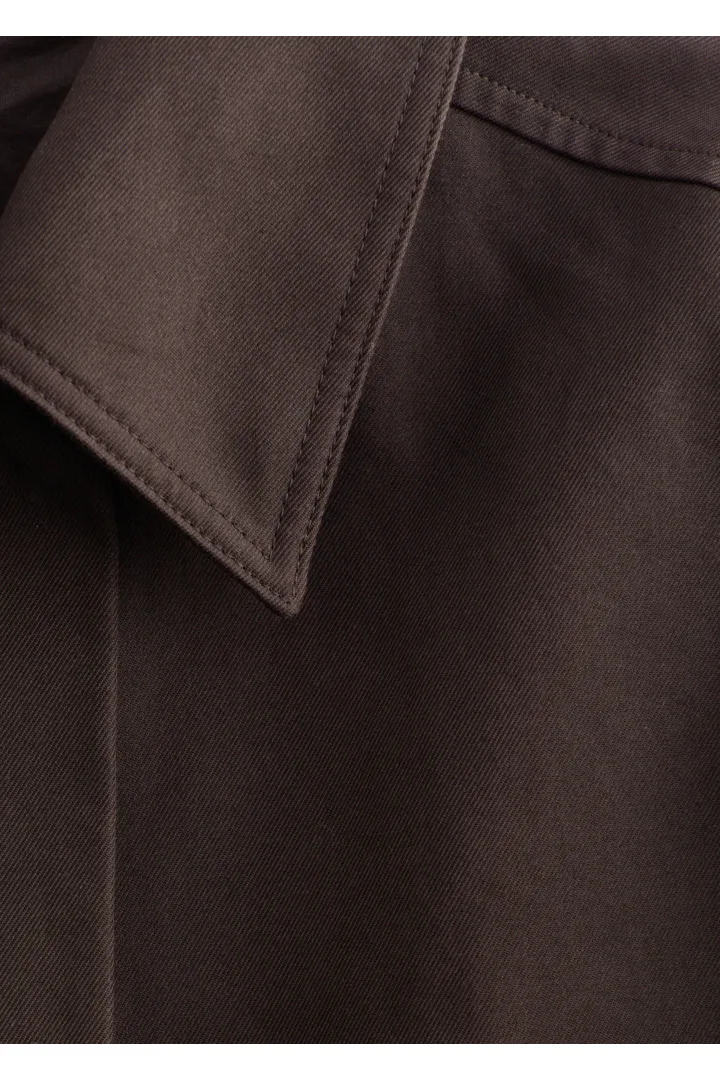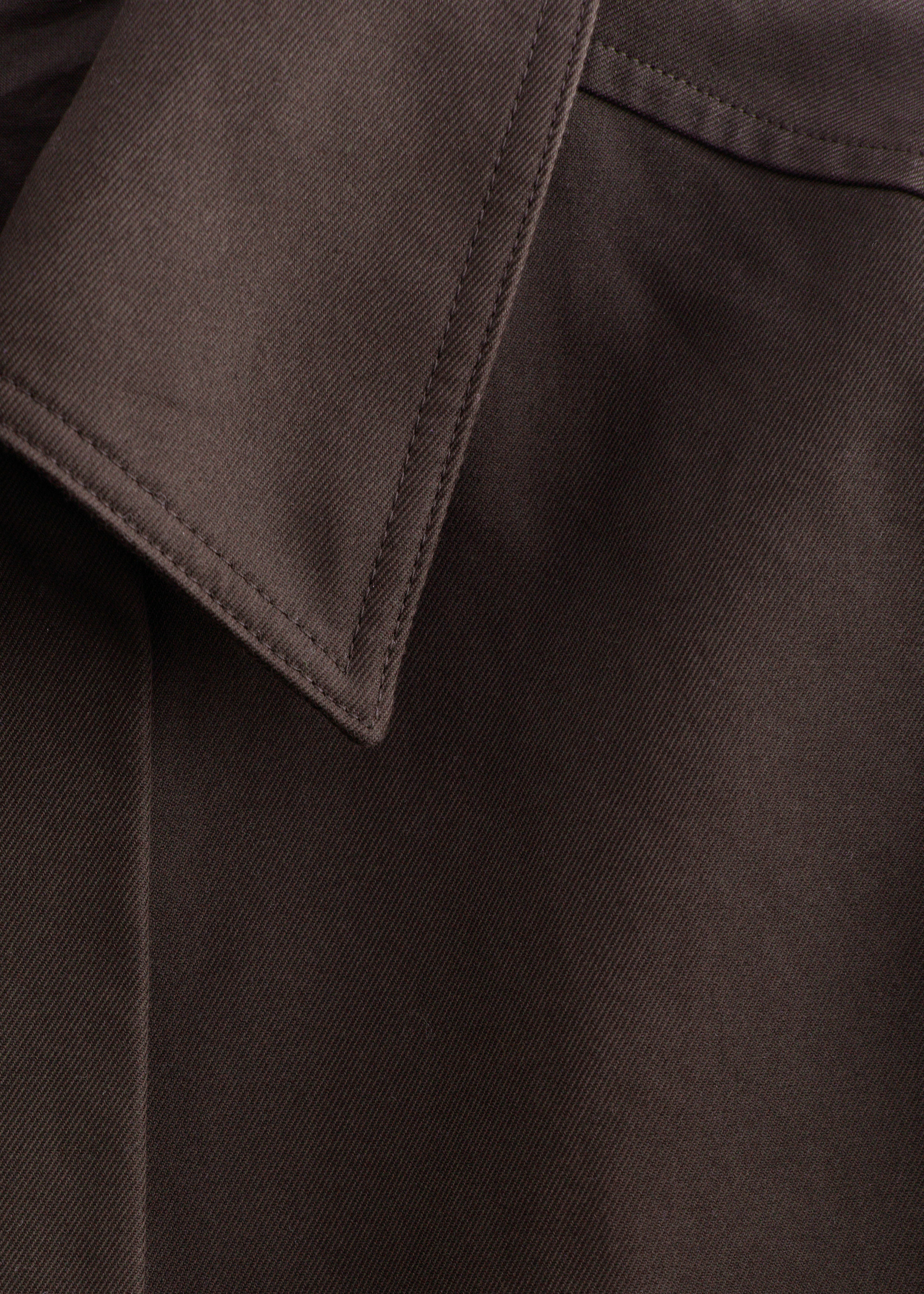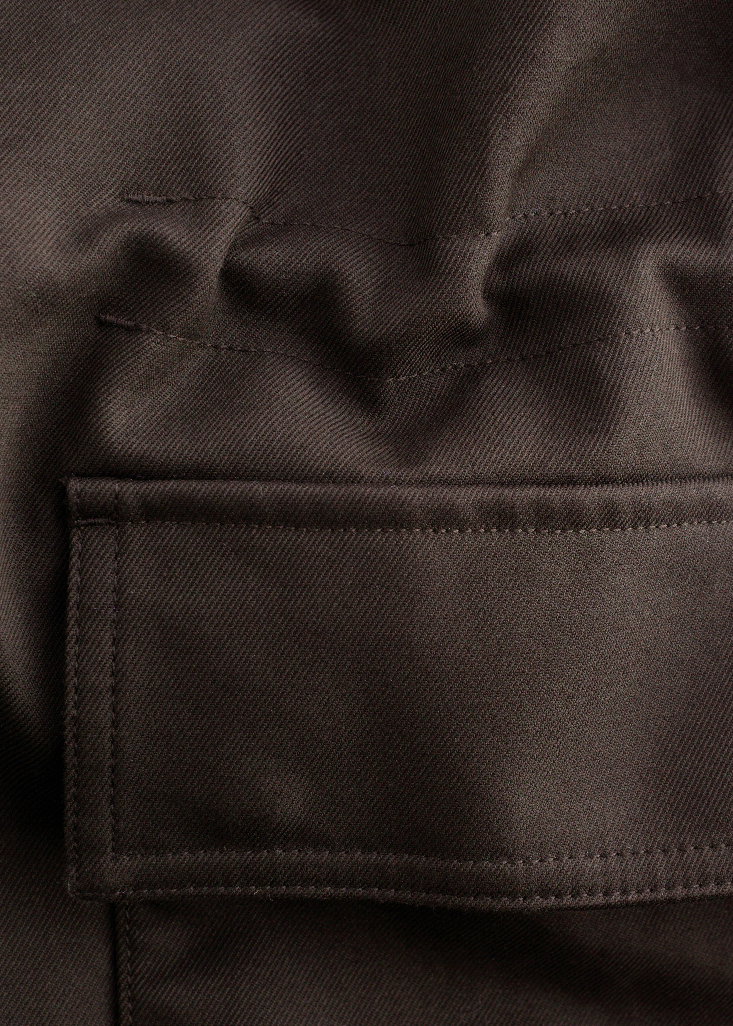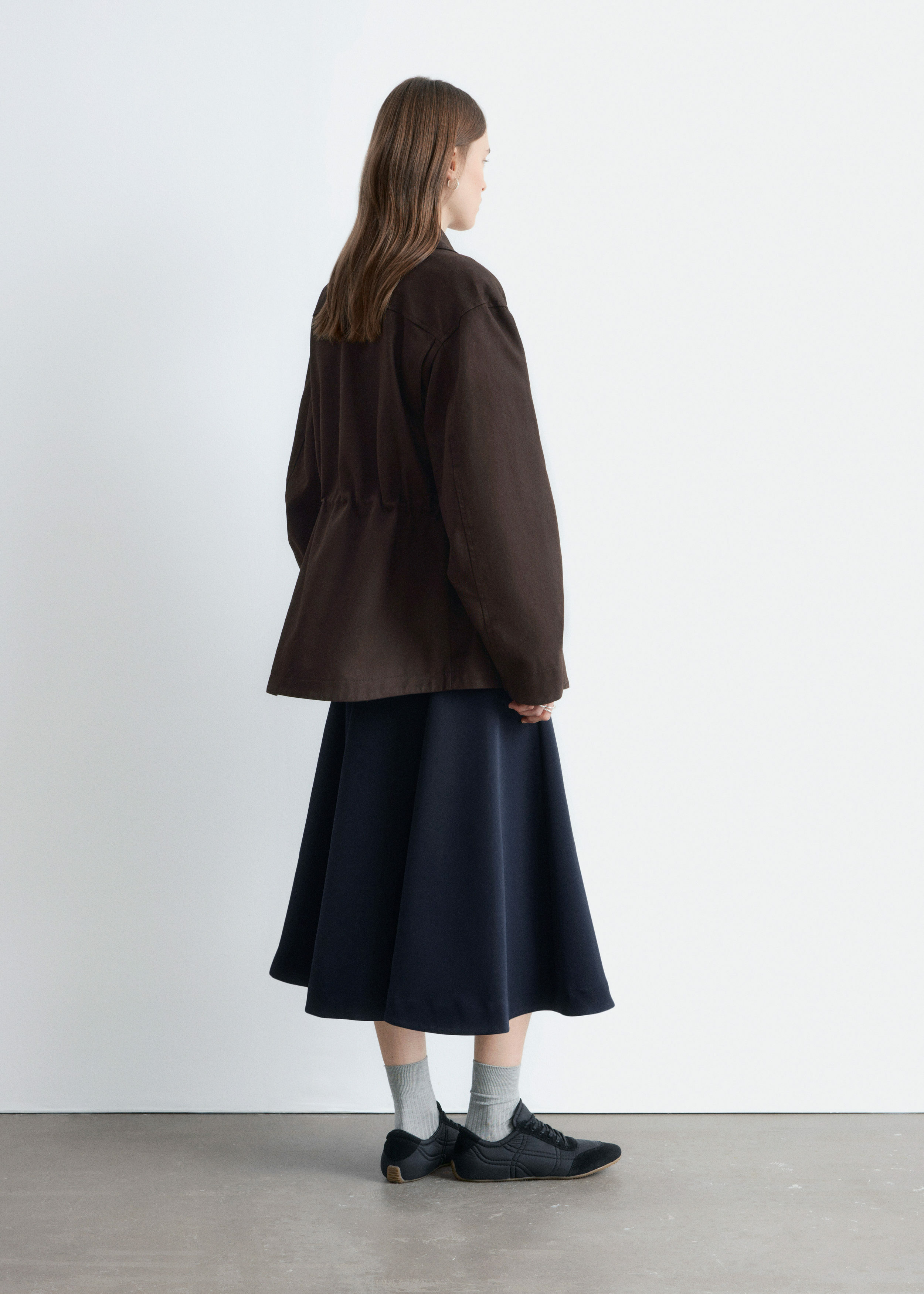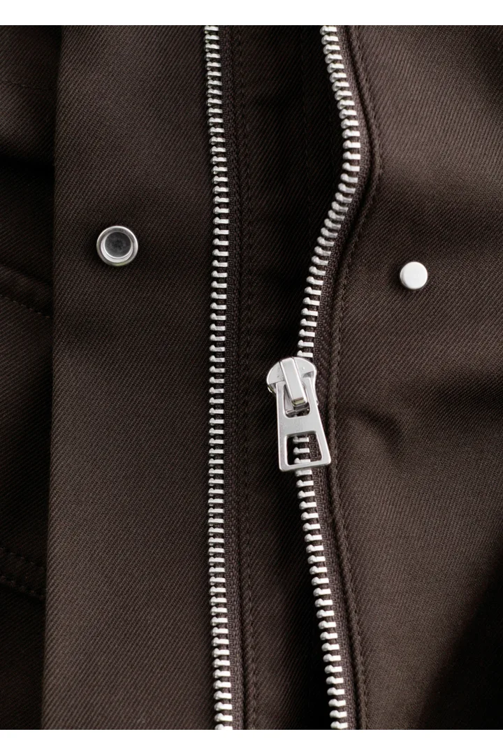 탄탄한 트윌 코튼 소재의 오버사이즈 자켓이에요. 클래식 카라, 2개의 큼직한 패치 포켓, 컨실드 지퍼 플래킷, 프레스 단추가 자리해 있으며 허리의 이너 드로스트링을 조여 구조적인 실루엣을 연출할 수 있답니다.