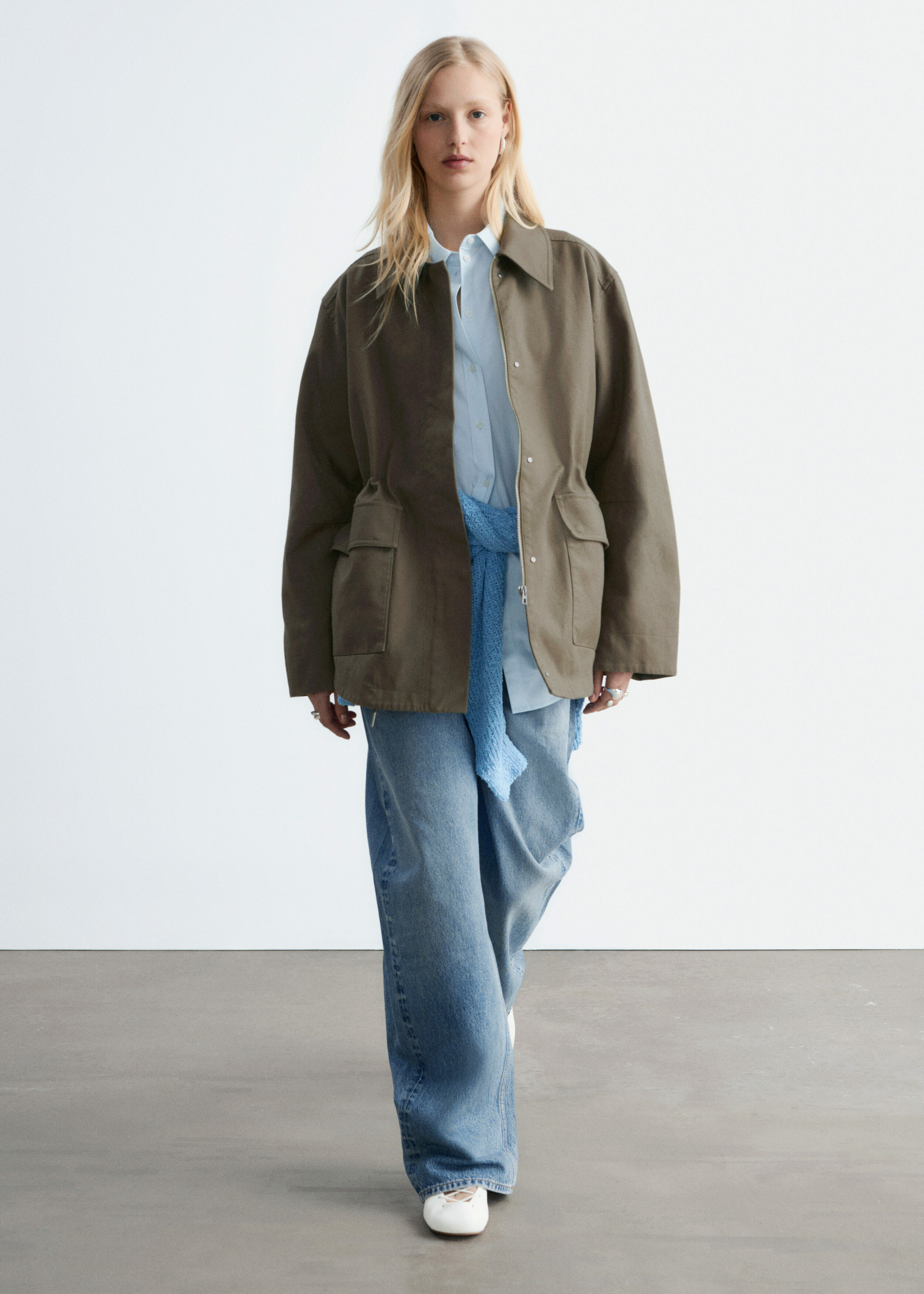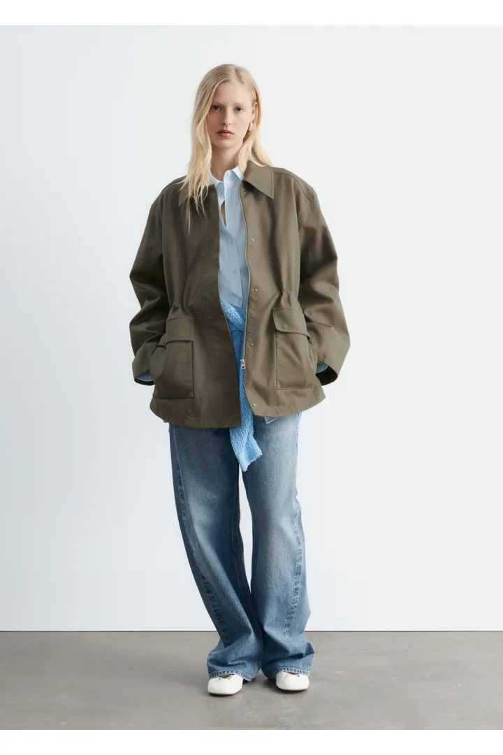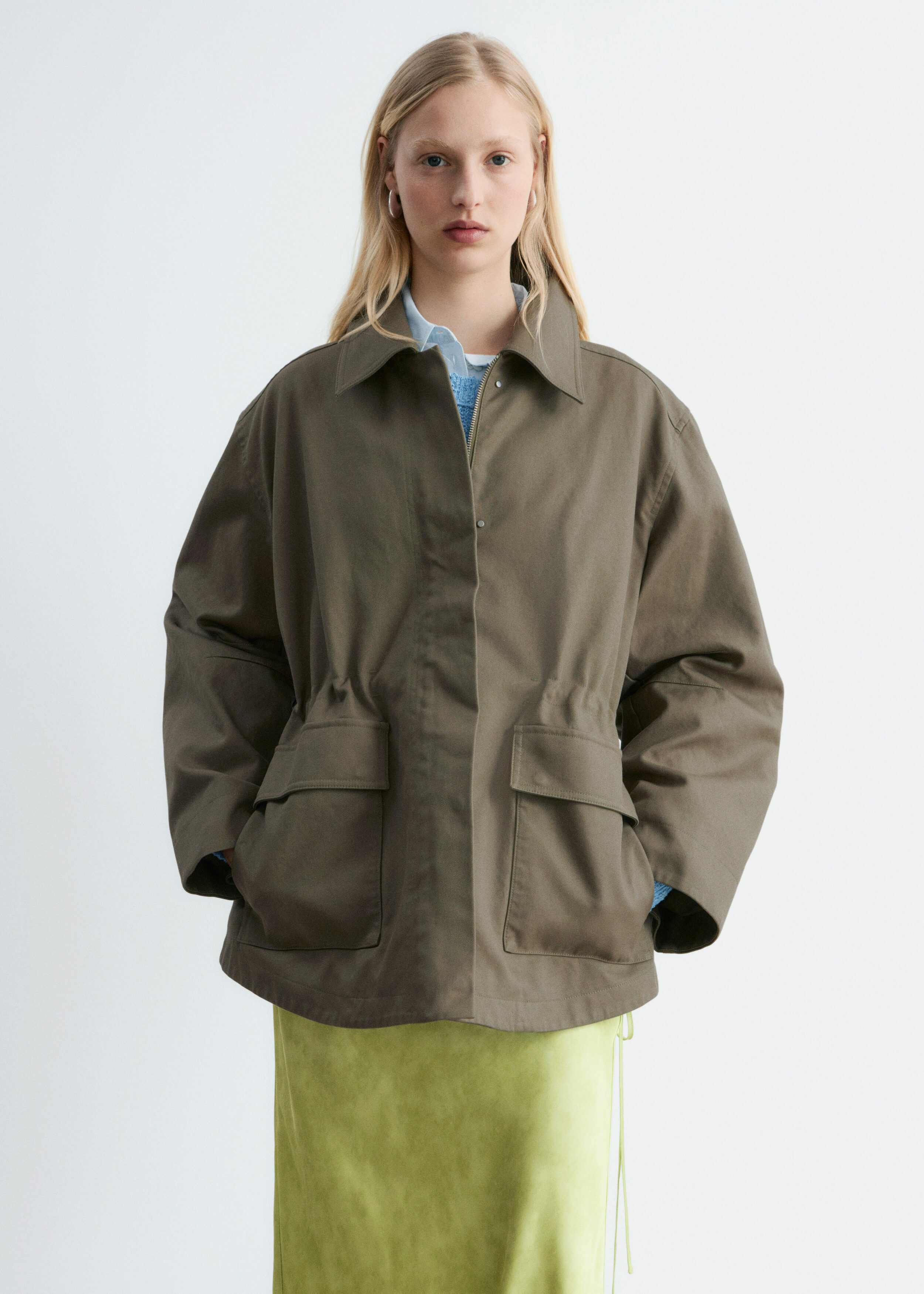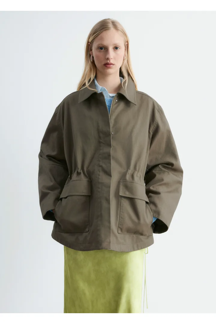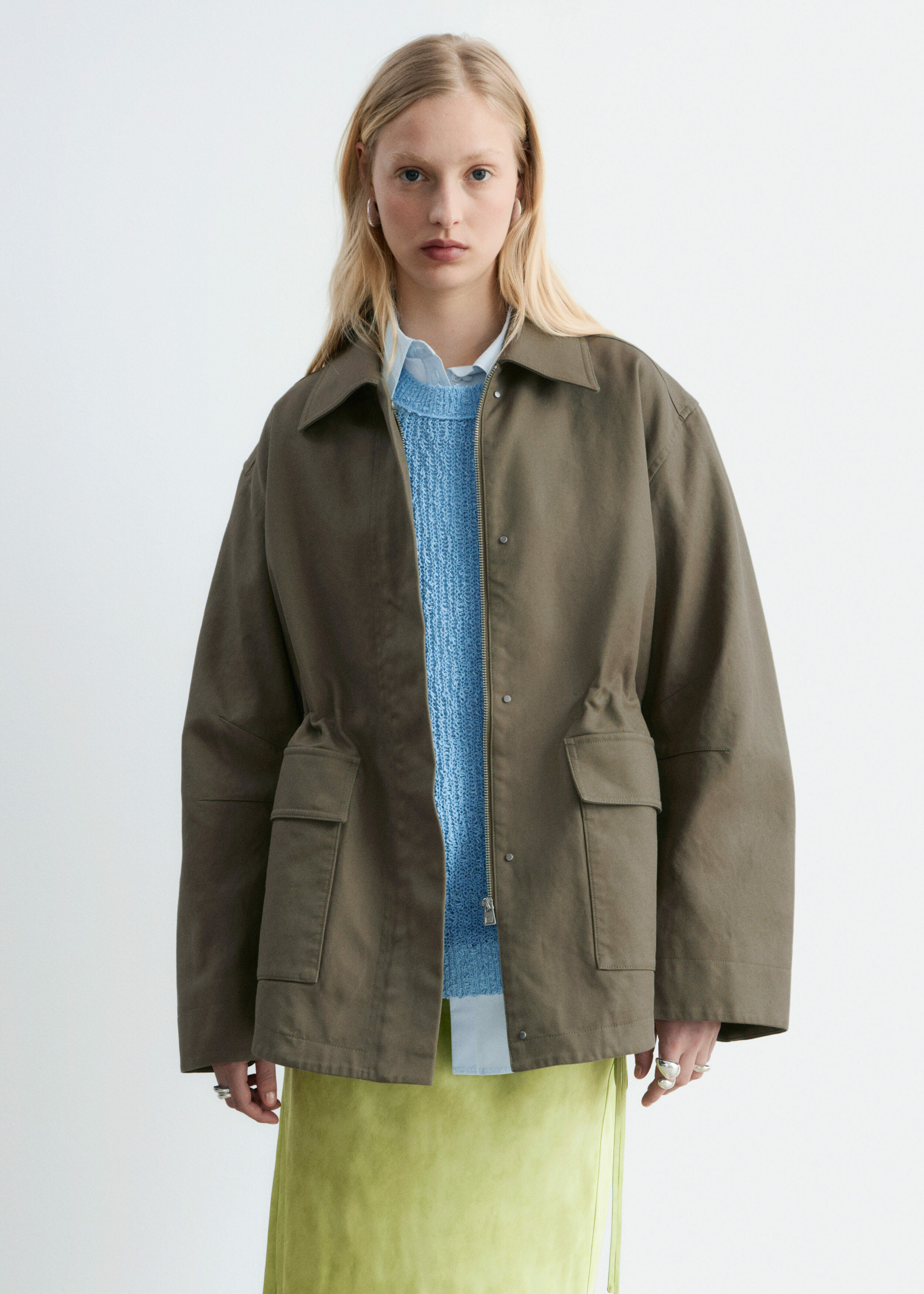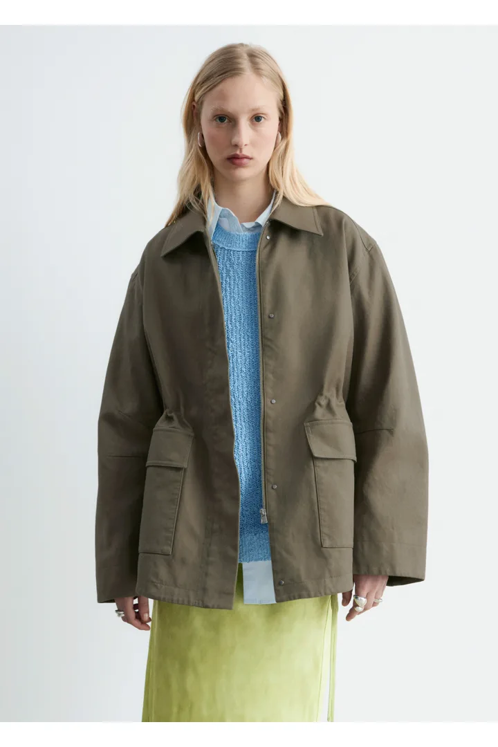 탄탄한 트윌 코튼 소재의 오버사이즈 자켓이에요. 클래식 카라, 2개의 큼직한 패치 포켓, 컨실드 지퍼 플래킷, 프레스 단추가 자리해 있으며 허리의 이너 드로스트링을 조여 구조적인 실루엣을 연출할 수 있답니다.