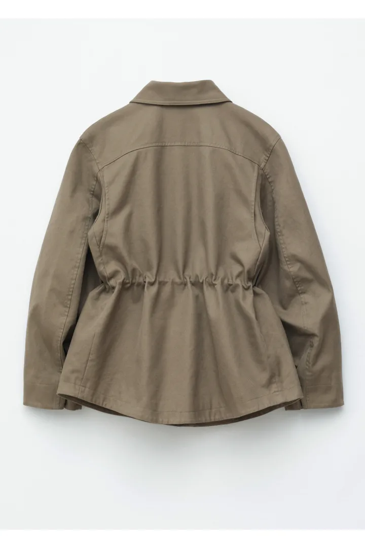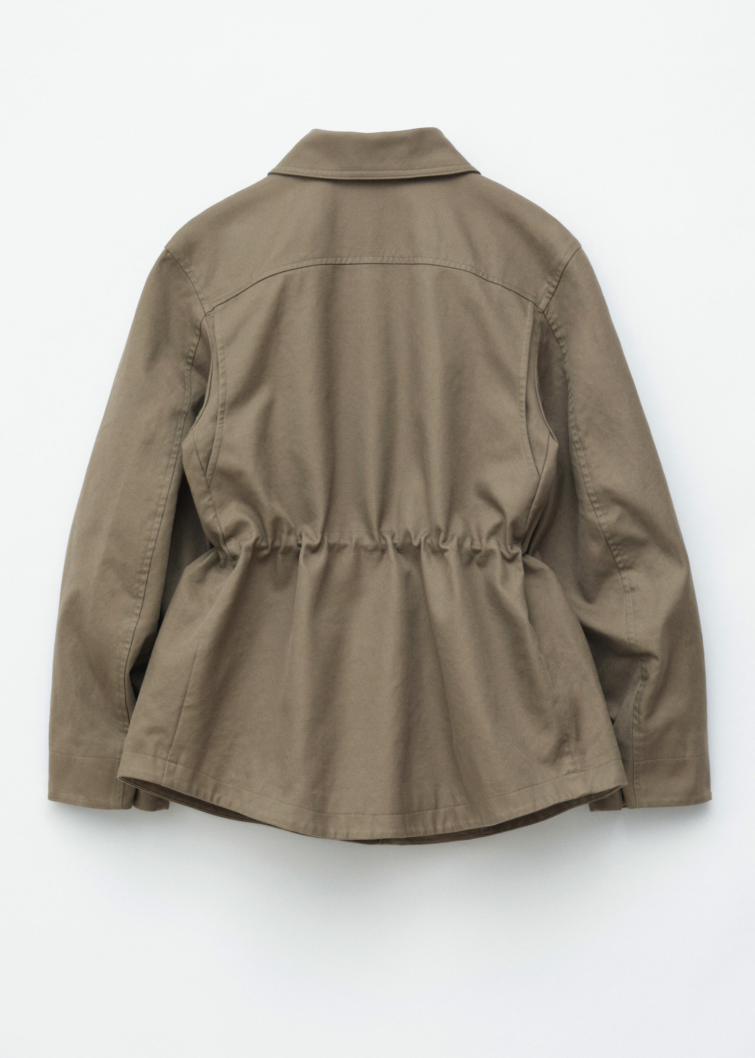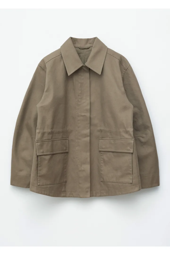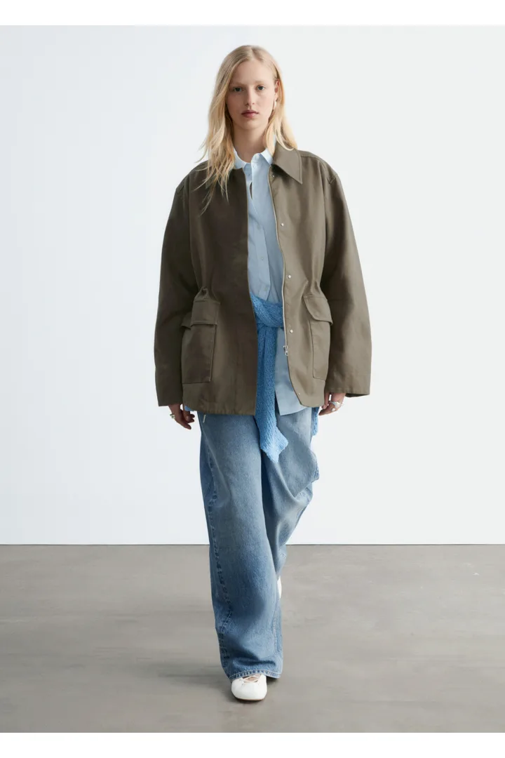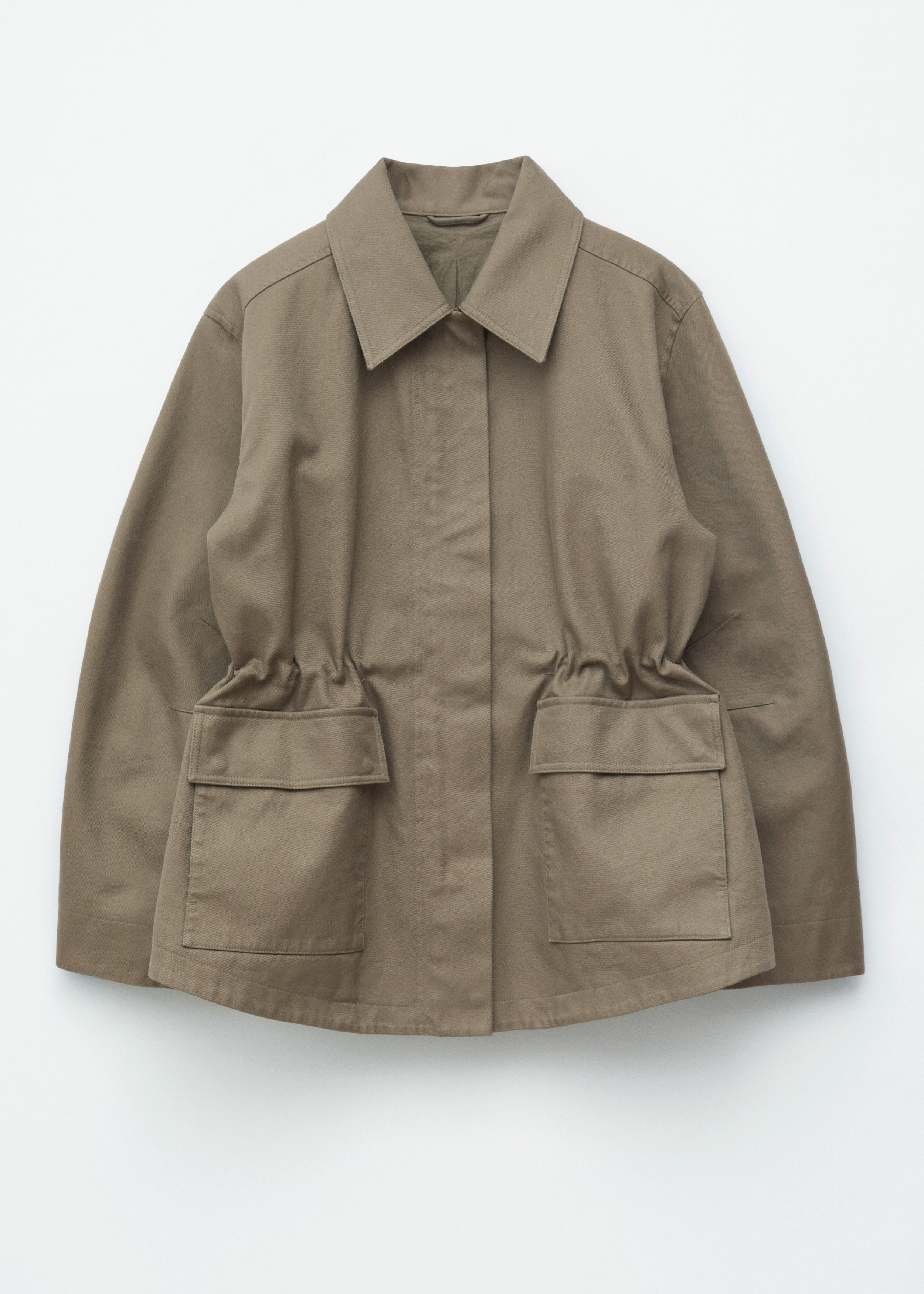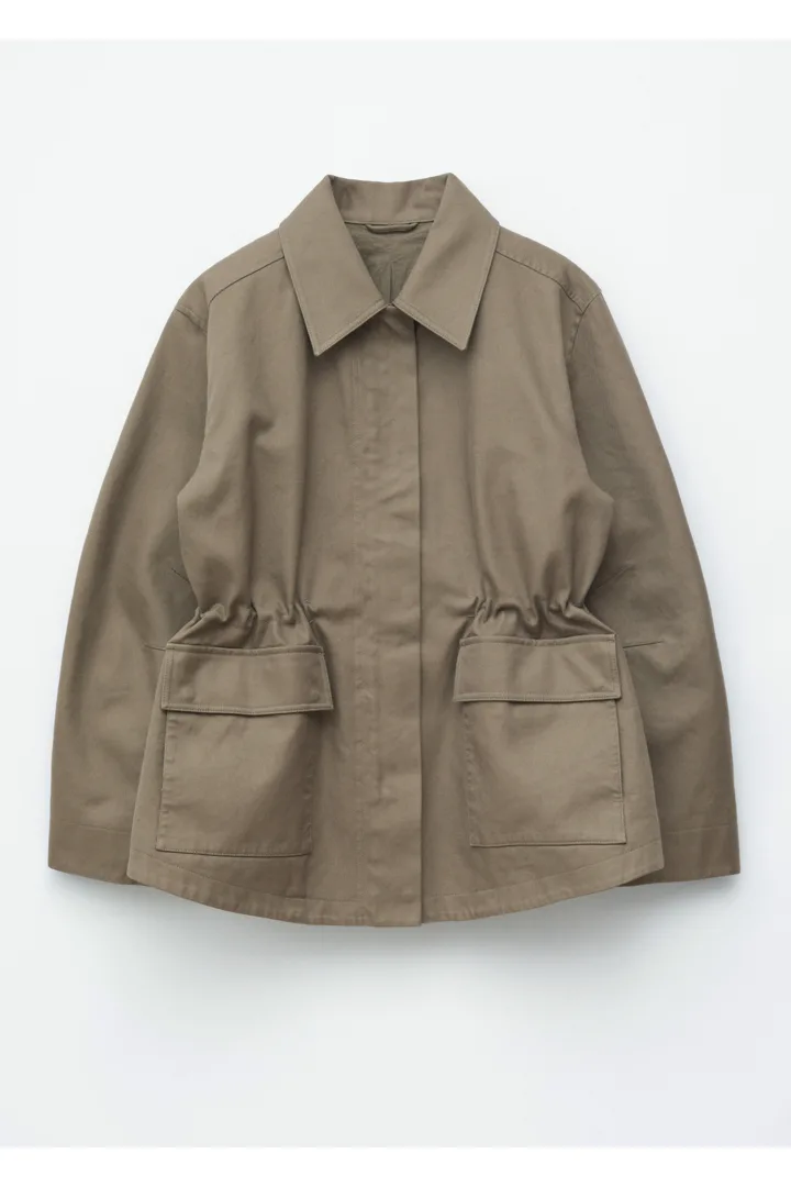 탄탄한 트윌 코튼 소재의 오버사이즈 자켓이에요. 클래식 카라, 2개의 큼직한 패치 포켓, 컨실드 지퍼 플래킷, 프레스 단추가 자리해 있으며 허리의 이너 드로스트링을 조여 구조적인 실루엣을 연출할 수 있답니다.