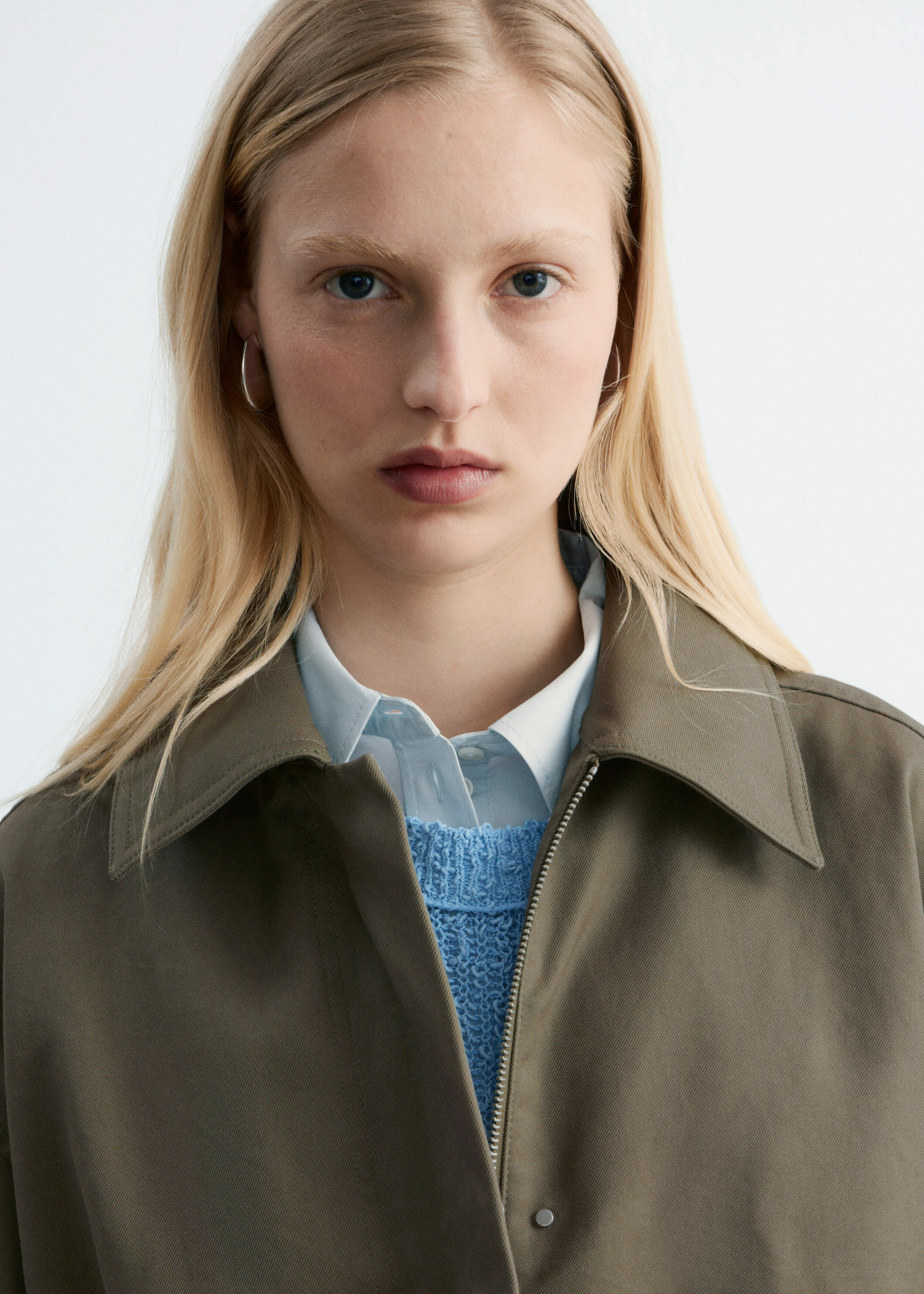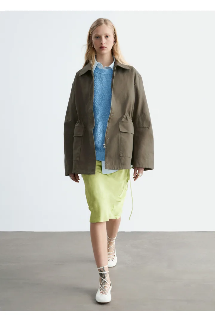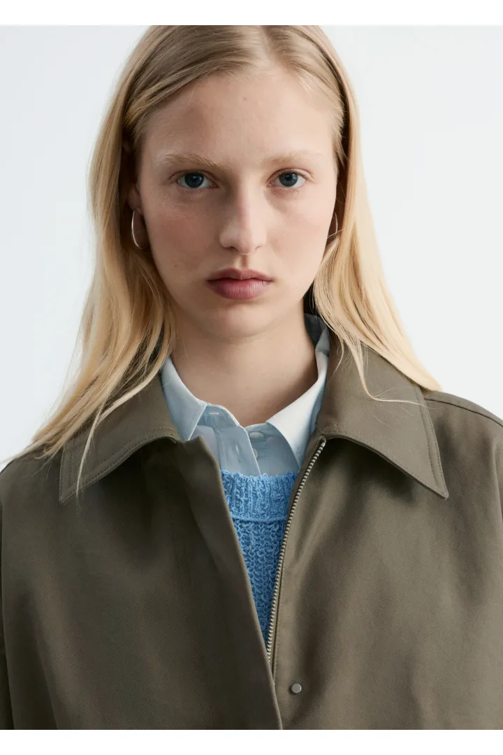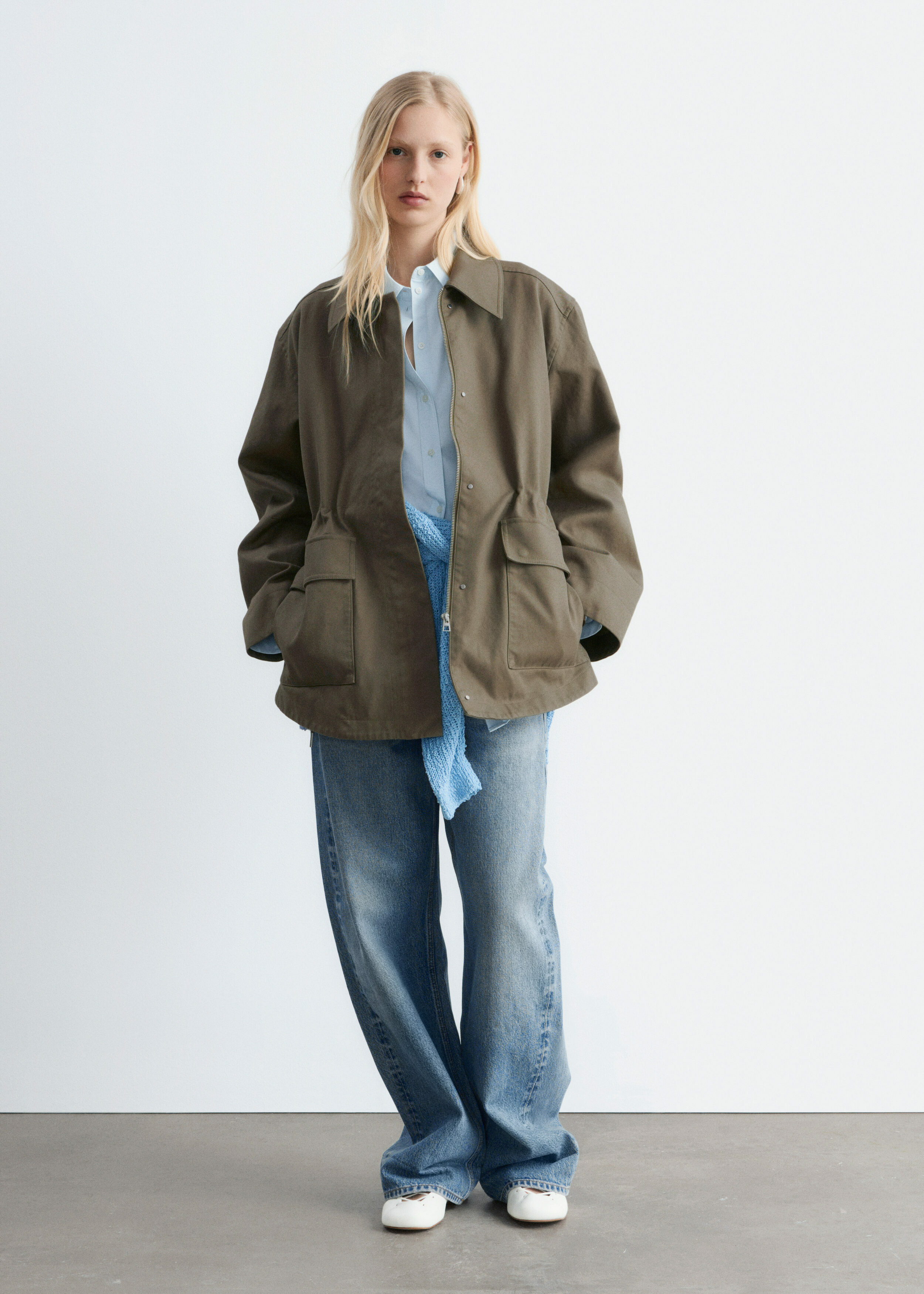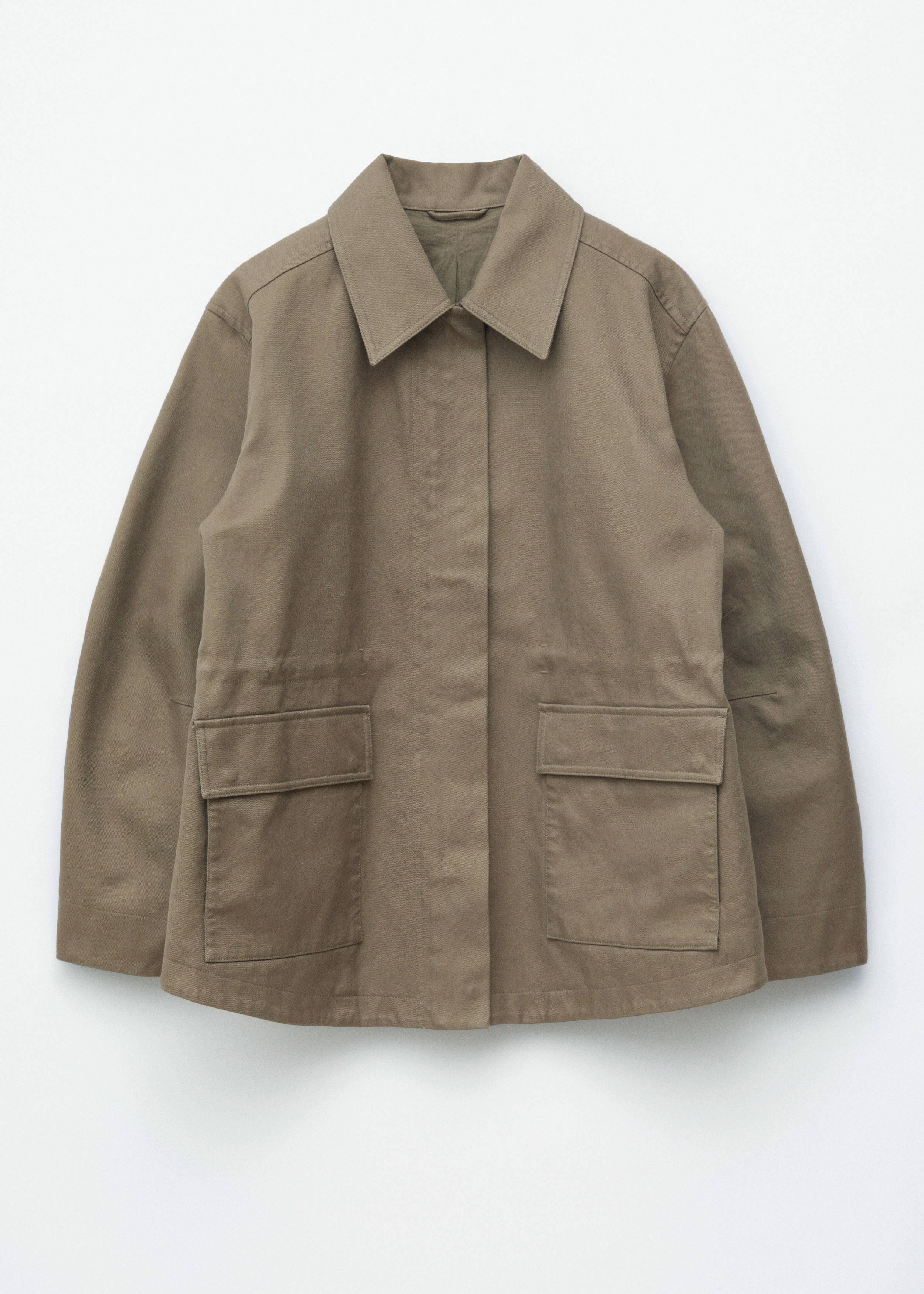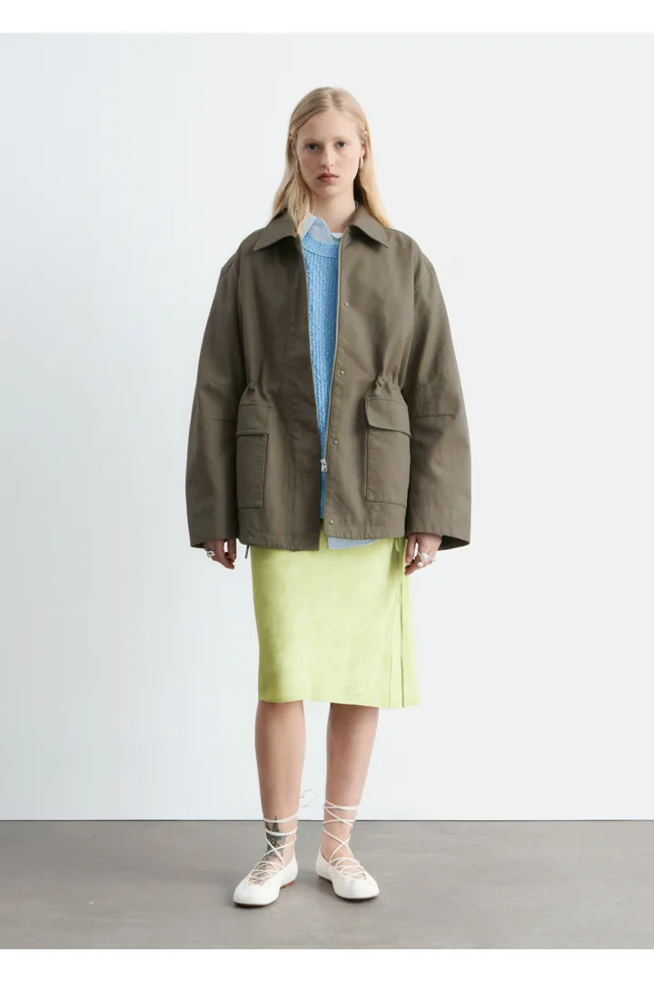 탄탄한 트윌 코튼 소재의 오버사이즈 자켓이에요. 클래식 카라, 2개의 큼직한 패치 포켓, 컨실드 지퍼 플래킷, 프레스 단추가 자리해 있으며 허리의 이너 드로스트링을 조여 구조적인 실루엣을 연출할 수 있답니다.