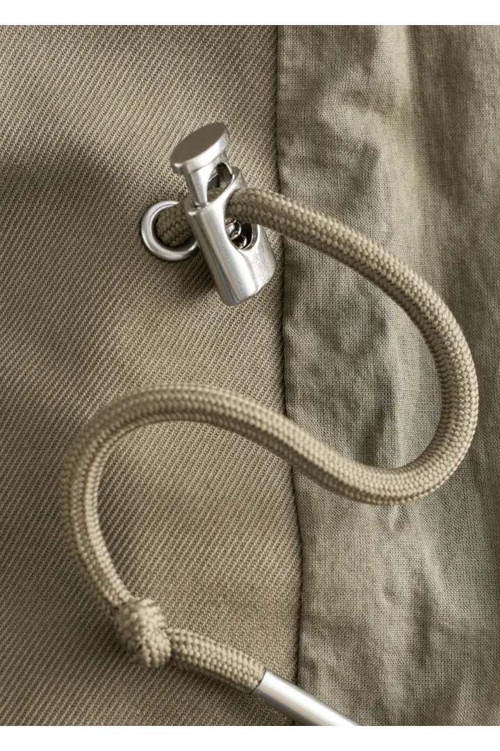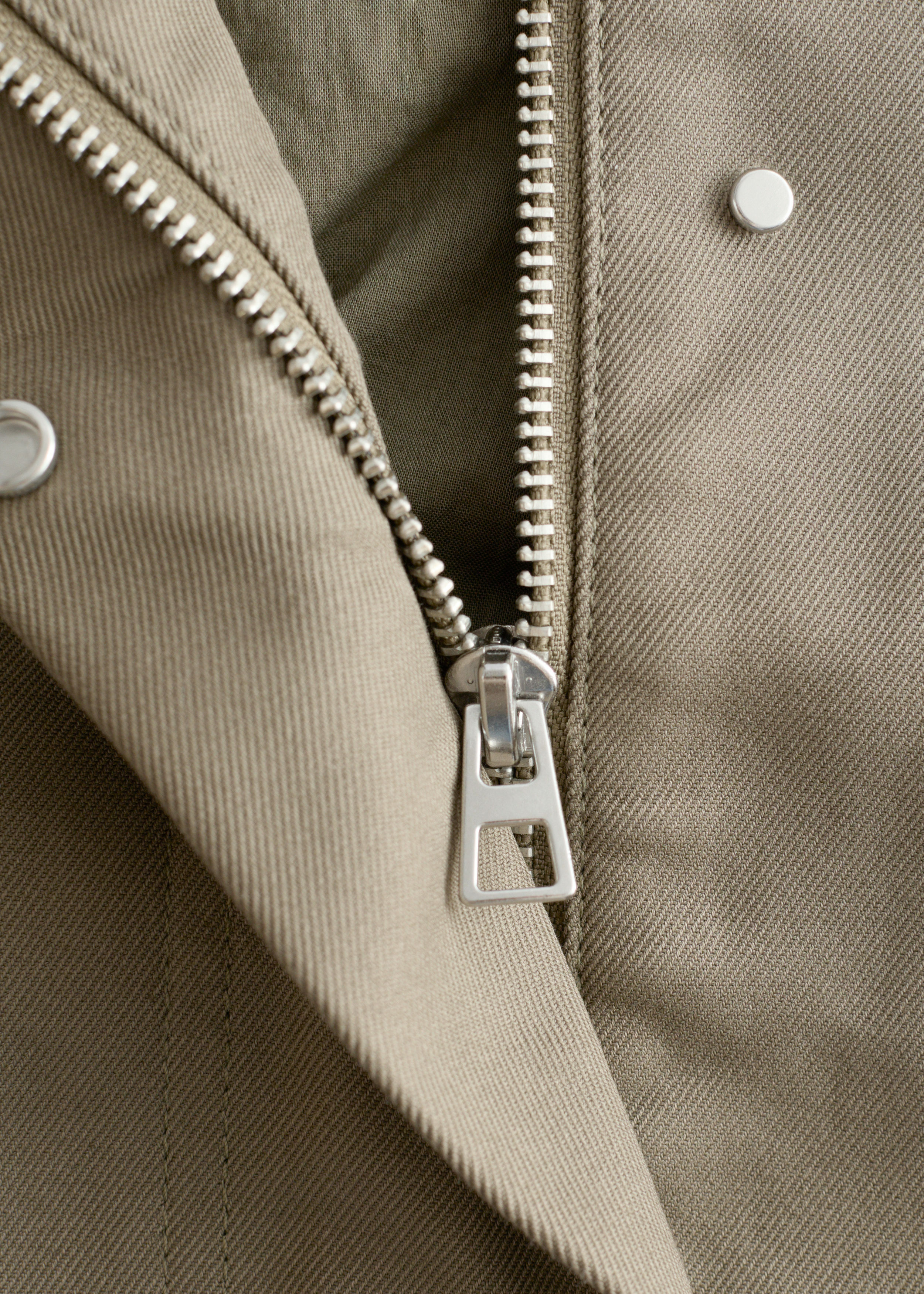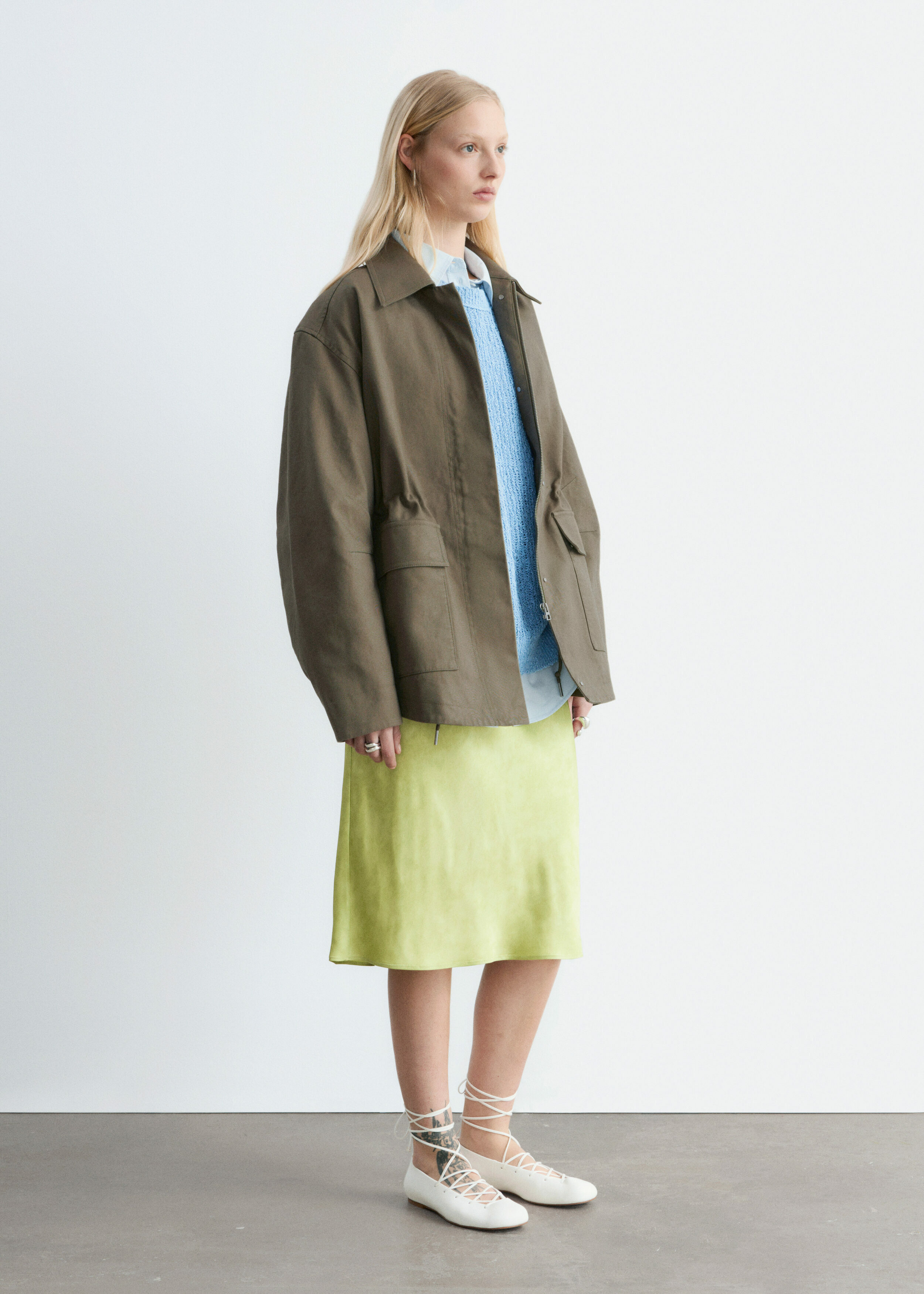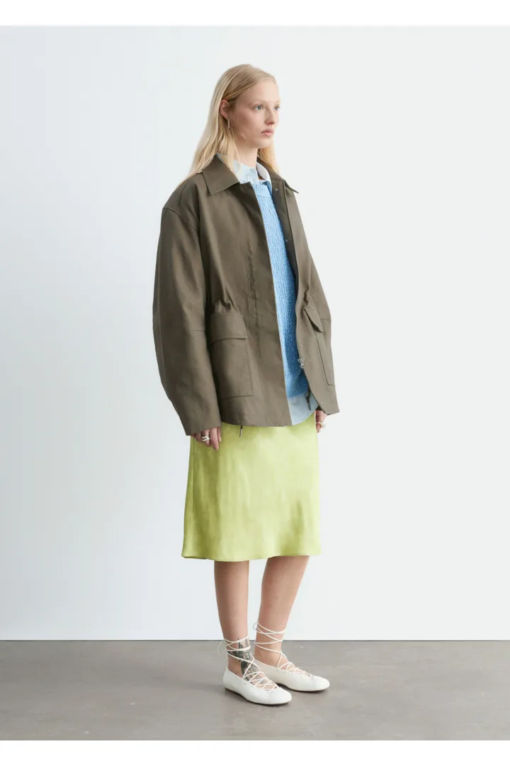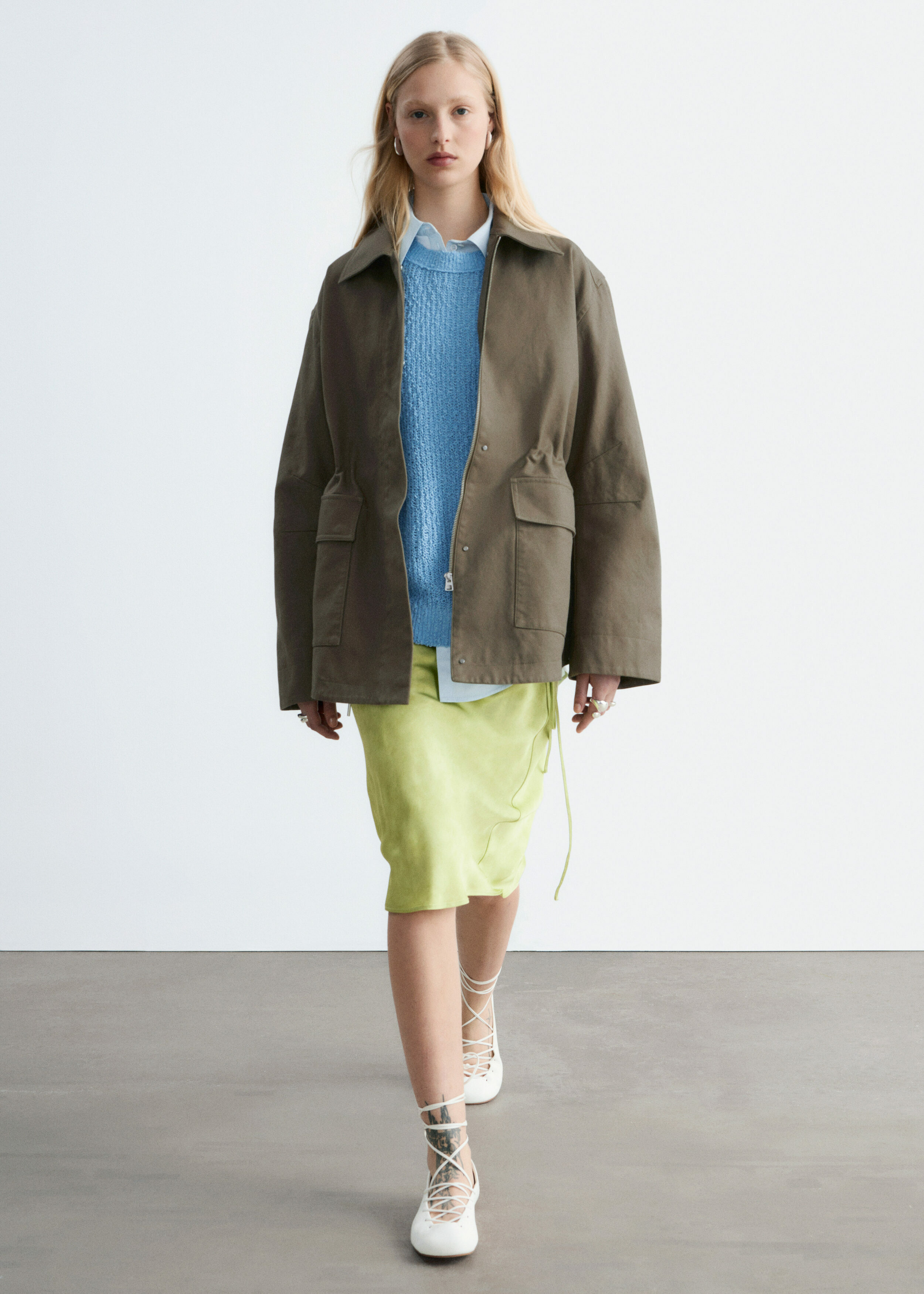 탄탄한 트윌 코튼 소재의 오버사이즈 자켓이에요. 클래식 카라, 2개의 큼직한 패치 포켓, 컨실드 지퍼 플래킷, 프레스 단추가 자리해 있으며 허리의 이너 드로스트링을 조여 구조적인 실루엣을 연출할 수 있답니다.