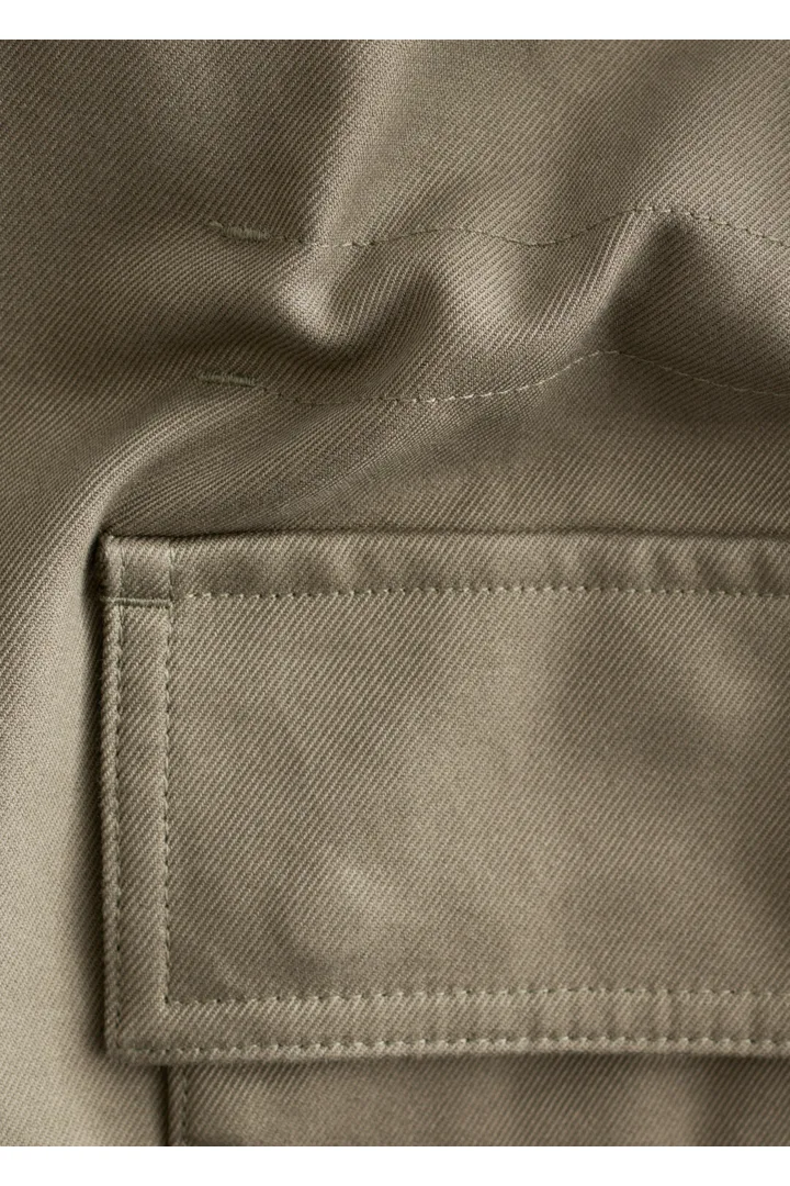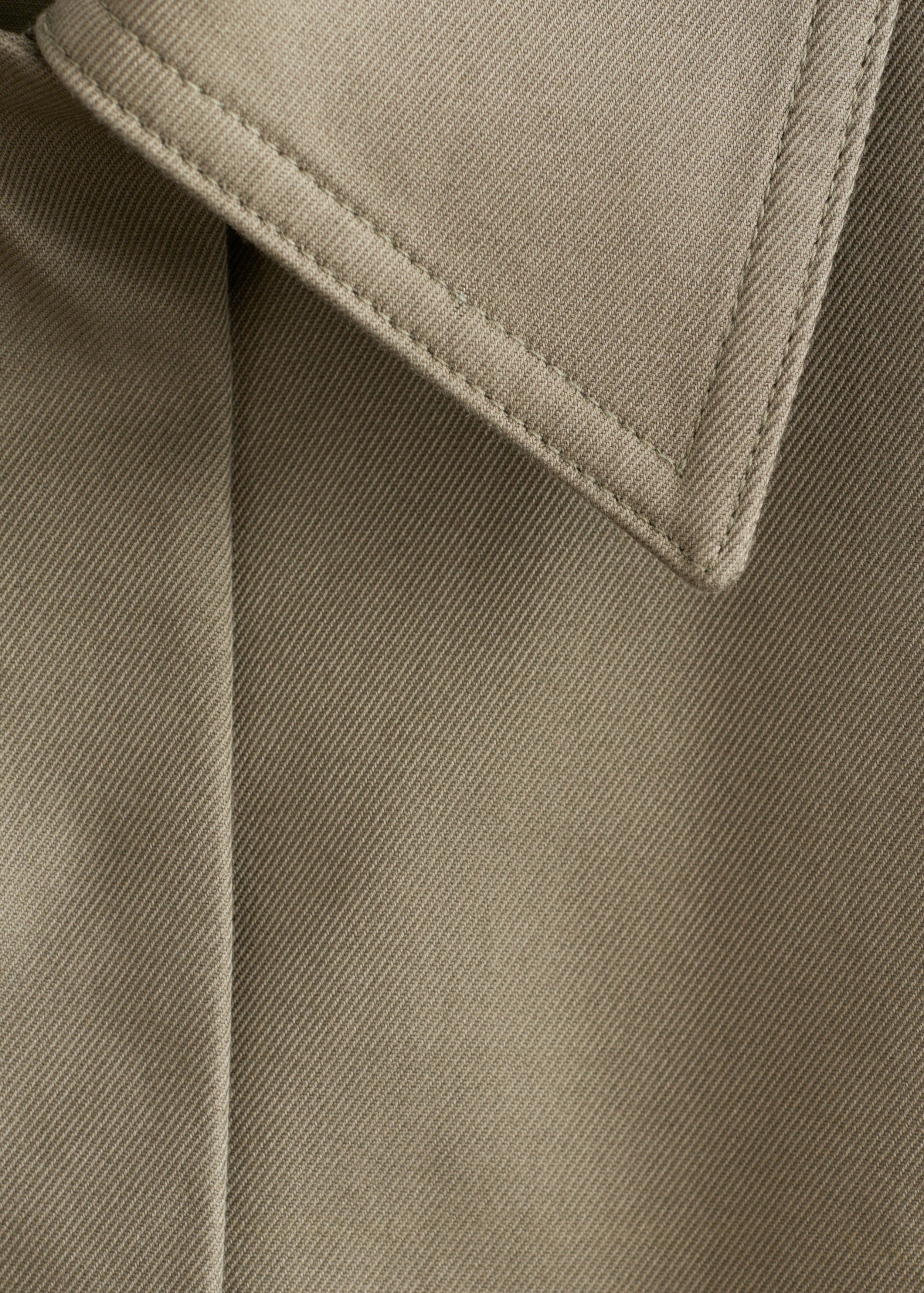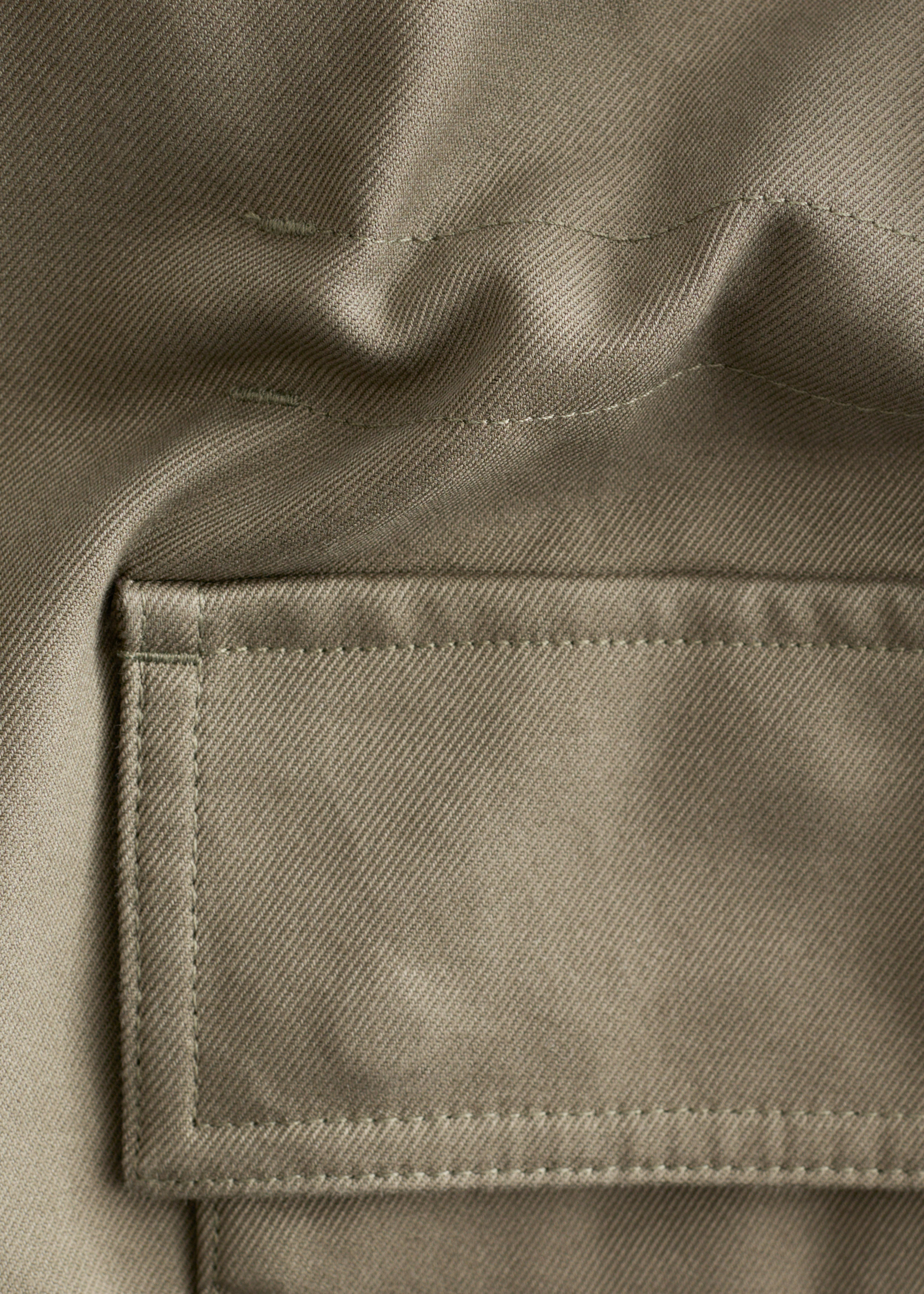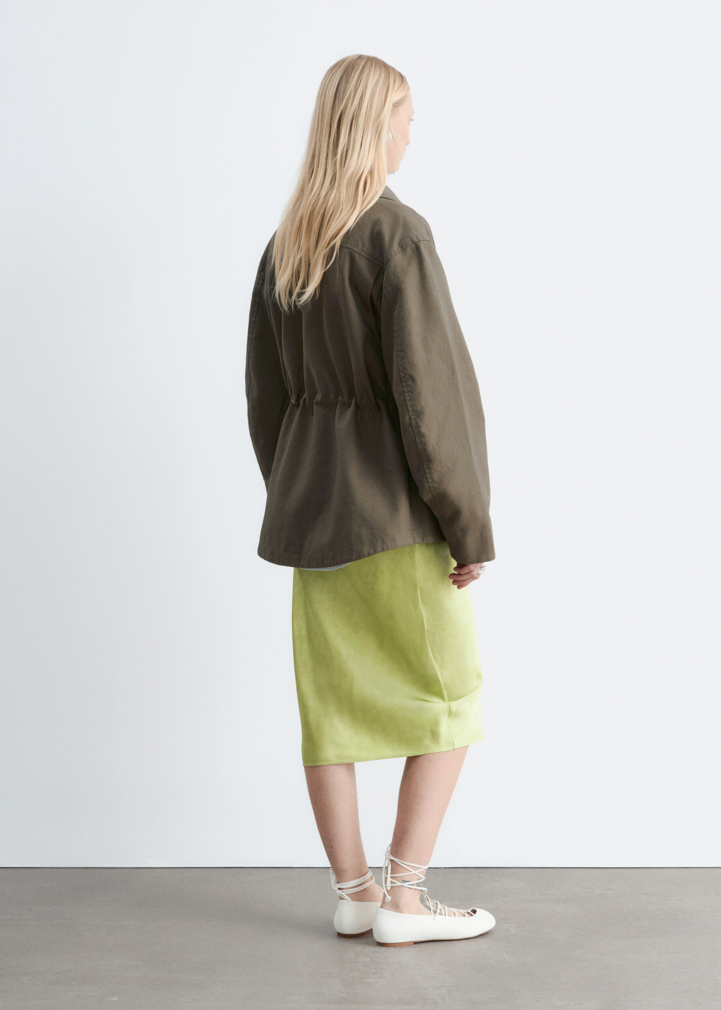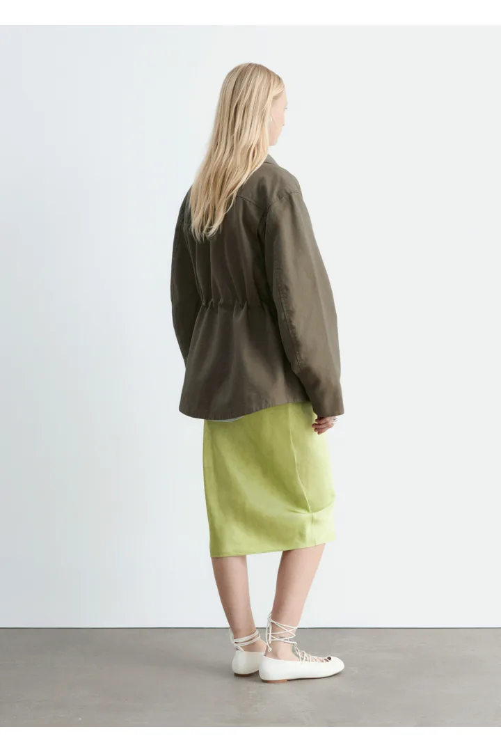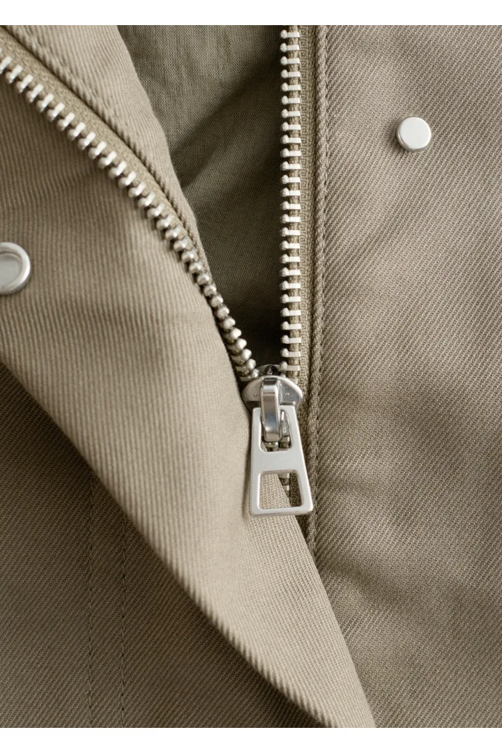 탄탄한 트윌 코튼 소재의 오버사이즈 자켓이에요. 클래식 카라, 2개의 큼직한 패치 포켓, 컨실드 지퍼 플래킷, 프레스 단추가 자리해 있으며 허리의 이너 드로스트링을 조여 구조적인 실루엣을 연출할 수 있답니다.