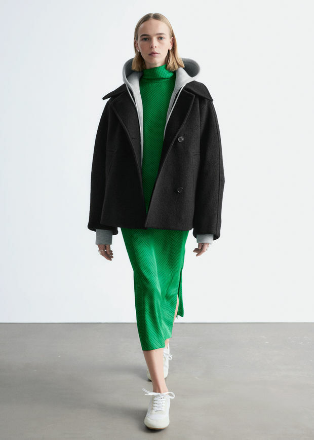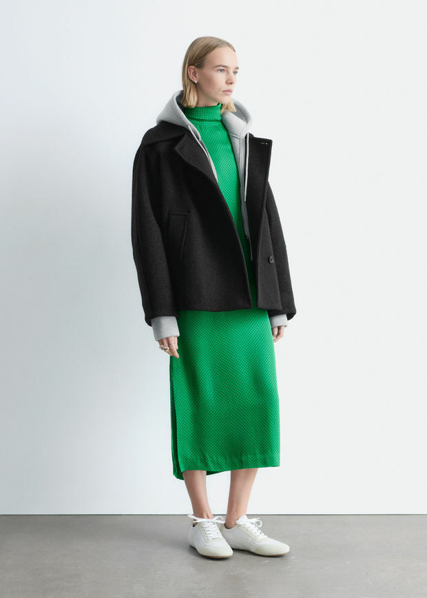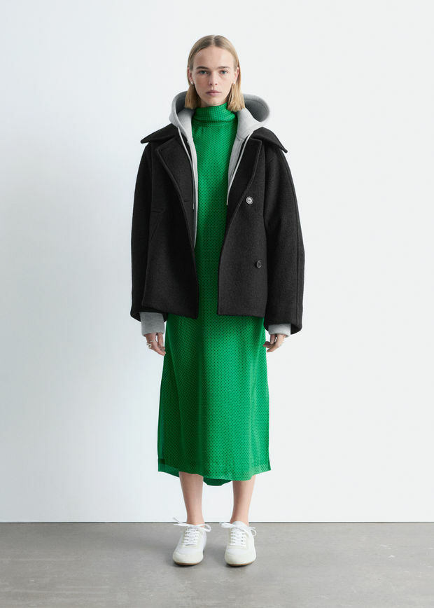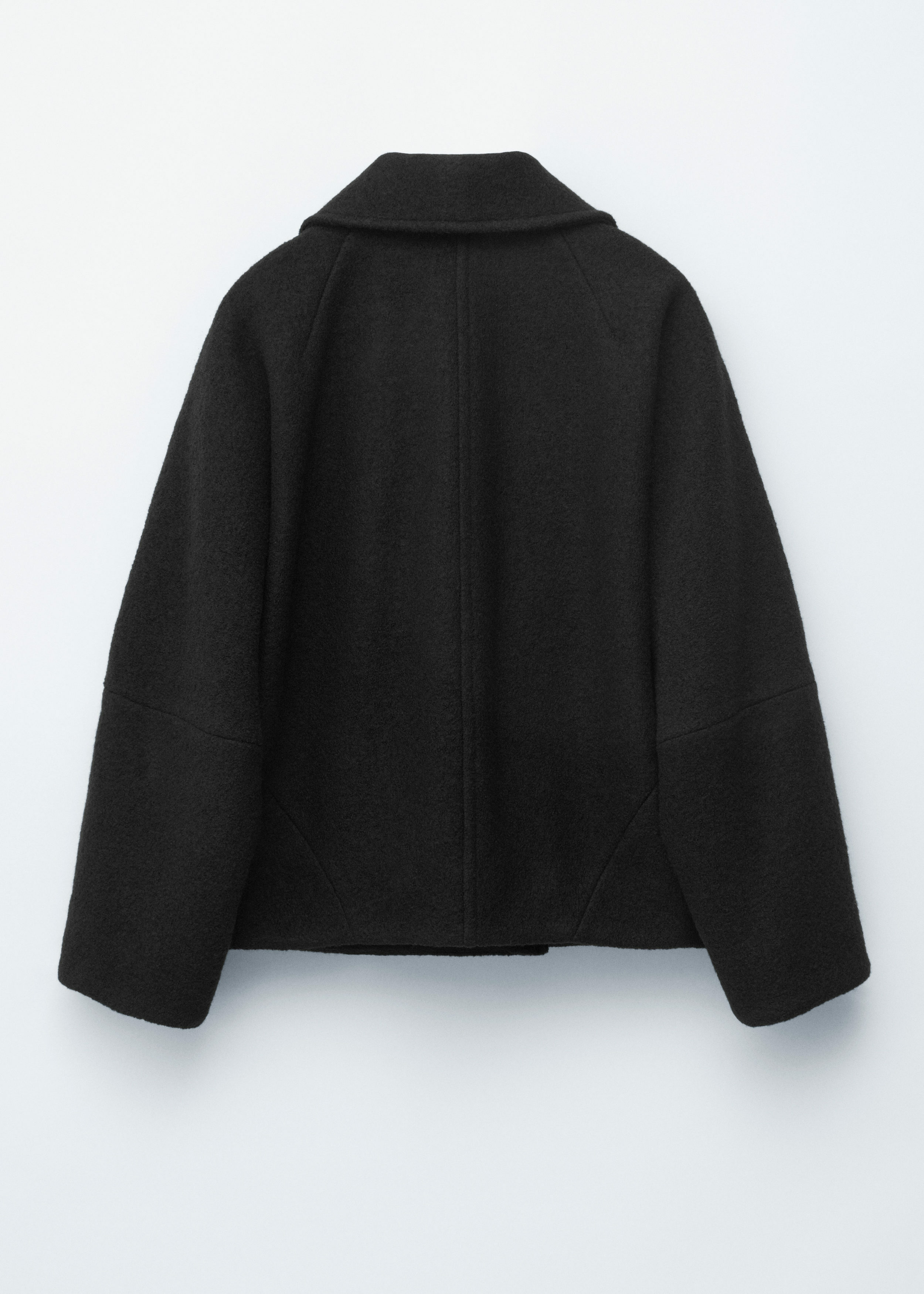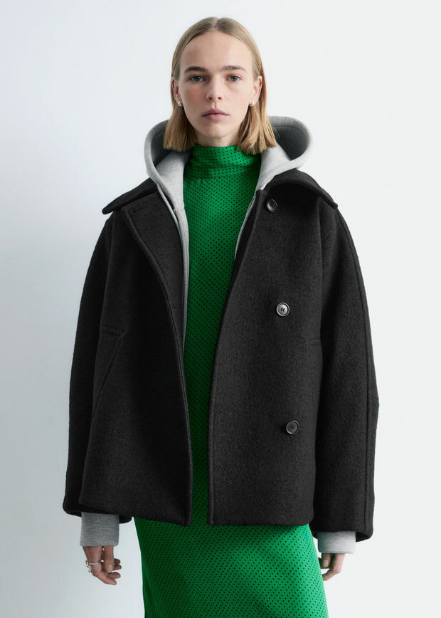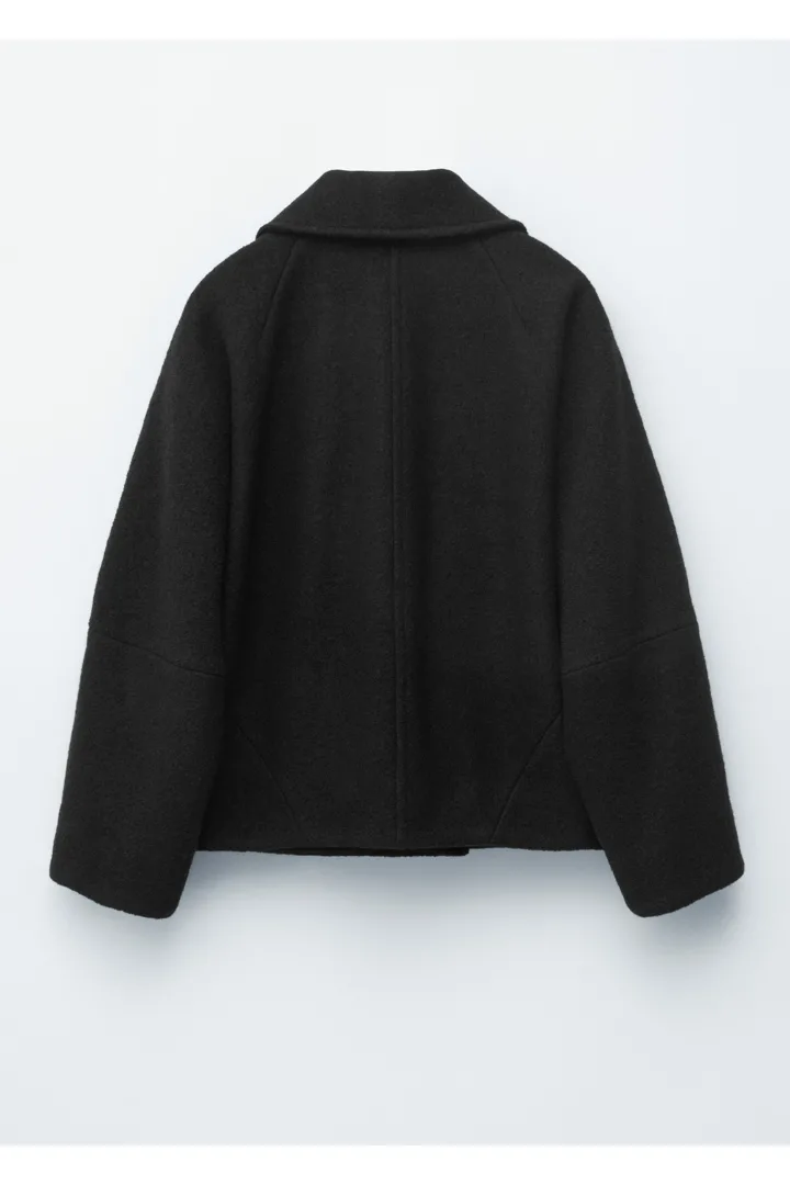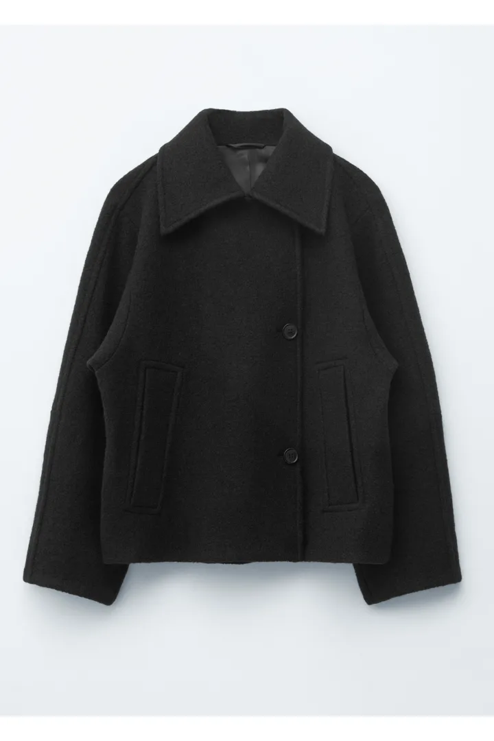오버사이즈 실루엣의 울 자켓이에요. 여밈부의 오프셋 버튼, 큼직한 카라, 그리고 은은한 테이퍼드 슬리브의 커트라인 솔기가 특징이에요. 앞면부 웰트 포켓과 이너 포켓이 자리해 있답니다.