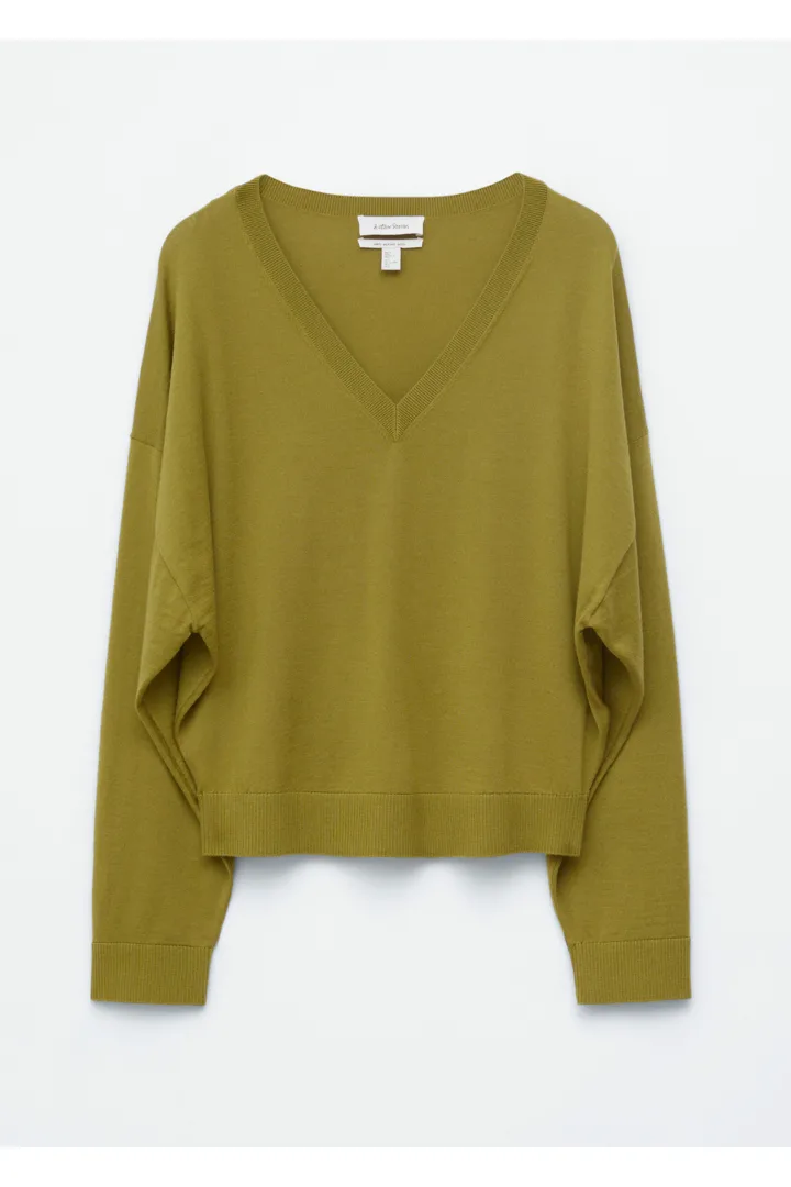 오버사이즈 & 박시 실루엣의 울 스웨터예요. 로우 드롭 숄더, 깊은 V 네크라인, 롱 & 테이퍼드 슬리브, 커프스, 립 트리밍이 자리해 있어요.