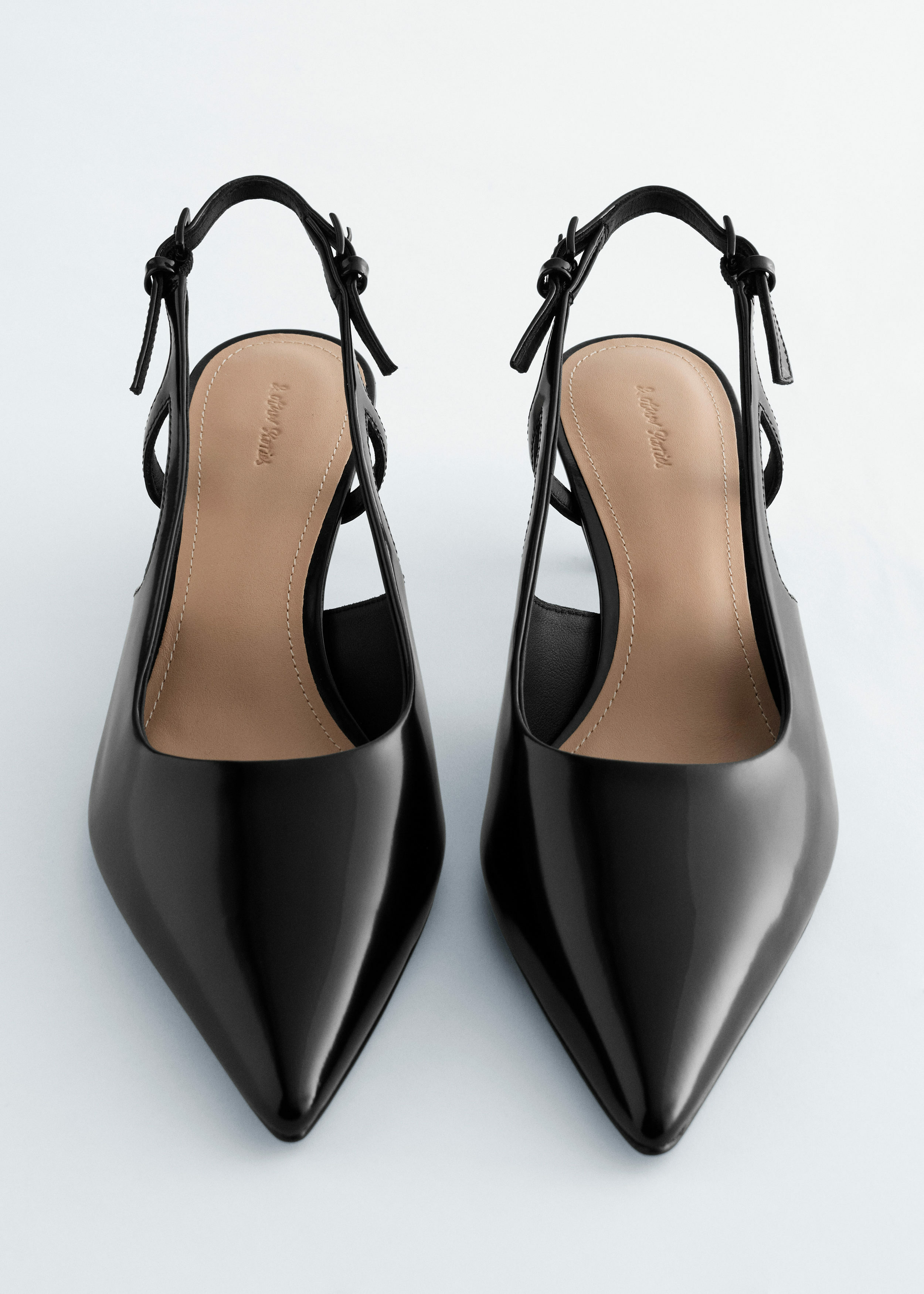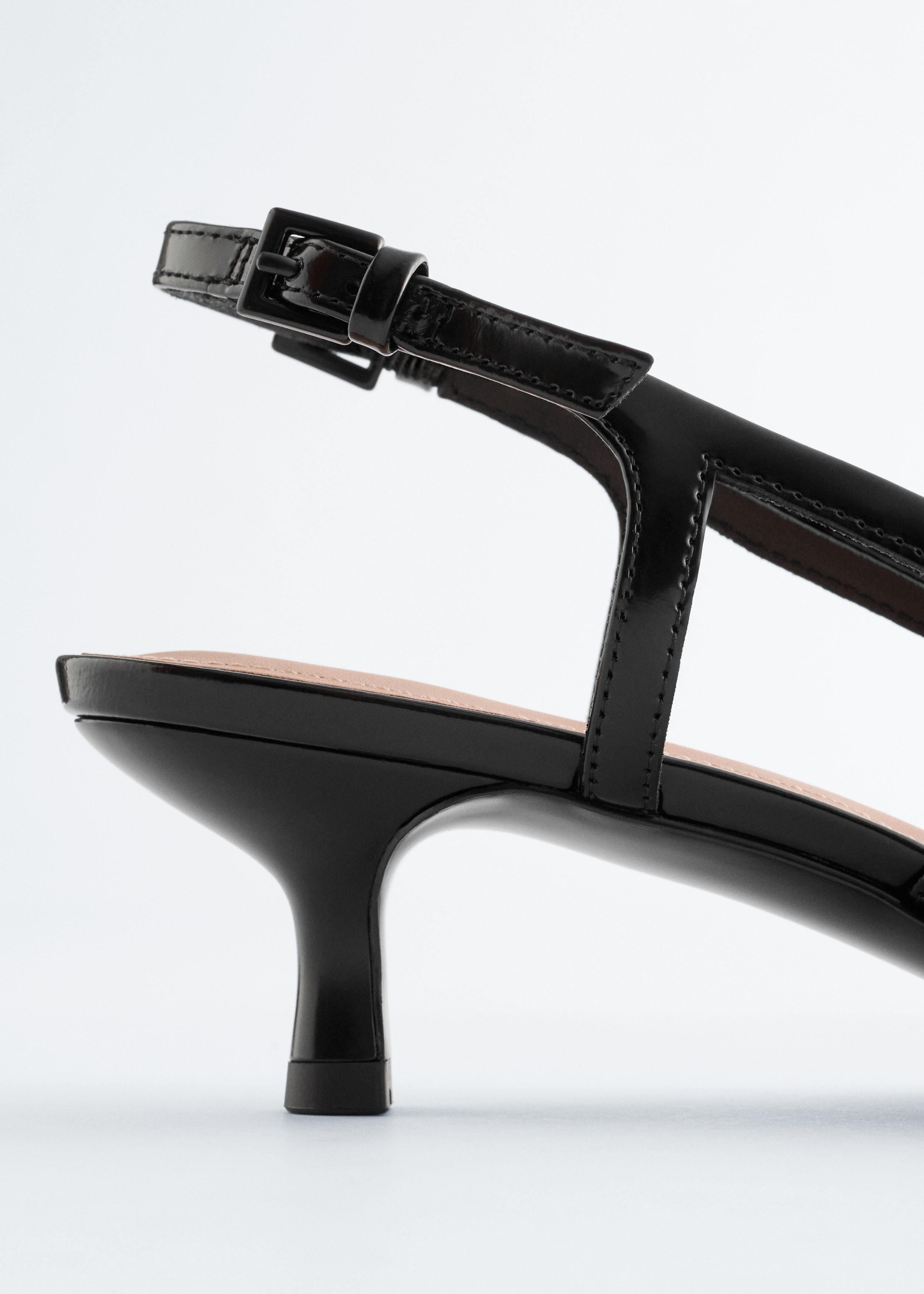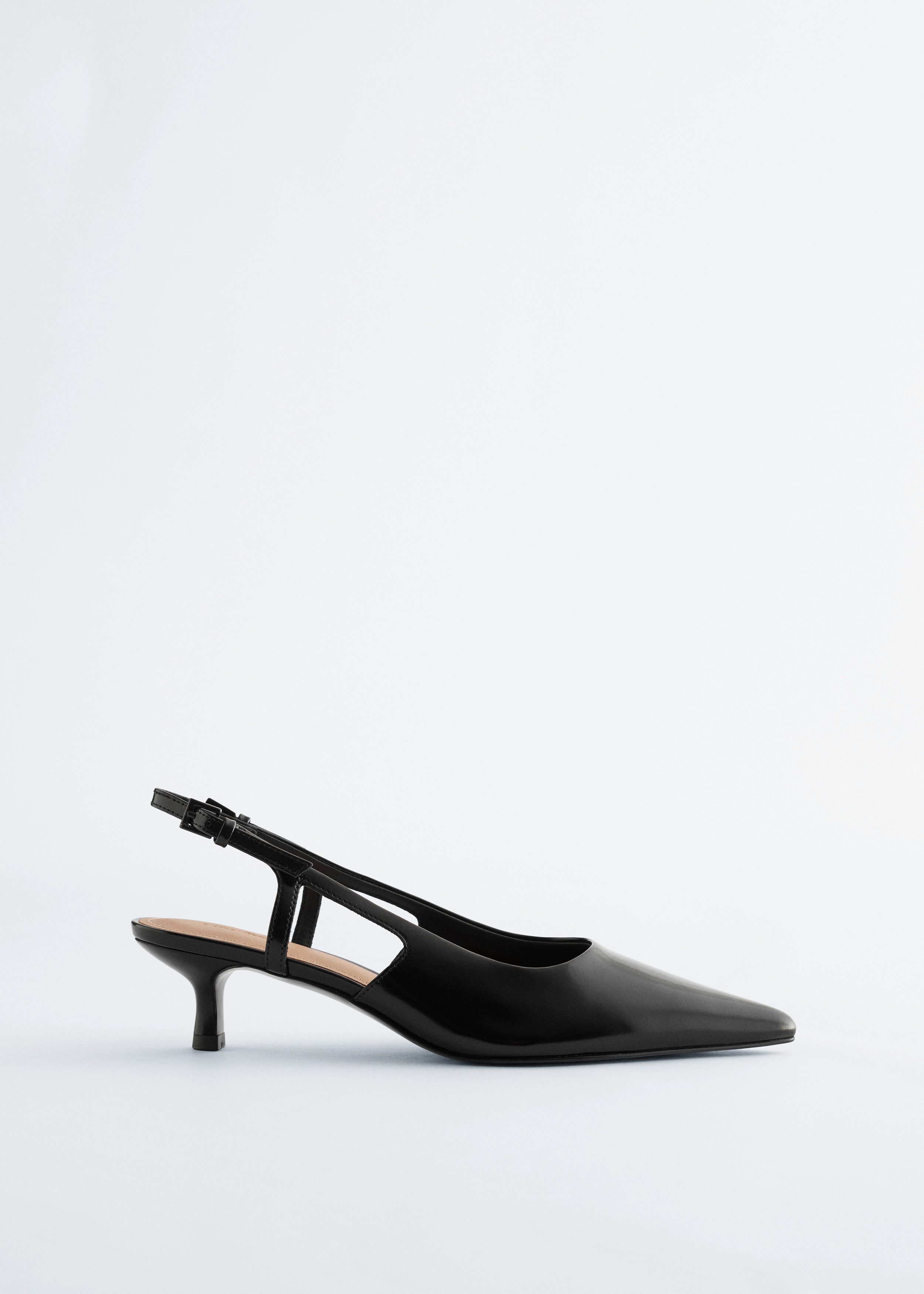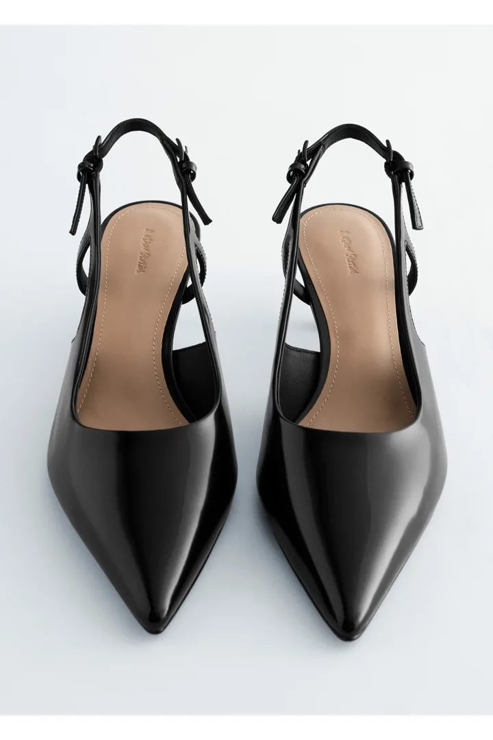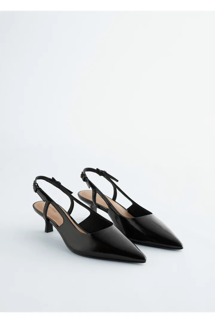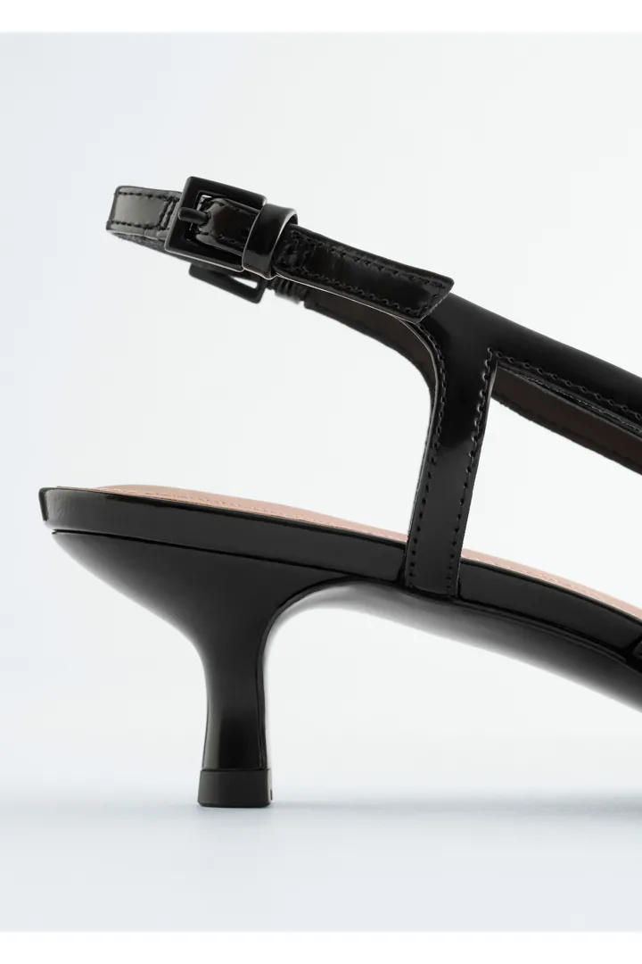 유광 페이턴트 레더 소재의 클래식 슬링백이에요. 포인트 앞코, 키튼 힐, 그리고 조절형 버클이 자리한 뒤꿈치의 슬림 스트랩이 특징이랍니다.