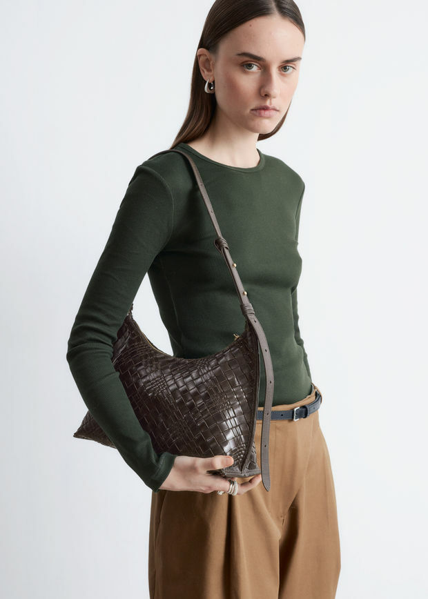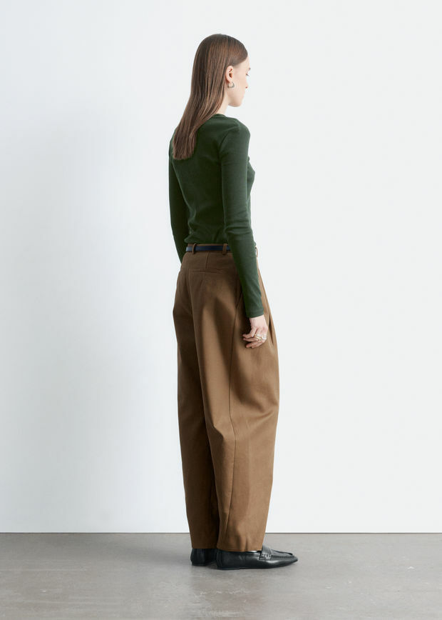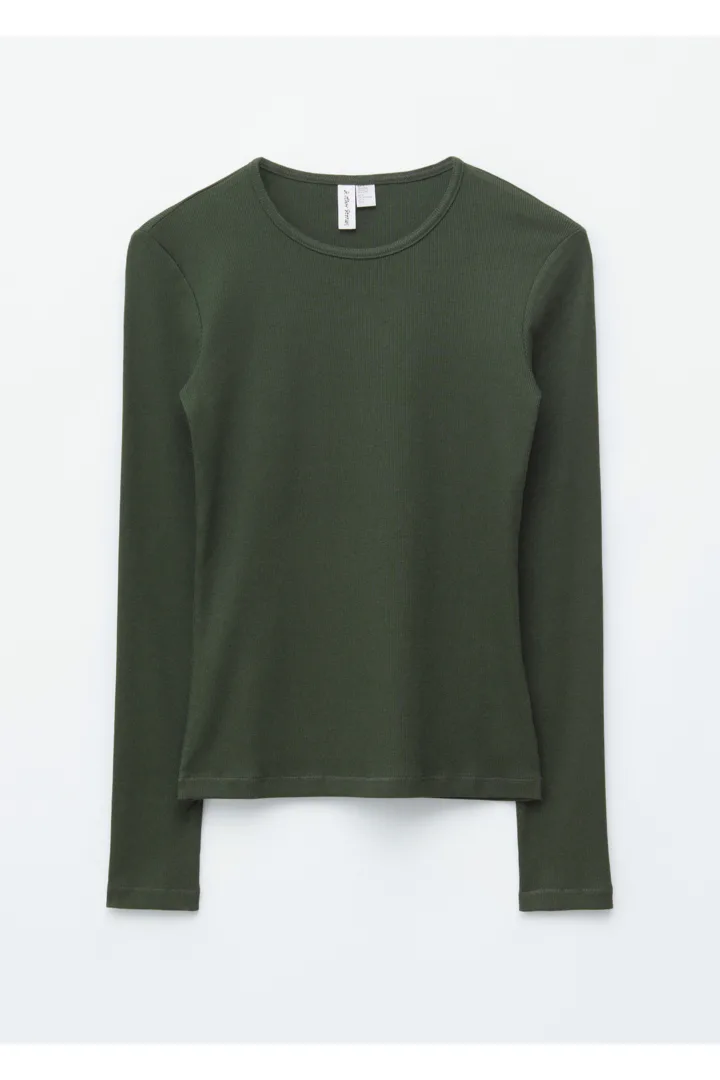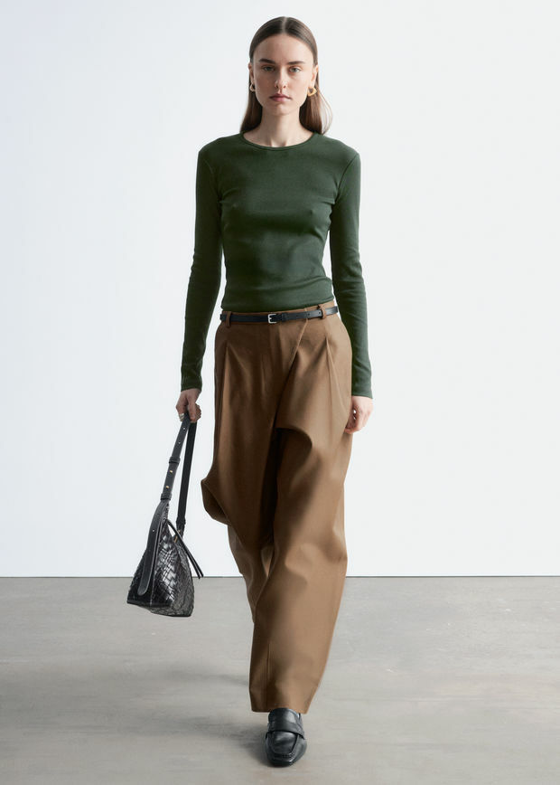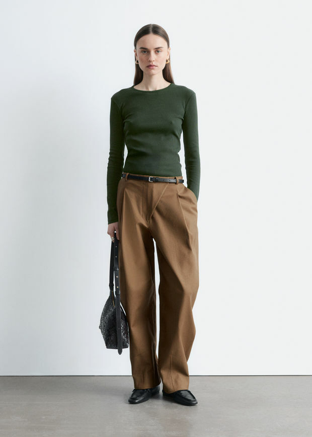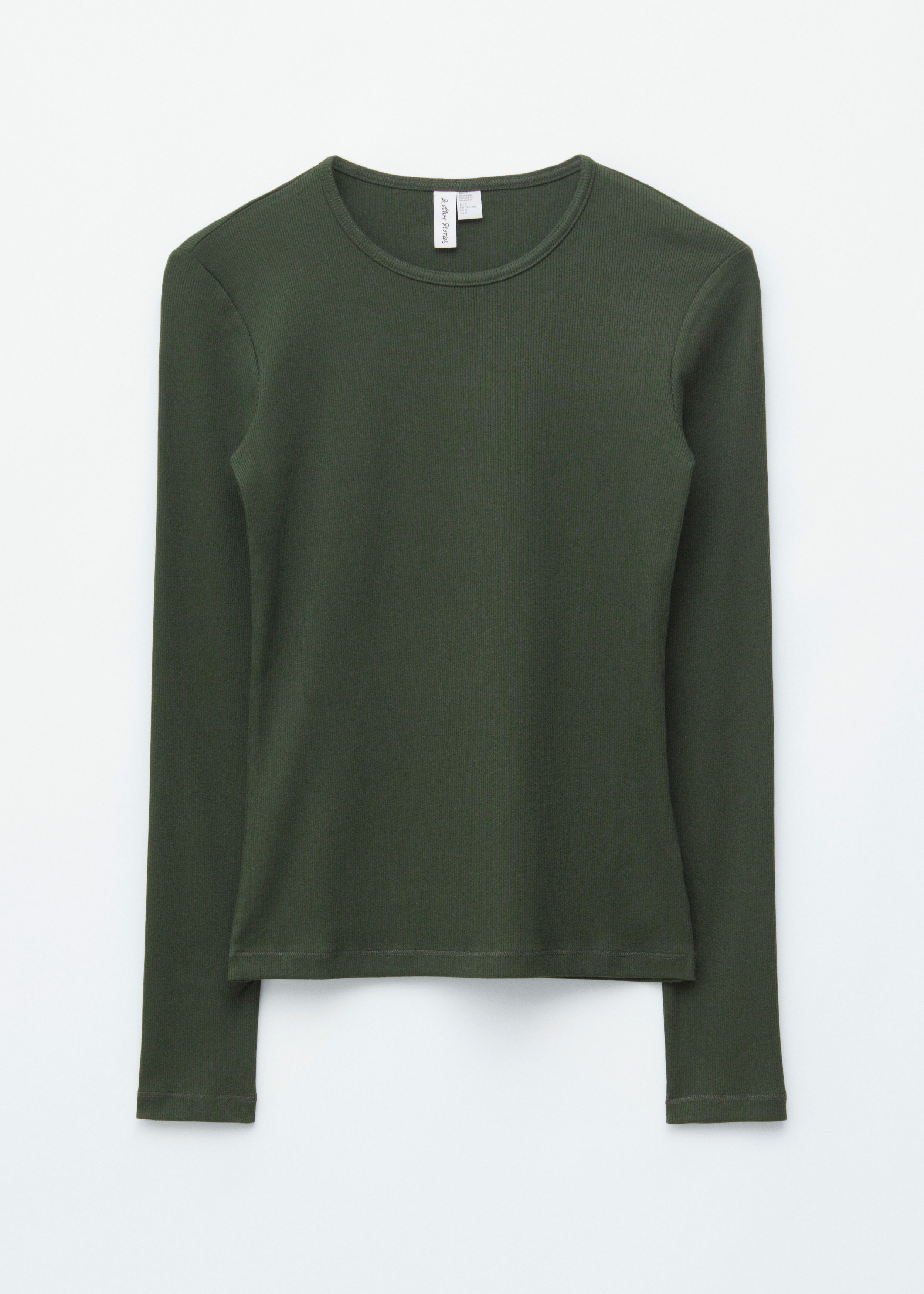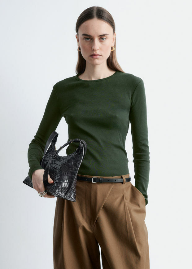 립 텍스처의 코튼 혼방 저지 소재로 탄생한 탑이에요. 슬림 핏 실루엣, 라운드 넥, 롱 슬리브가 특징이랍니다. 데일리로 다양하게 레이어링할 수 있는 아이템으로, 테일러드 트라우저나 미니 스커트와 연출해 보세요.