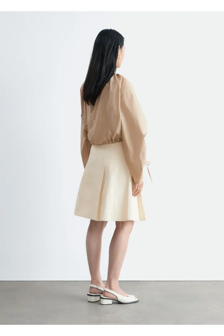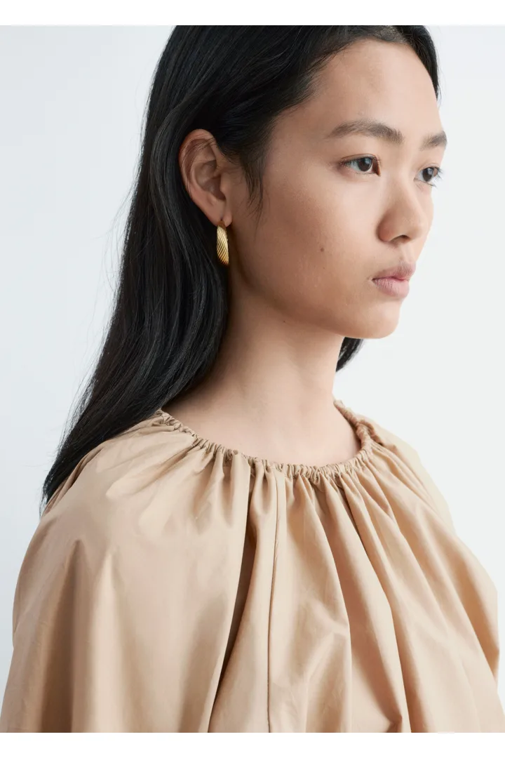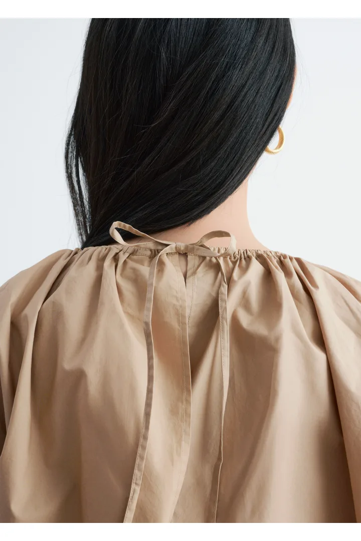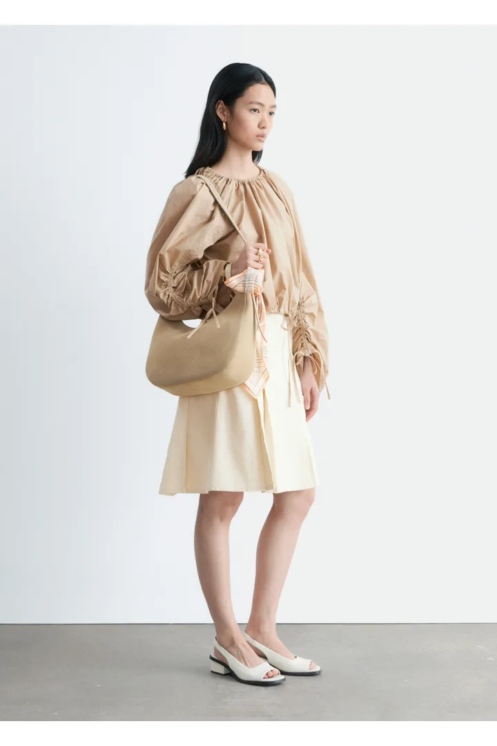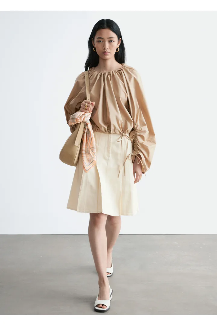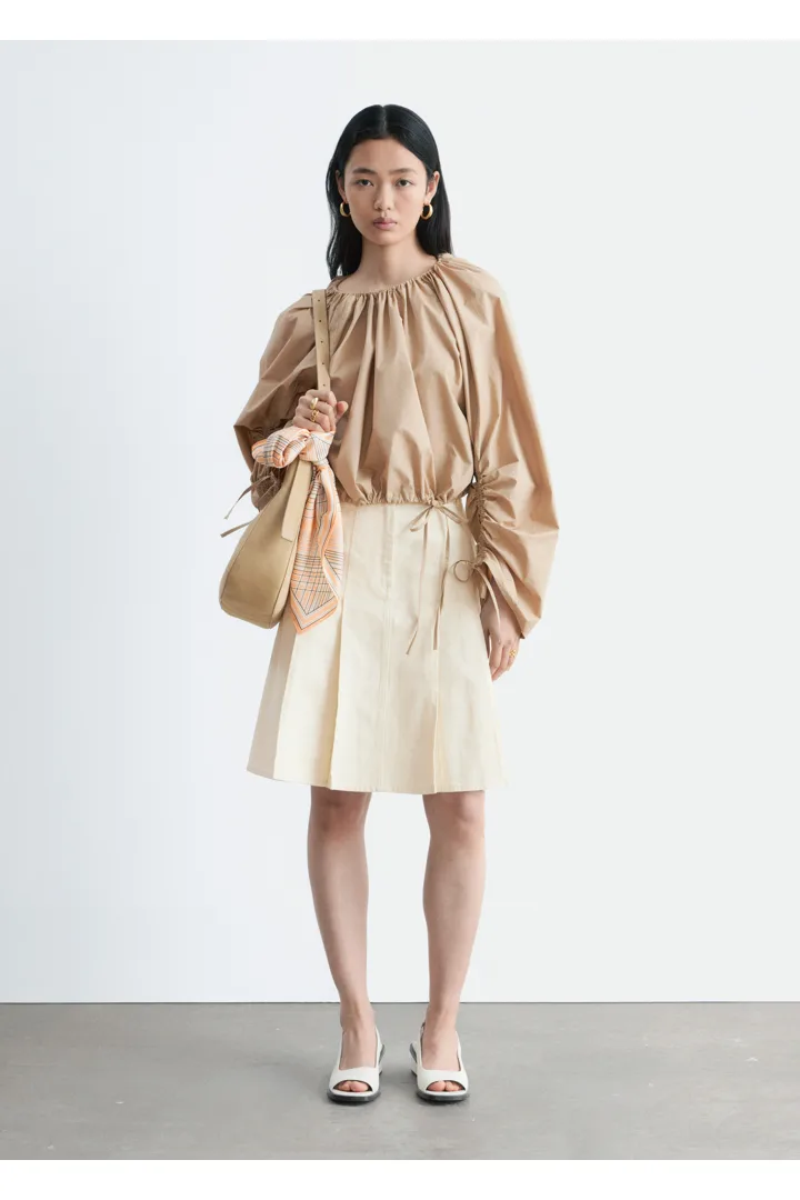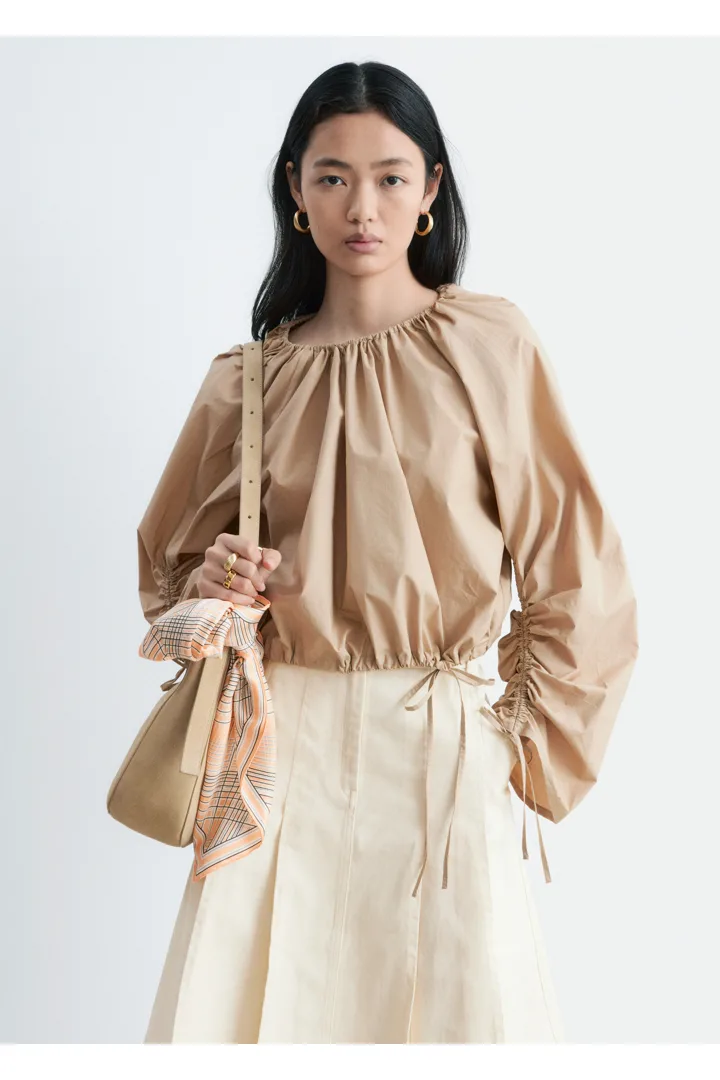 부드러움과 구조미가 멋스럽게 어우러진 블라우스예요. 산뜻한 코튼 소재에 자리한 셔링이 볼륨감과 텍스처를 더해주어요. 네크라인, 헴라인, 슬리브의 드로스트링 타이로 다양한 스타일링이 가능하답니다.