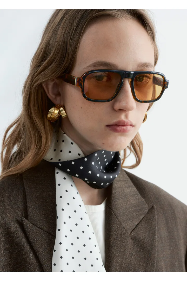 대담하고 활용도 높은 선글라스예요. 독특한 스퀘어 아세테이트 프레임과 일상에서 햇빛을 차단해주는 틴티드 렌즈가 특징이랍니다.