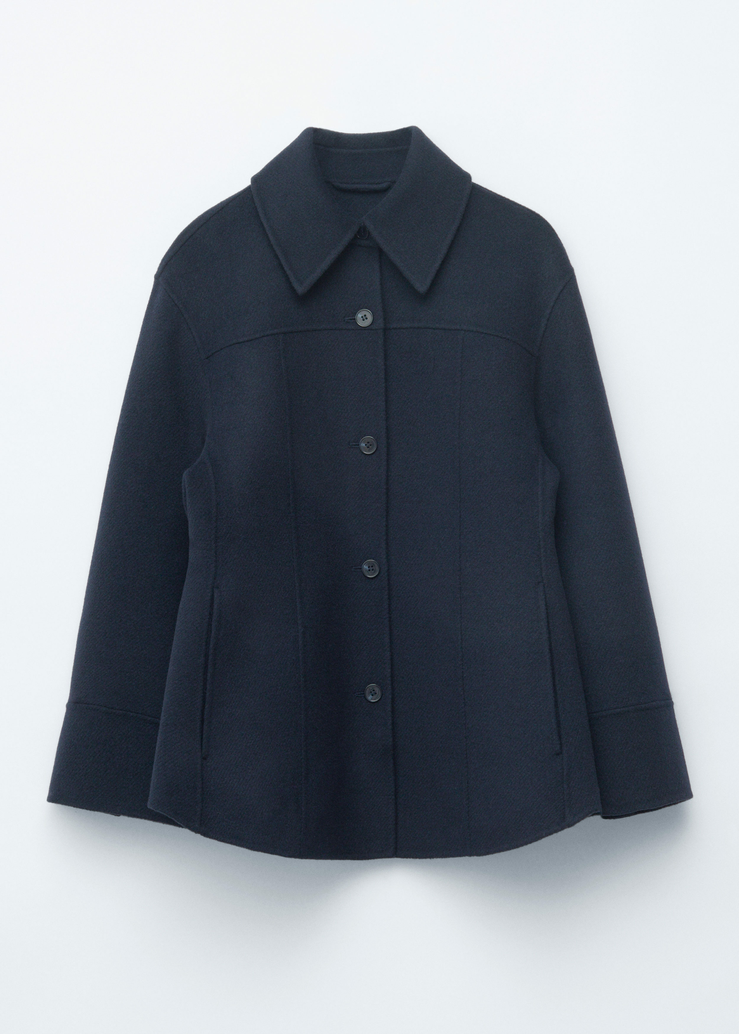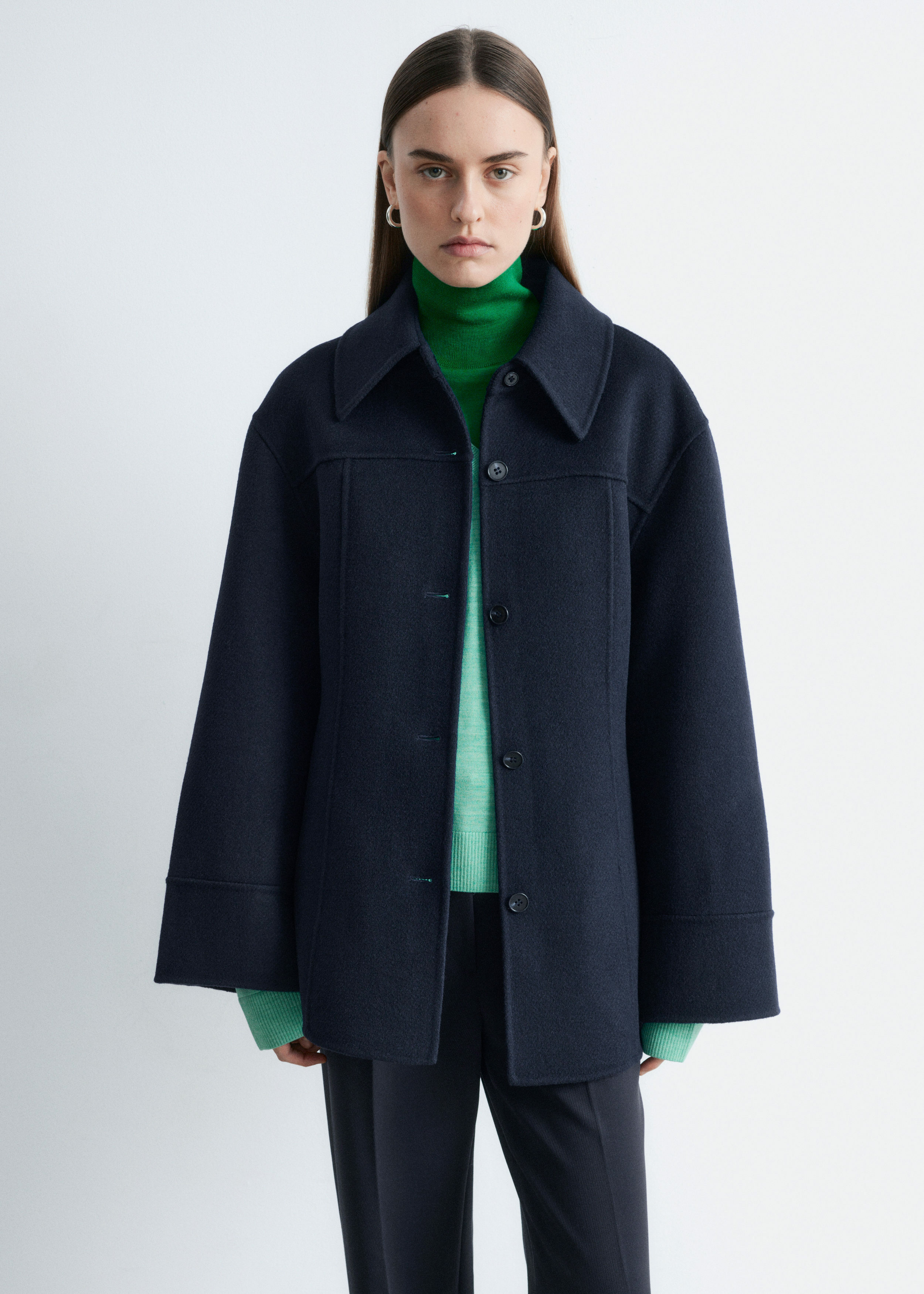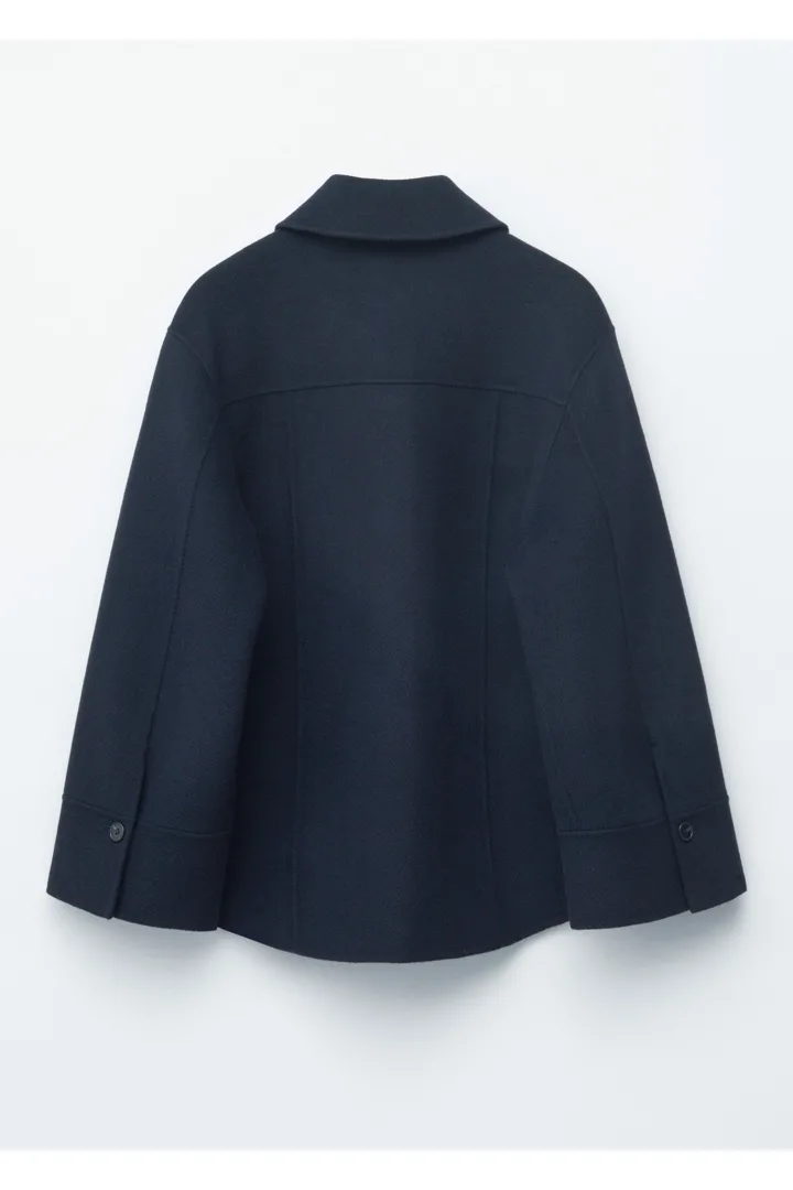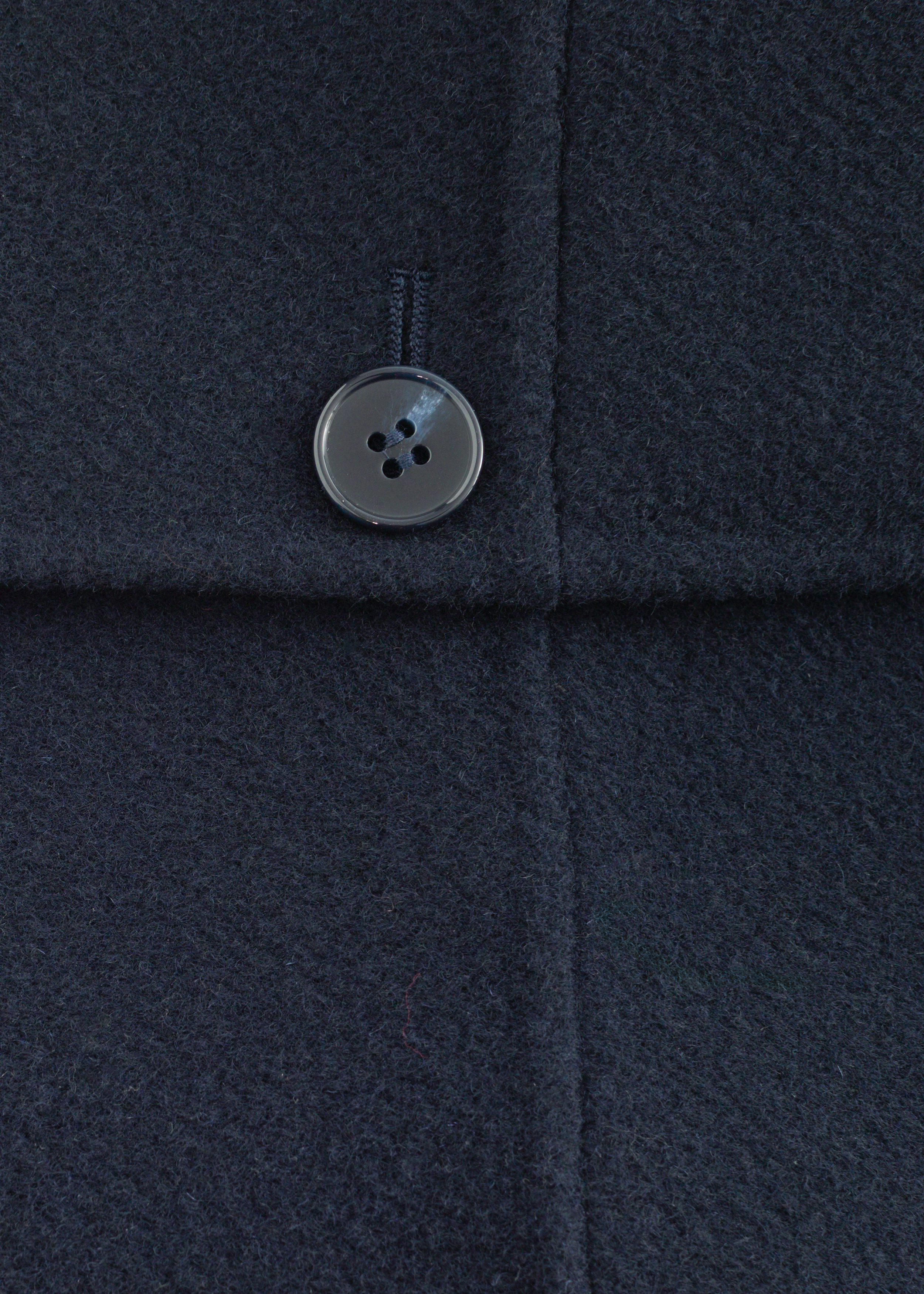 브러시드 울 혼방 트윌 소재의 자켓이에요. 큼직한 포인트 카라, 앞면의 단추, 측면 솔기의 깔끔한 포켓, 버튼 커프스가 자리해 있으며, 앞면과 뒷면의 요크와 노출형 솔기가 특징이랍니다.